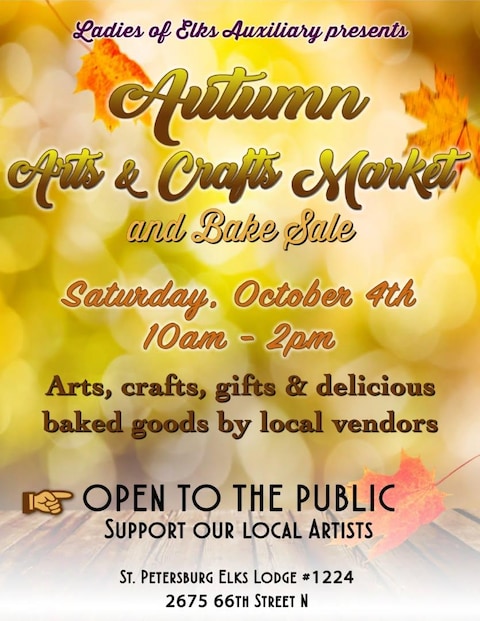 The Ladies of Elks Auxiliary is hosting another Arts & Crafts Market at Elks Lodge #1224! Shop for local arts & crafts and gifts at this open-air and indoor event at 2675 66th St N. Enjoy music, food and a great atmosphere, along with dozens of terrific vendors. The event will be held in the parking lot, as well as inside the lodge. The hugely popular LOEA Bake Sale will also be inside again. Public welcome.