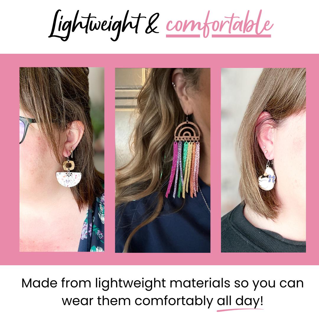 Yes! Most designs are made with lightweight materials like leather, cork, wood, or acrylic, so they’re comfortable for all-day wear without pulling on your ears.
