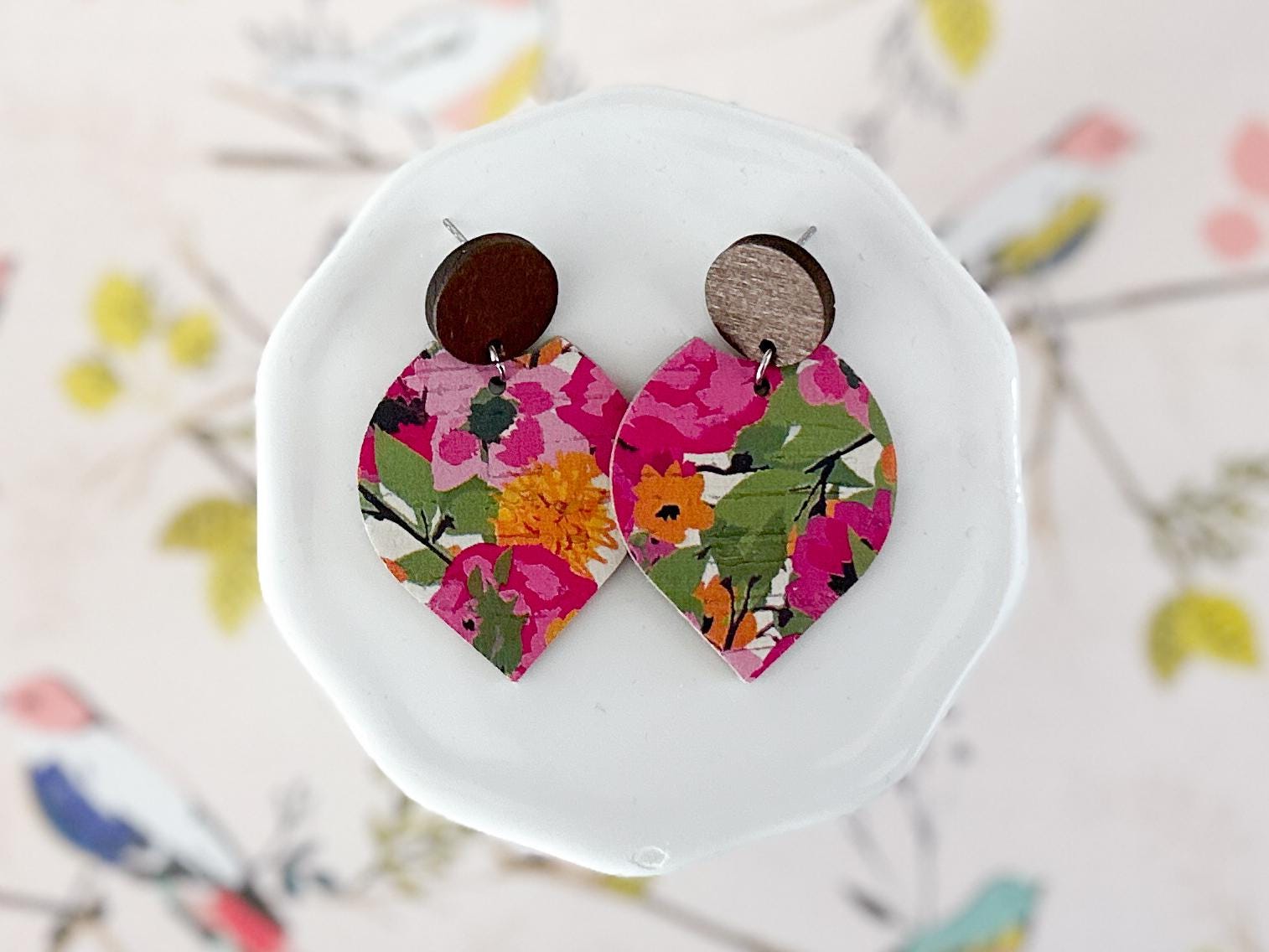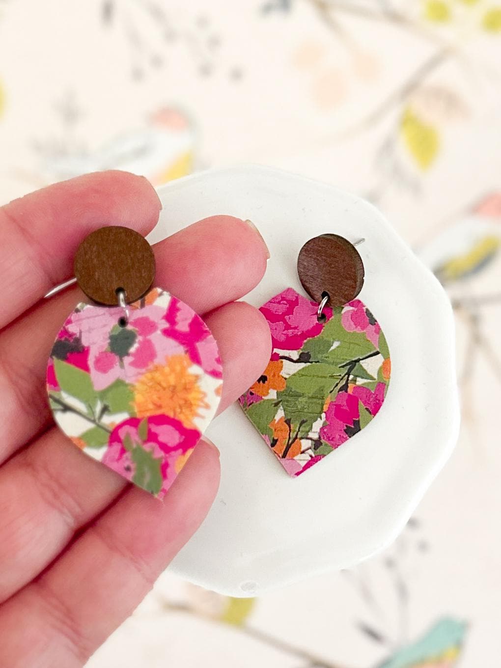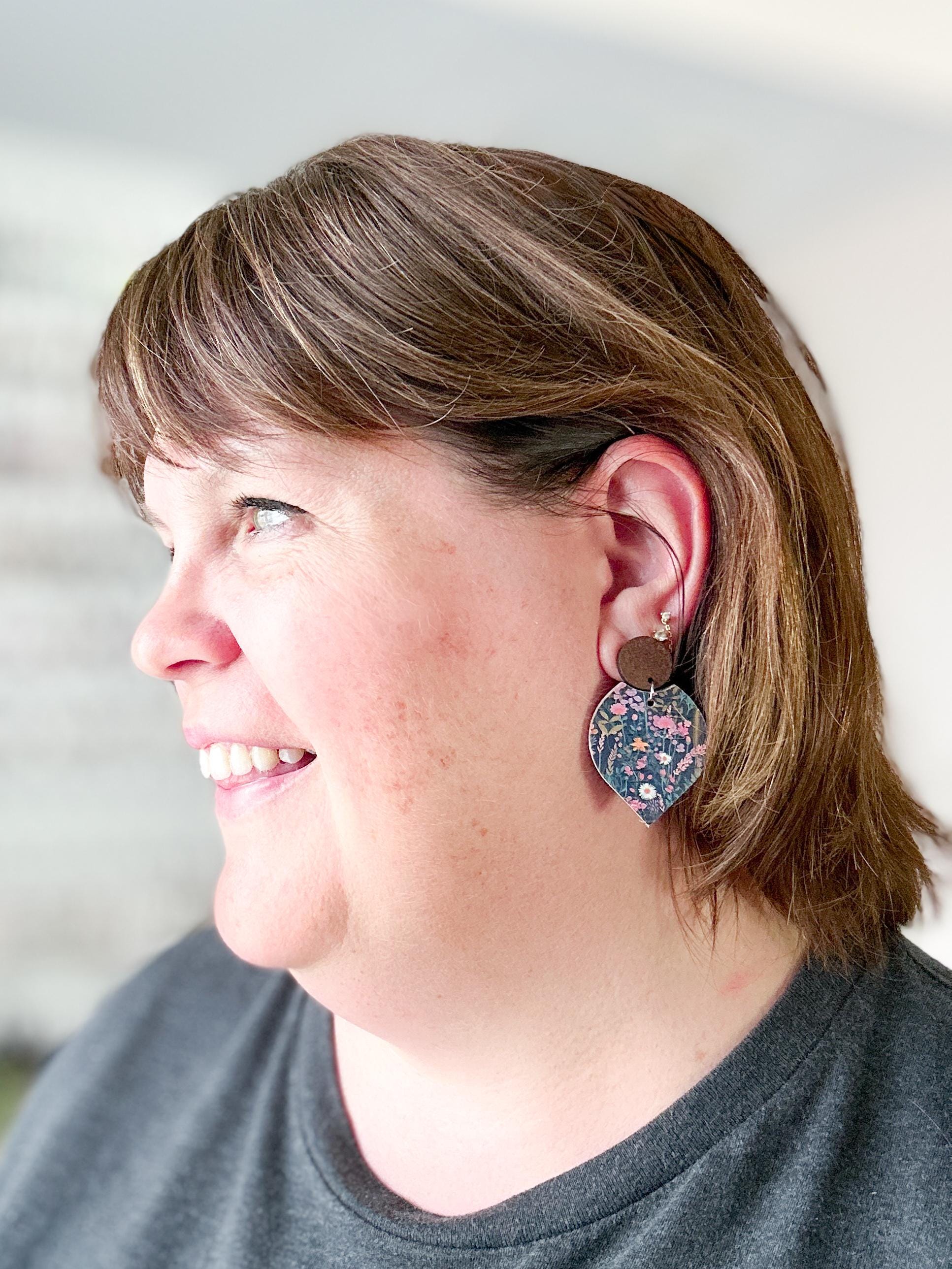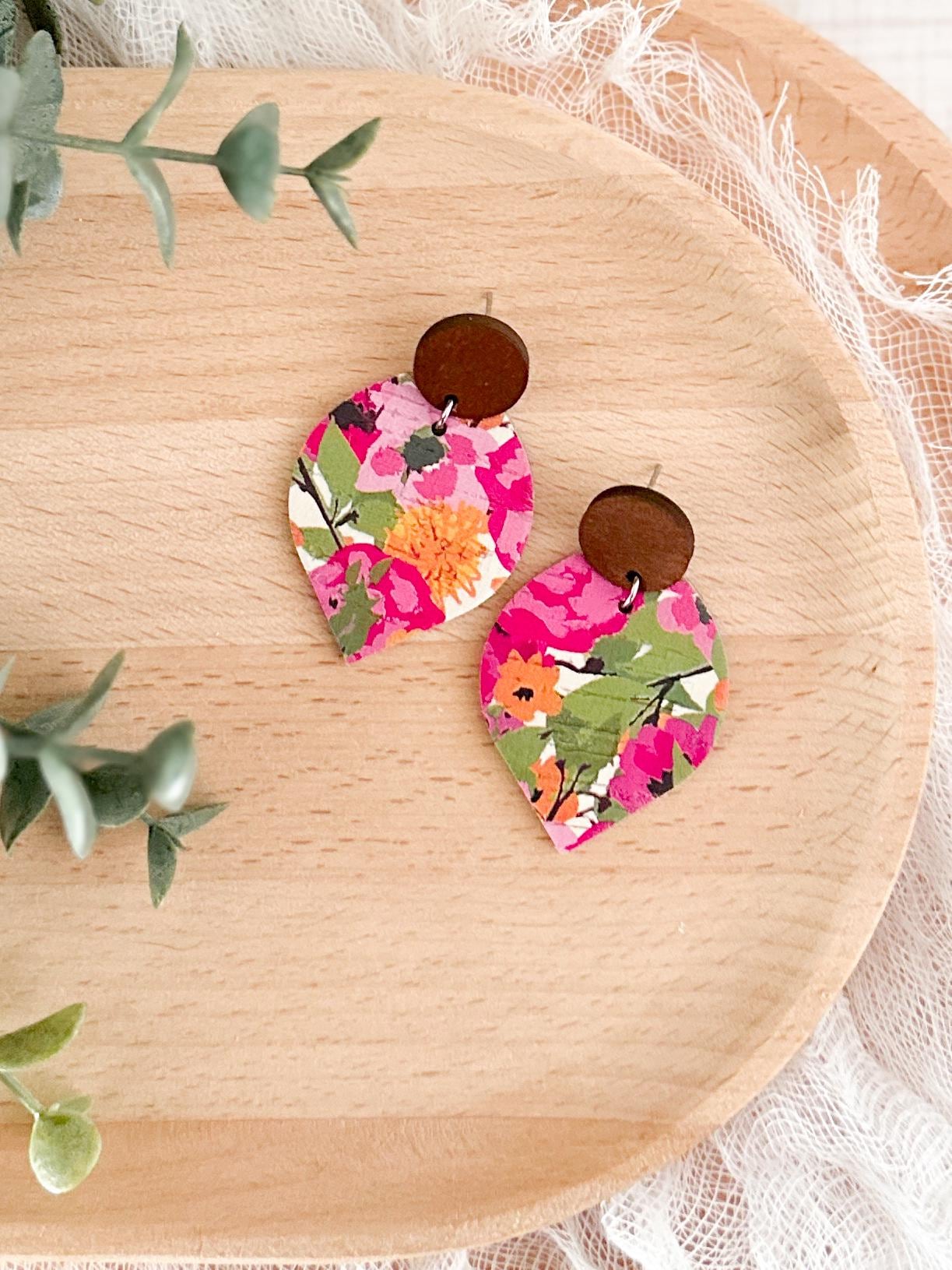 These bright floral cork earrings feature a bold botanical pattern cut into my signature pointed petal shape and finished with a warm wood accent. The layered cork-on-leather design creates a statement look while staying lightweight and comfortable for all-day wear.