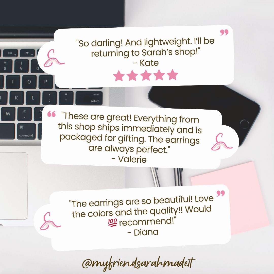 π π¦πππ£π£ππ‘π & π£πππππππ‘π: My Friend Sarah Made It ships quickly! Most items are 'ready to ship,' so your order will be processed and shipped within 1-2 business days of purchase. Each order is carefully packaged in a box to ensure safe delivery. If you purchase multiple items from my shop, these will be shipped together in one larger box. All earrings are presented on branded cards and include backings.
