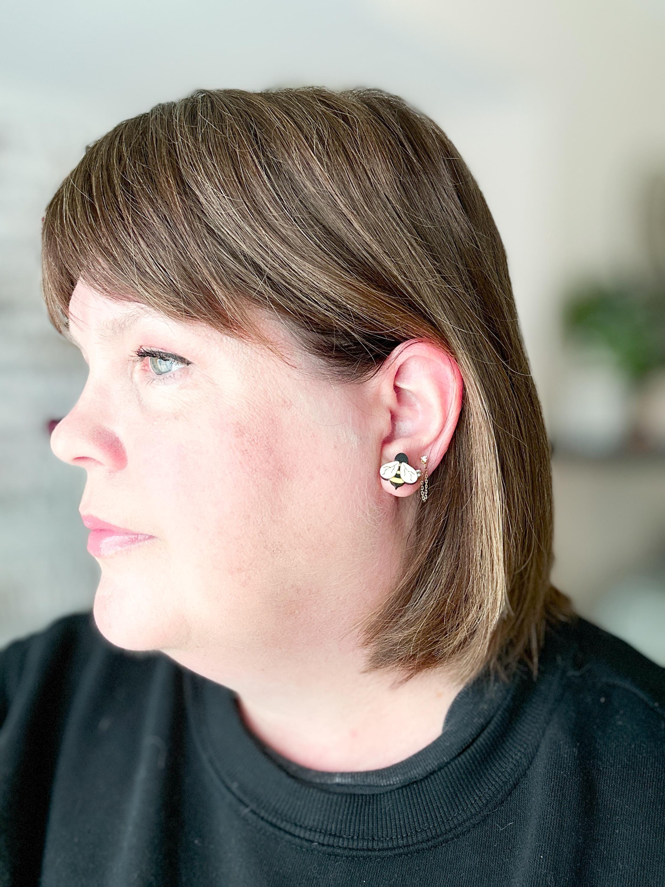 Laser cut from lightweight wood and hand-painted in my studio, each pair features a sweet bumblebee design with bold black and sunny yellow details. Finished with high-quality stainless steel posts for comfortable wear, they’re playful enough to stand out but small enough for daily styling.