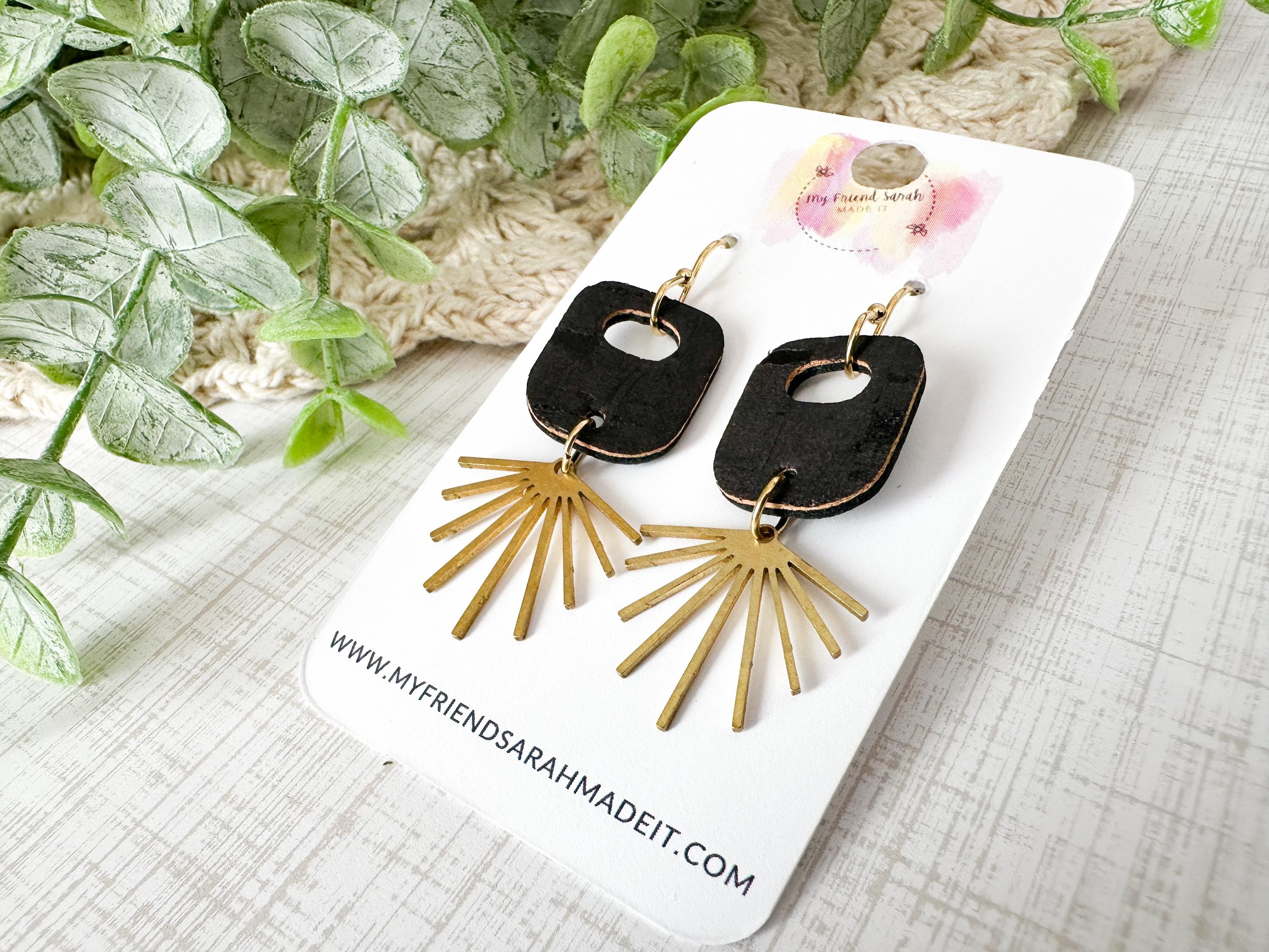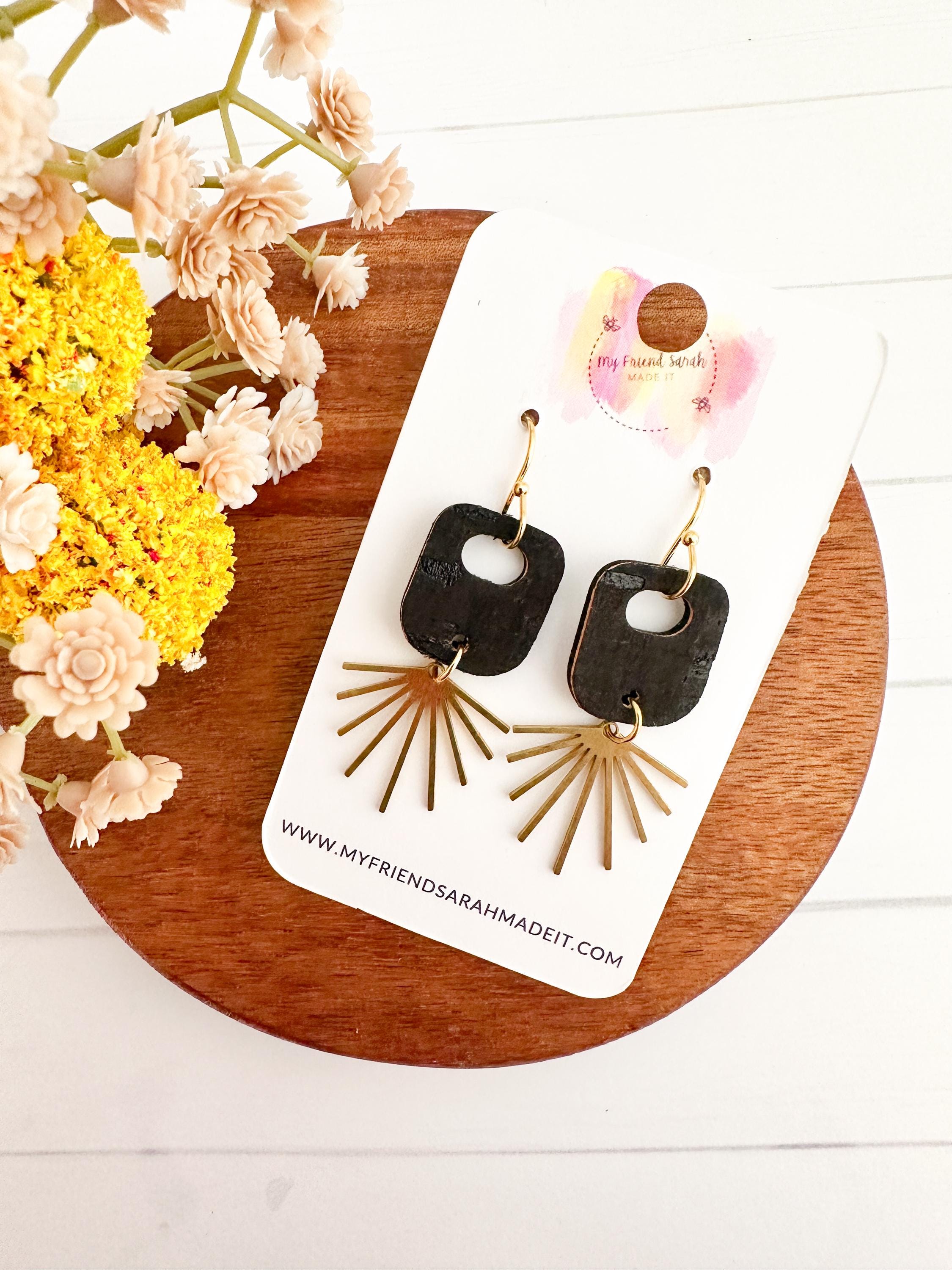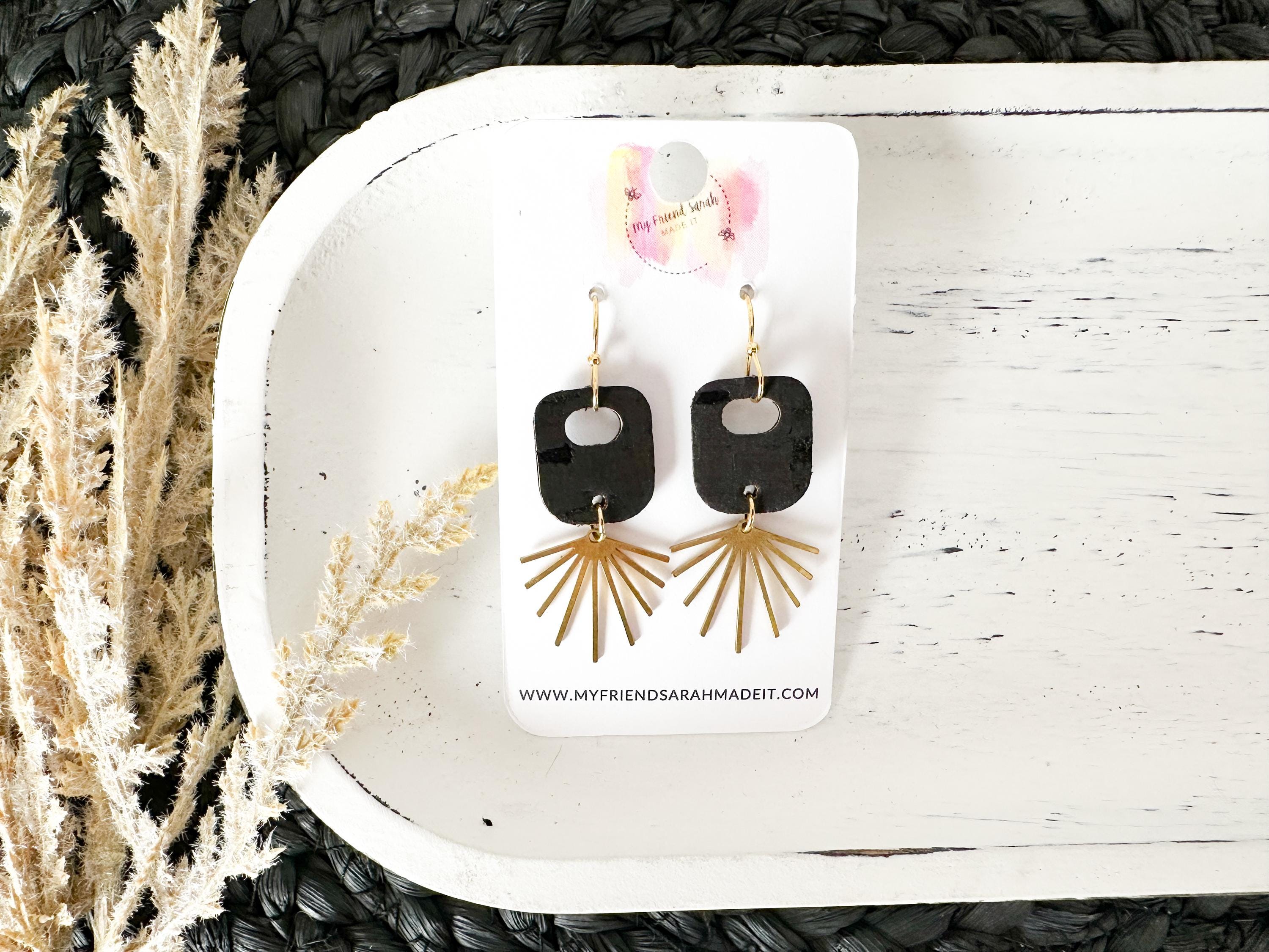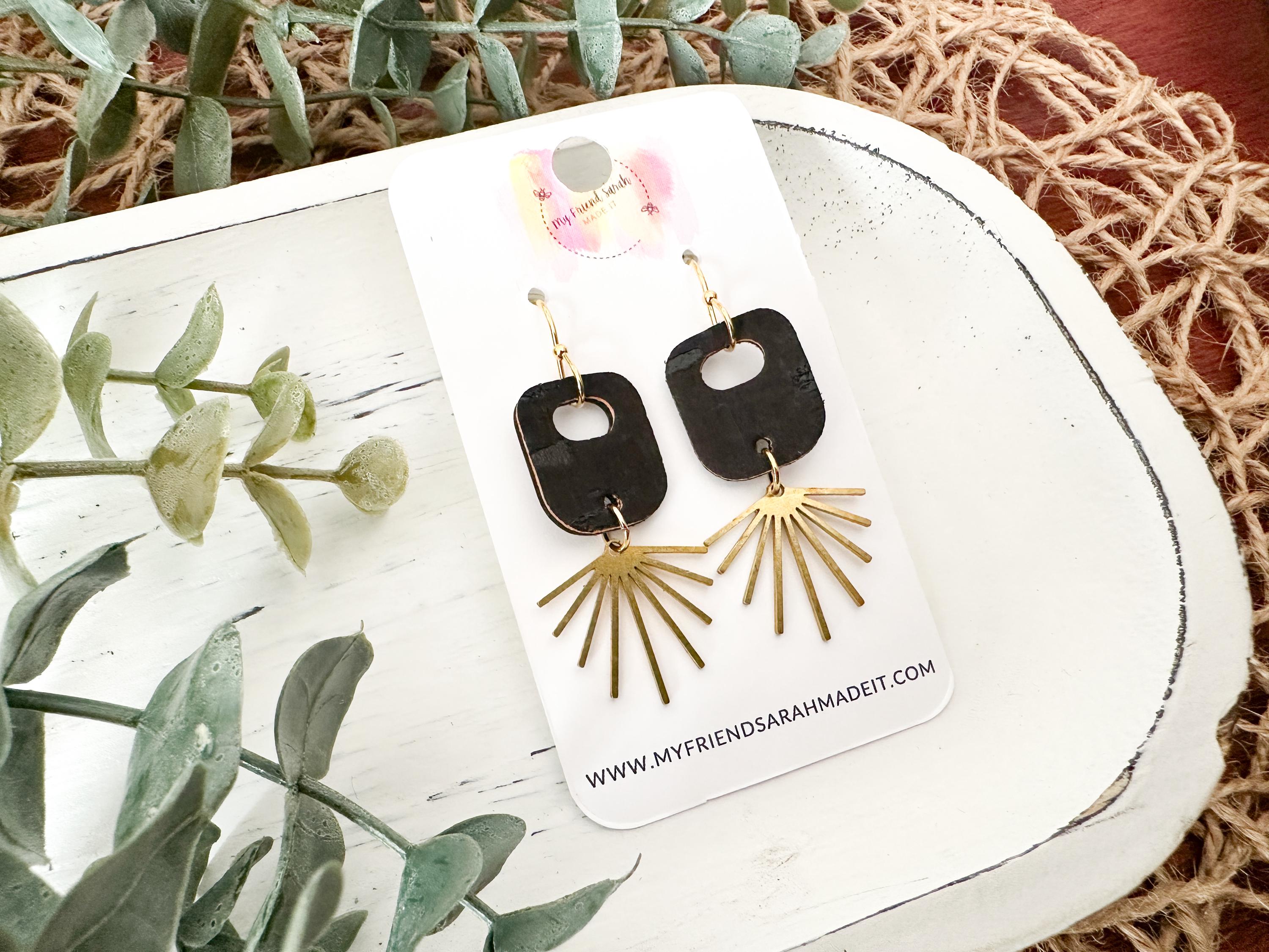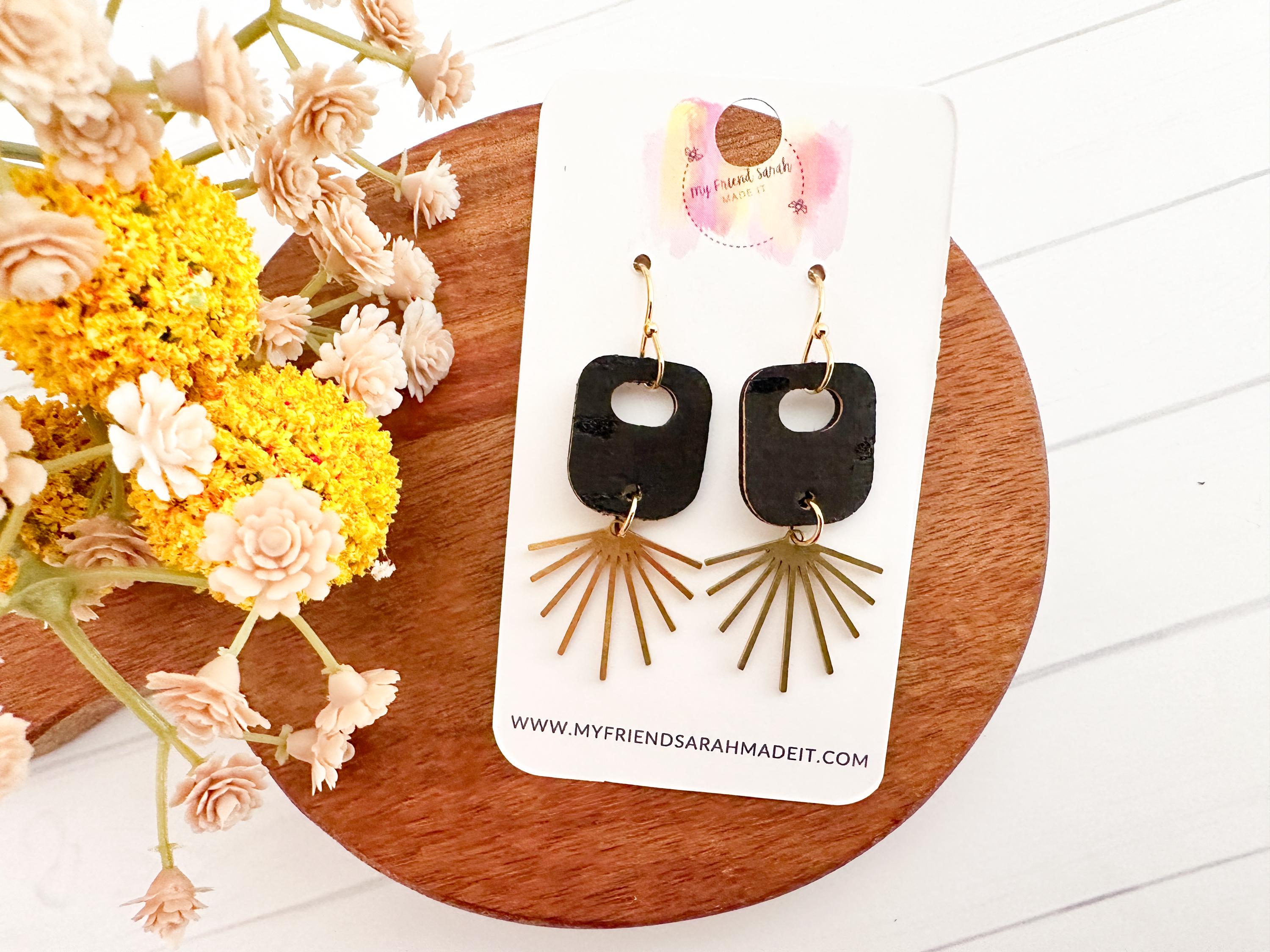 Dainty, geometric, a hint of boho flair - these earrings are small but mighty! This fun retro bubble piece is made from black cork applied to leather and finished with a darling sun ray charm.
