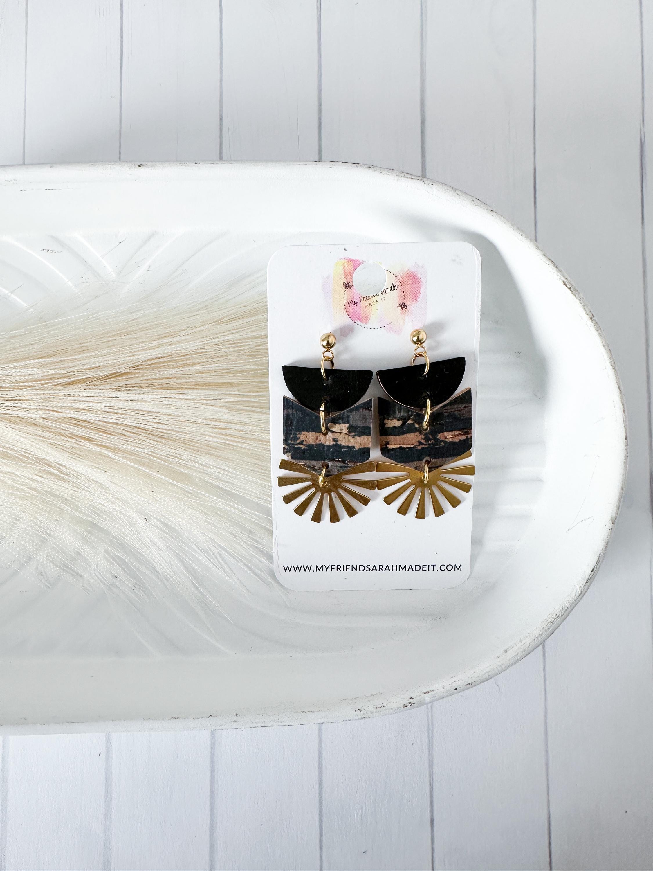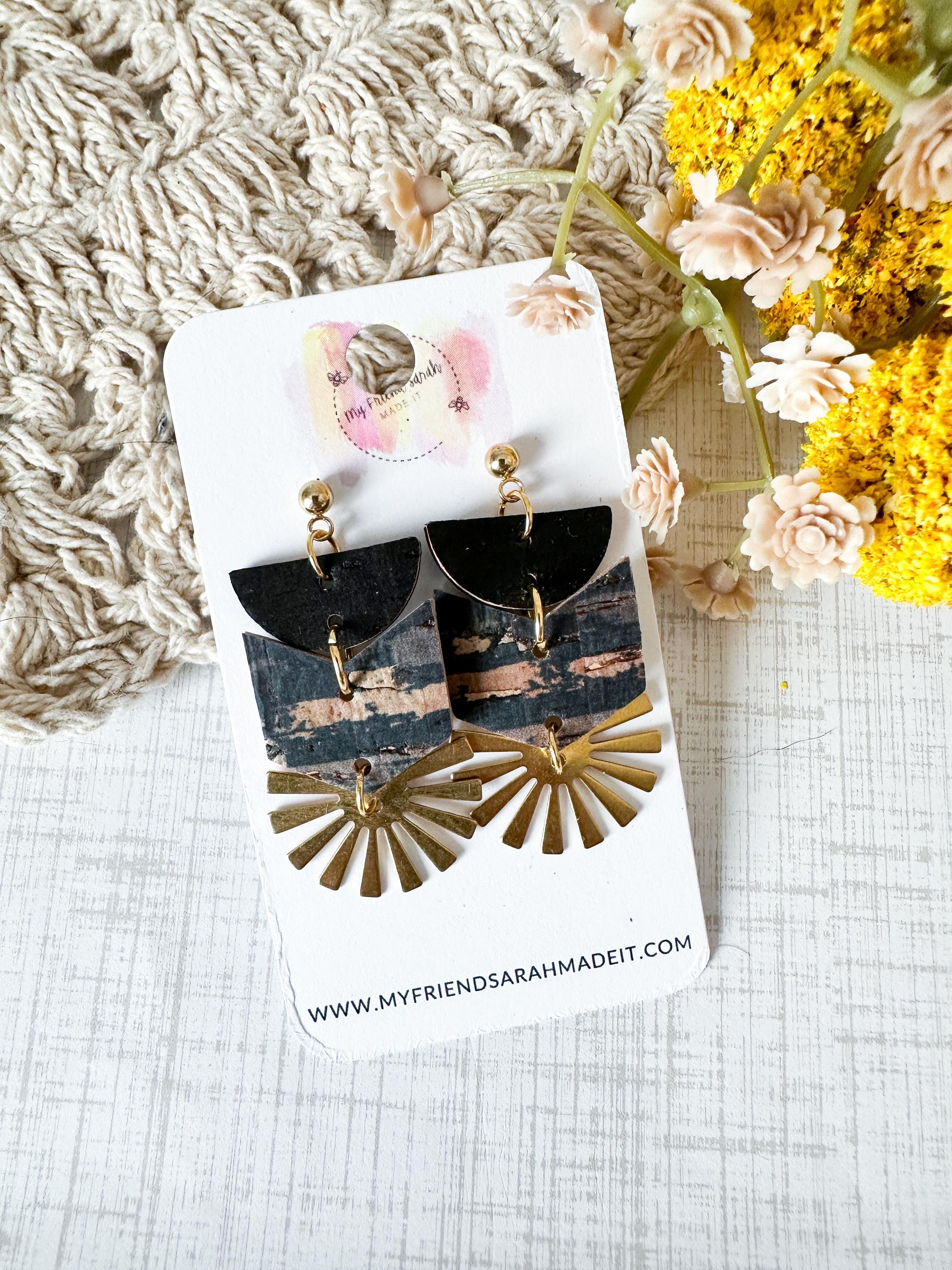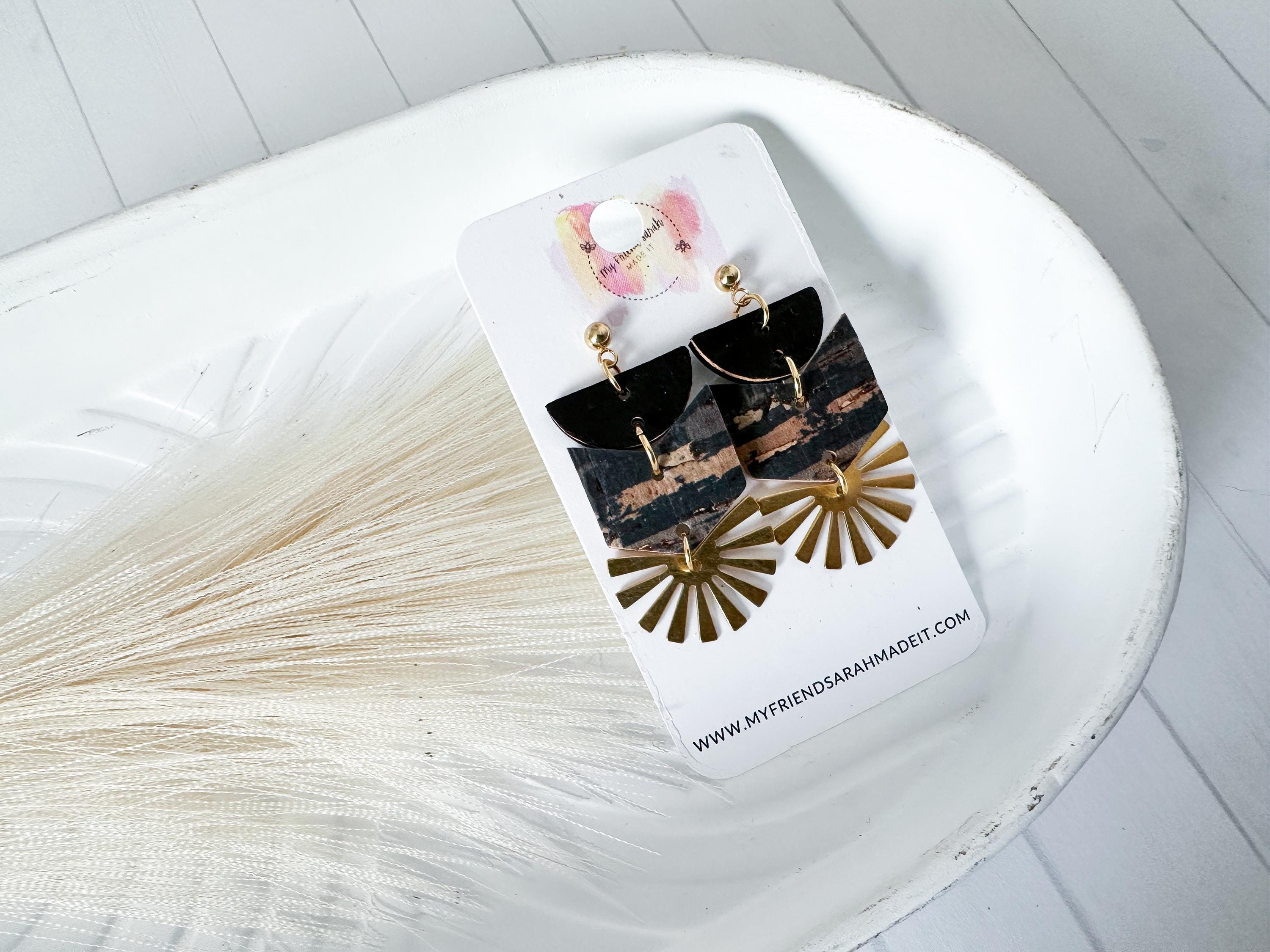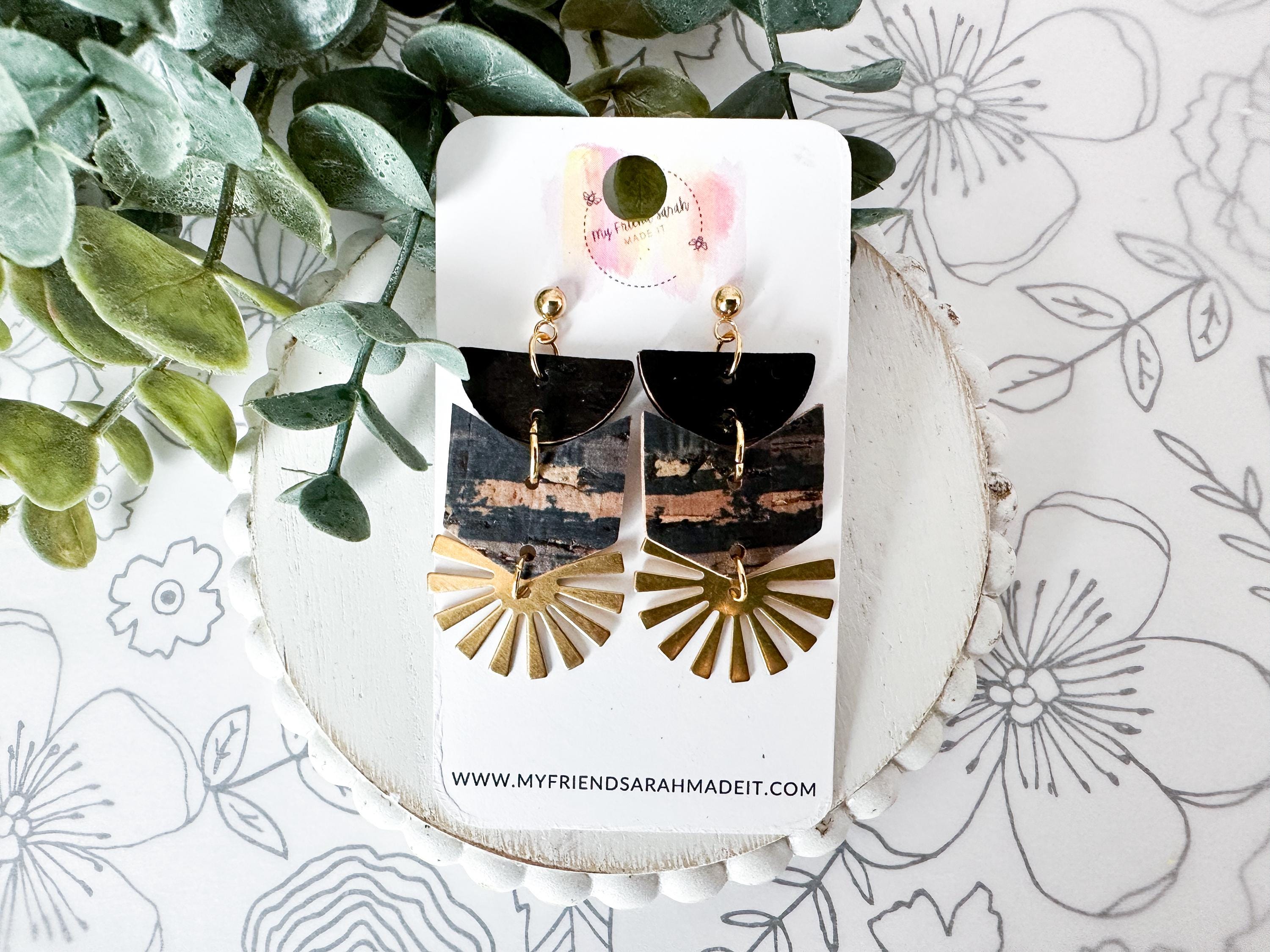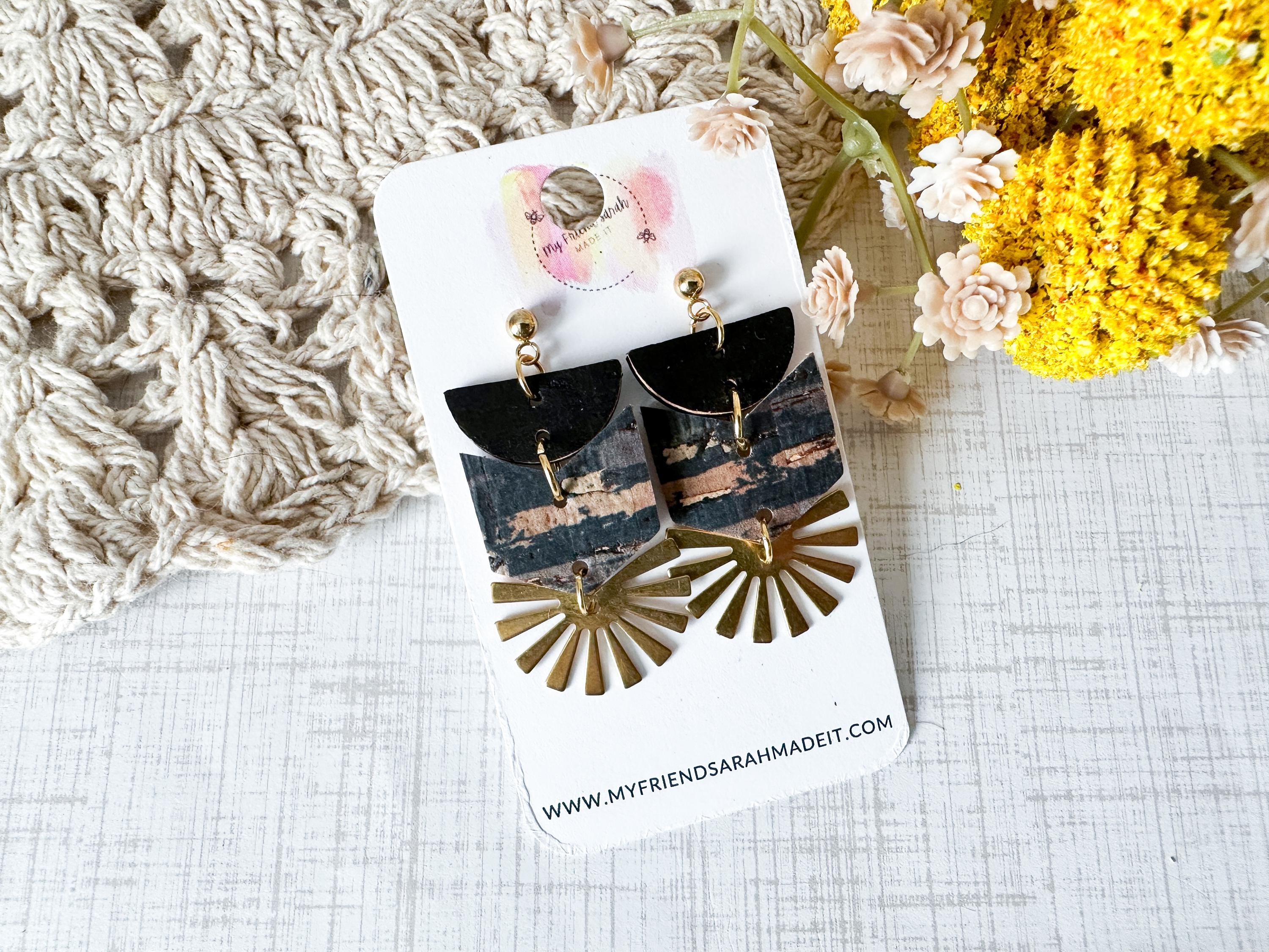 These fun geometric earrings are petite but sassy. Three layers of cork & brass form a fun & cohesive look that's interesting without being overwhelming!