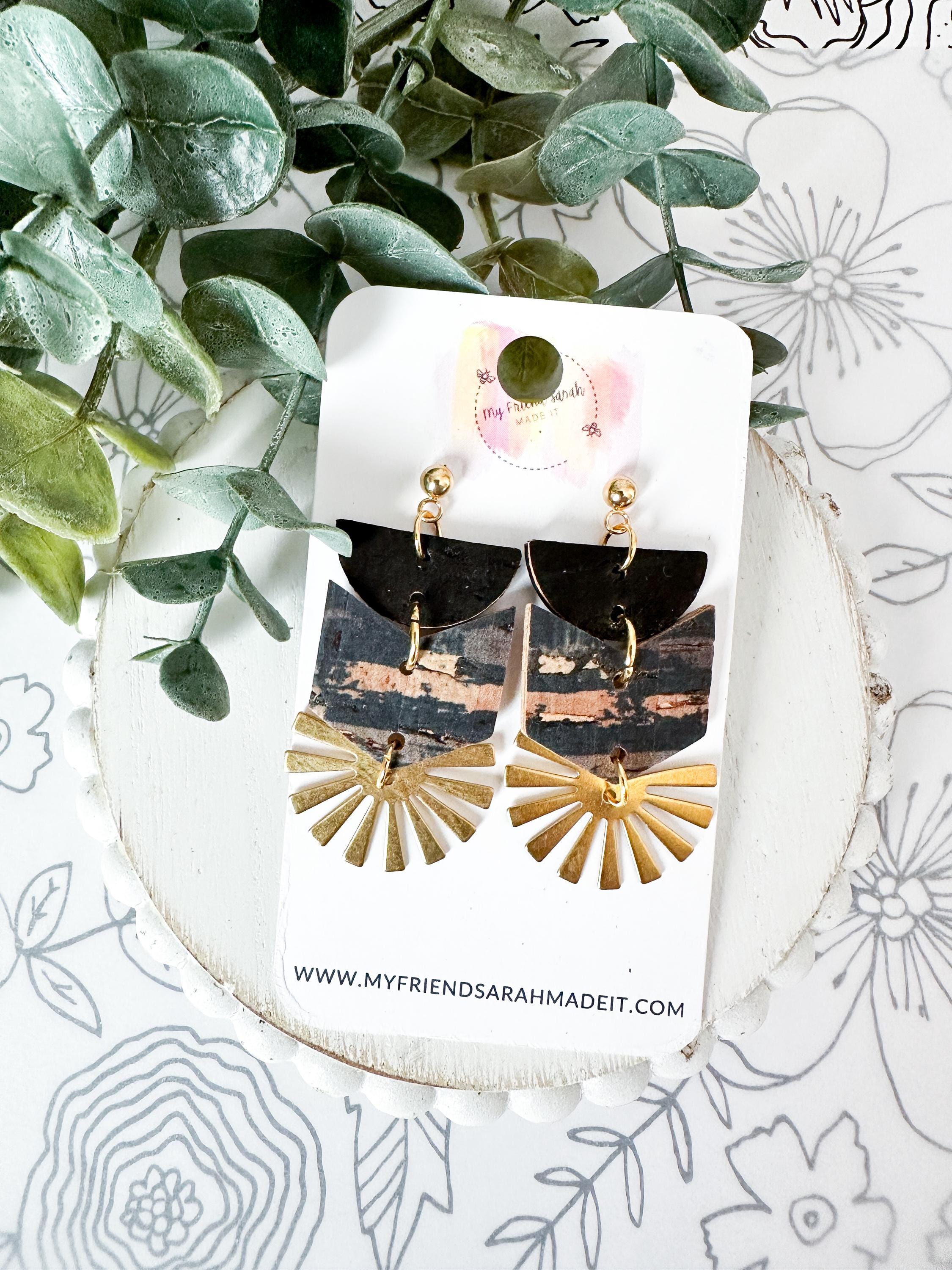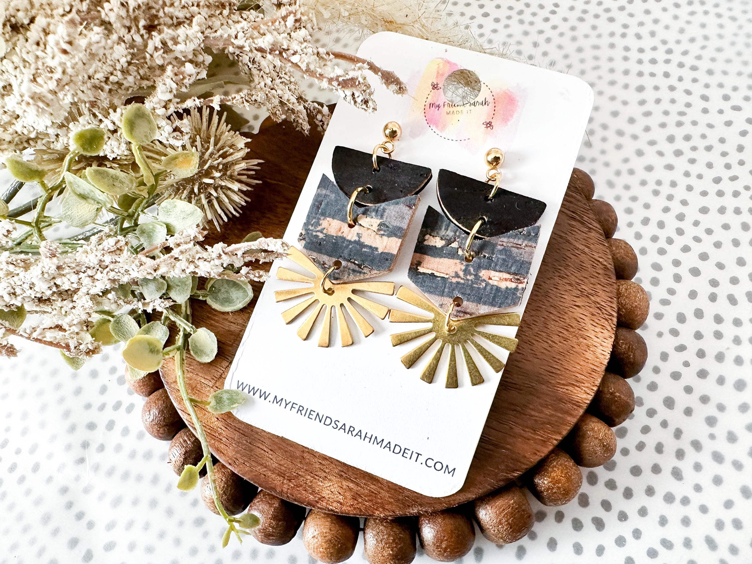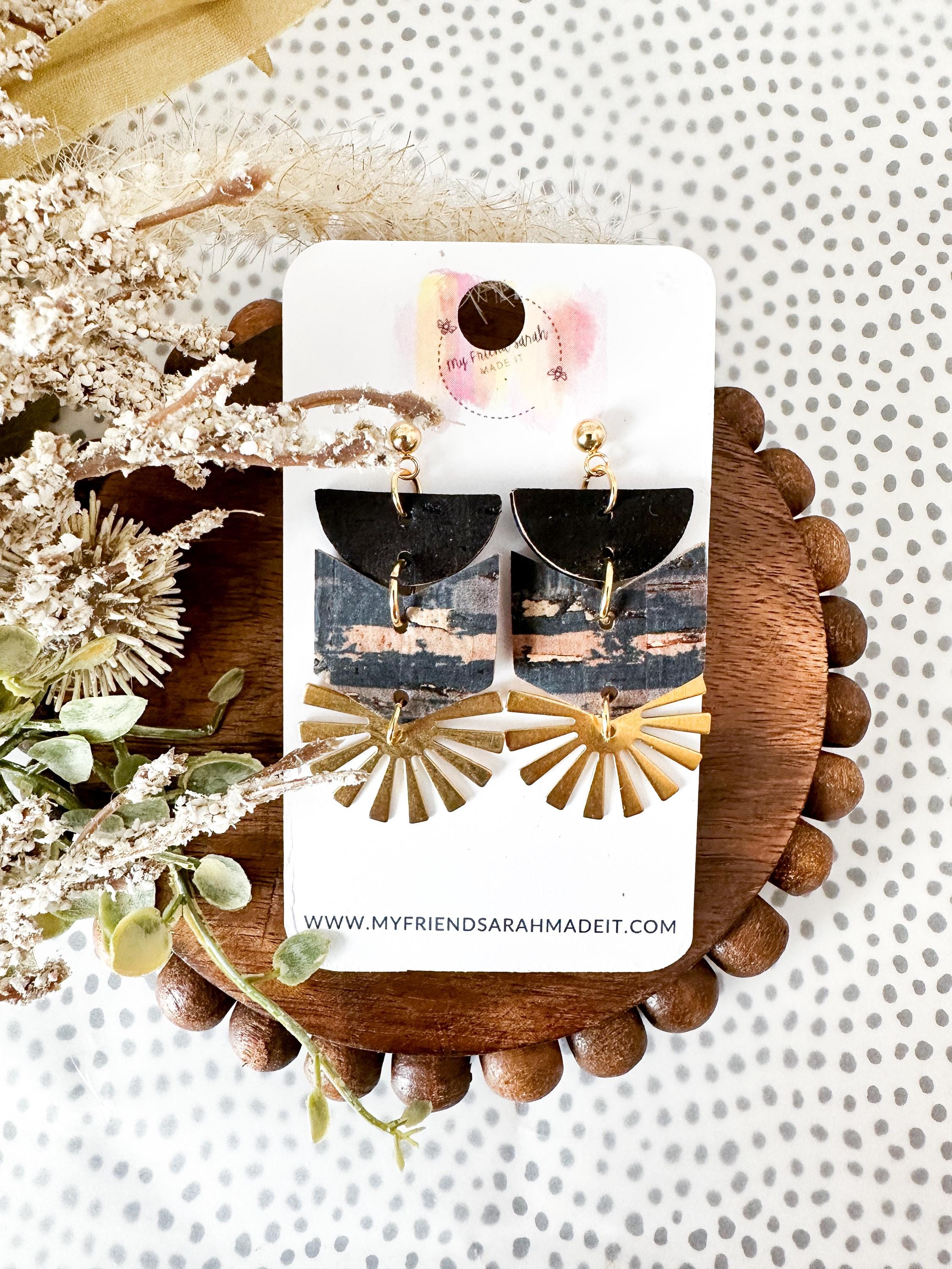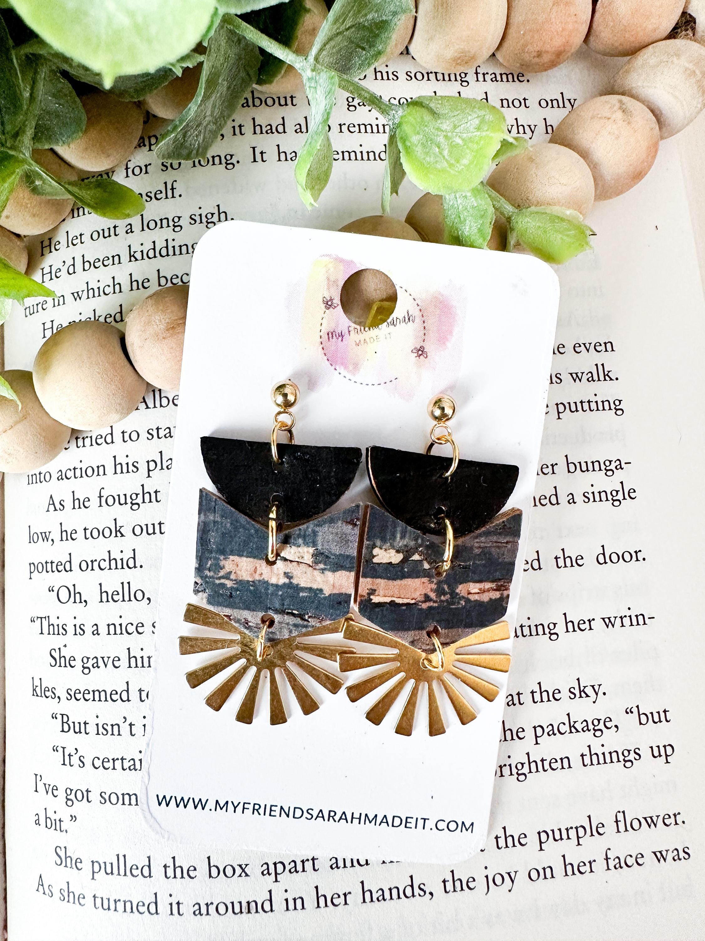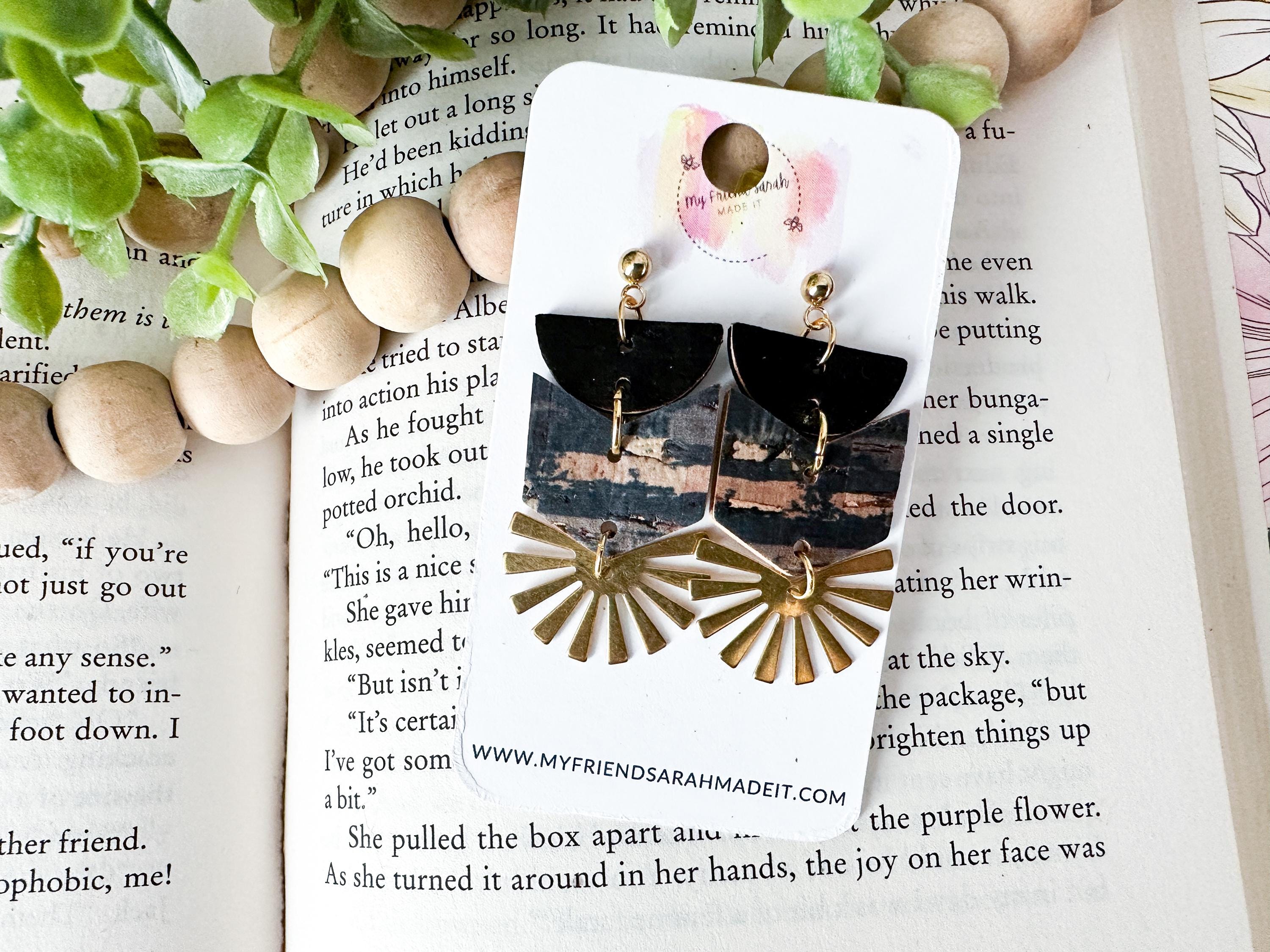These fun geometric earrings are petite but sassy. Three layers of cork & brass form a fun & cohesive look that's interesting without being overwhelming!