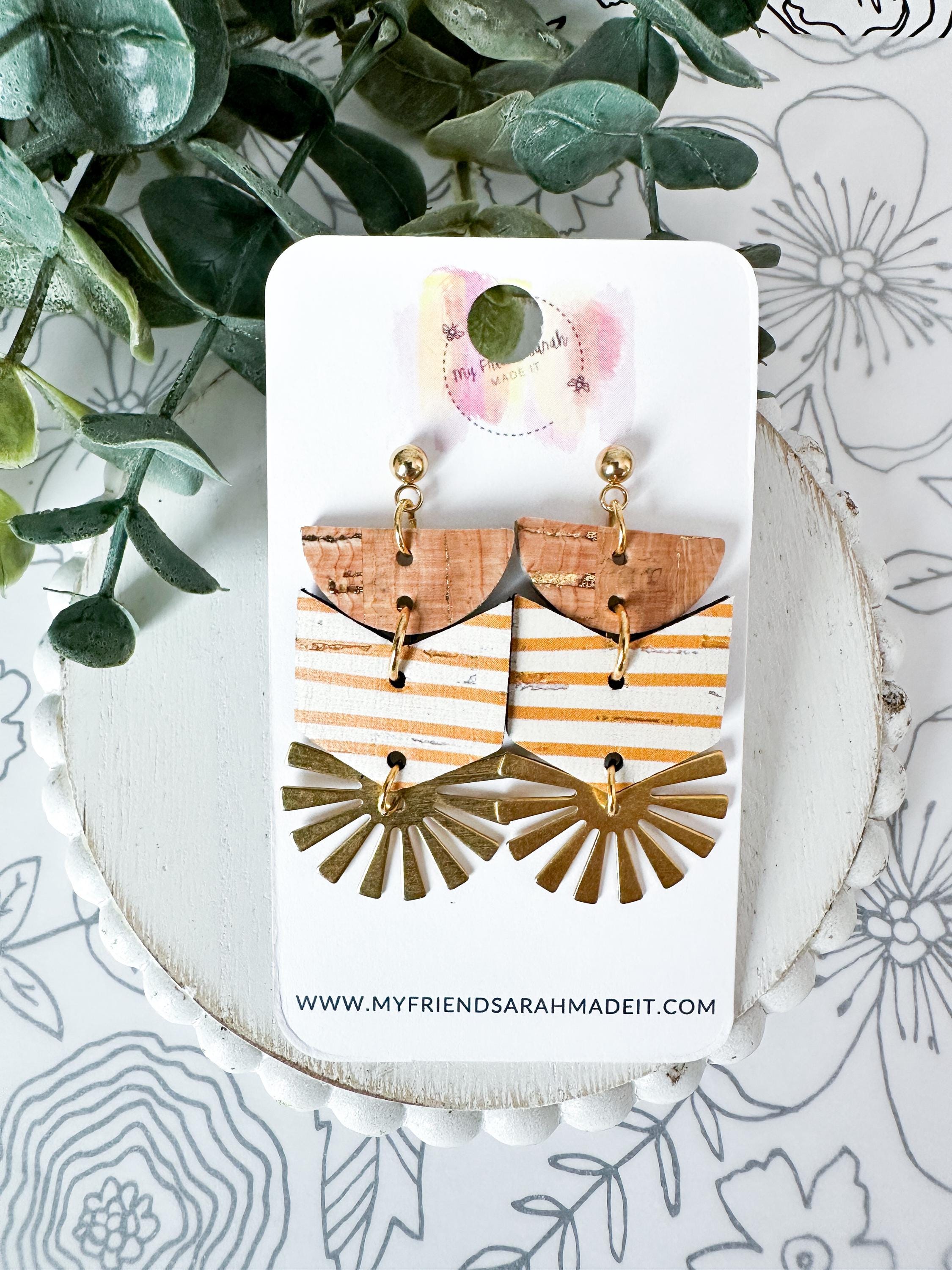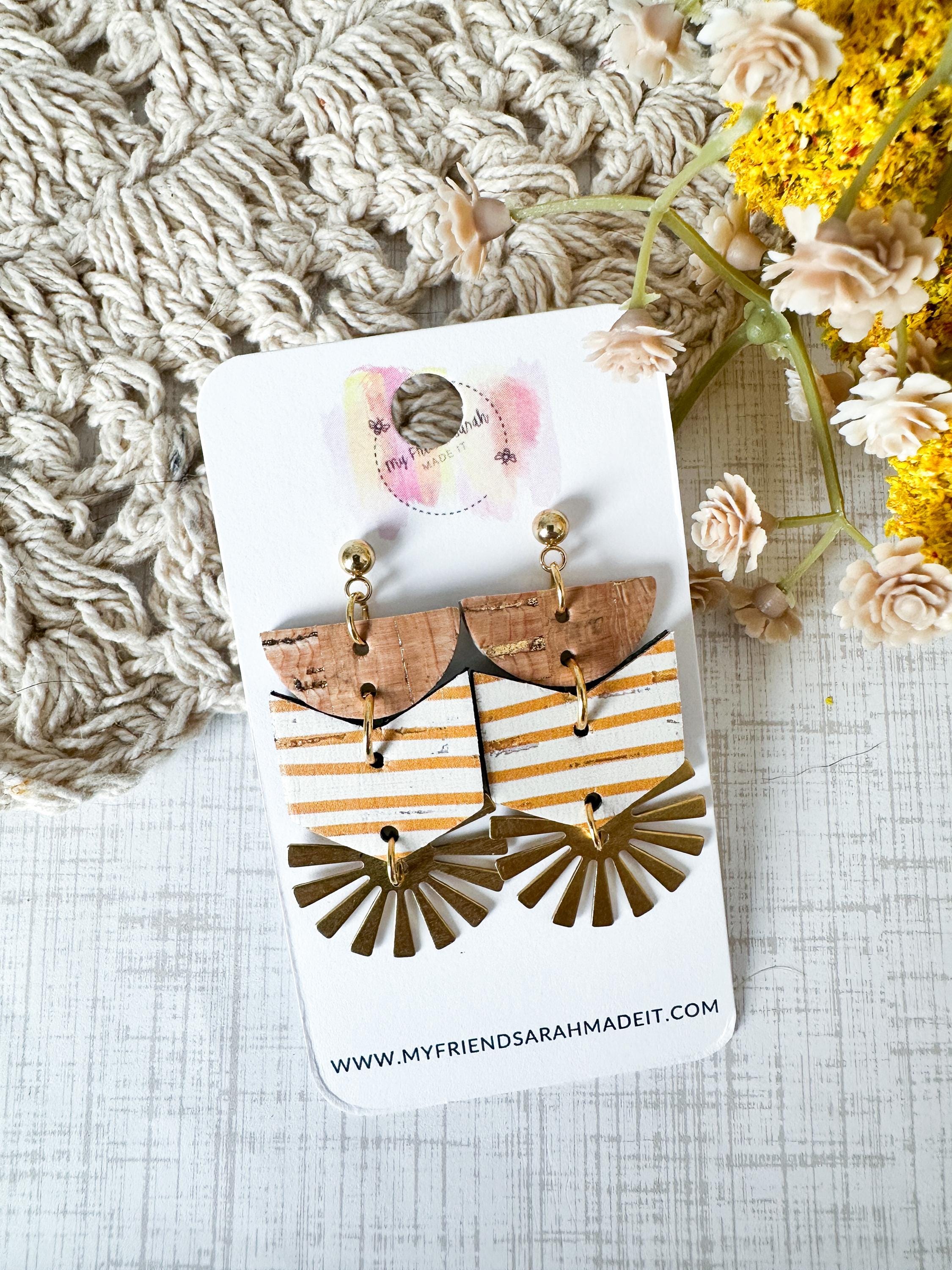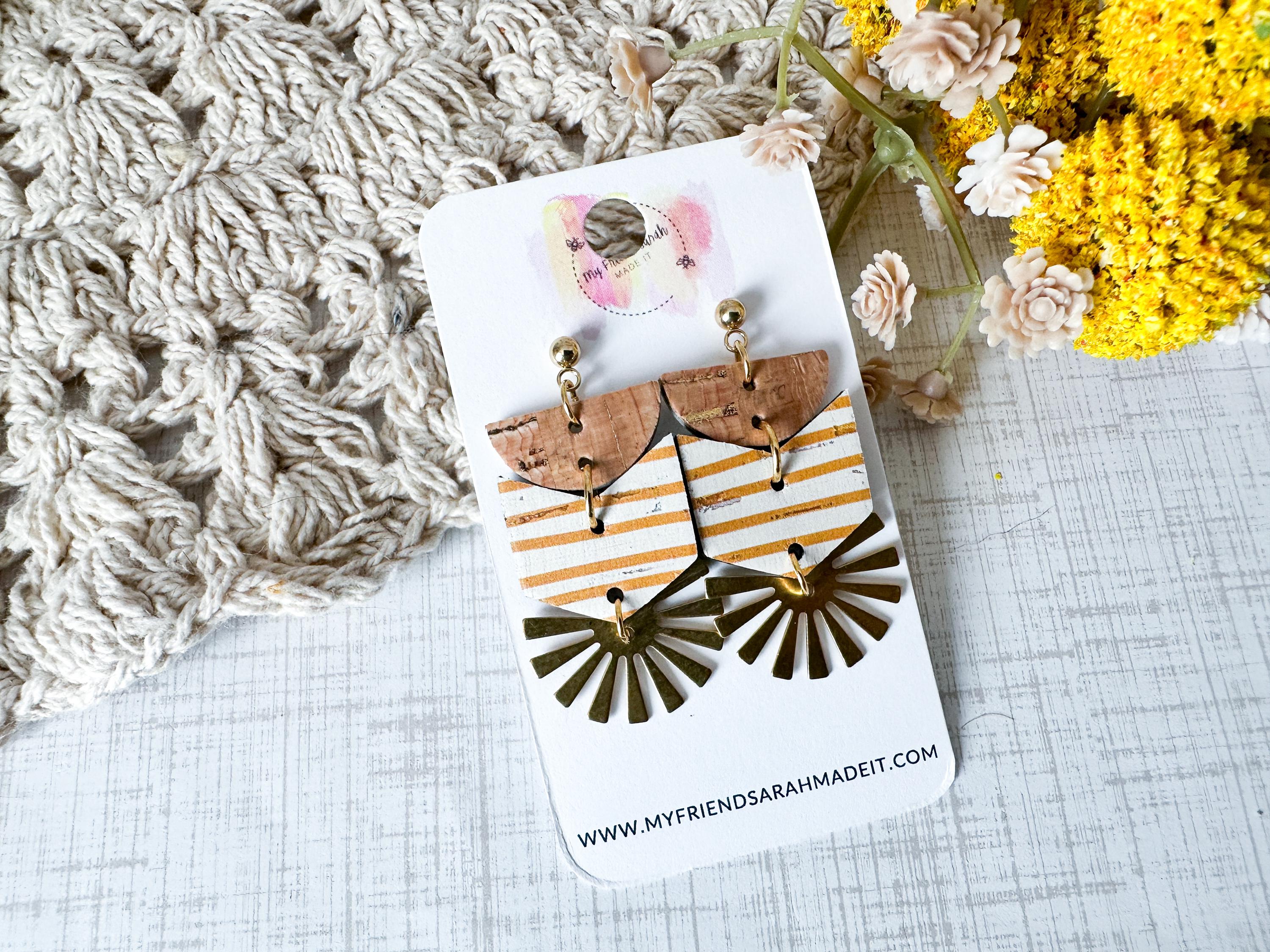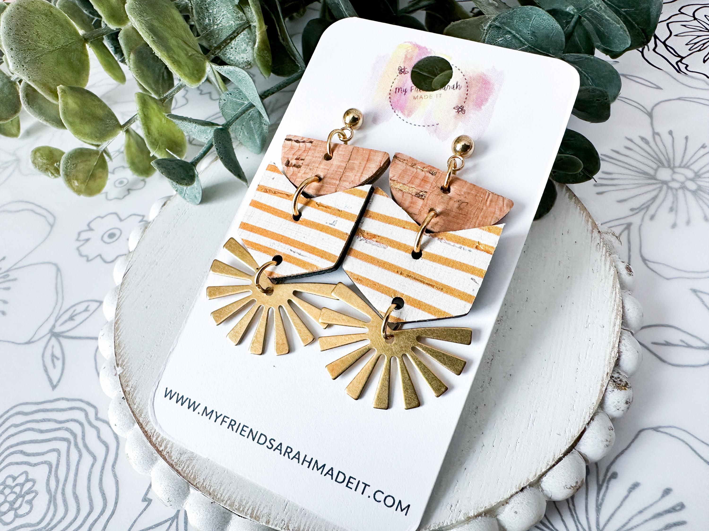 These fun geometric earrings are petite but sassy. Three layers of cork & brass form a fun & cohesive look that's interesting without being overwhelming!