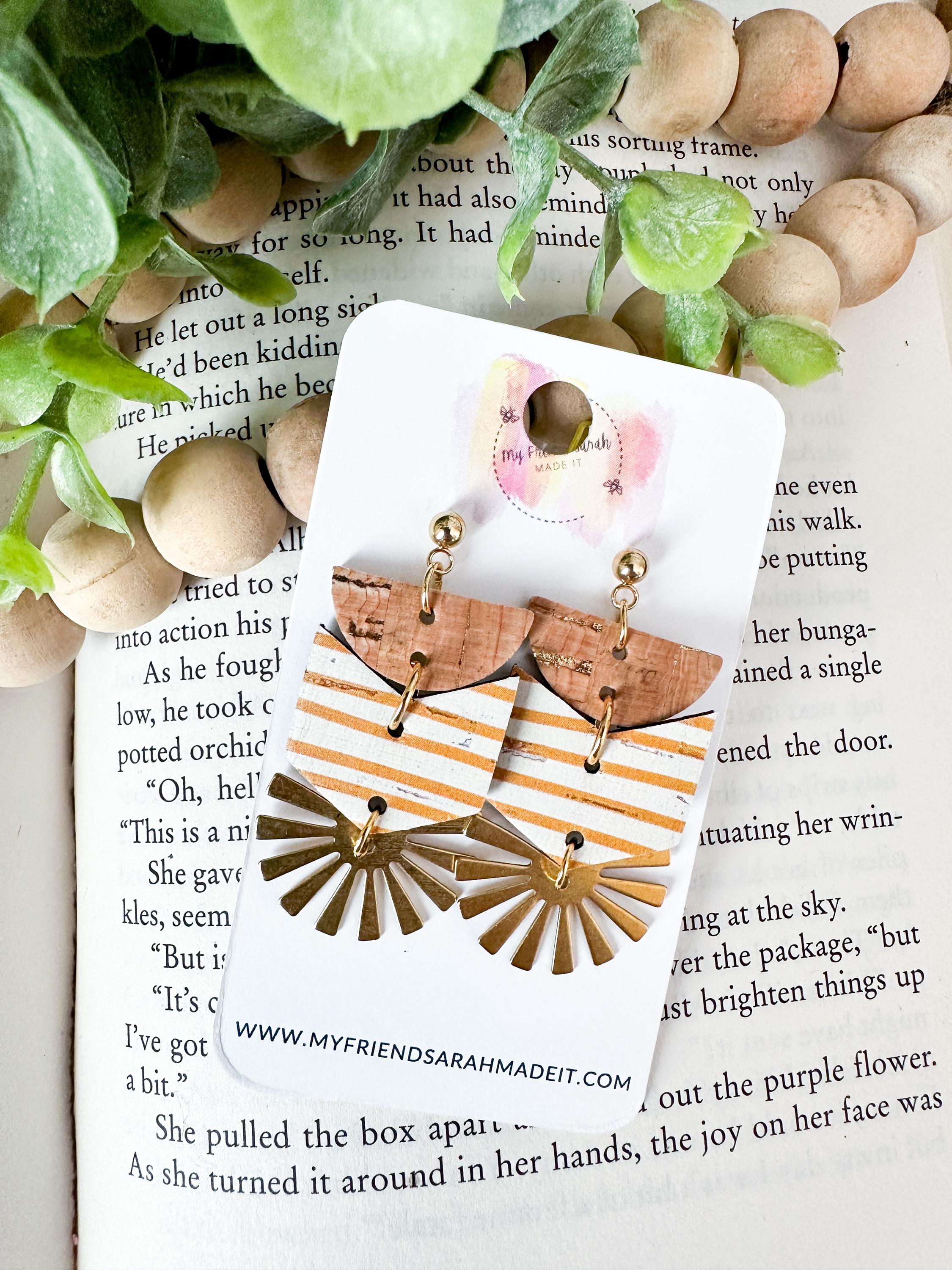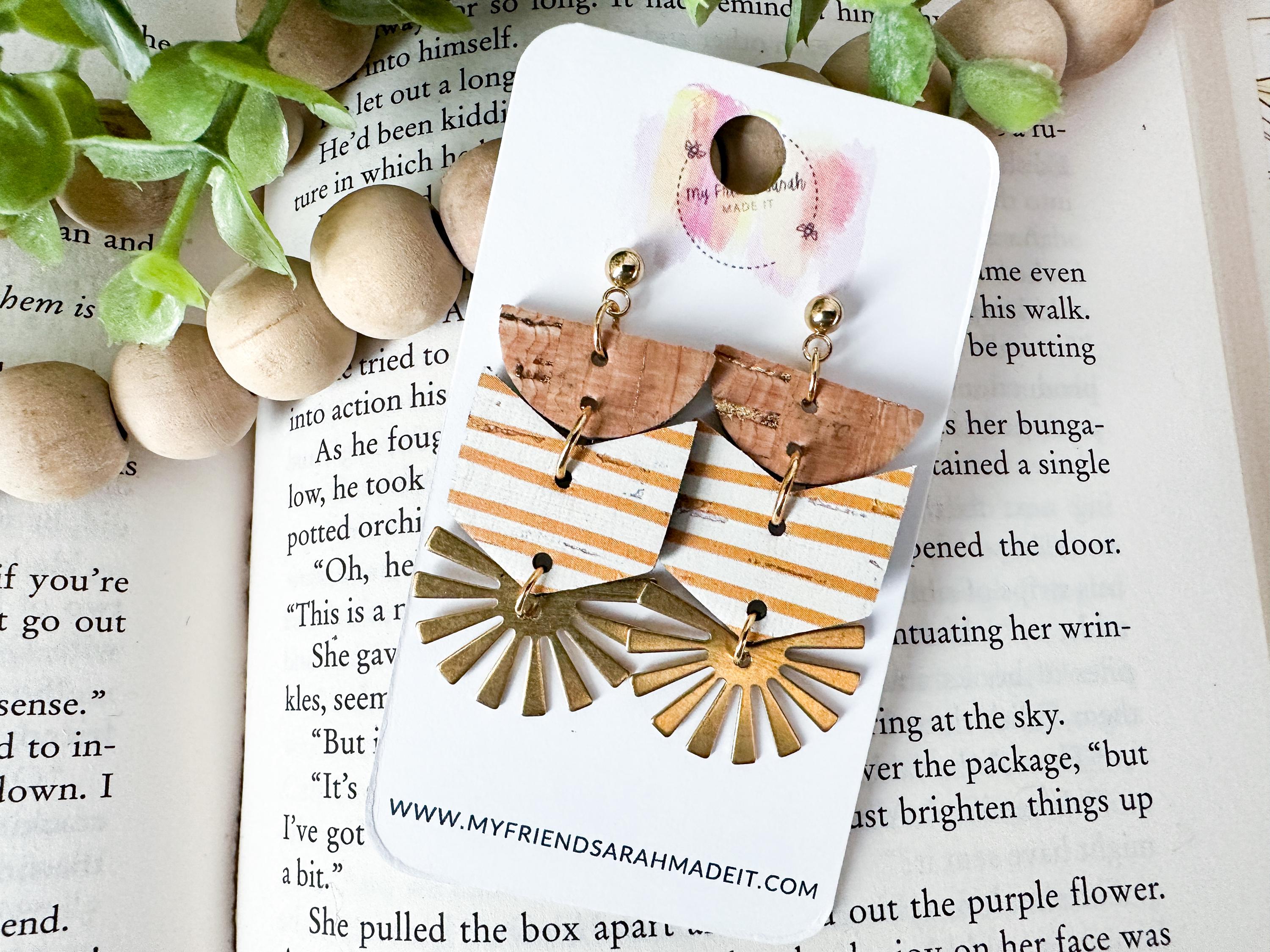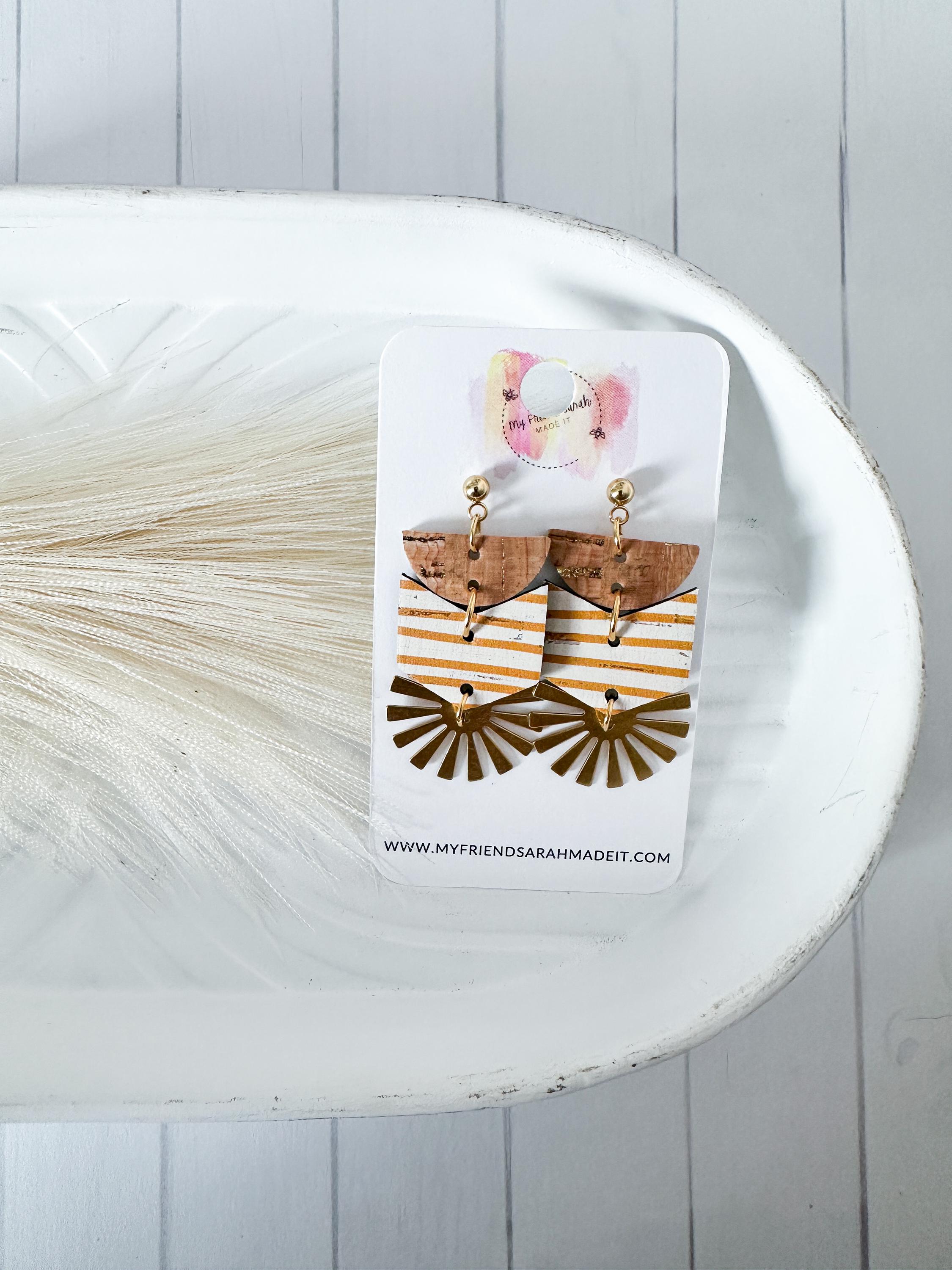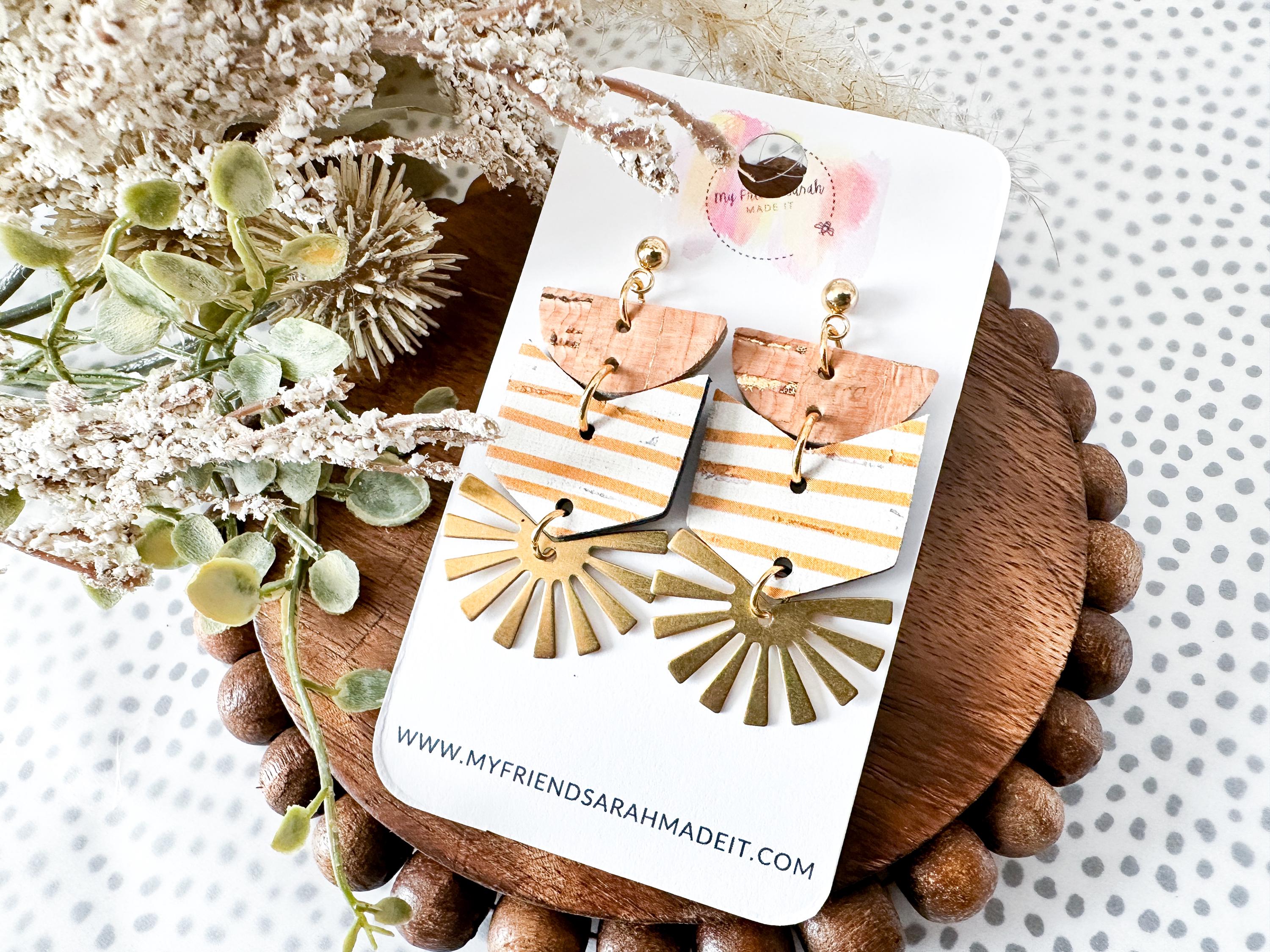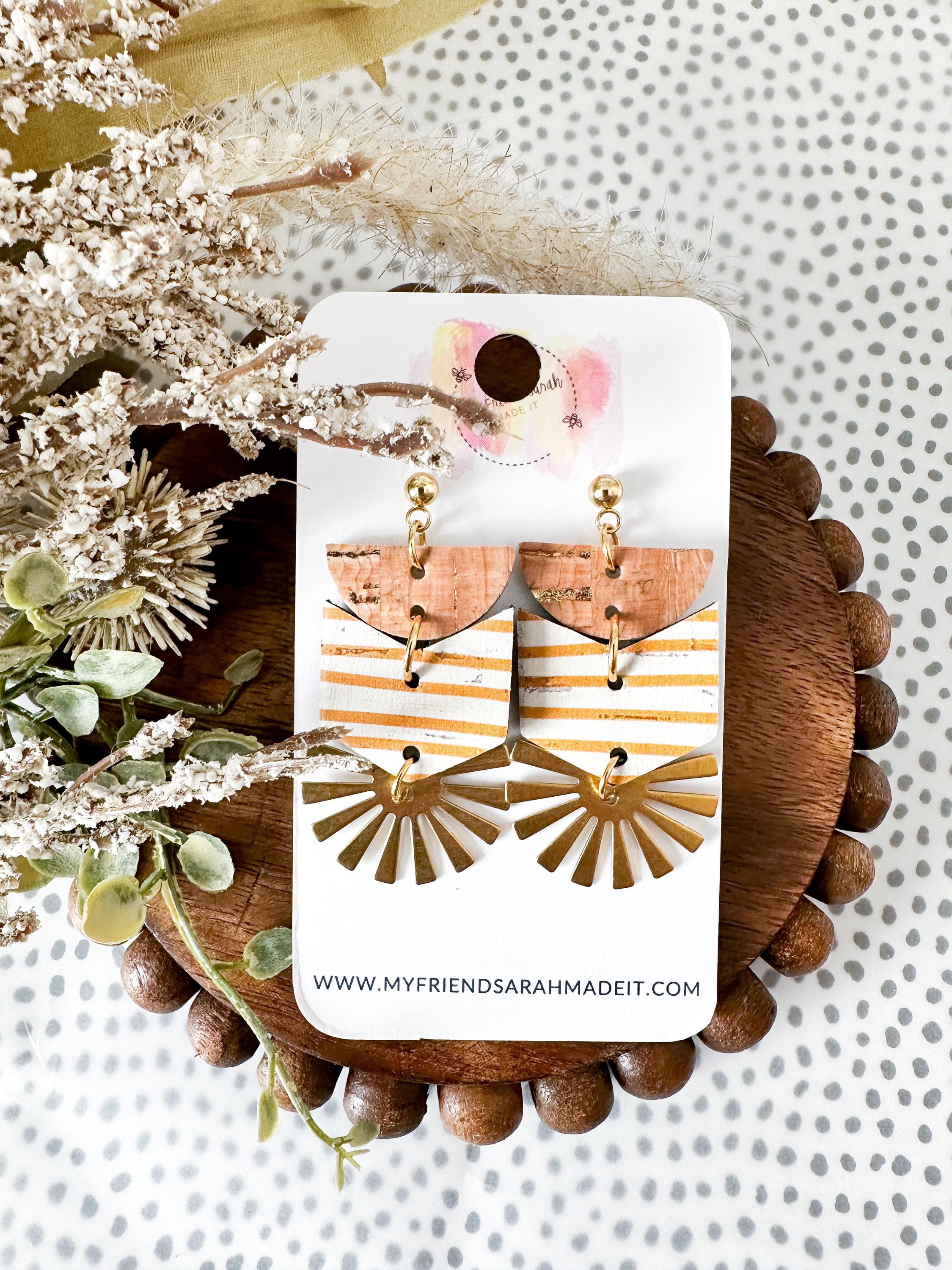 These fun geometric earrings are petite but sassy. Three layers of cork & brass form a fun & cohesive look that's interesting without being overwhelming!