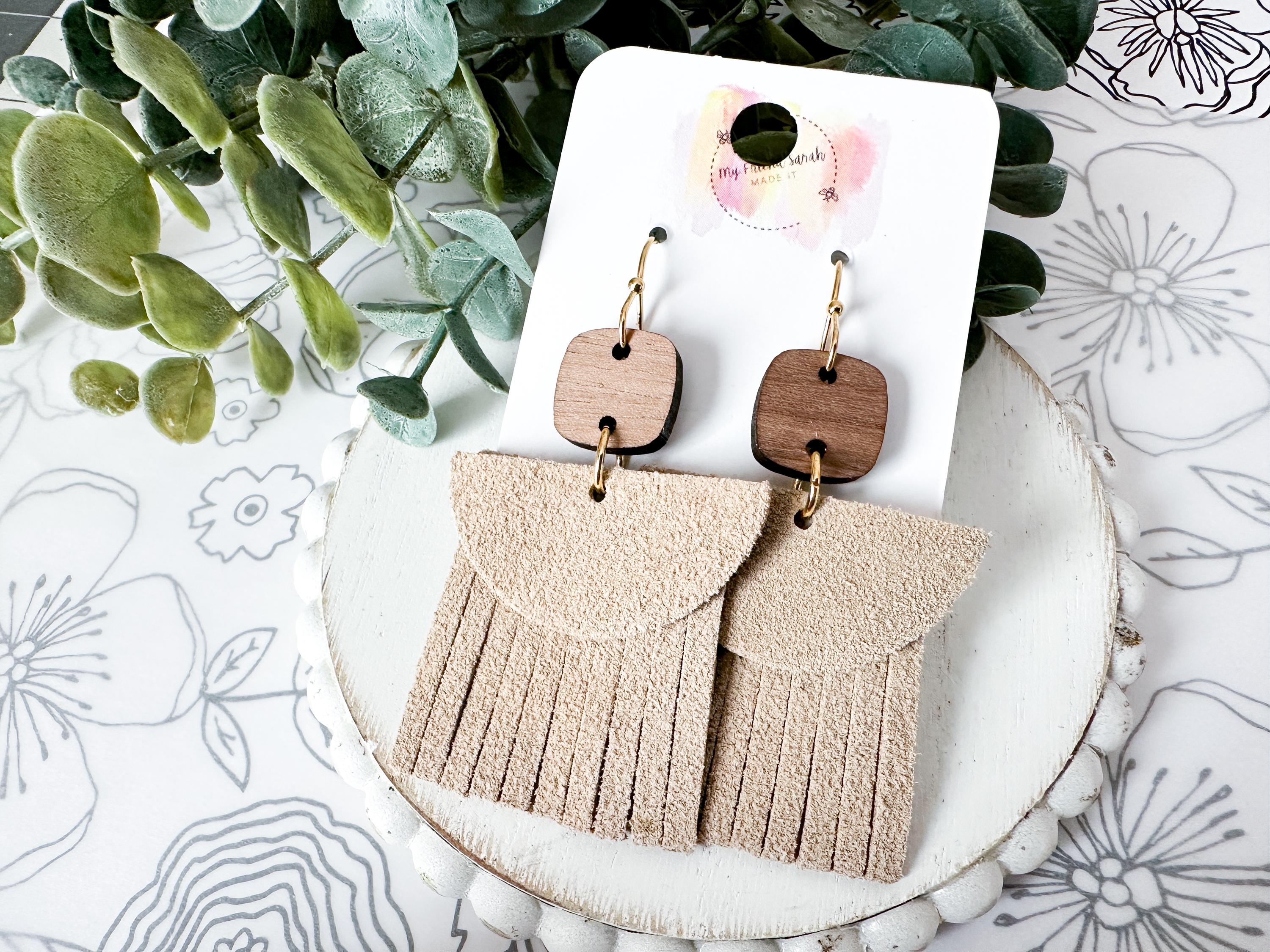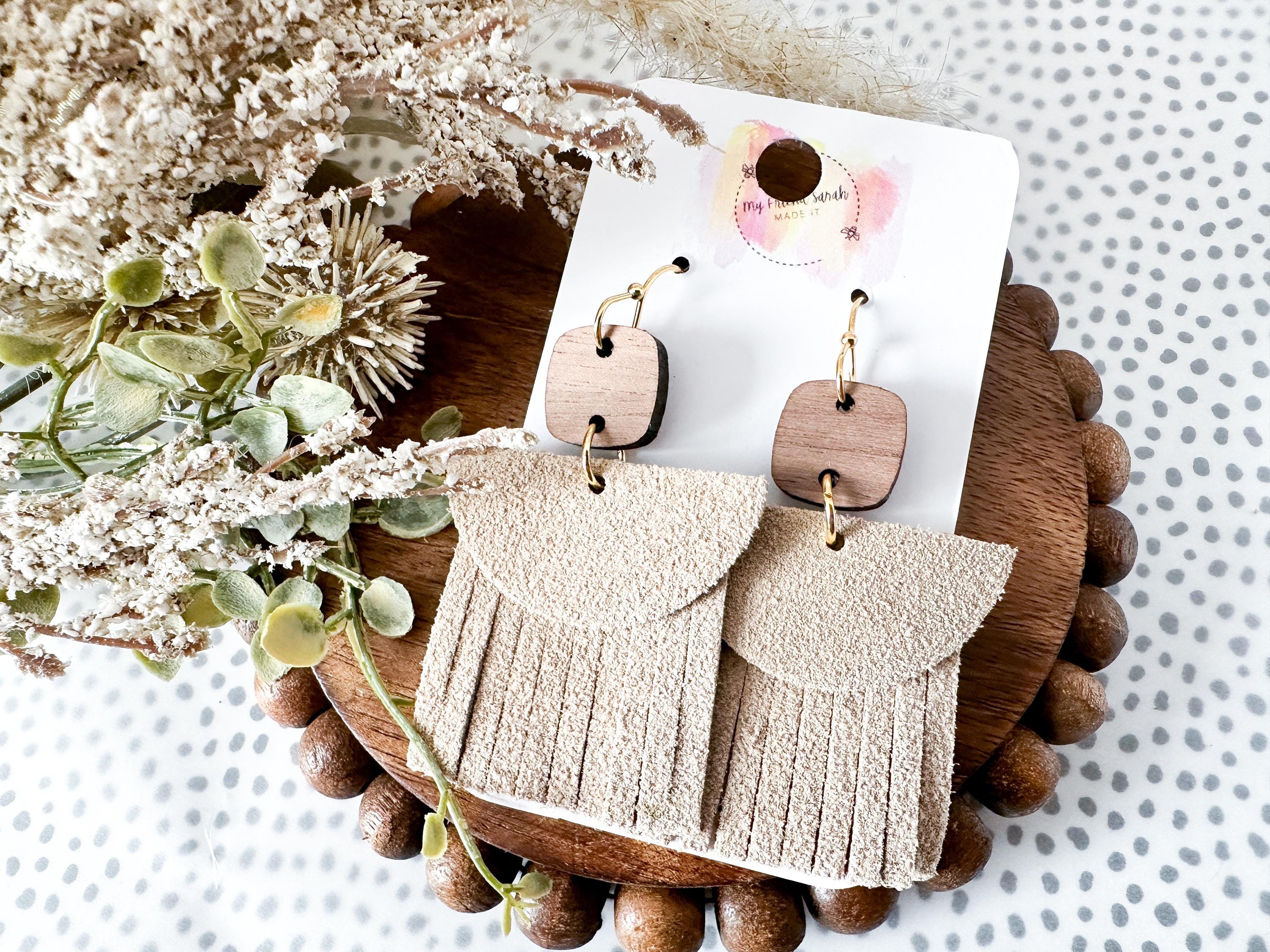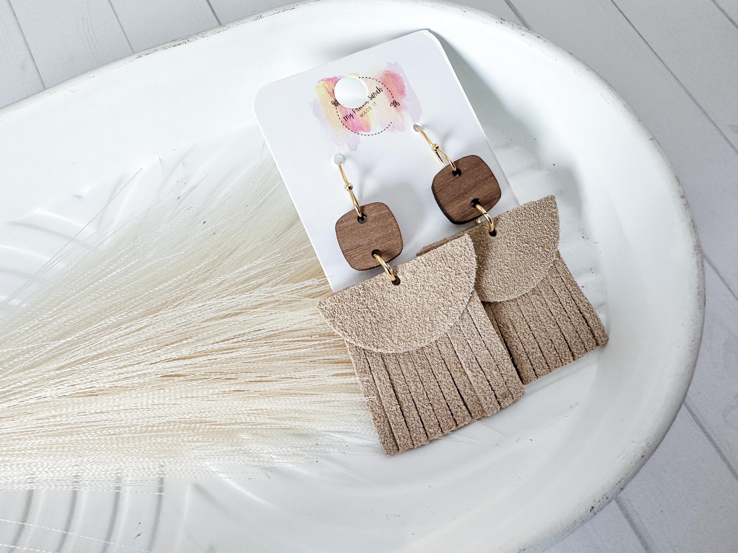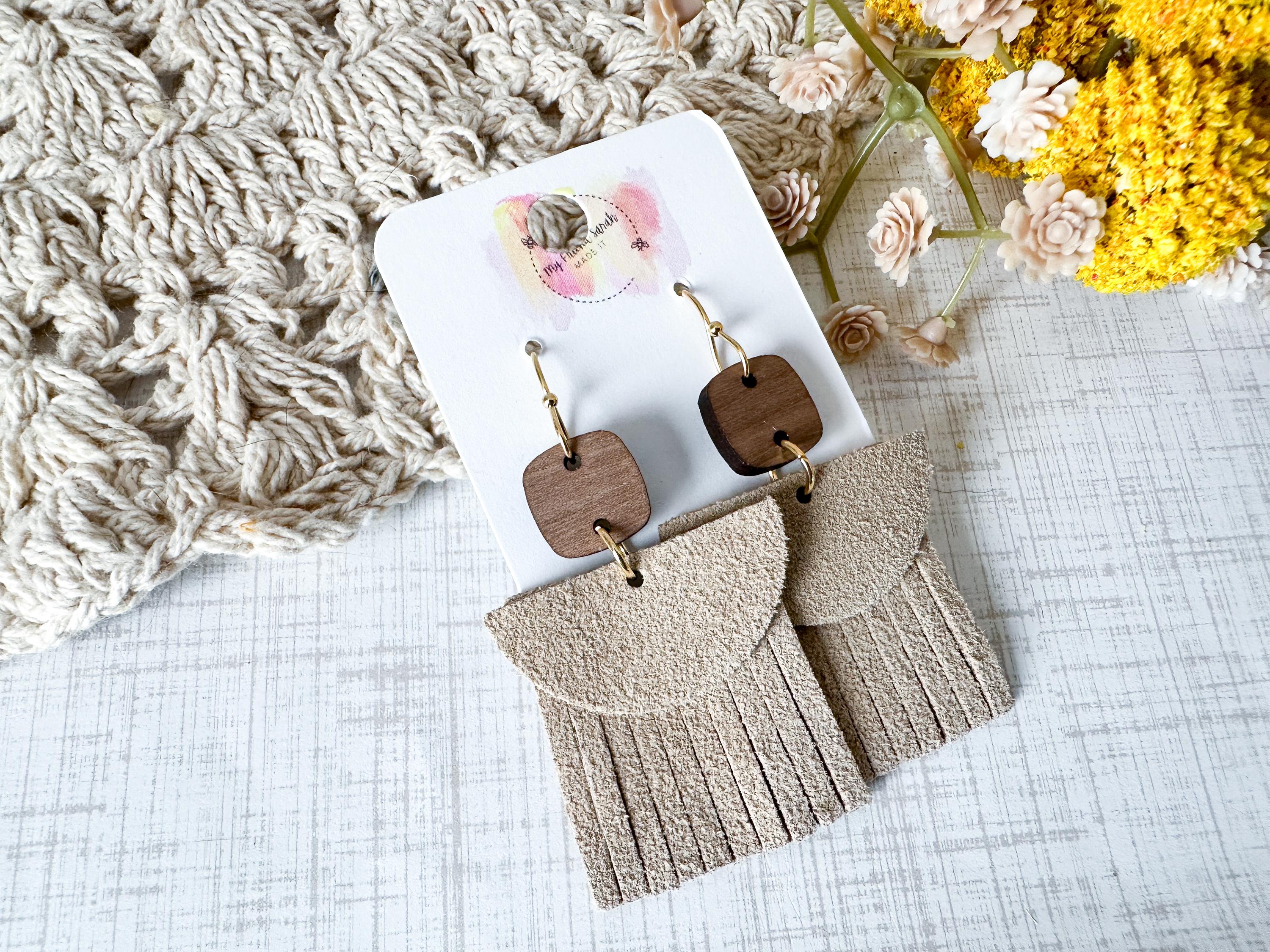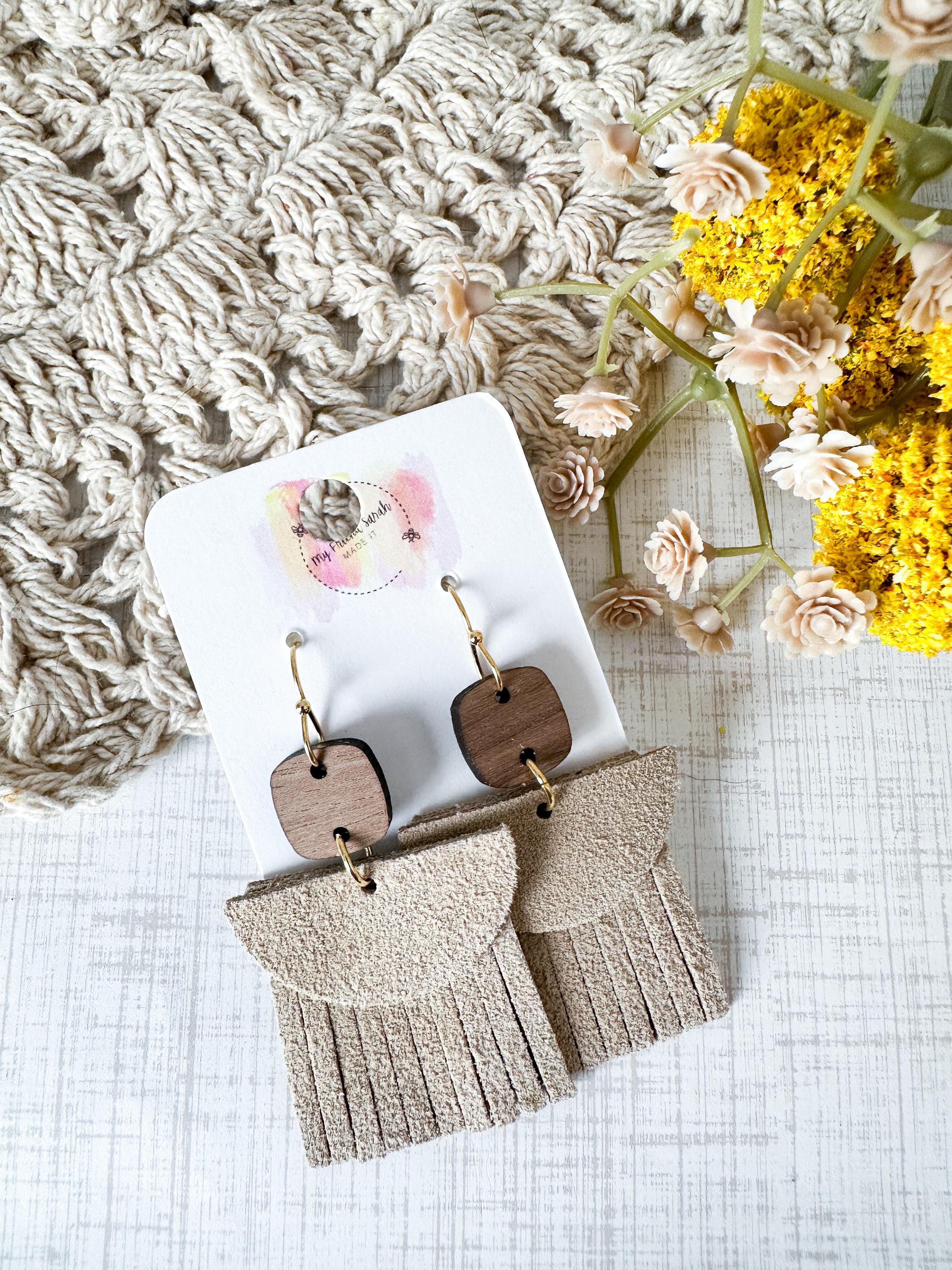 These darling boho earrings are made from two layers of the softest sand suede and topped with a rounded square of wood. These are such a fun neutral - perfect for everyday wear. Winter to summer, you've got something in your closet that these would go great with.