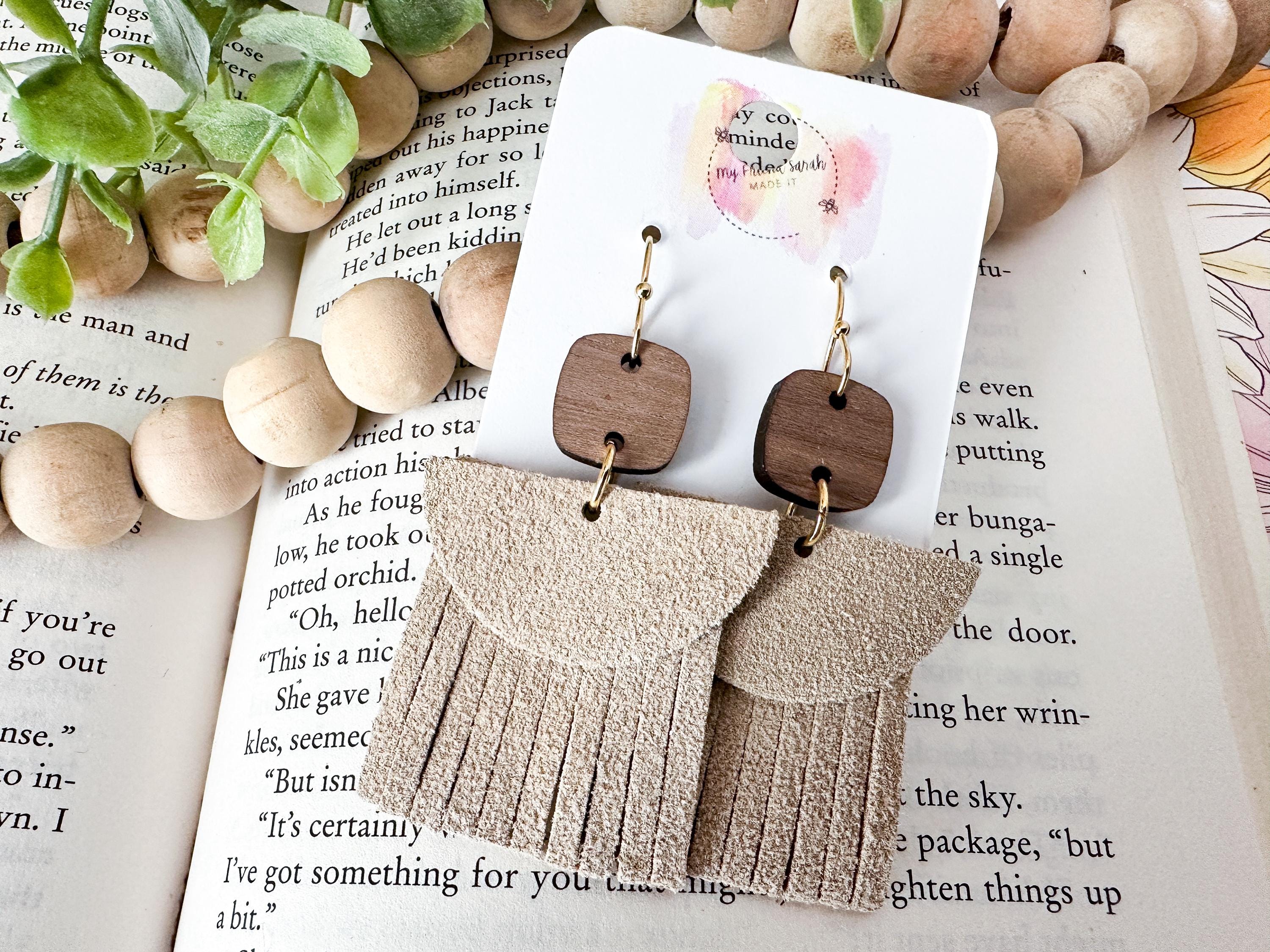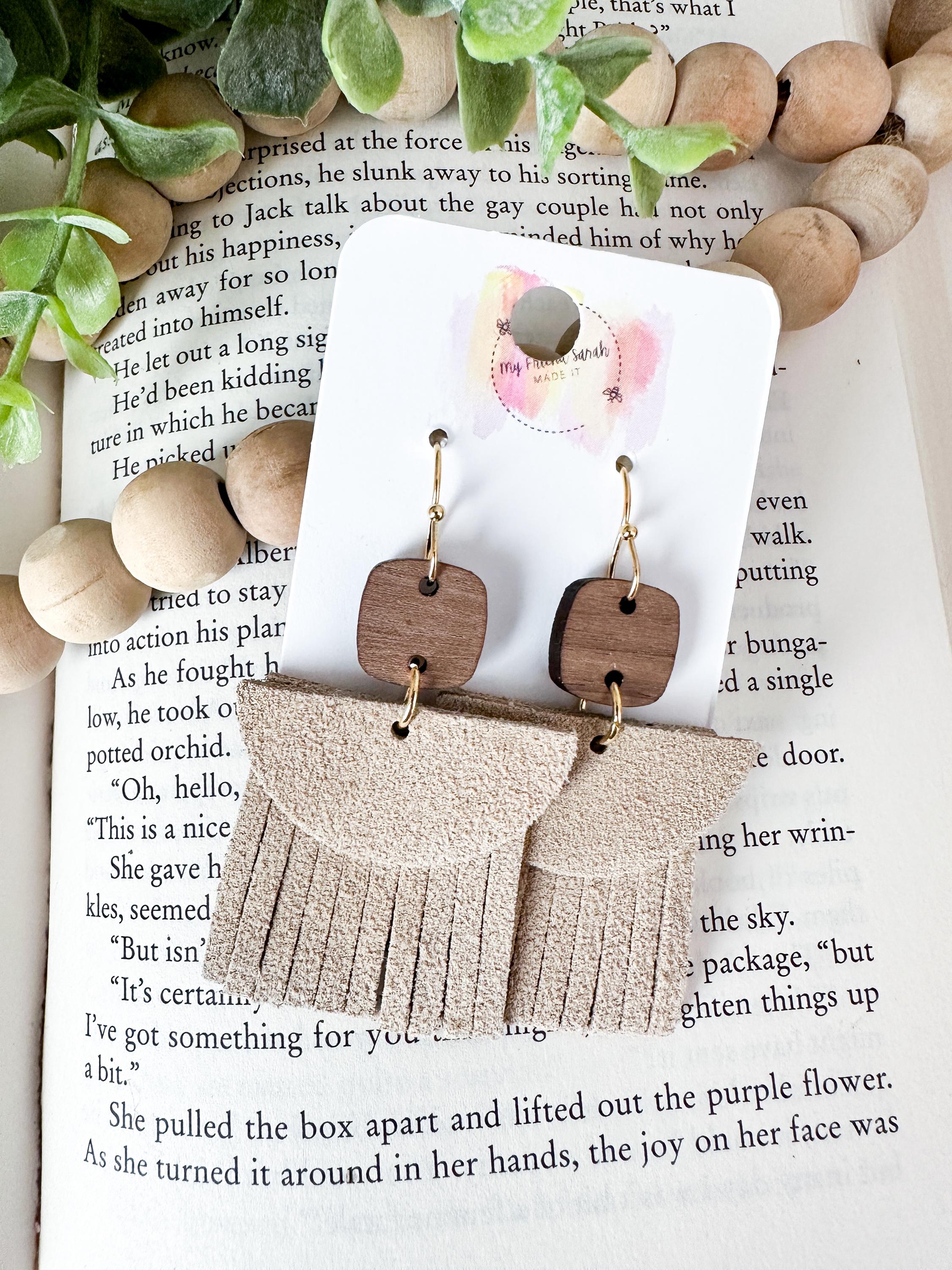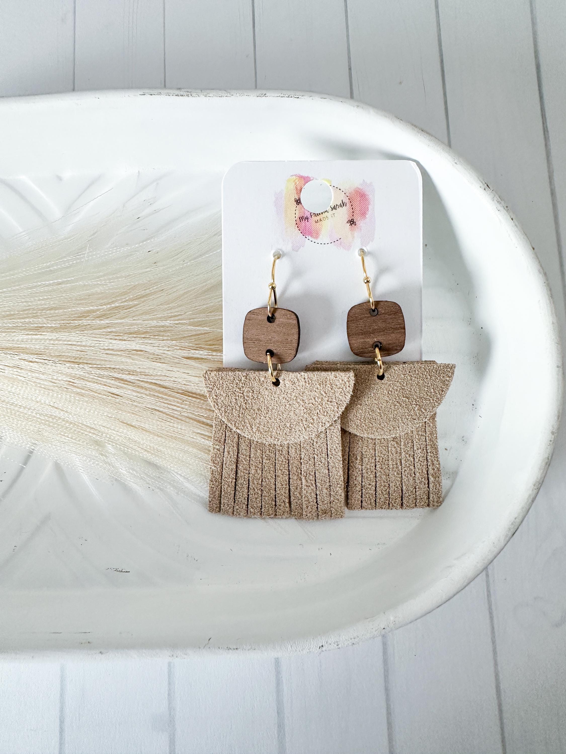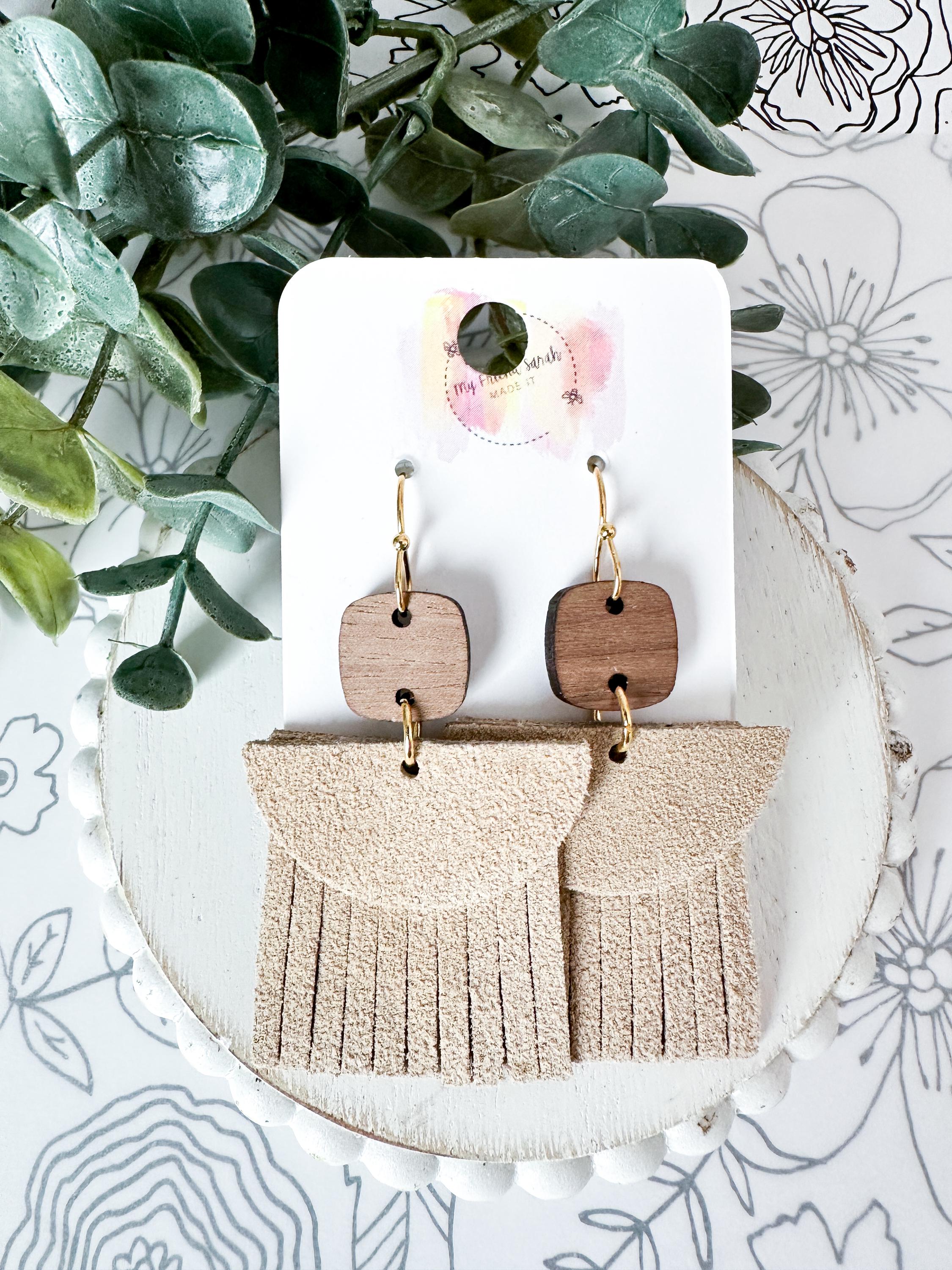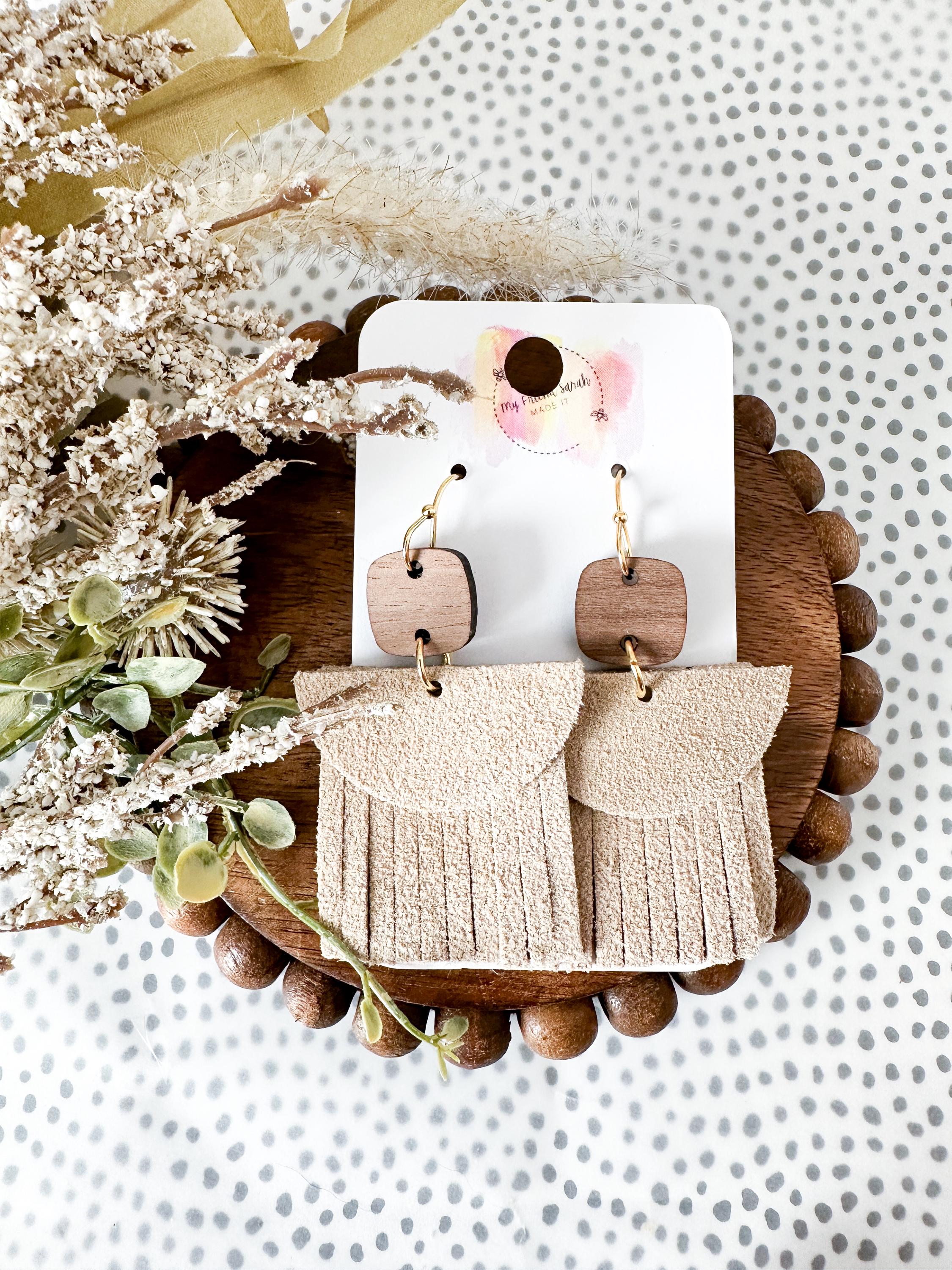 These darling boho earrings are made from two layers of the softest sand suede and topped with a rounded square of wood. These are such a fun neutral - perfect for everyday wear. Winter to summer, you've got something in your closet that these would go great with.