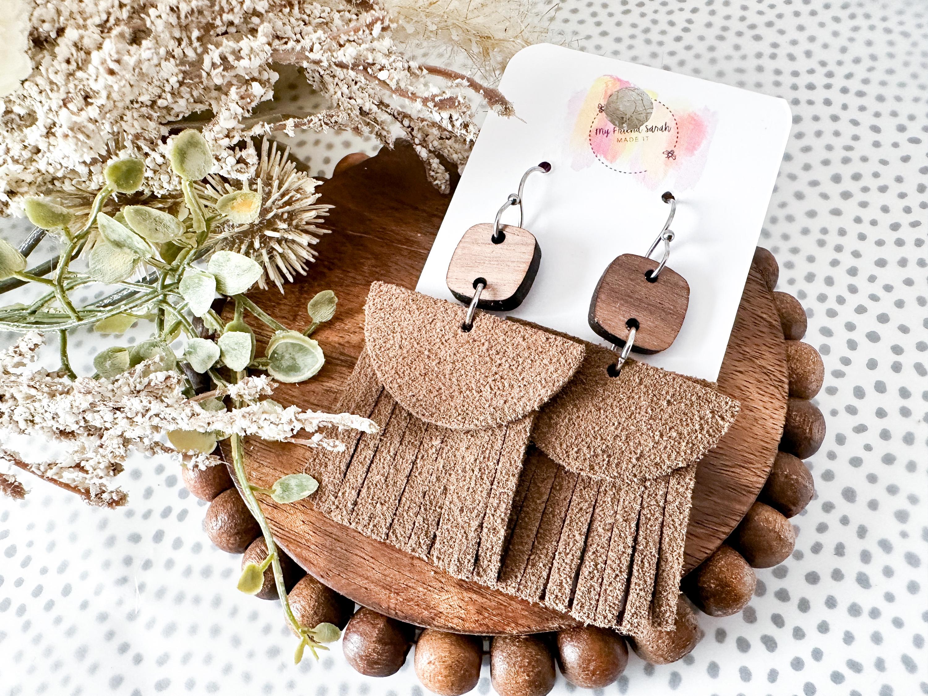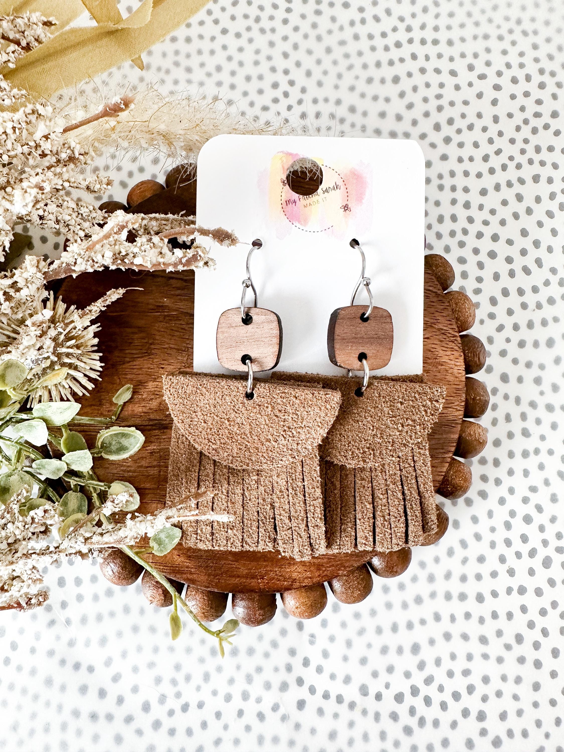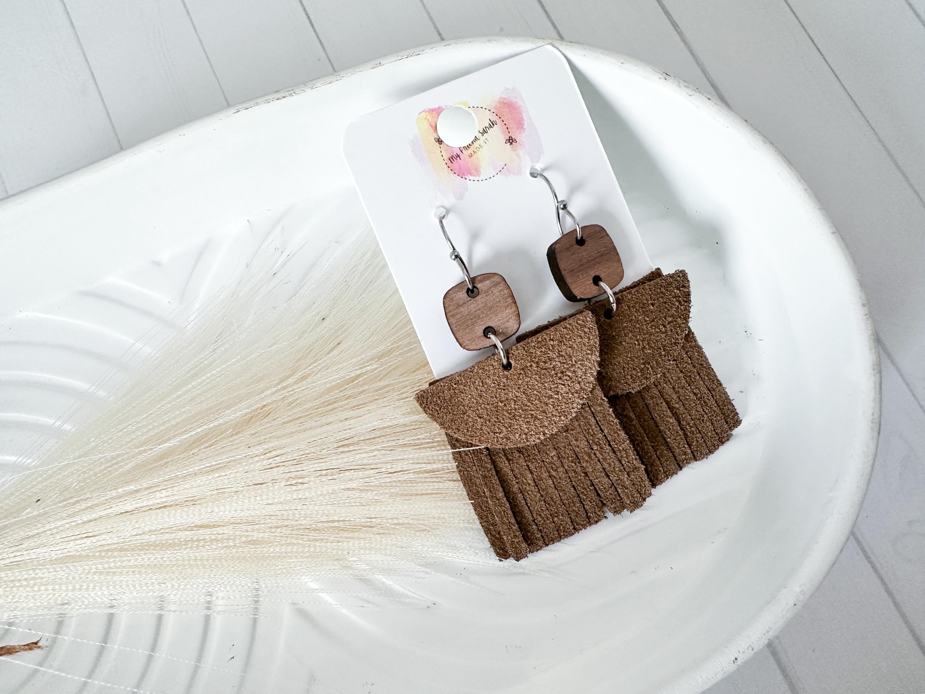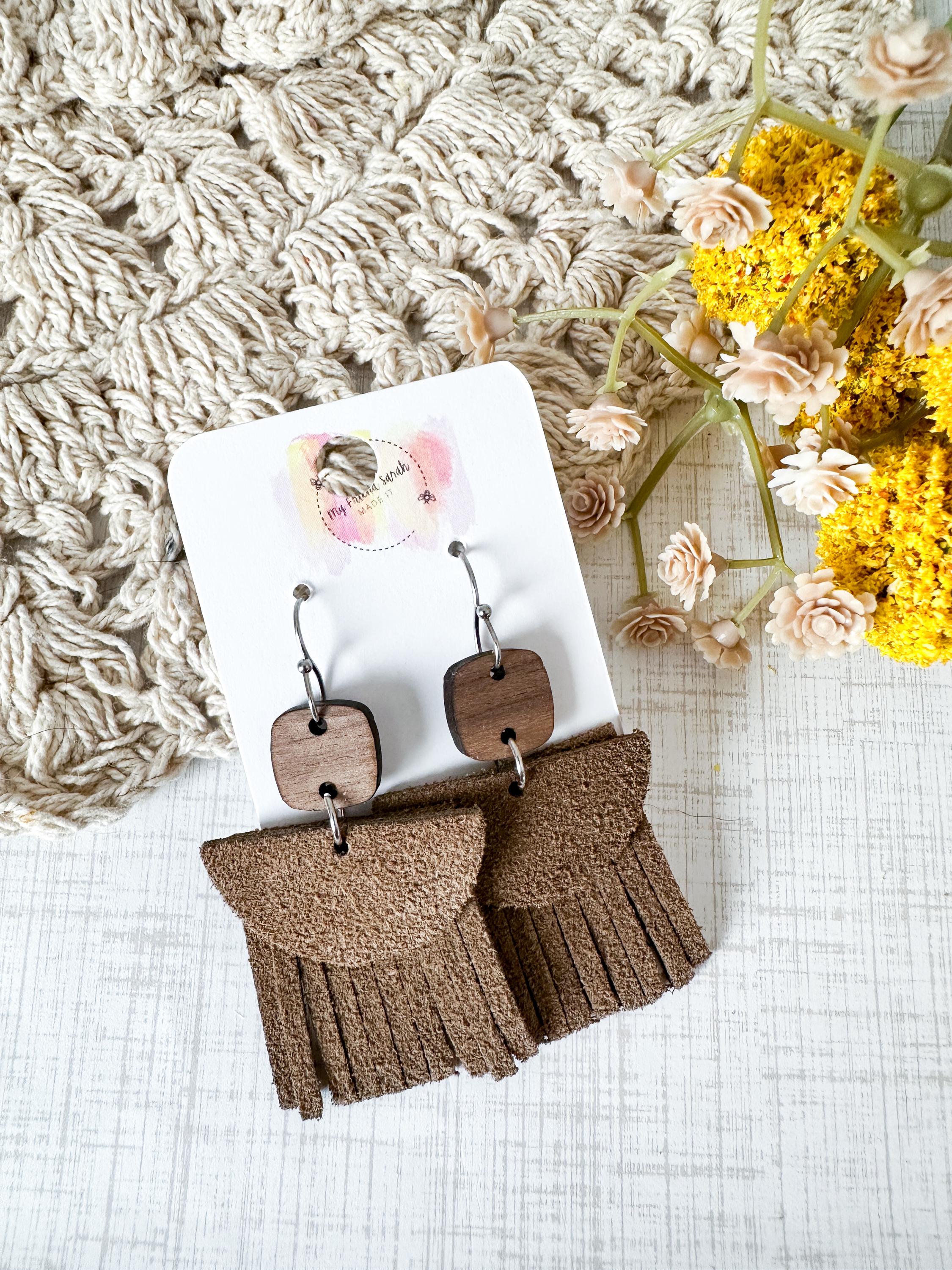 These darling boho earrings are made from two layers of the softest mocha hued suede and topped with a rounded square of wood. These are such a fun neutral - perfect for everyday wear. Winter to summer, you've got something in your closet that these would go great with.