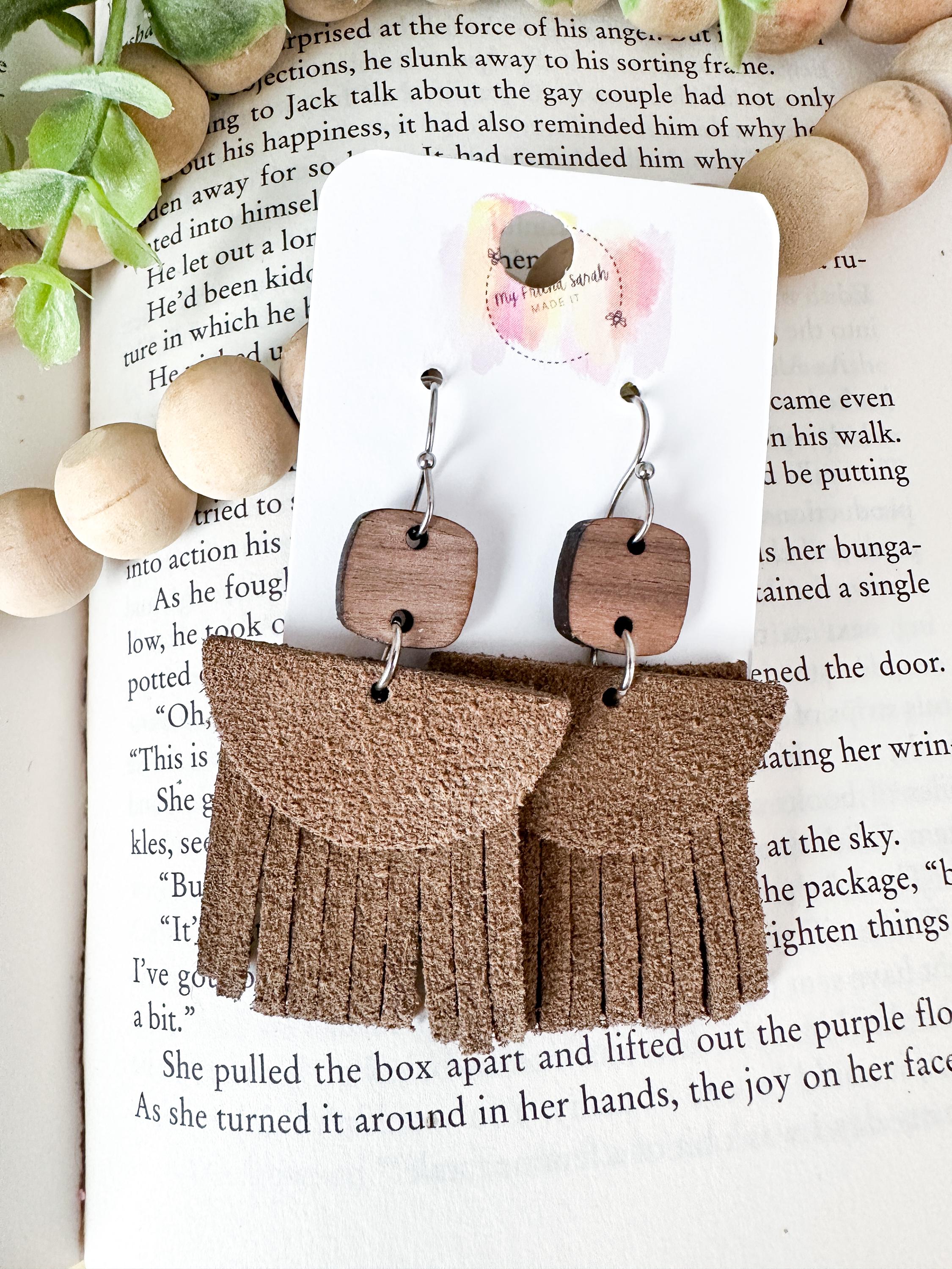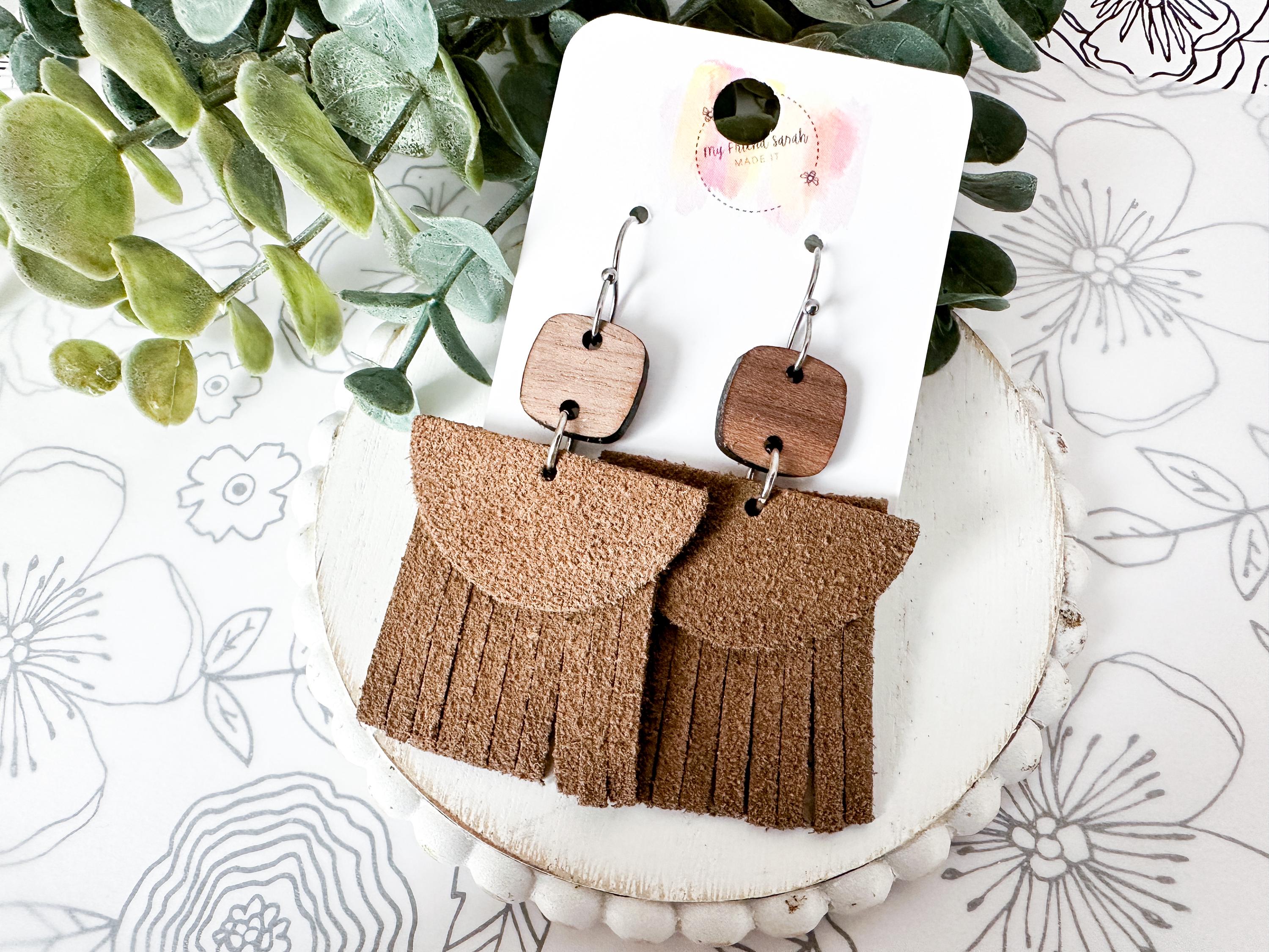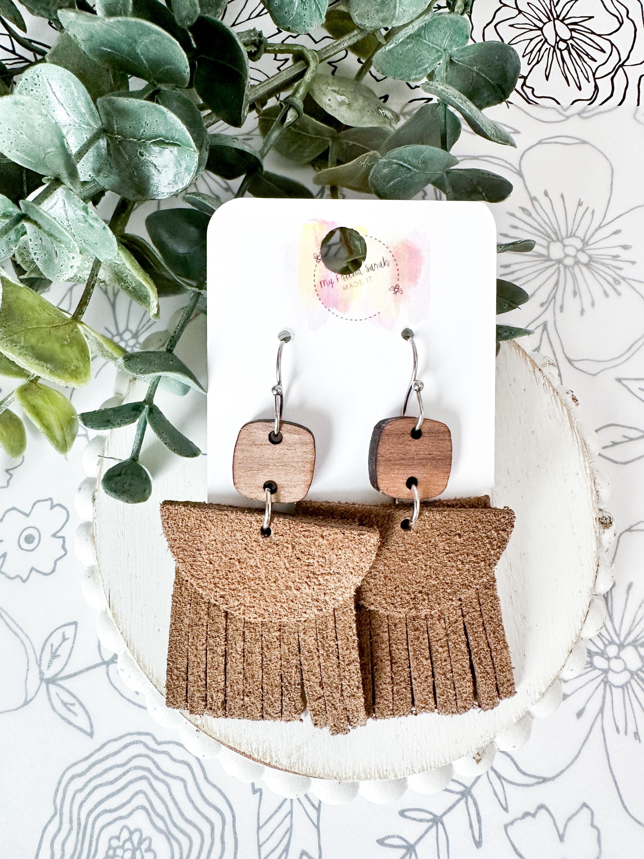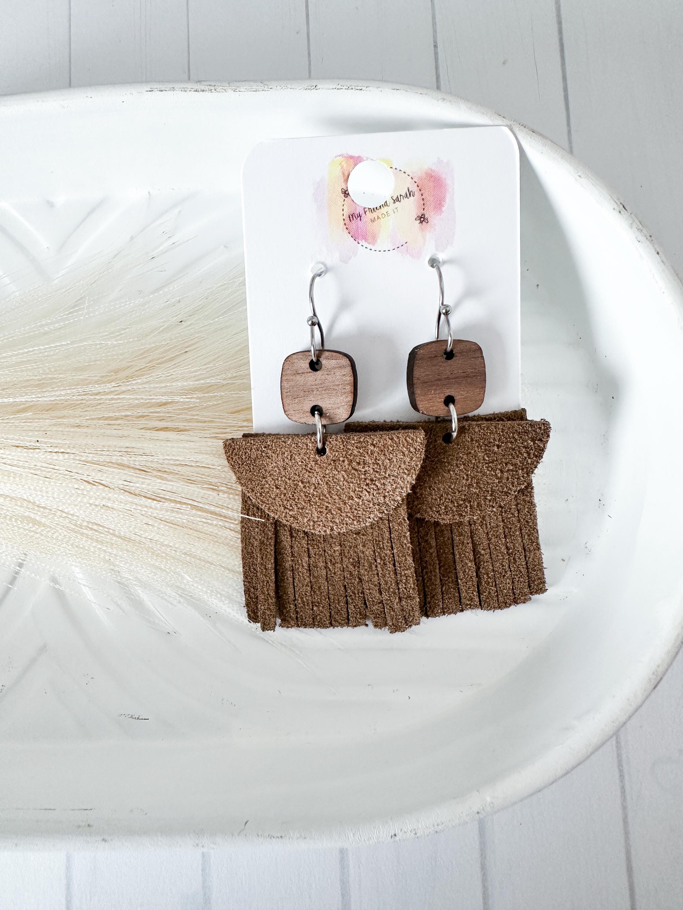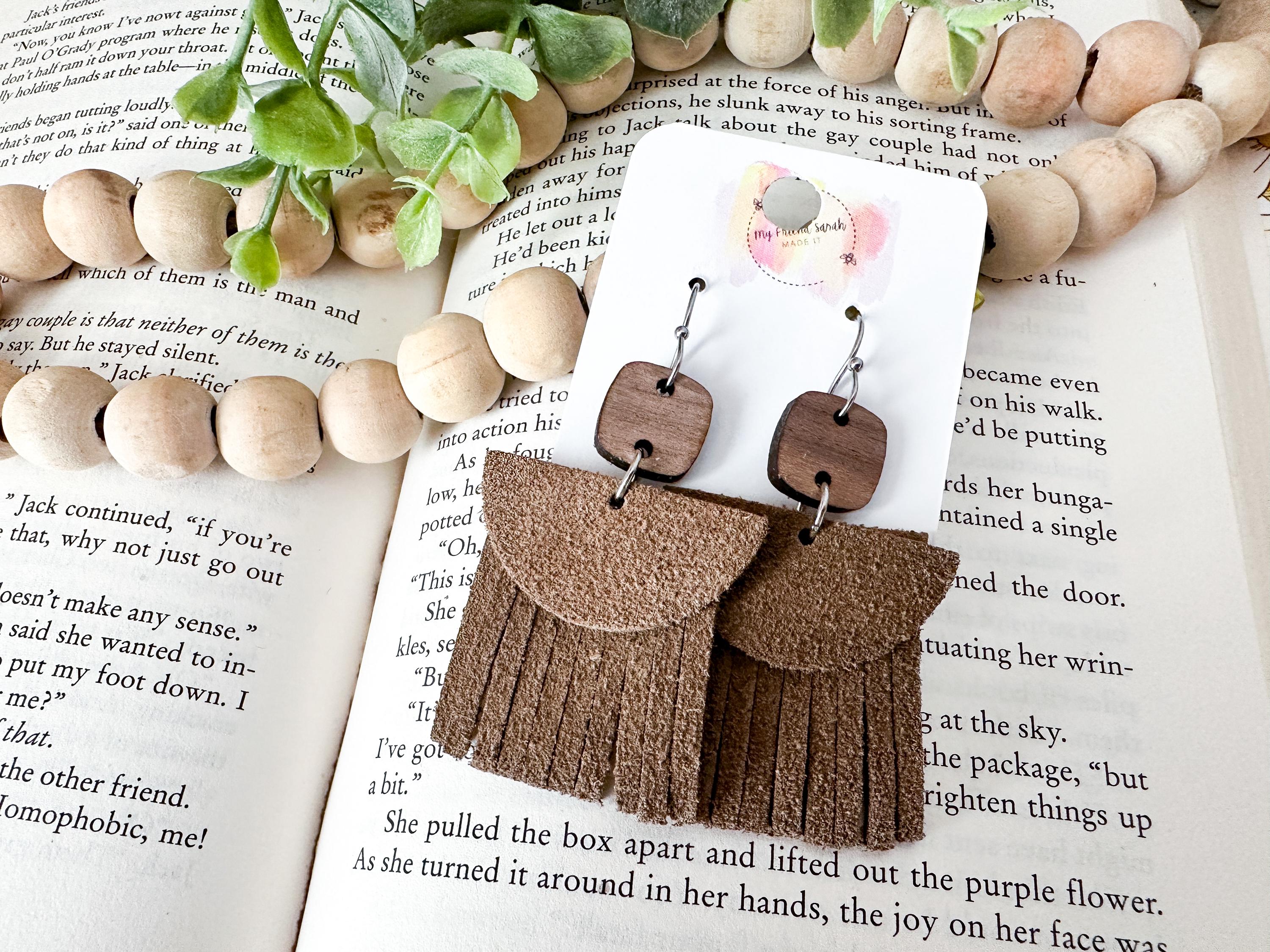 These darling boho earrings are made from two layers of the softest mocha hued suede and topped with a rounded square of wood. These are such a fun neutral - perfect for everyday wear. Winter to summer, you've got something in your closet that these would go great with.