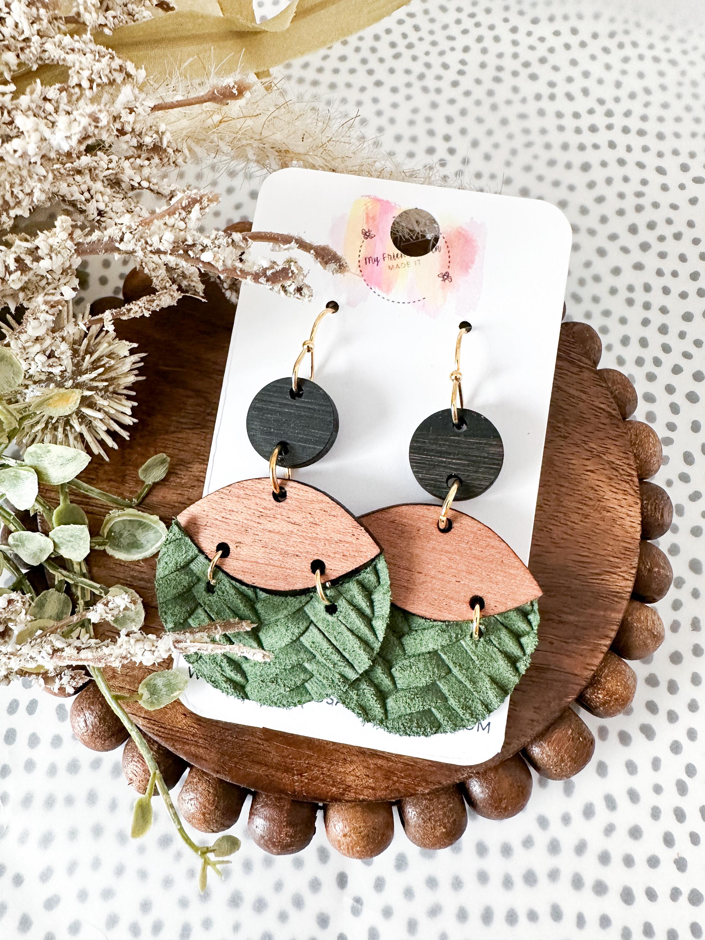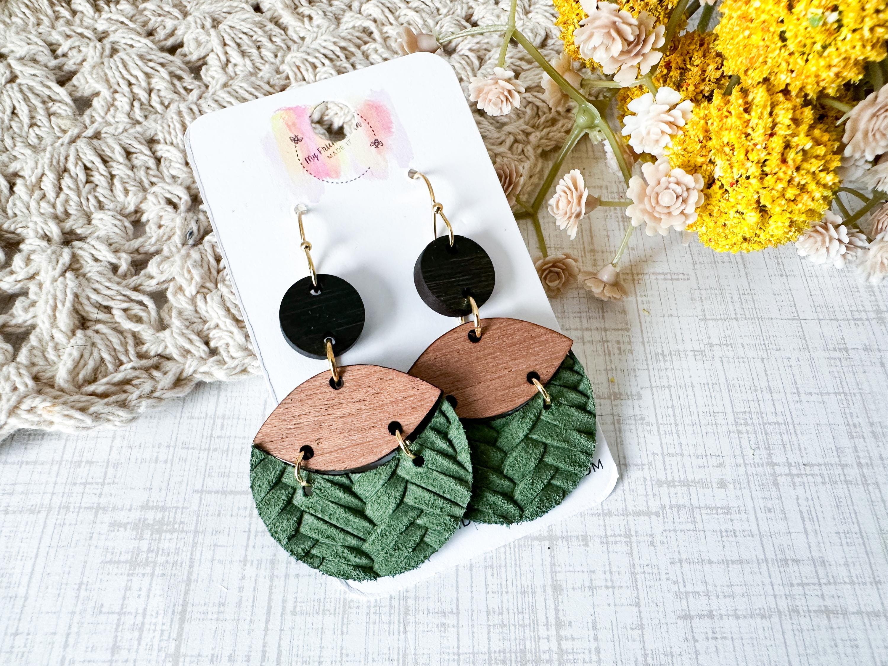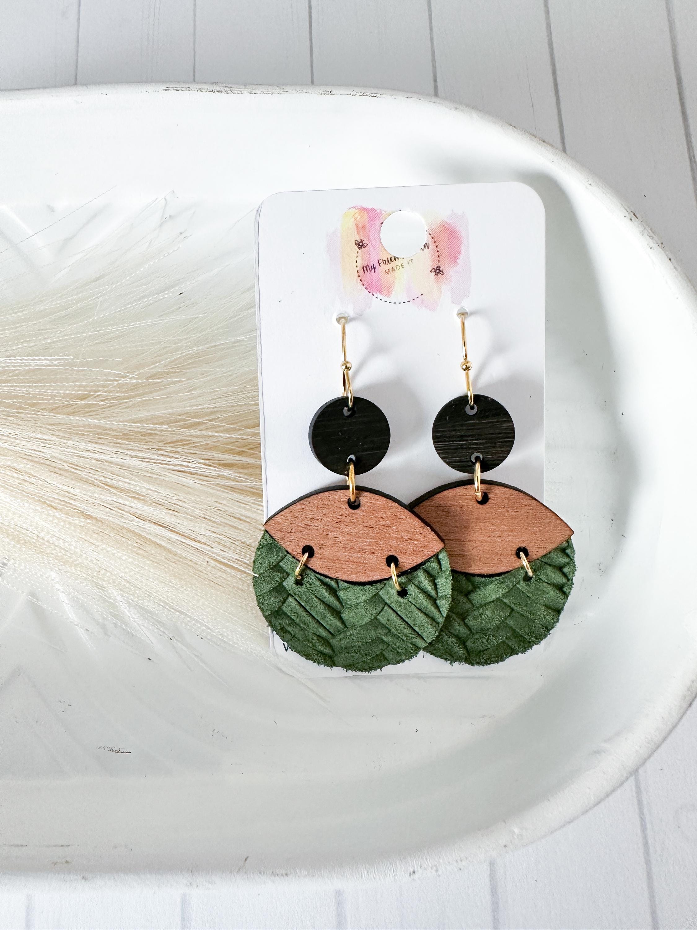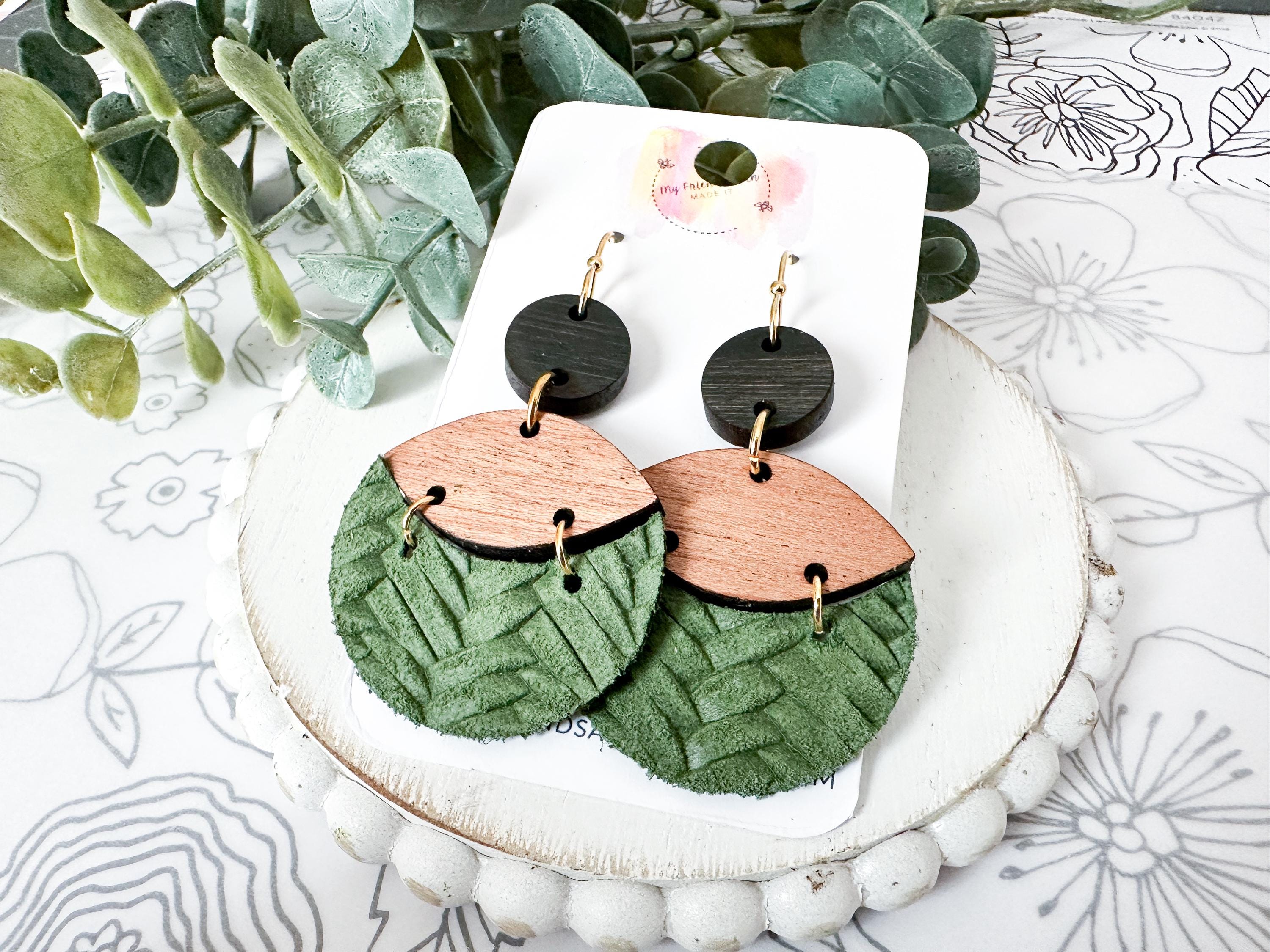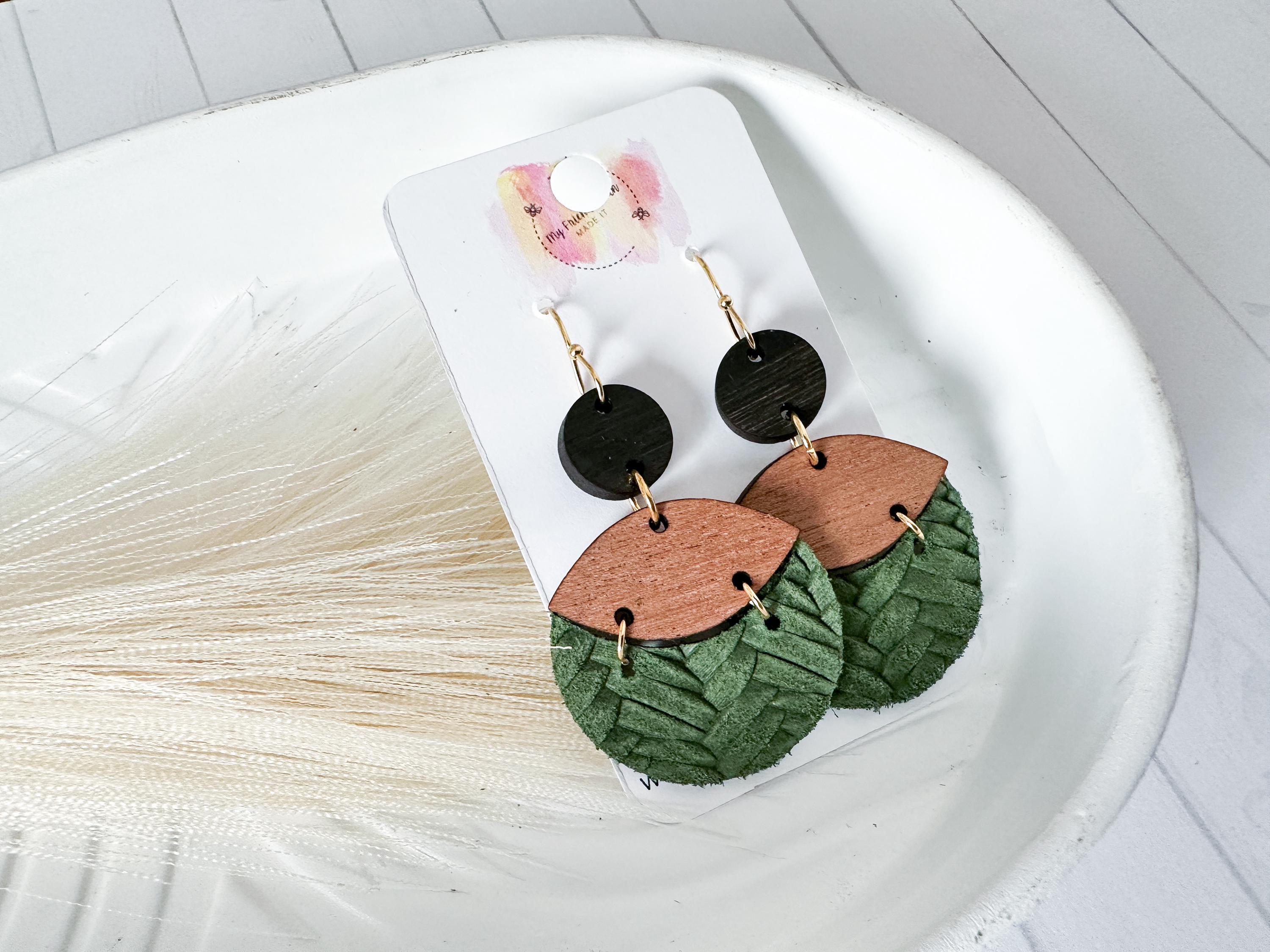 These fun geometric earrings feature three stacks of materials to create a unique shape! The black & neutral wood tones play beautifully off the green braided leather for a piece that's interesting while staying neutral for year round wear.