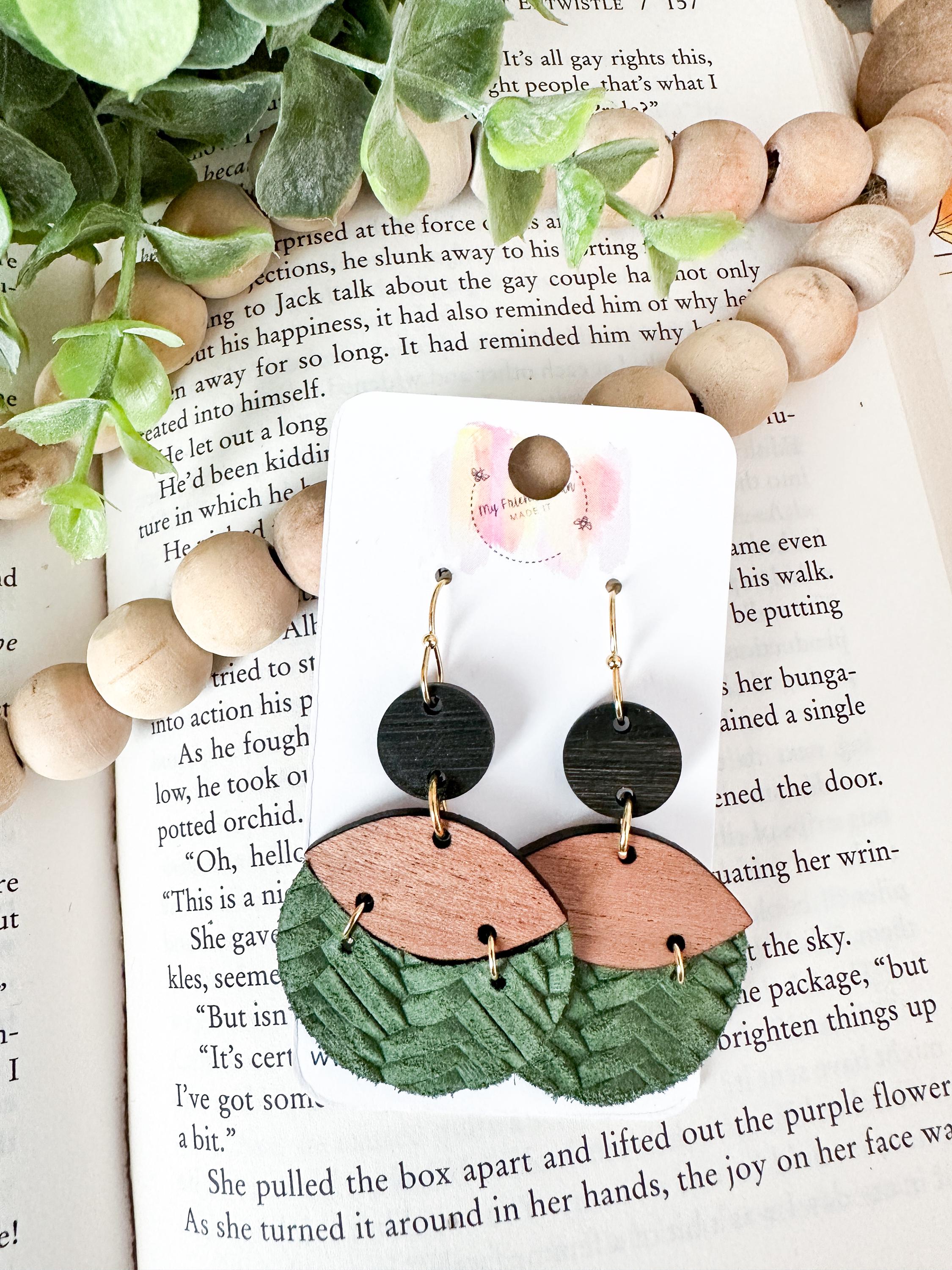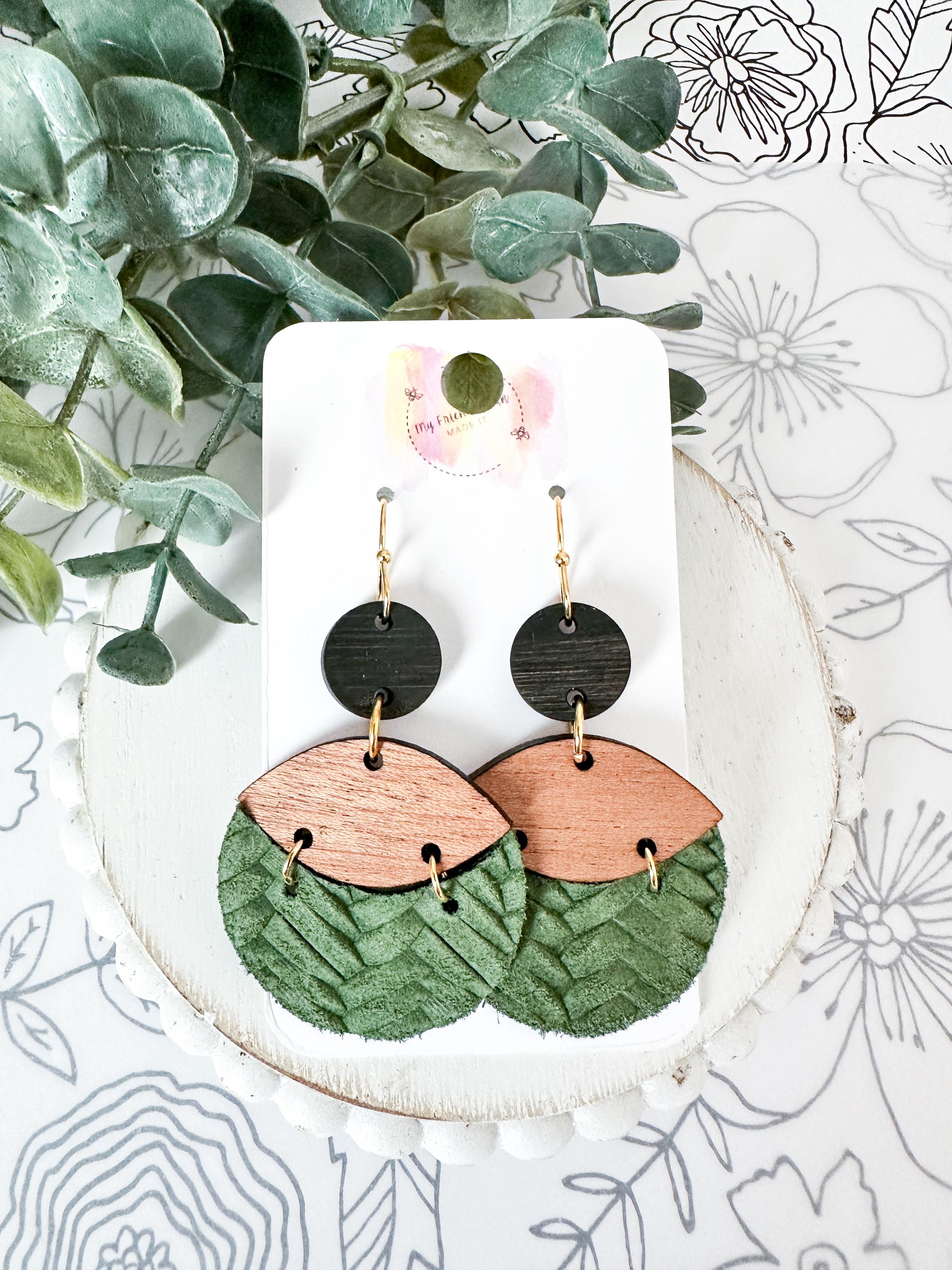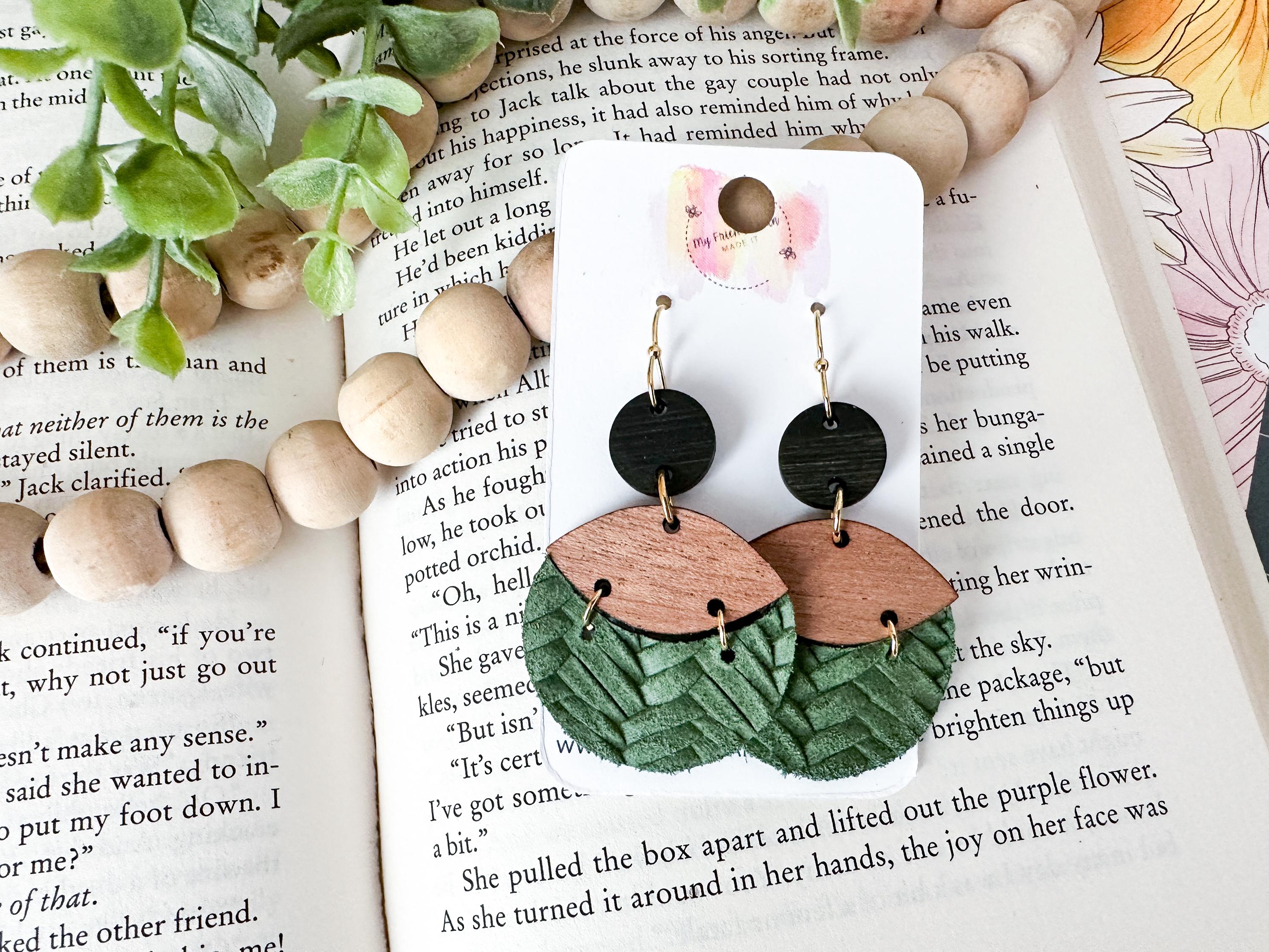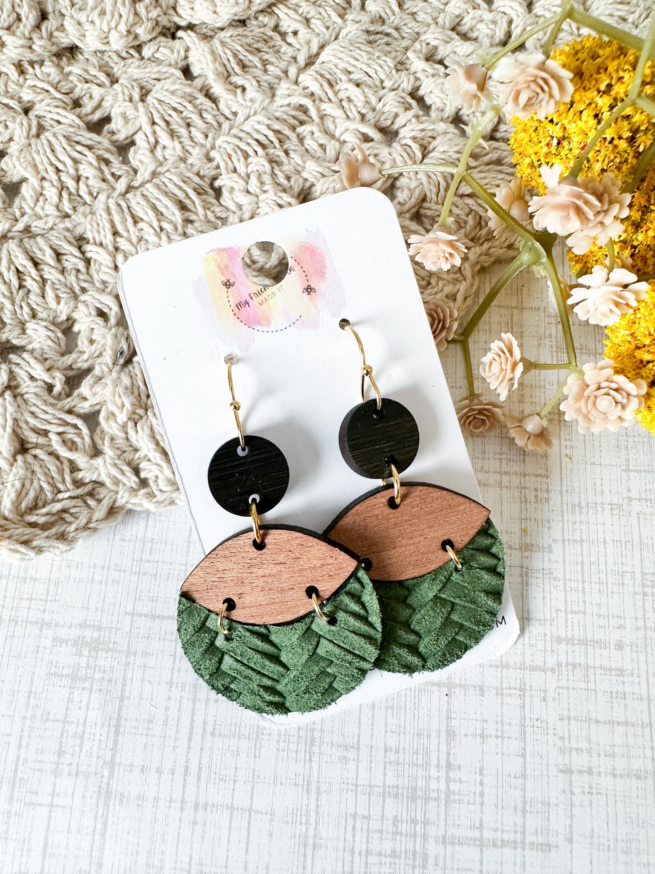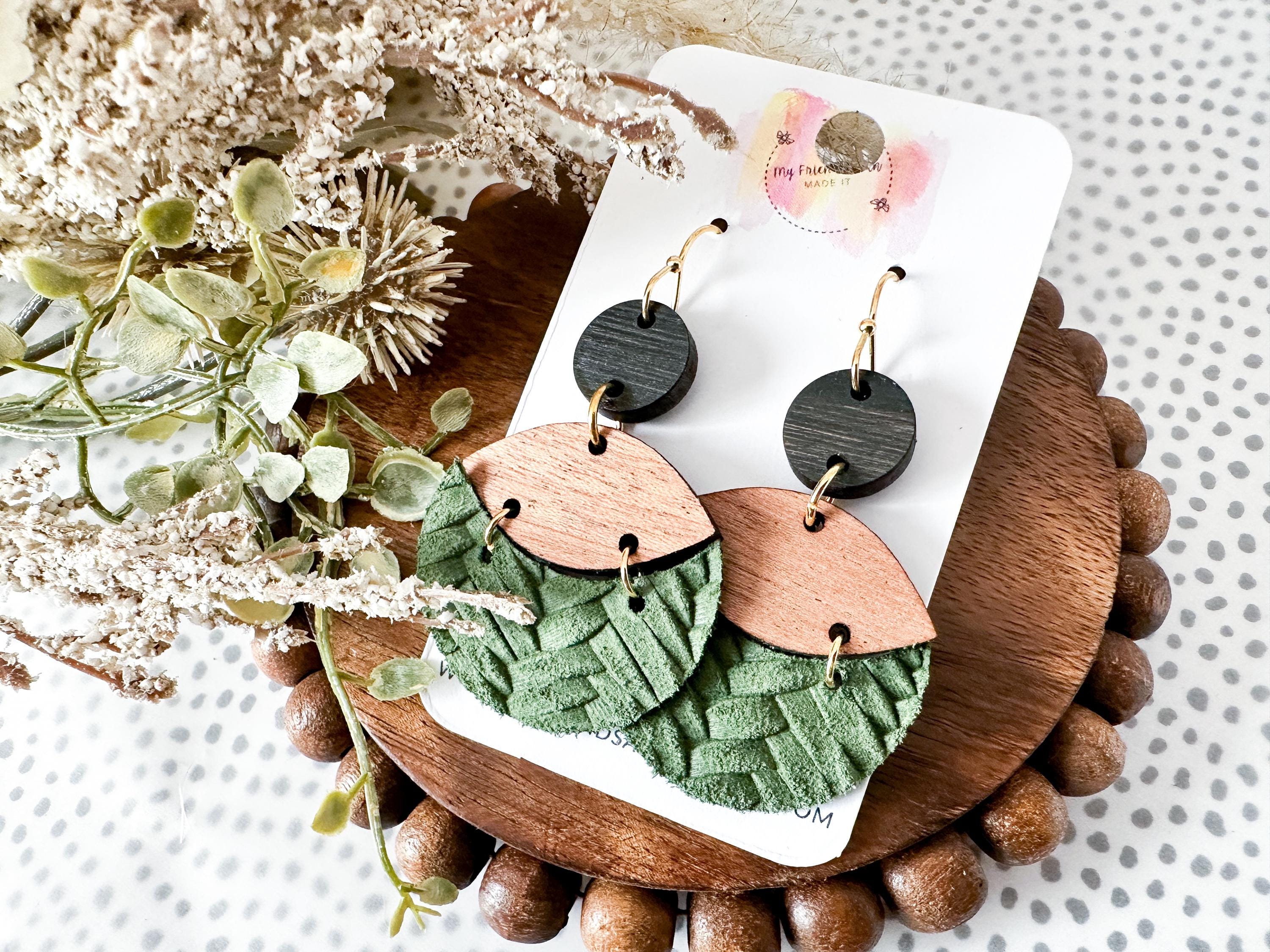 These fun geometric earrings feature three stacks of materials to create a unique shape! The black & neutral wood tones play beautifully off the green braided leather for a piece that's interesting while staying neutral for year round wear.