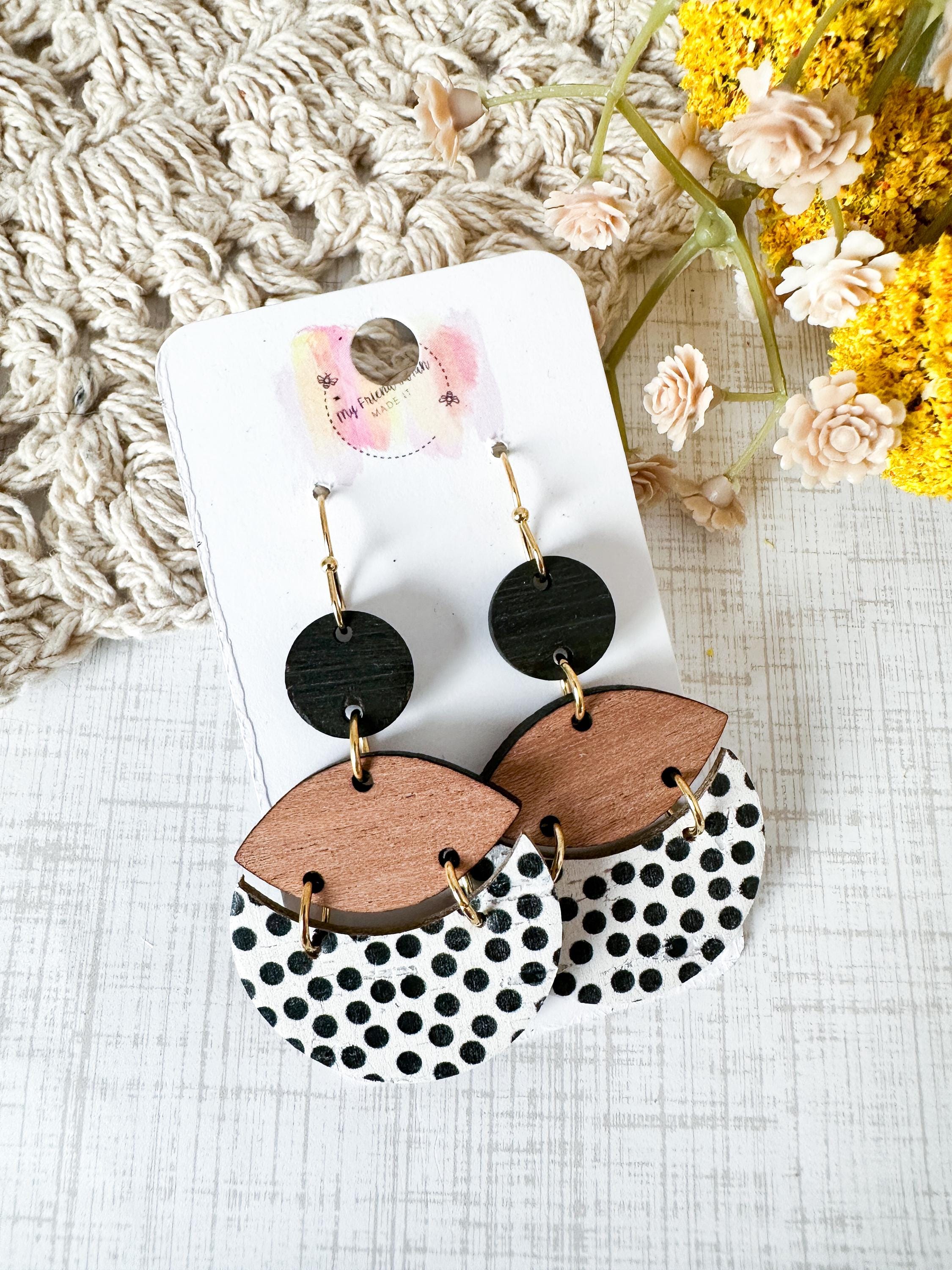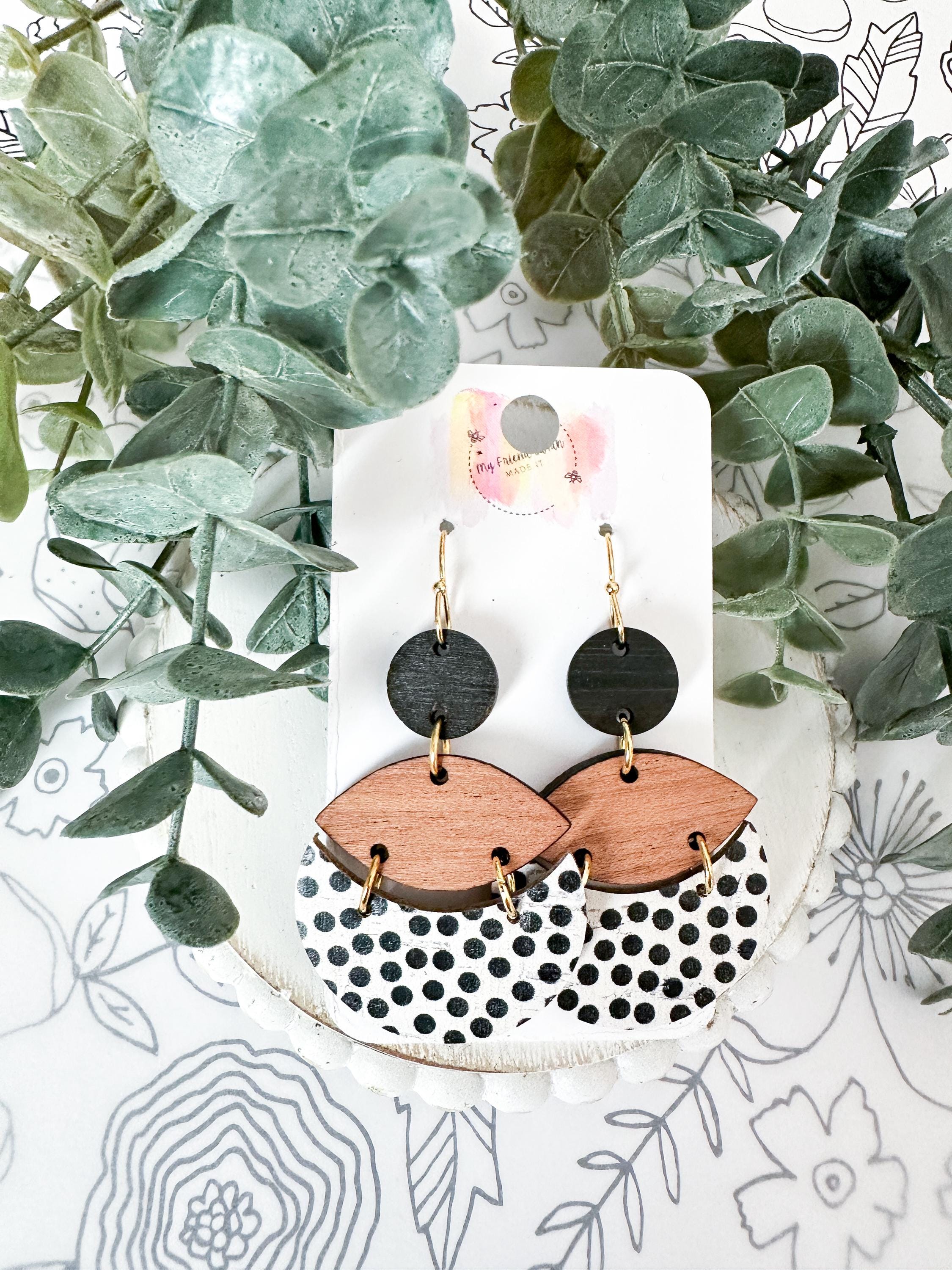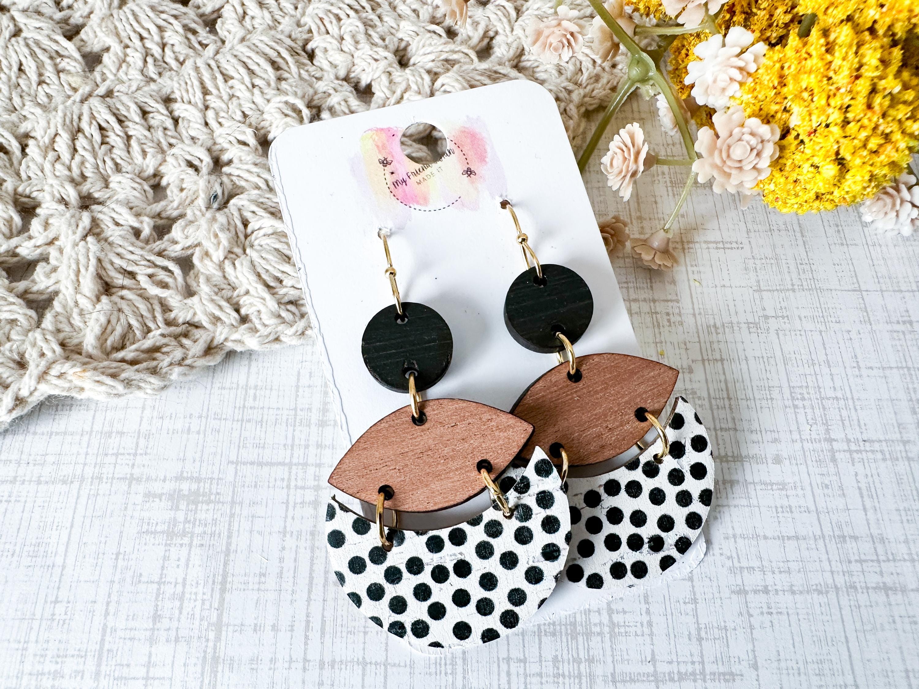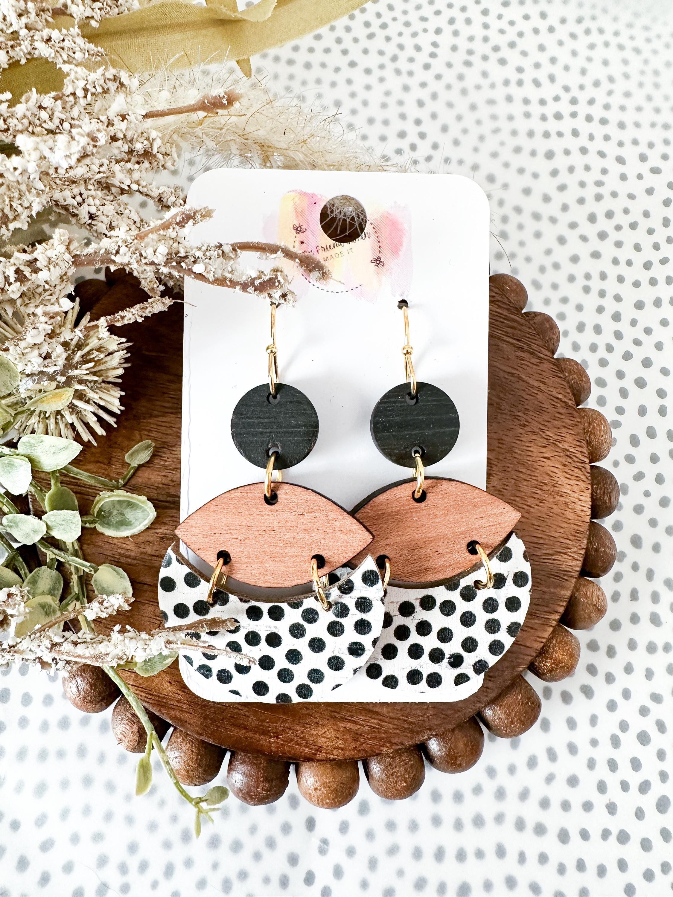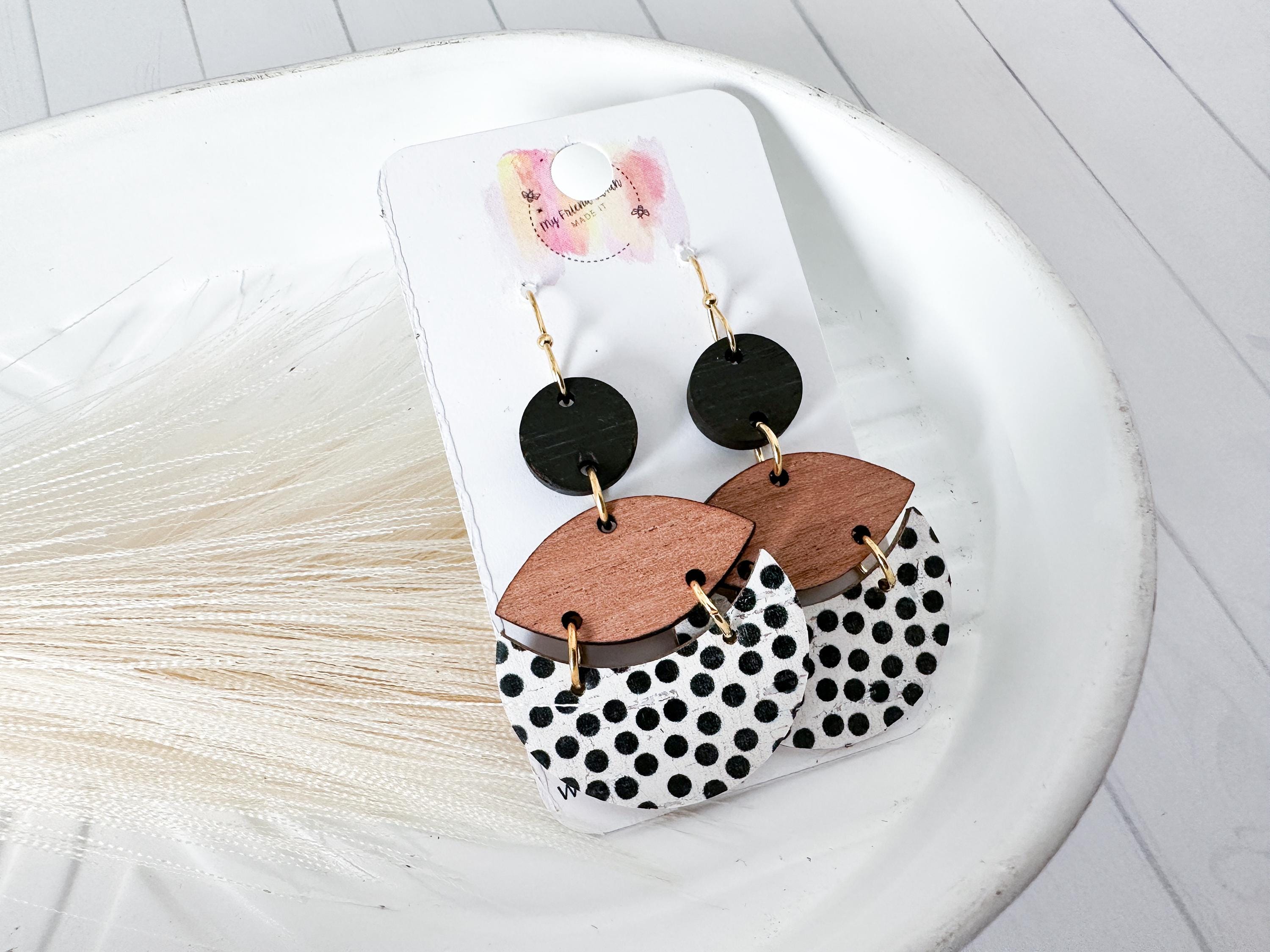 These fun geometric earrings feature three stacks of materials to create a unique shape! The black & neutral wood tones play beautifully off the white cork adorned with black dots for a piece that's interesting while staying neutral for year round wear.