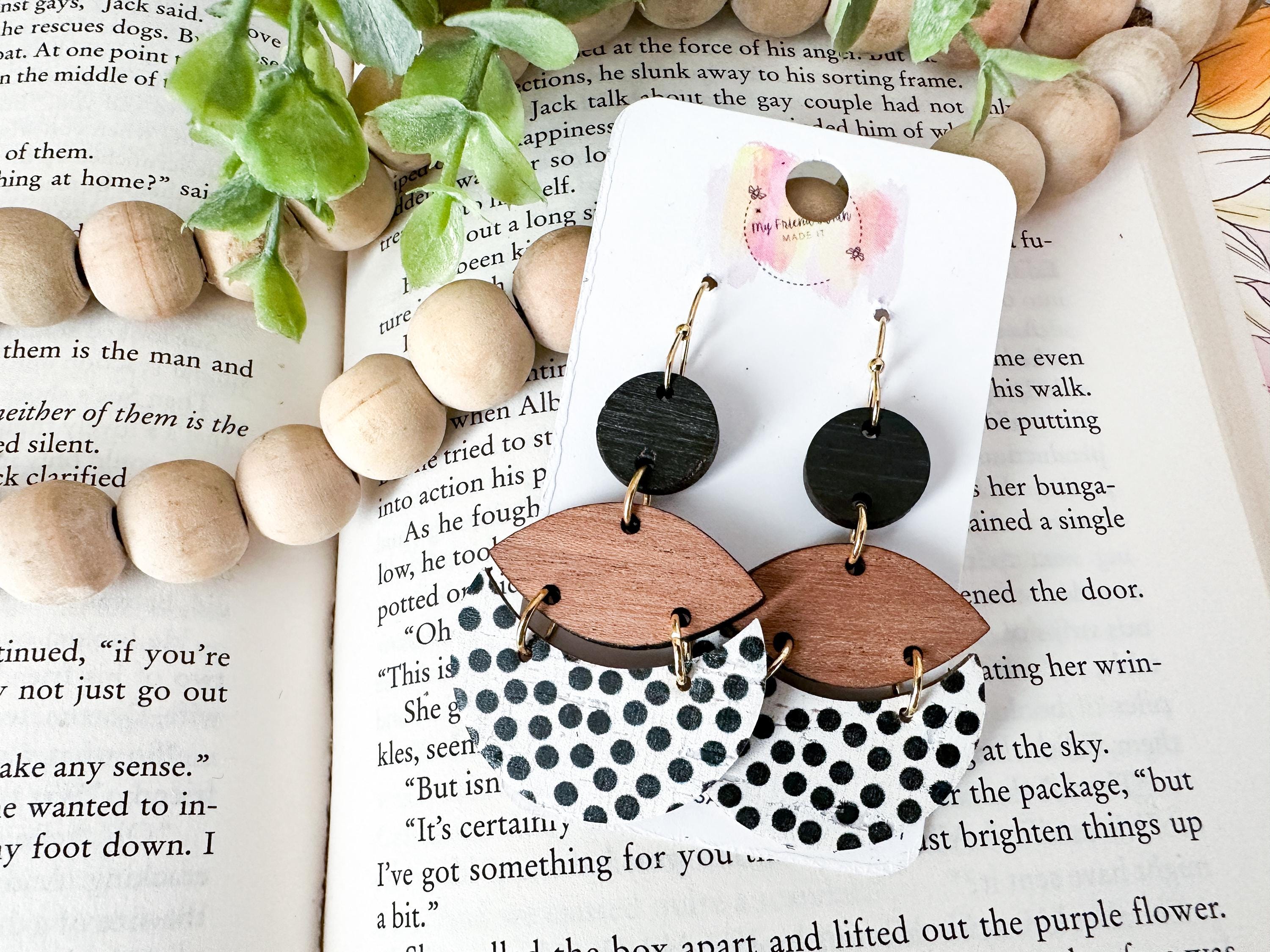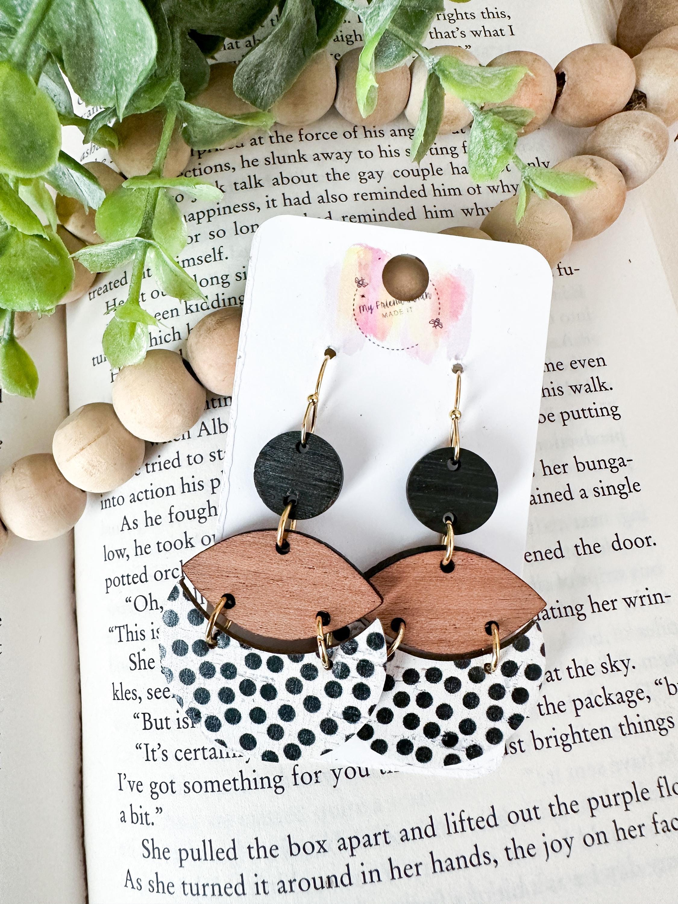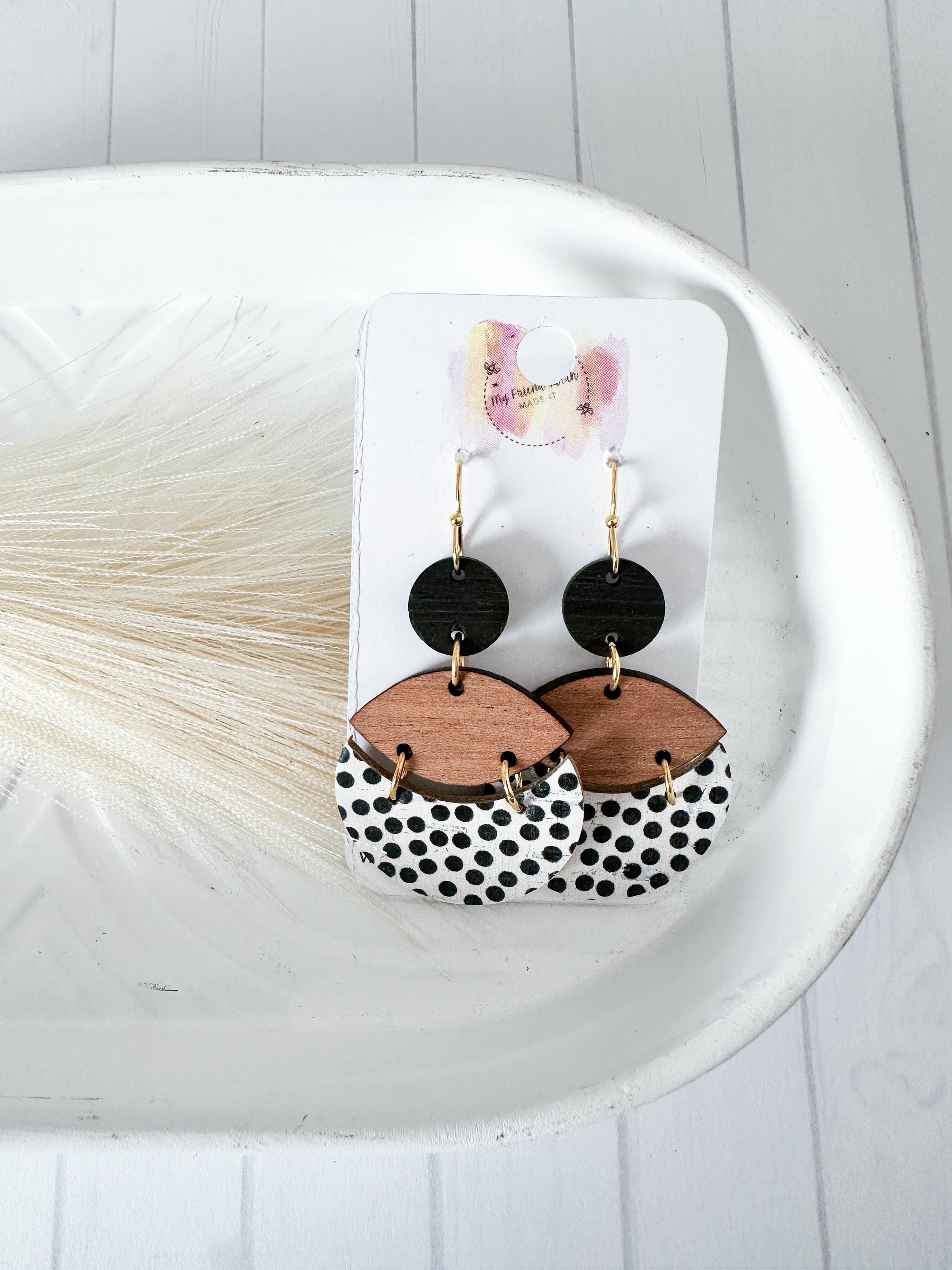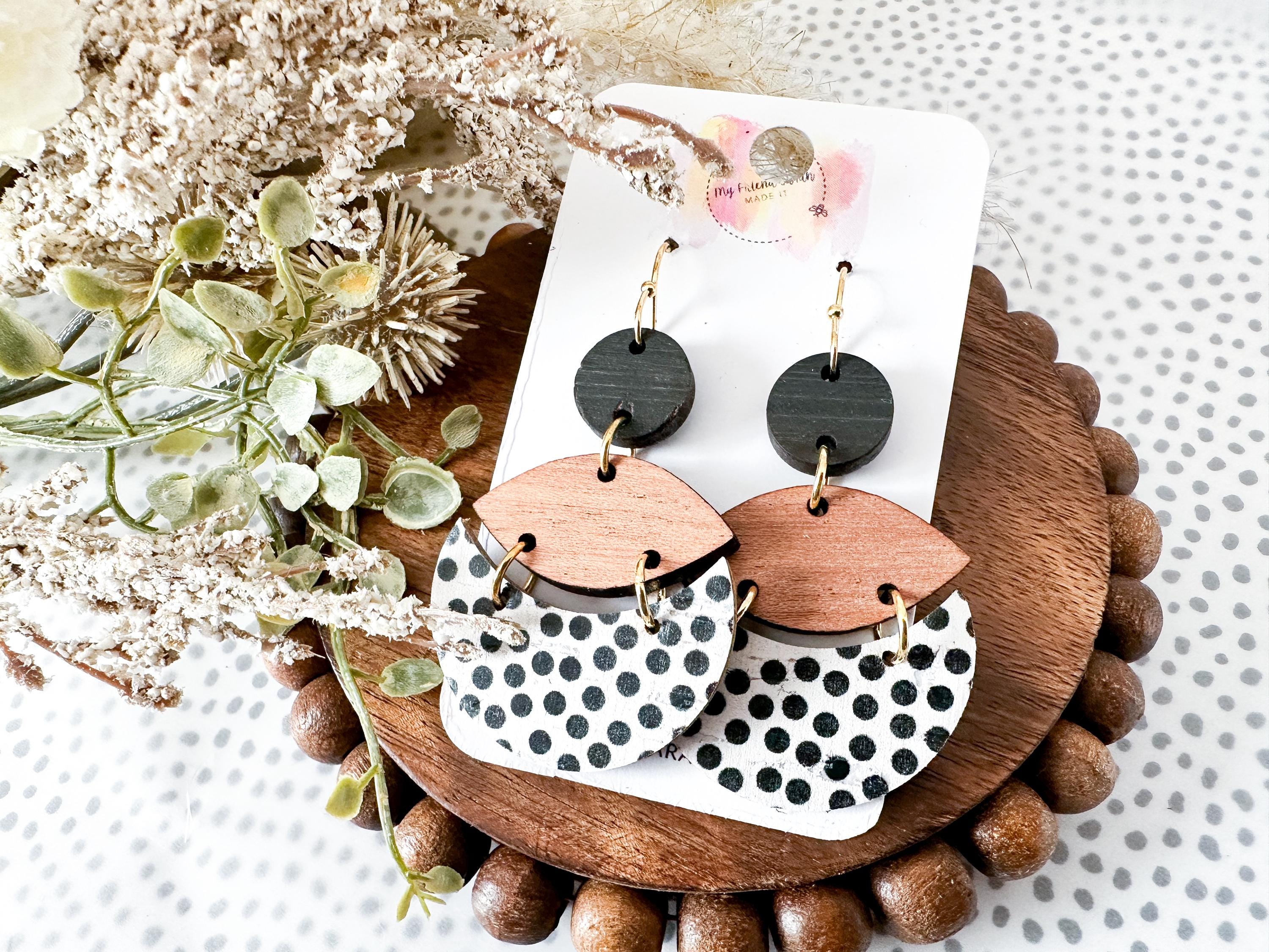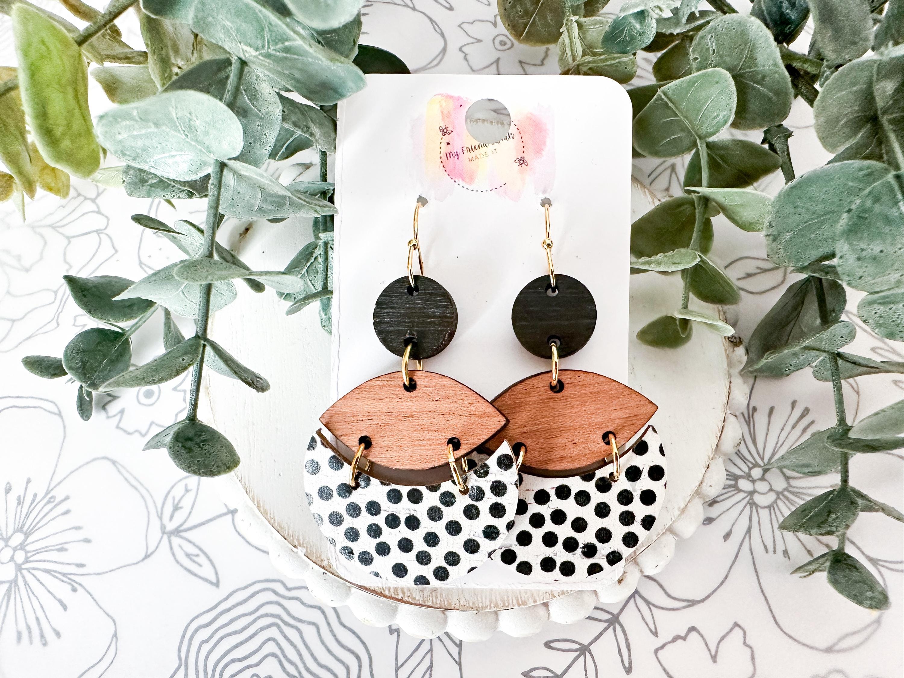 These fun geometric earrings feature three stacks of materials to create a unique shape! The black & neutral wood tones play beautifully off the white cork adorned with black dots for a piece that's interesting while staying neutral for year round wear.