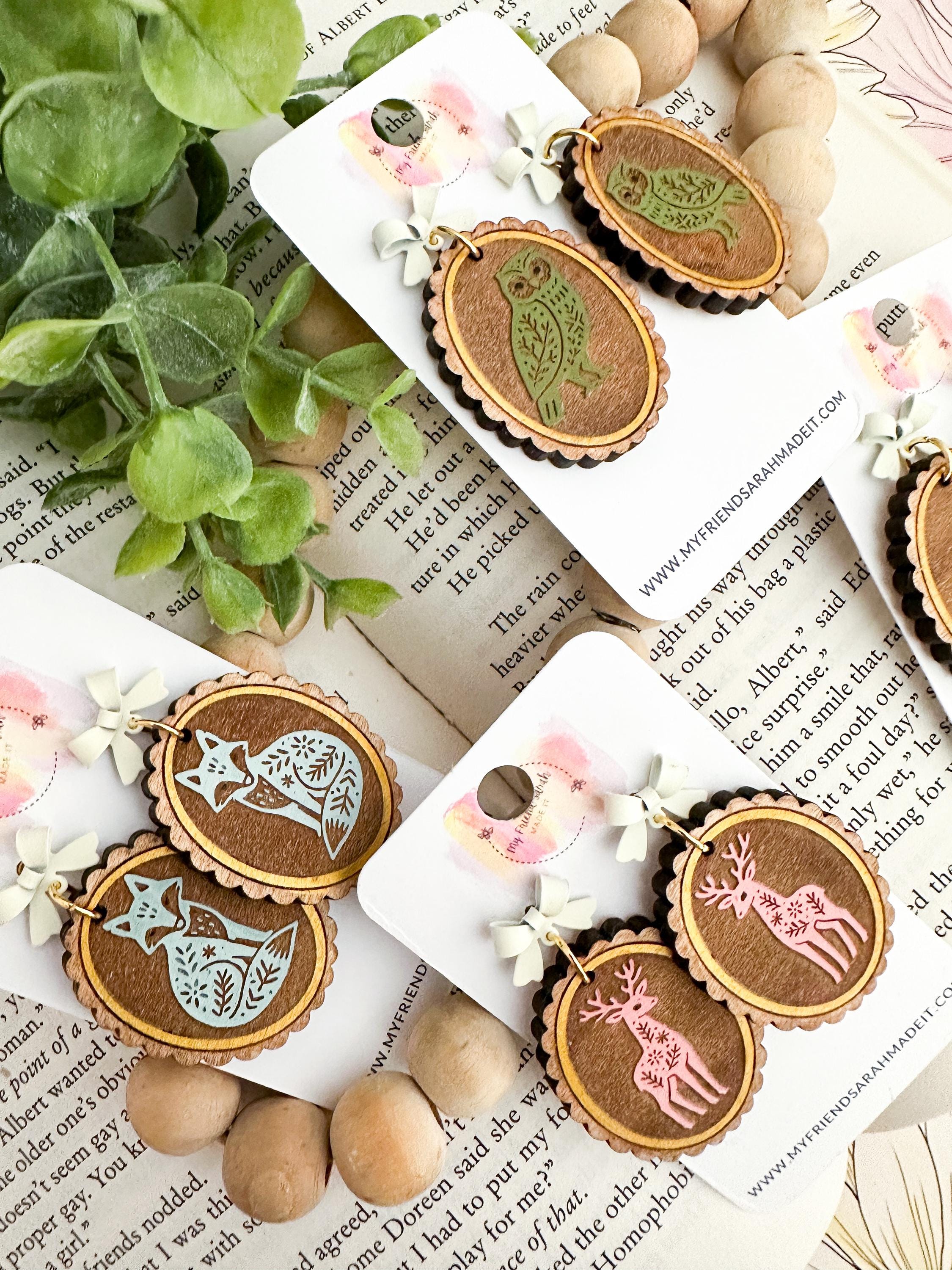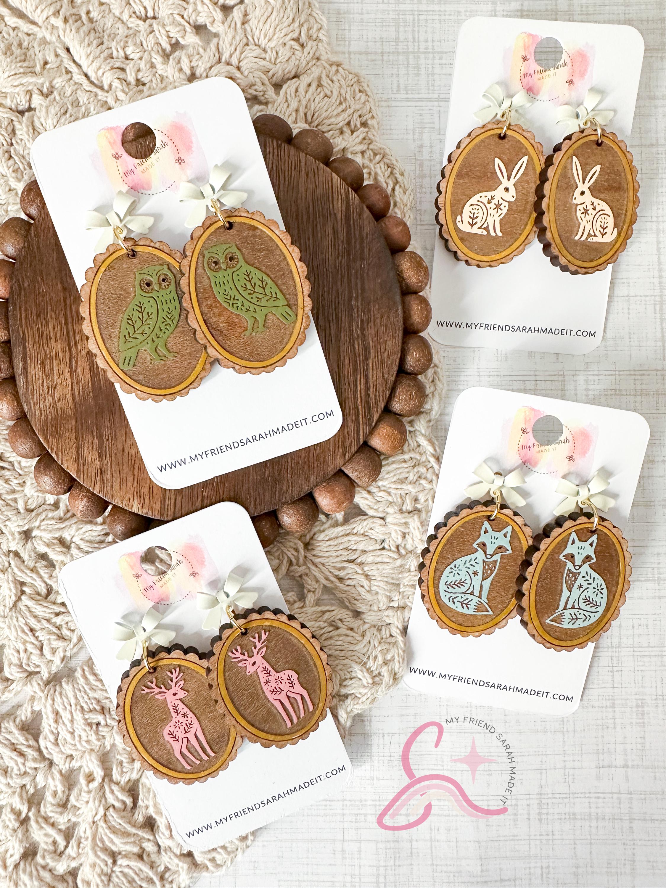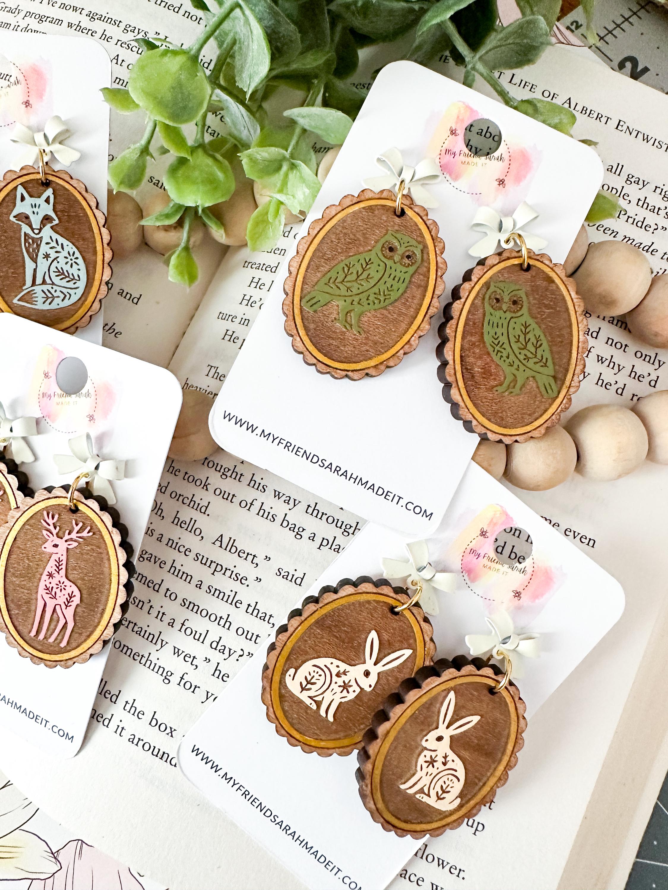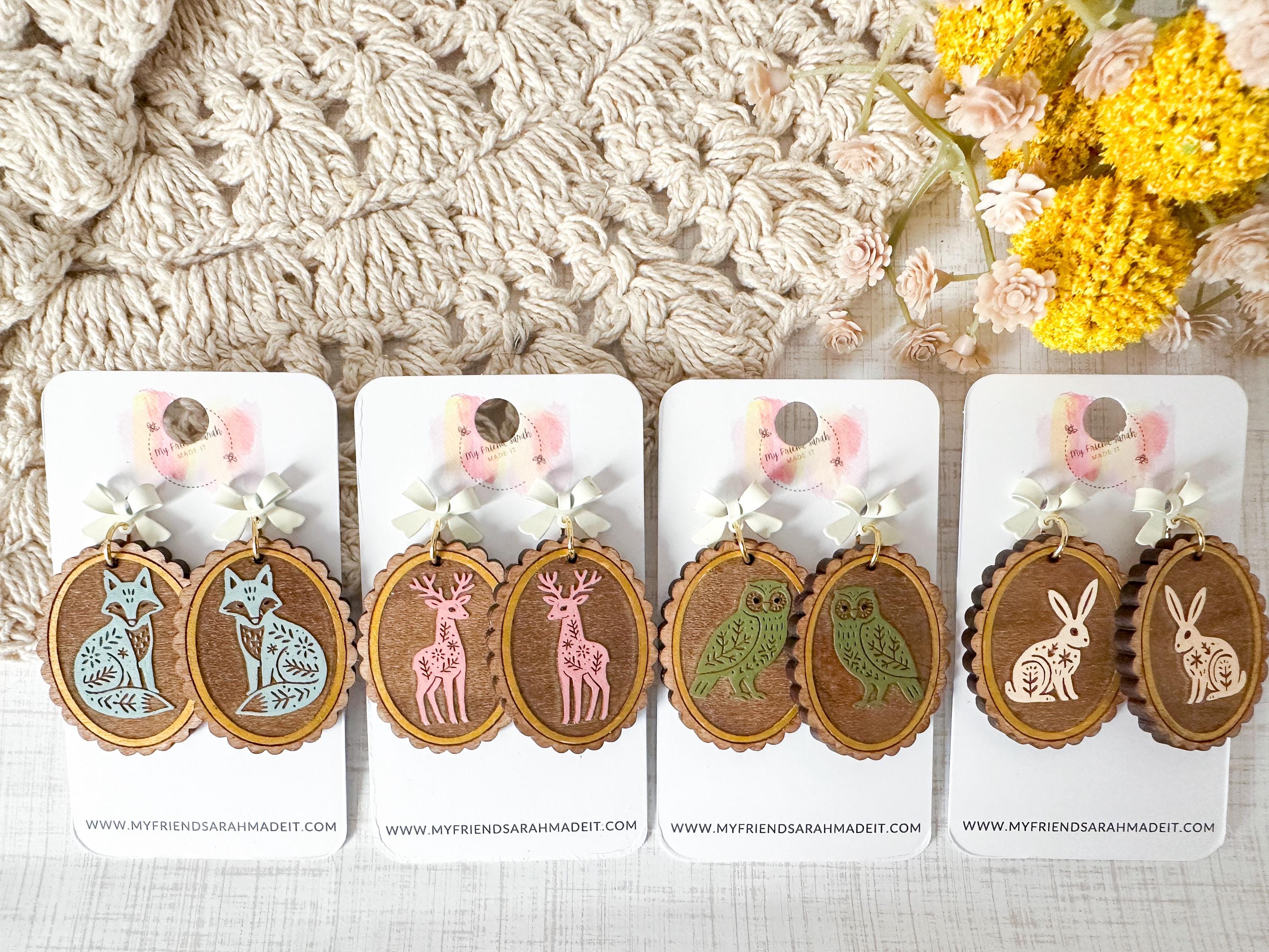 Whimsical and woodland-inspired, these engraved wooden earrings feature sweet animal designs engraved on wood with a dainty bow stud. Choose from fox, owl, deer, or rabbit - each pair is lightweight, detailed, and full of cozy charm.