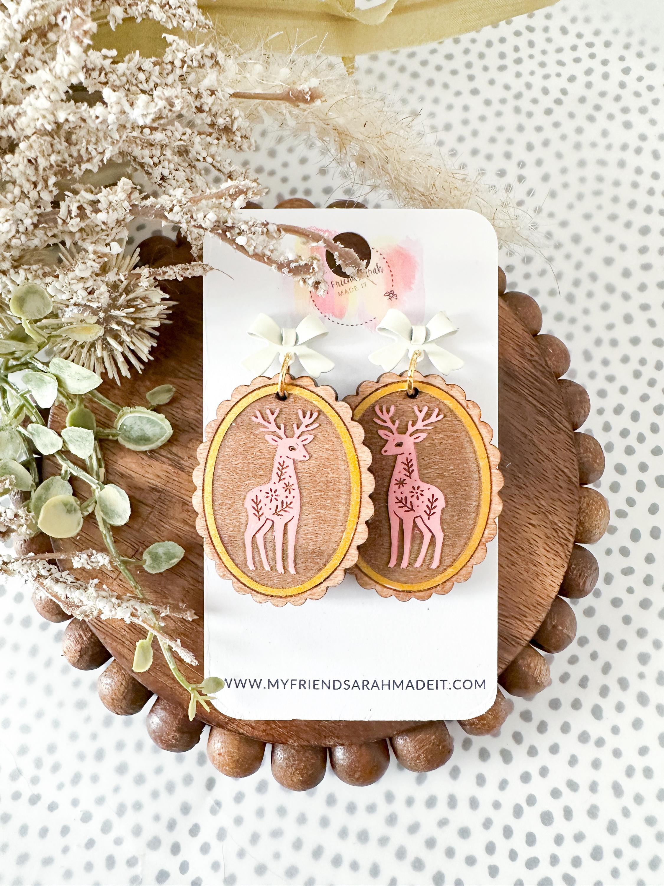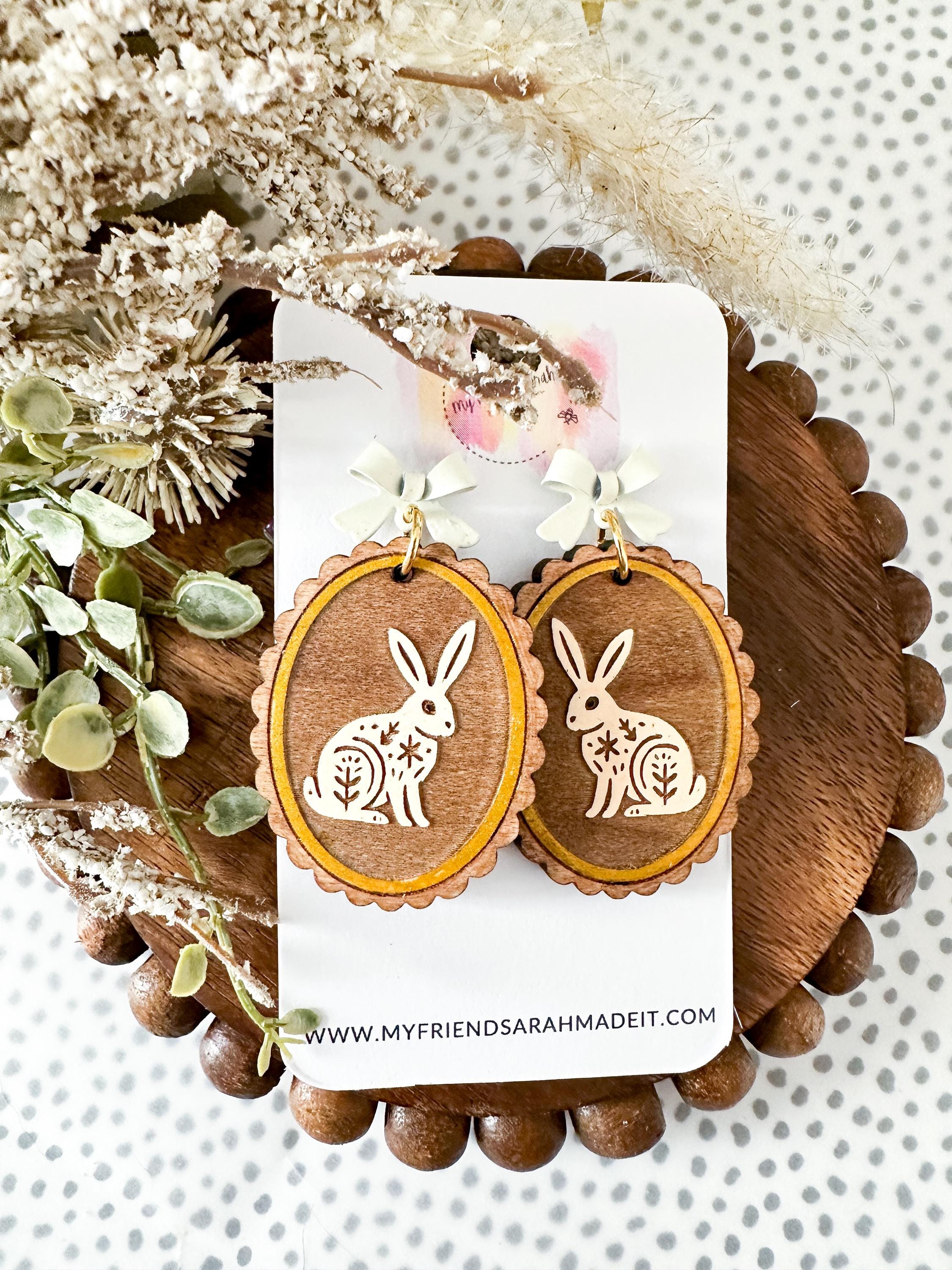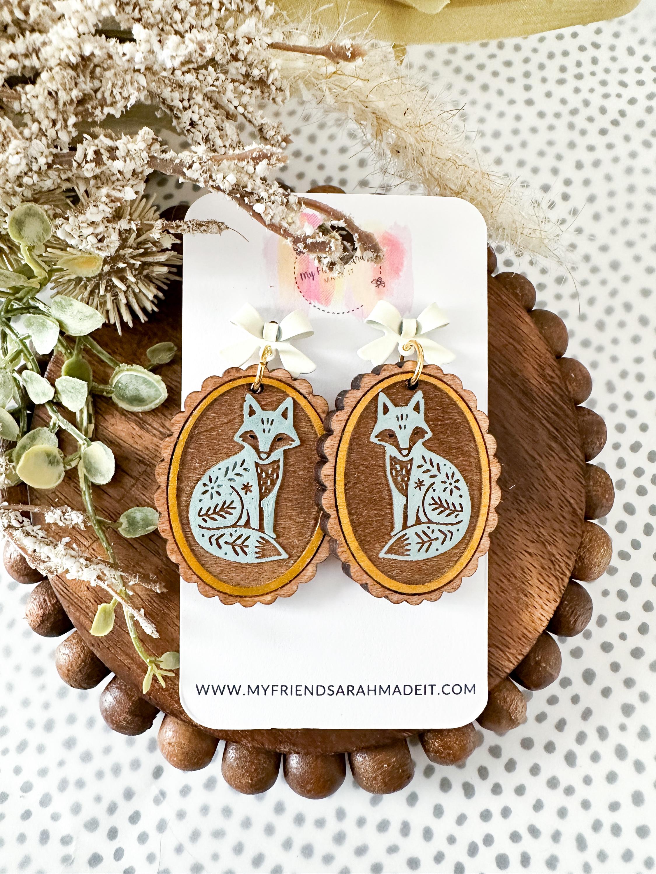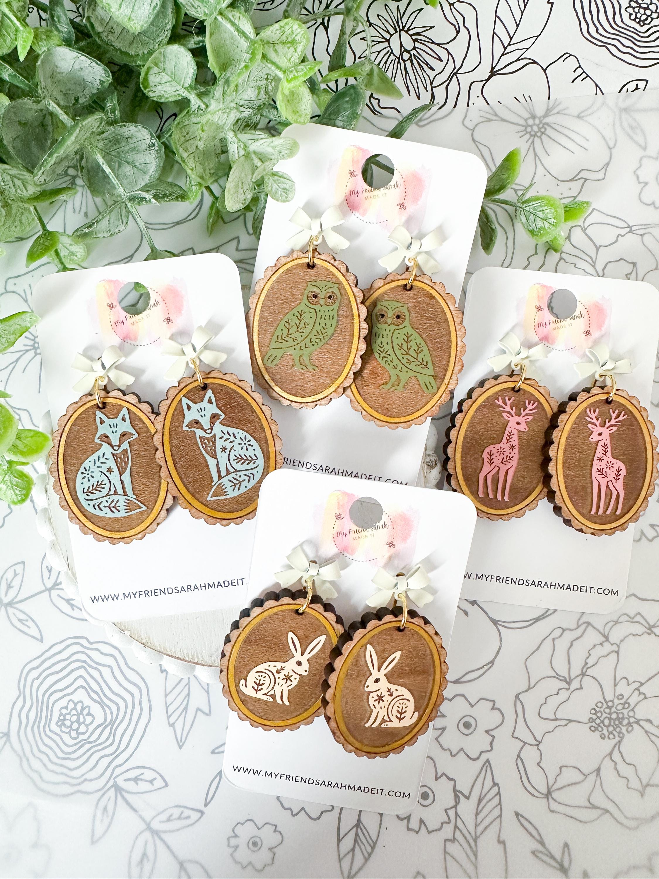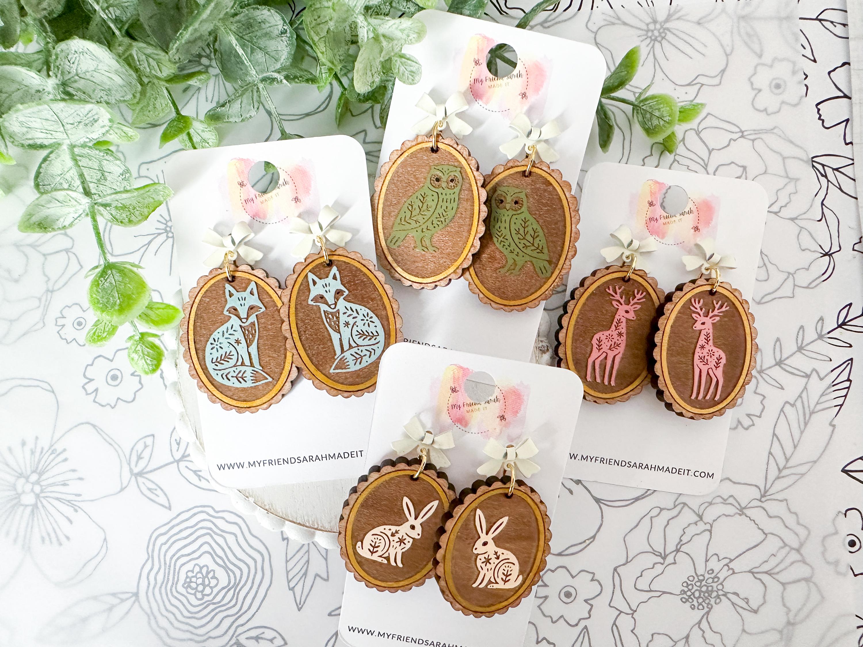 Whimsical and woodland-inspired, these engraved wooden earrings feature sweet animal designs engraved on wood with a dainty bow stud. Choose from fox, owl, deer, or rabbit - each pair is lightweight, detailed, and full of cozy charm.