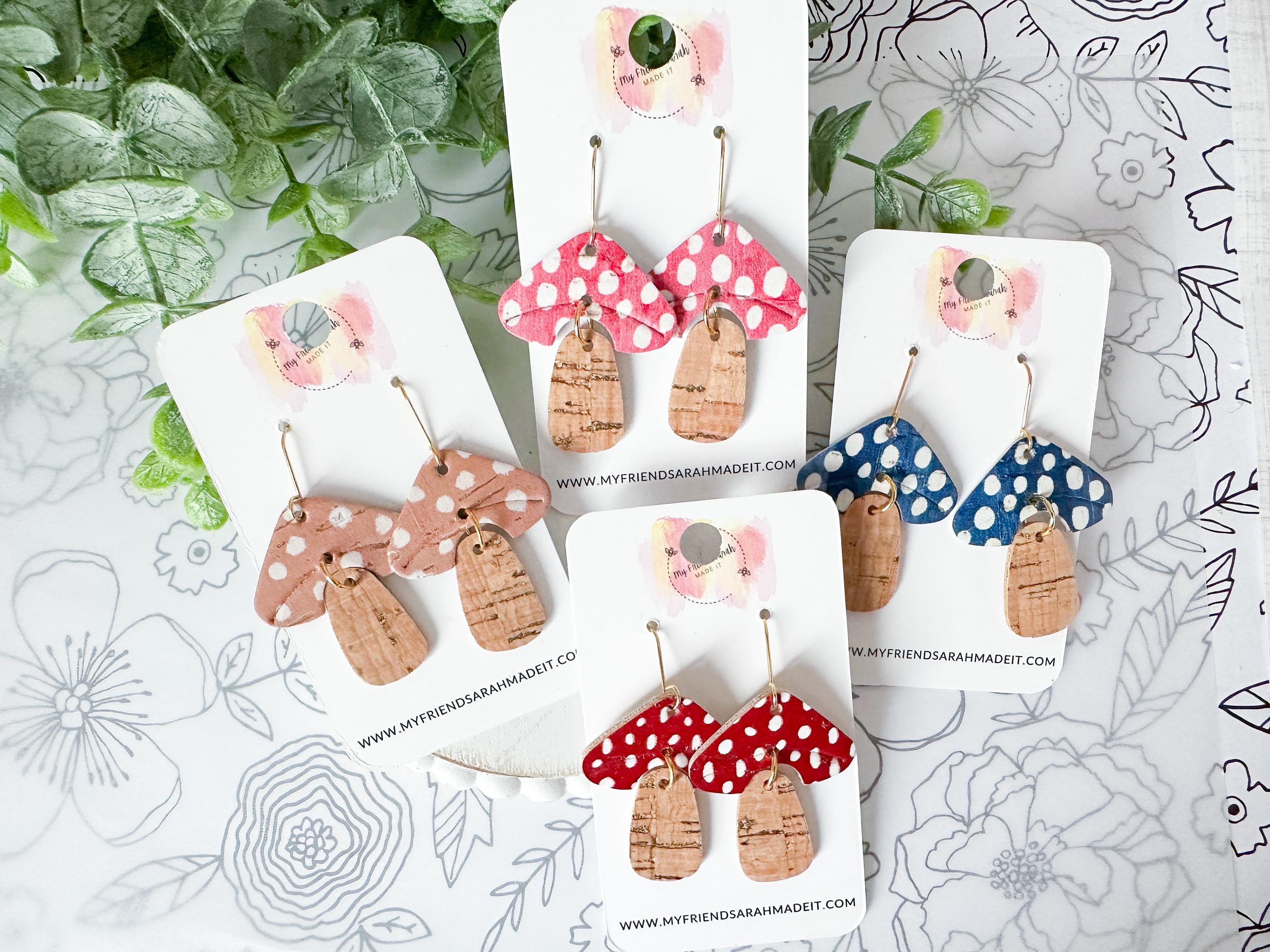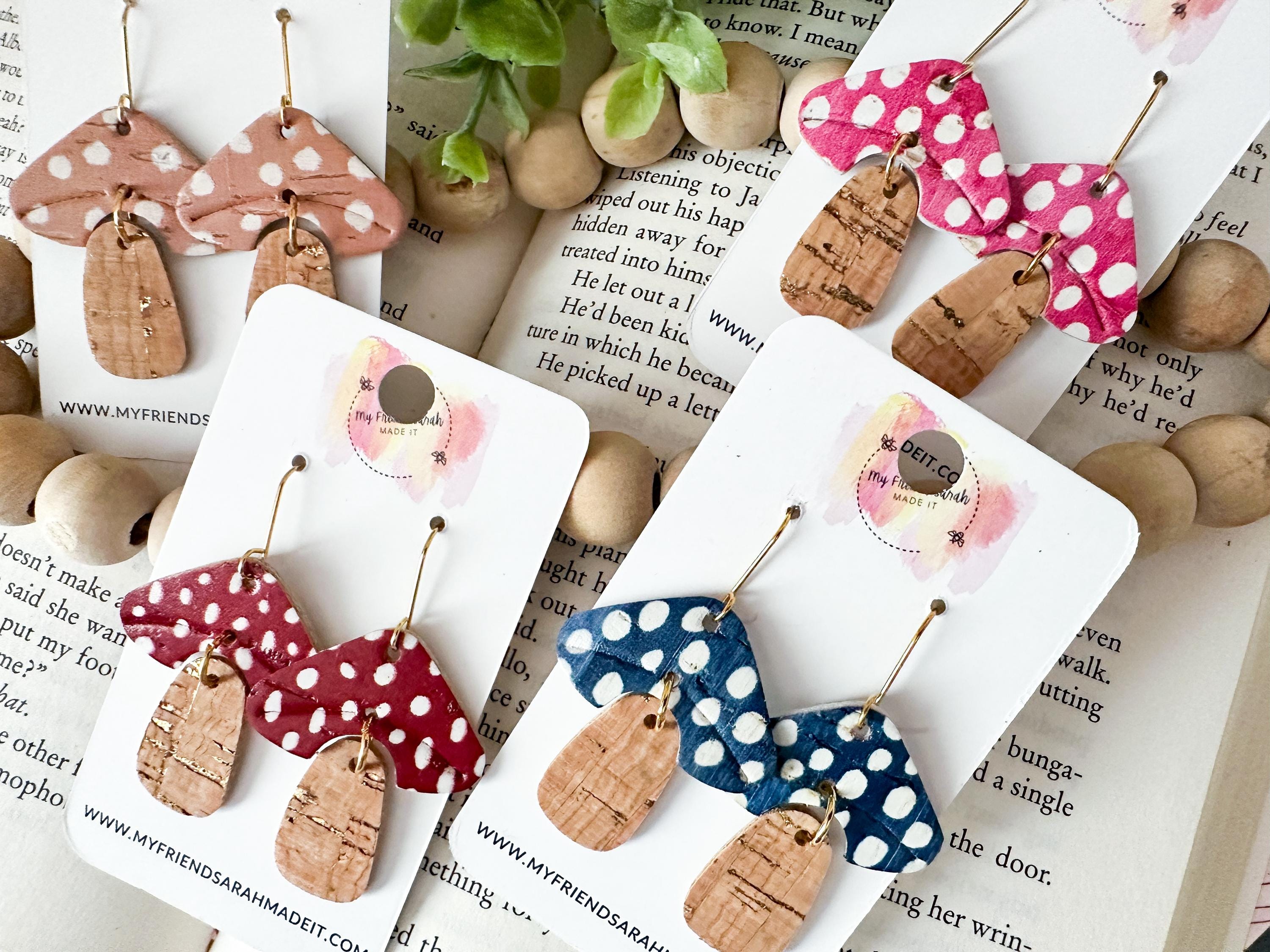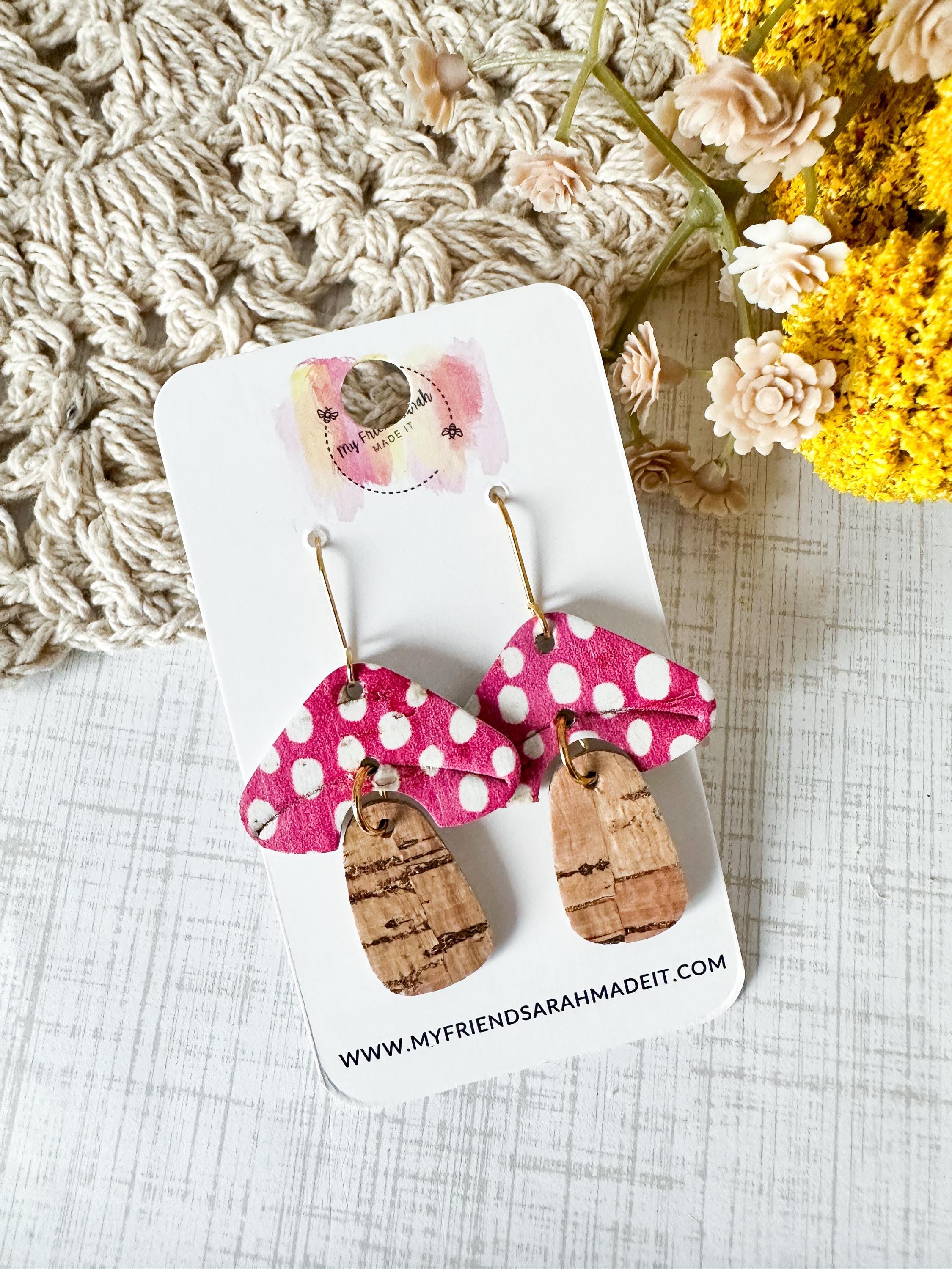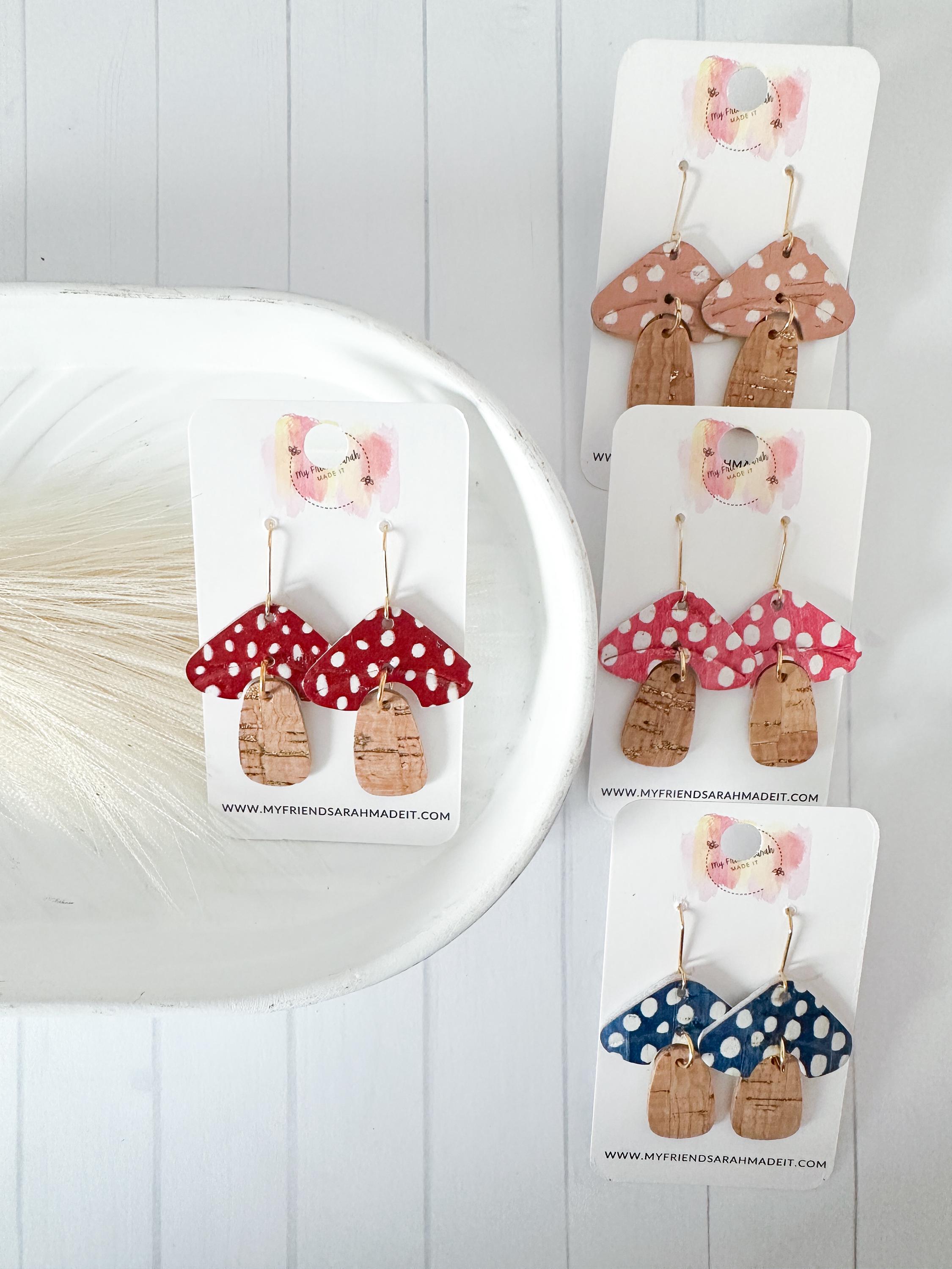 Whimsical and fun, these cork and leather mushroom earrings are the perfect mix of playful and earthy. Each pair features a polka-dotted cap in your choice of red, pink, tan, or navy. Lightweight, full of personality, and guaranteed to make you smile.