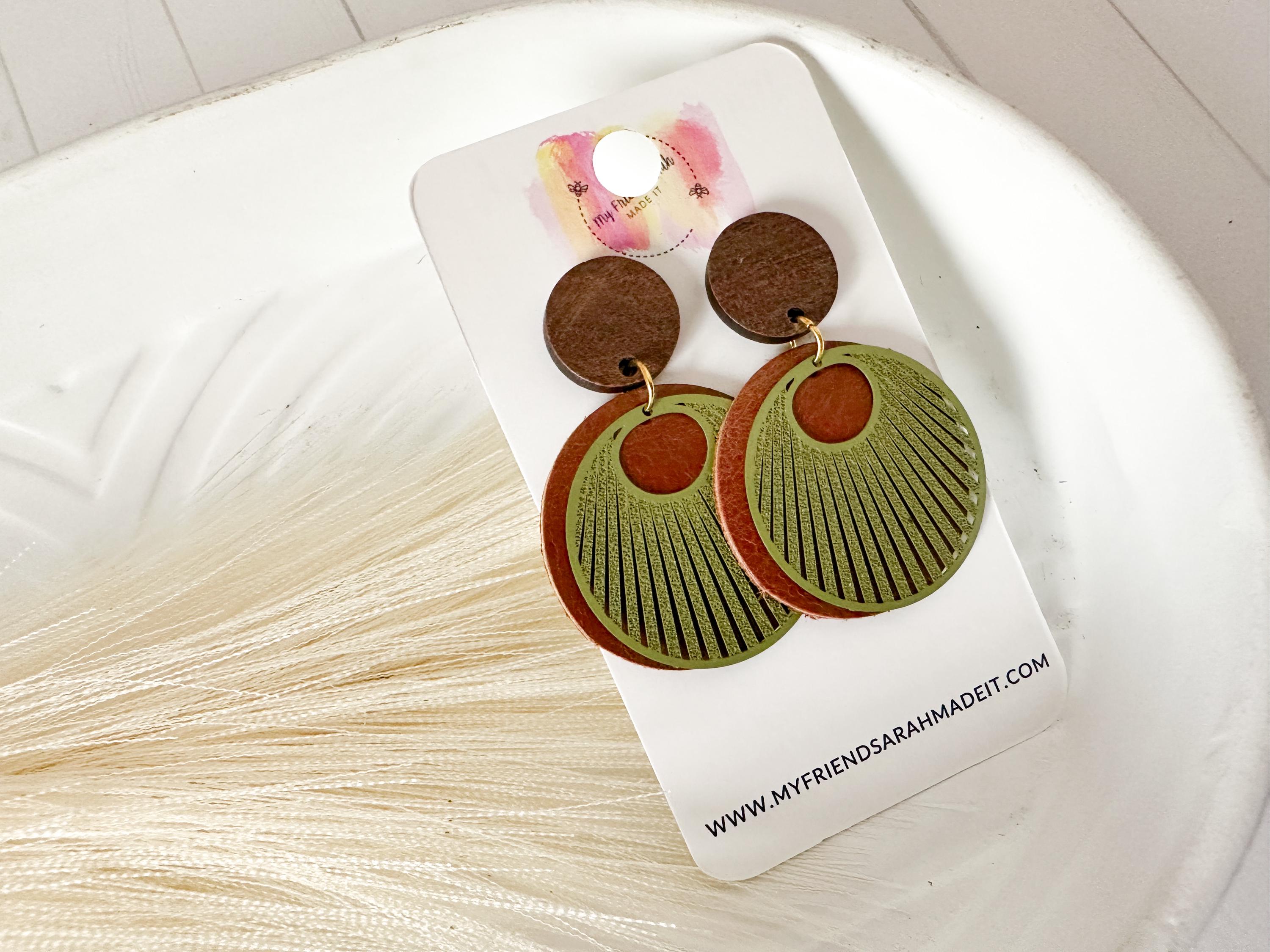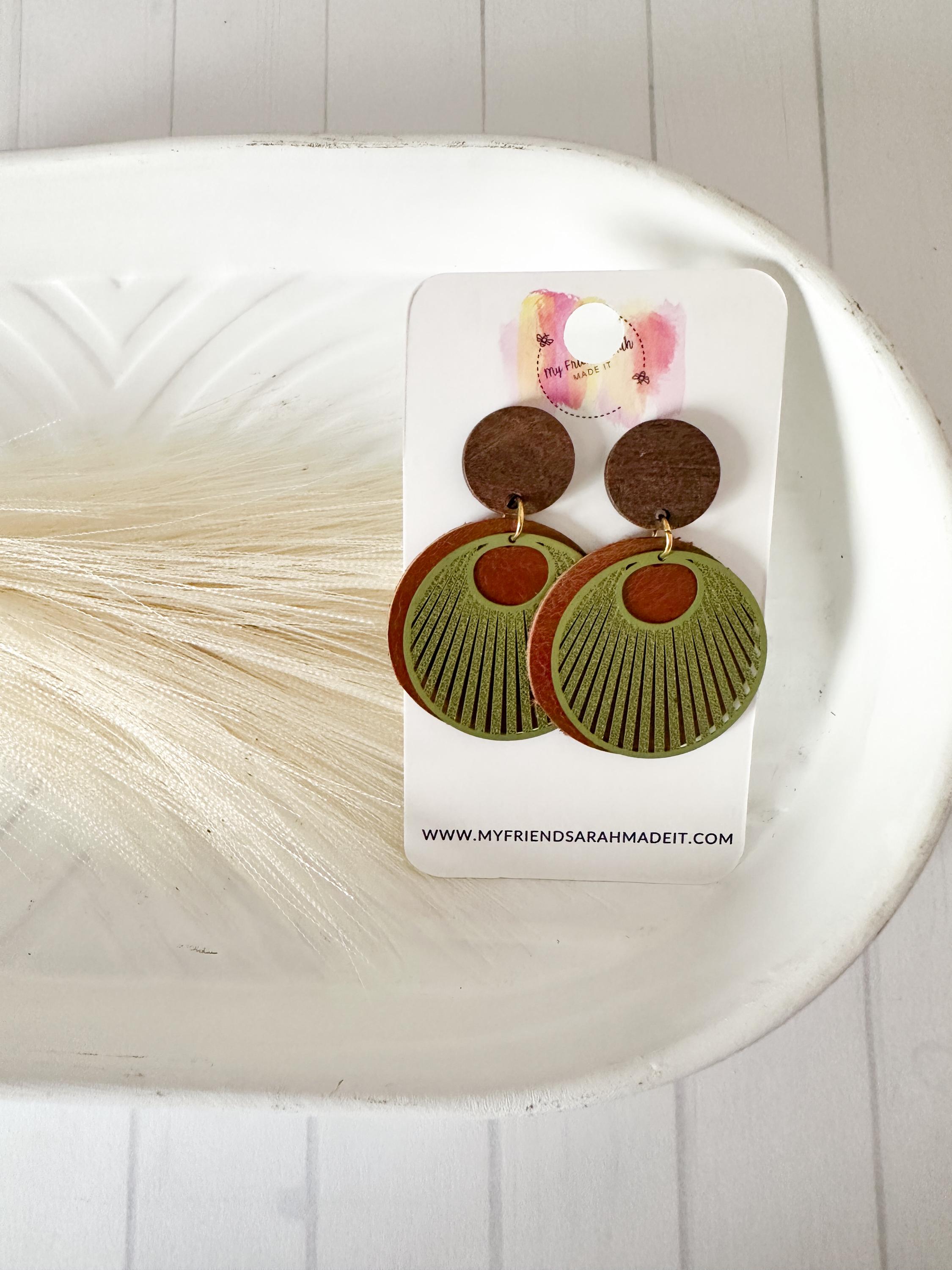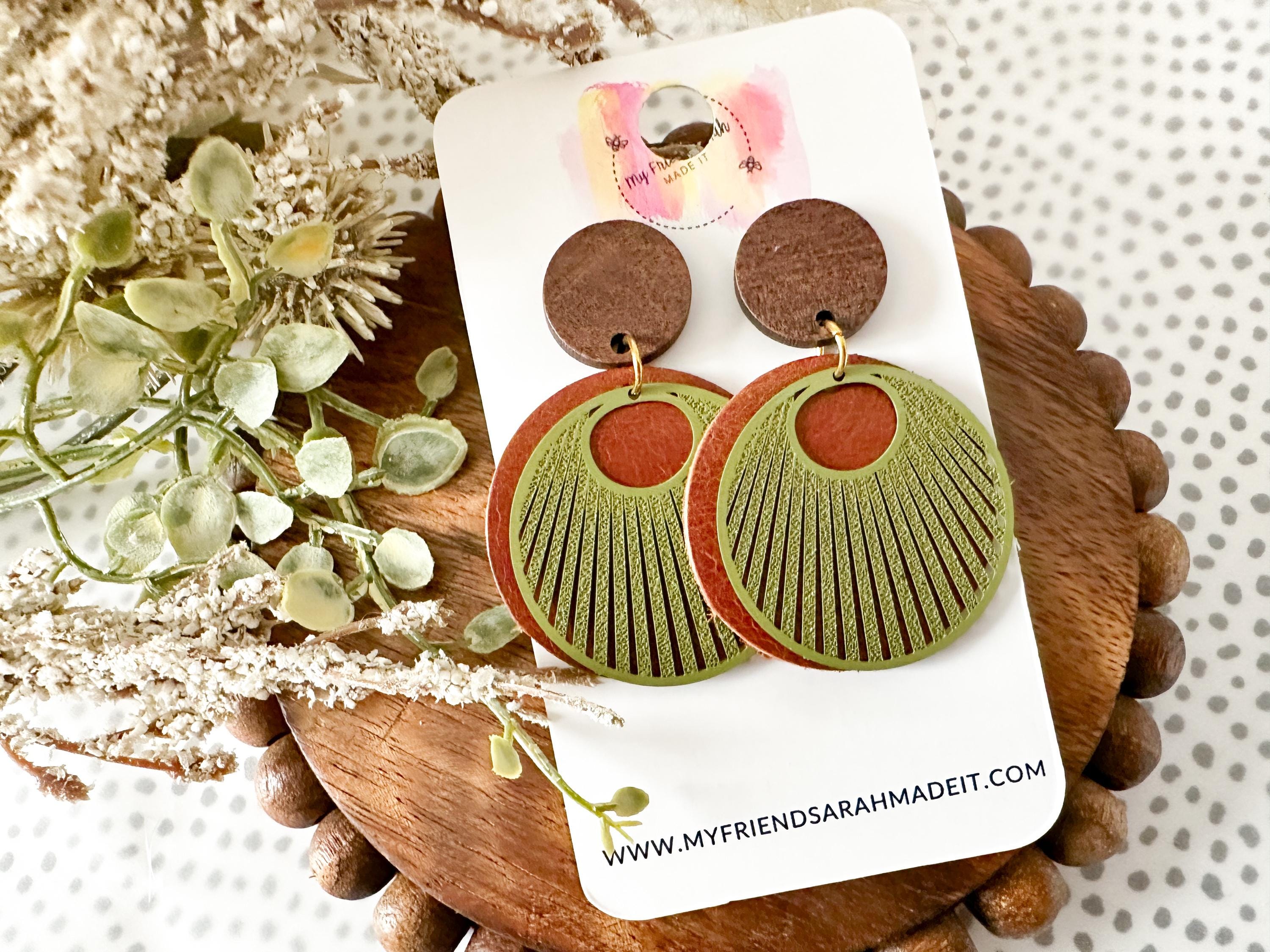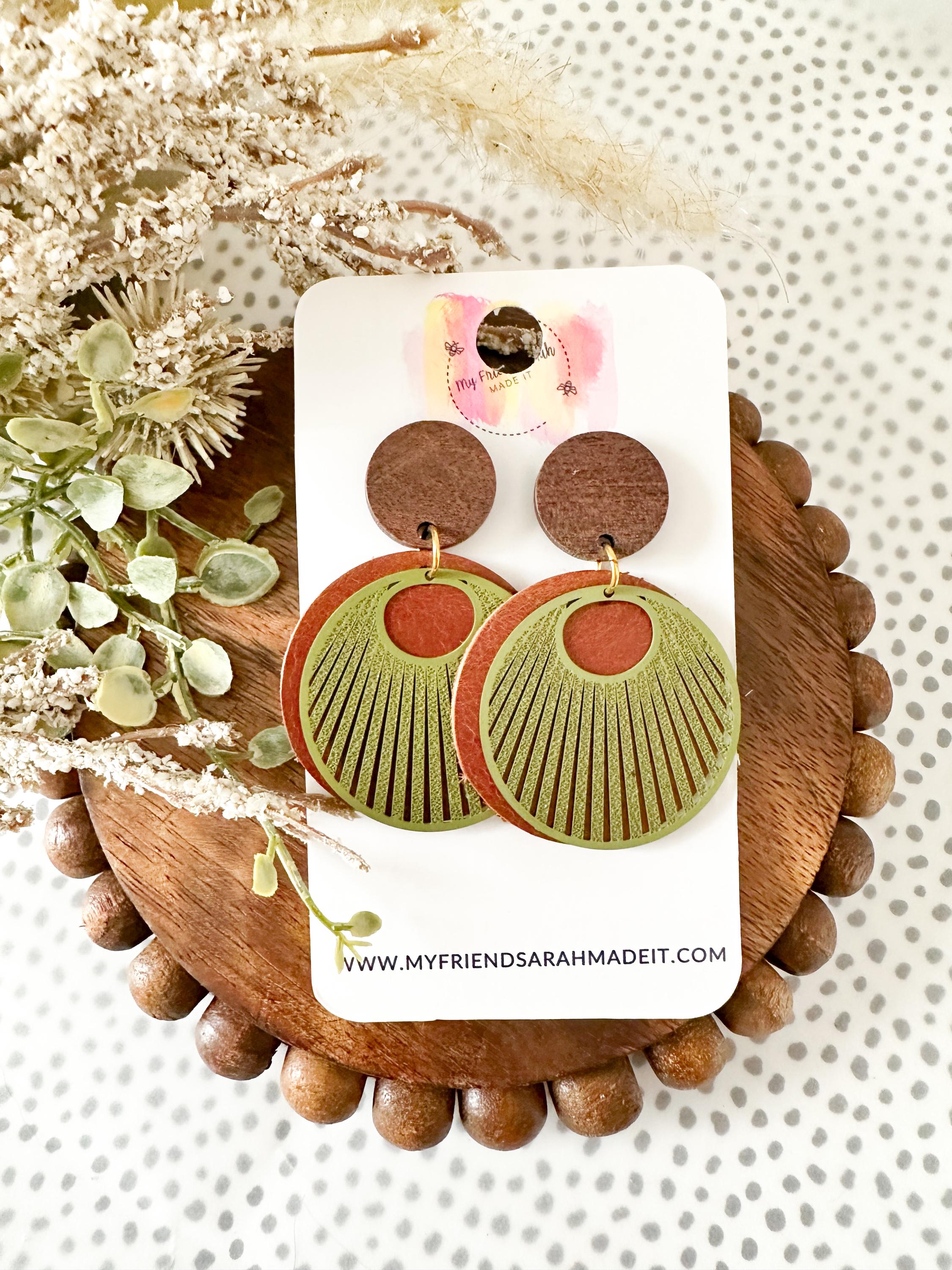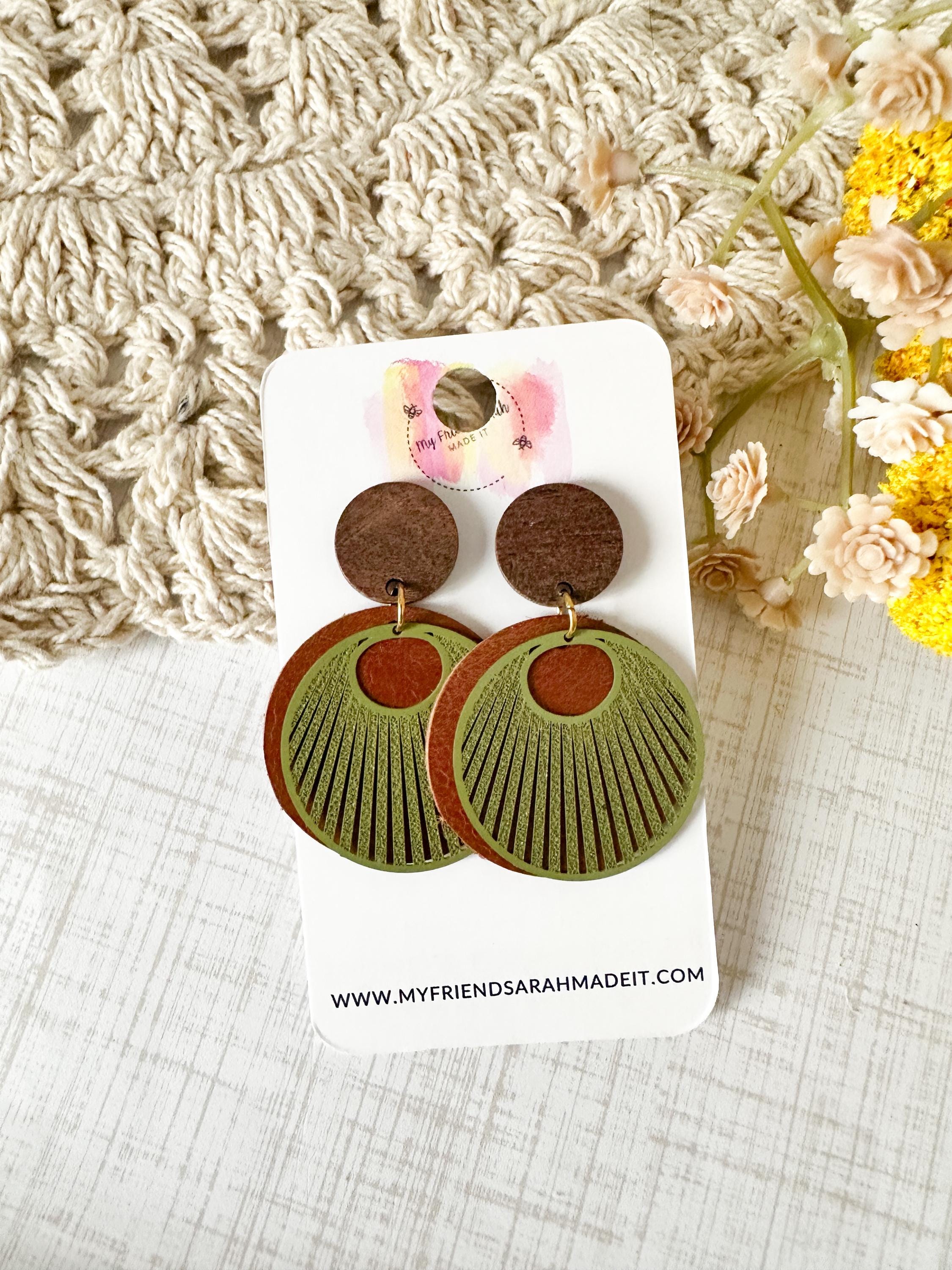 Earthy, bold, and effortlessly cool. These layered leather and wood earrings pair warm brown tones with an olive green fan overlay for a rustic-modern vibe that goes with everything from denim to date night.