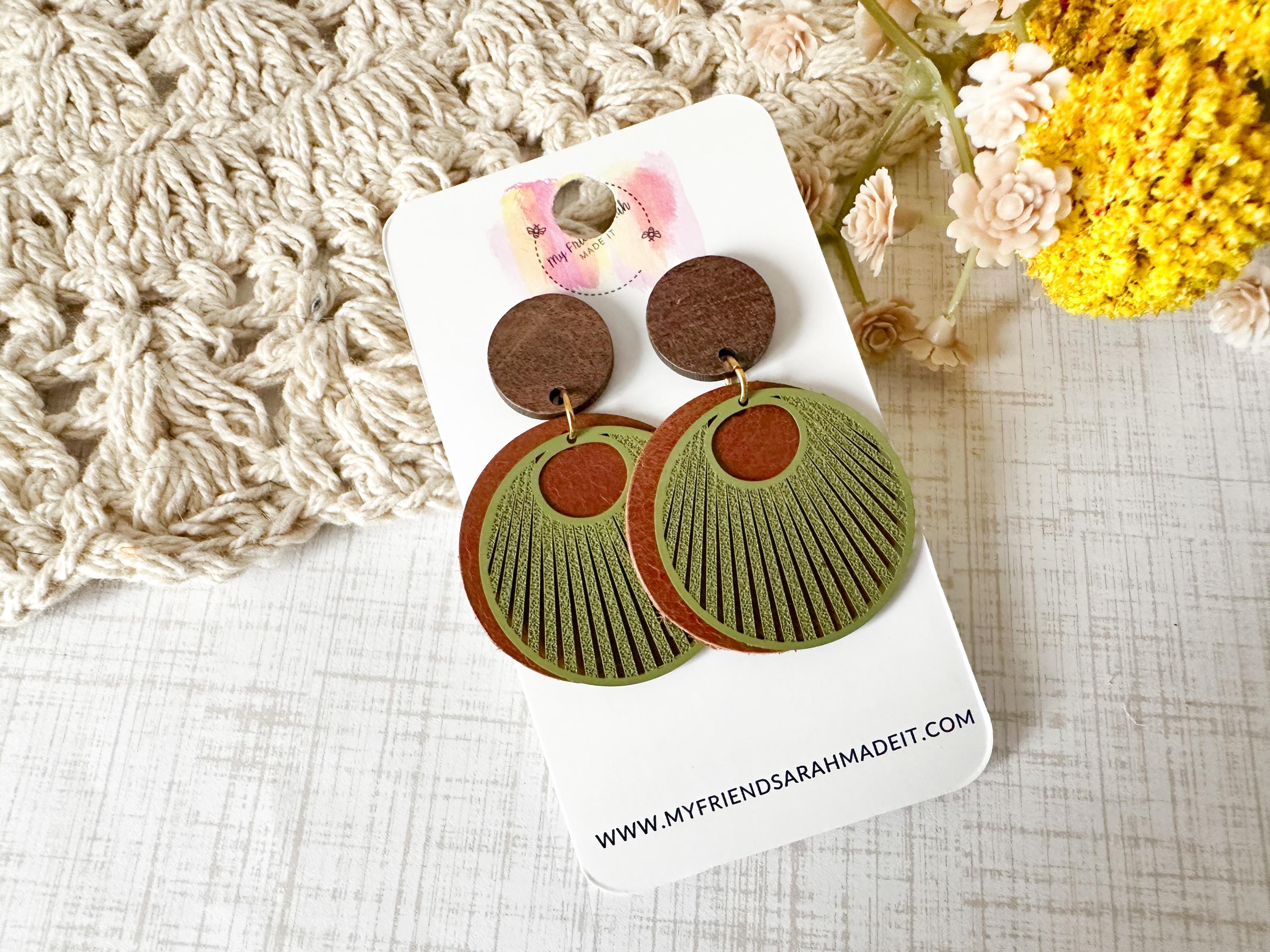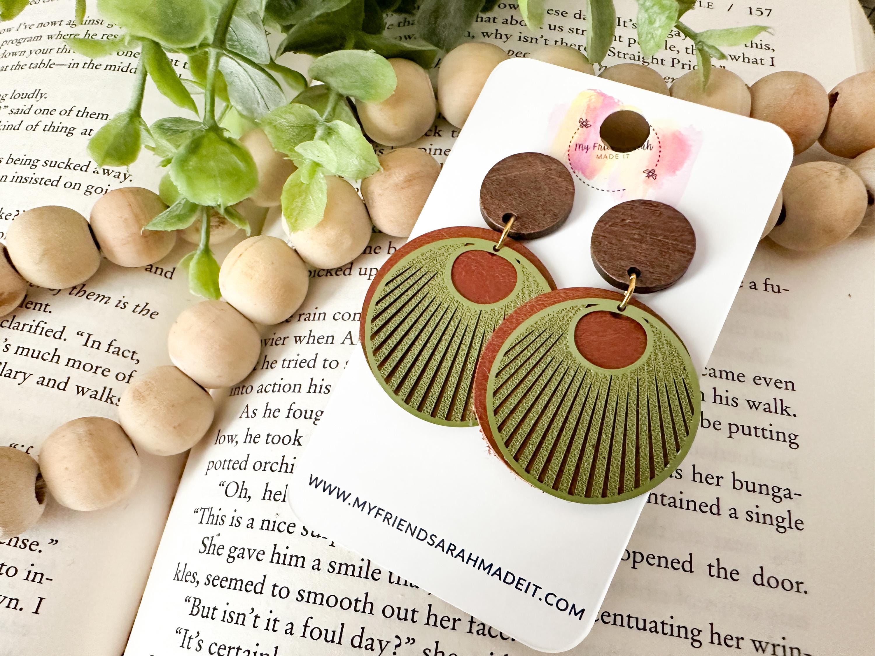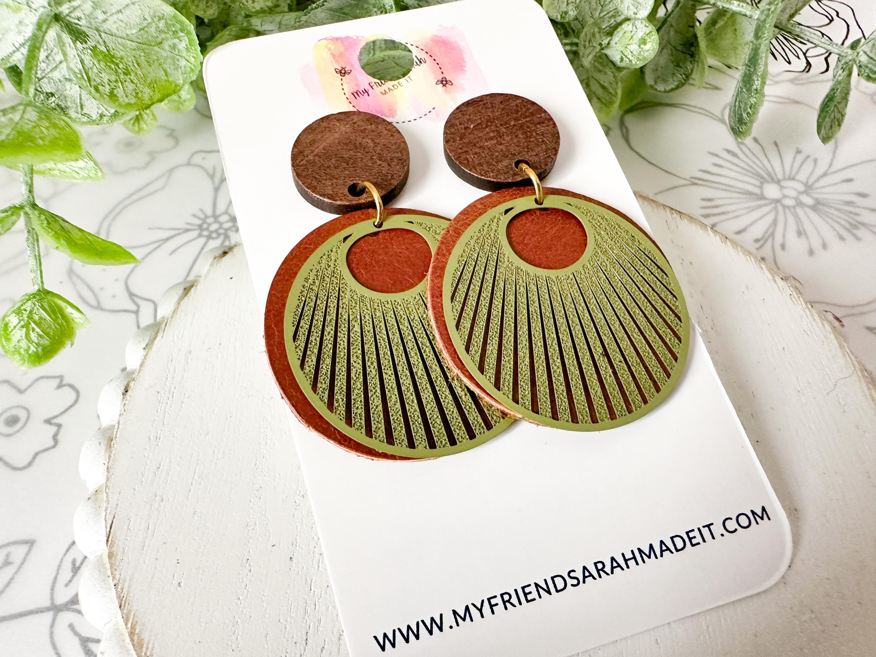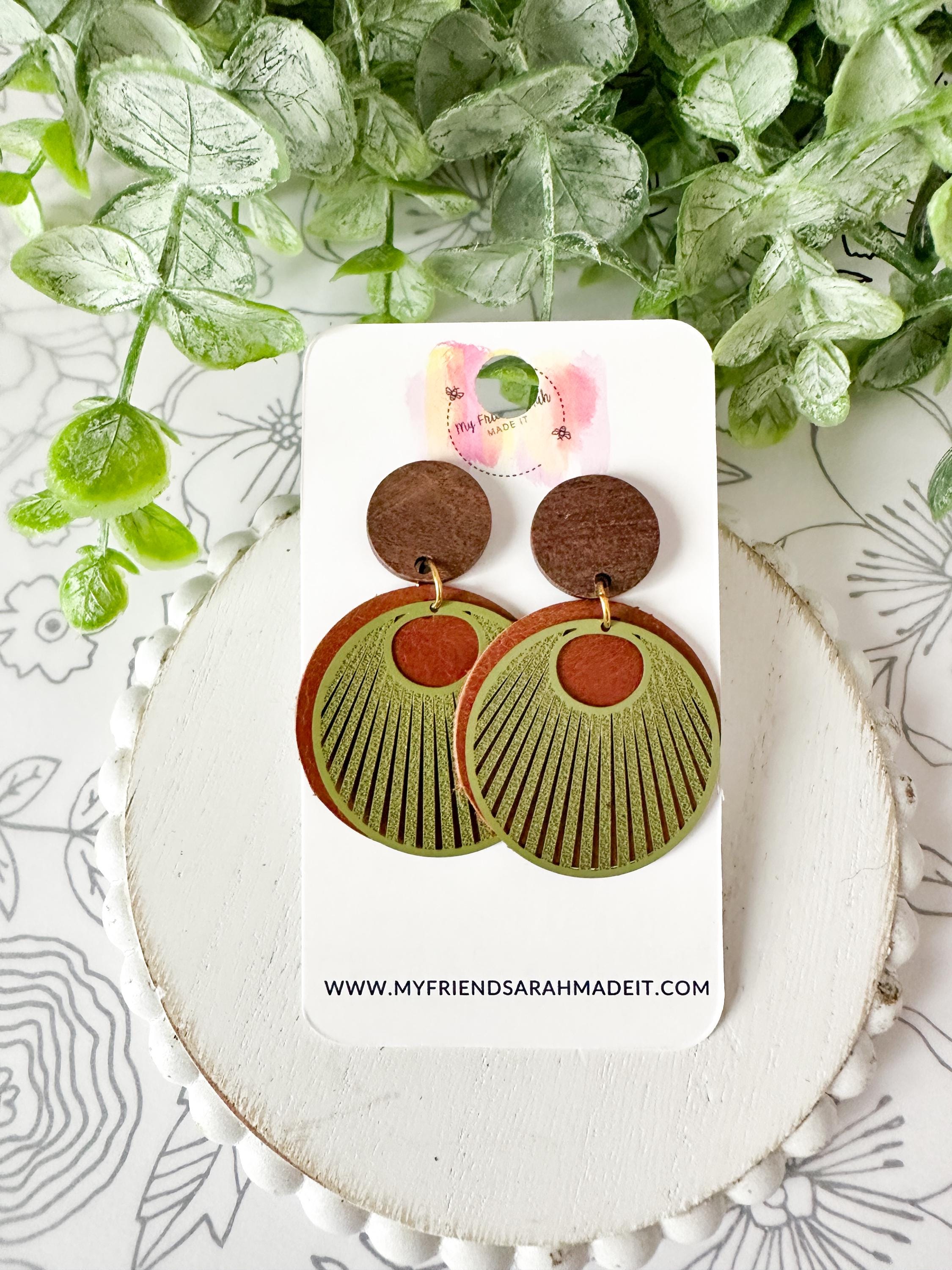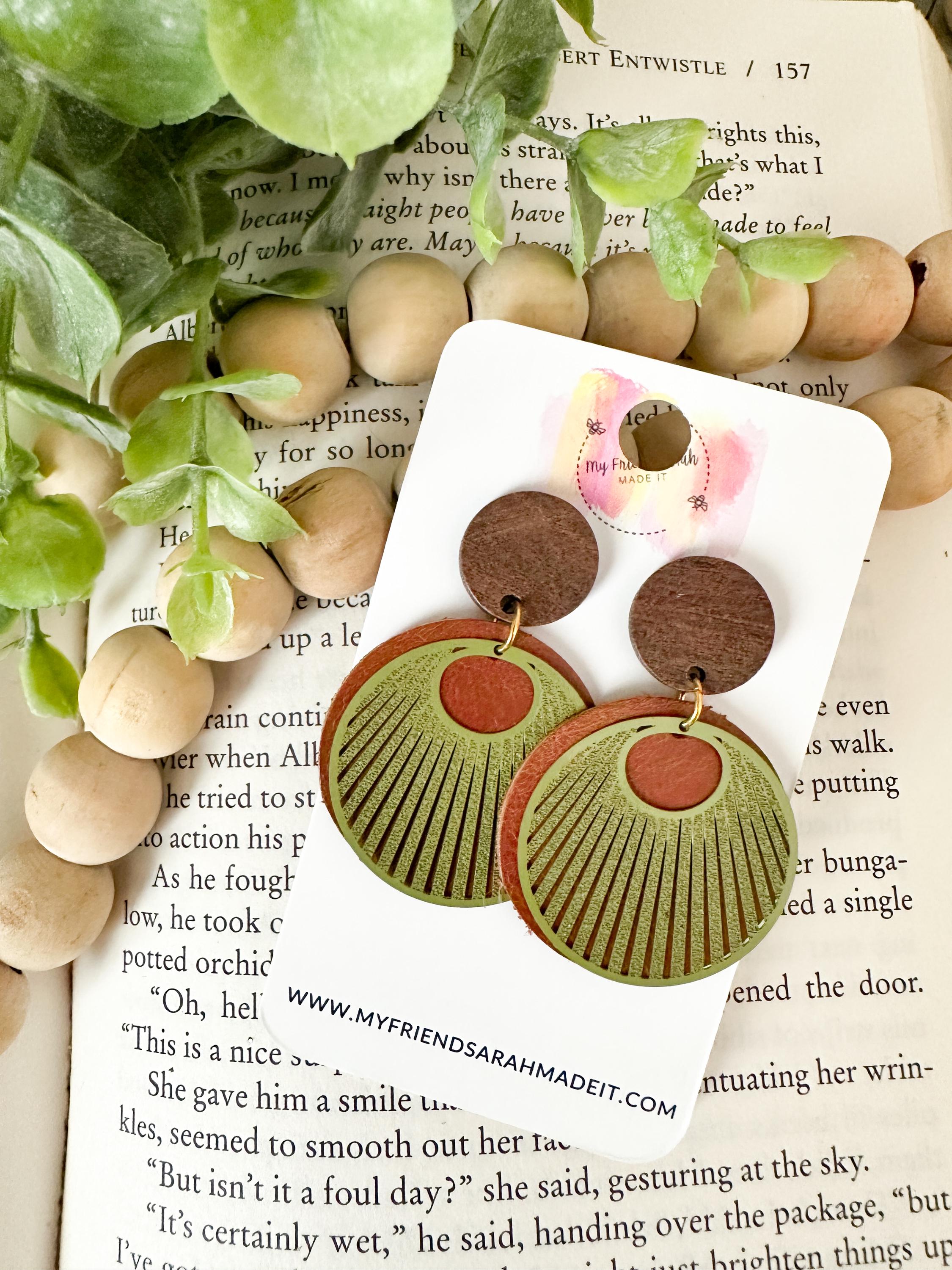 Earthy, bold, and effortlessly cool. These layered leather and wood earrings pair warm brown tones with an olive green fan overlay for a rustic-modern vibe that goes with everything from denim to date night.