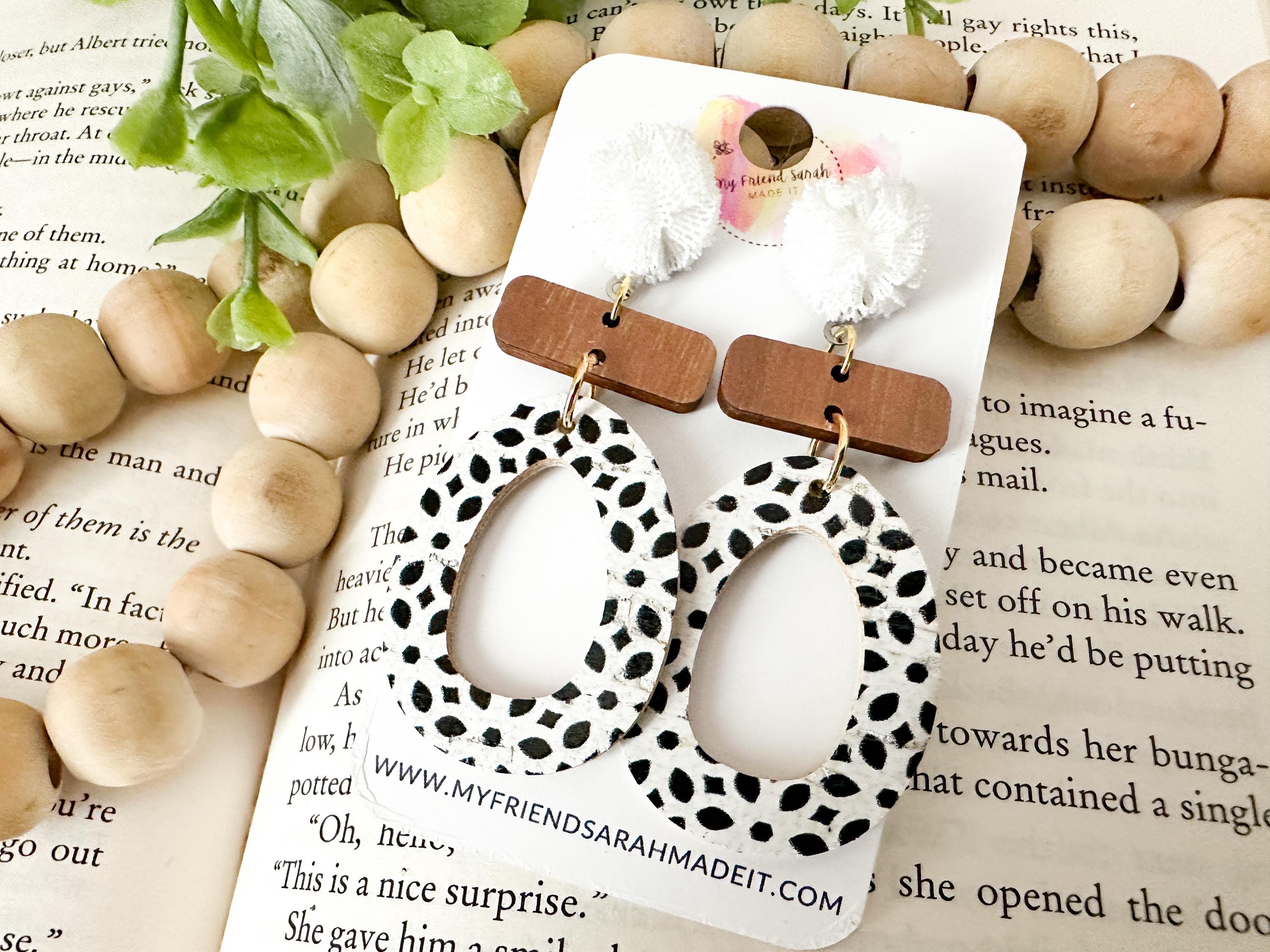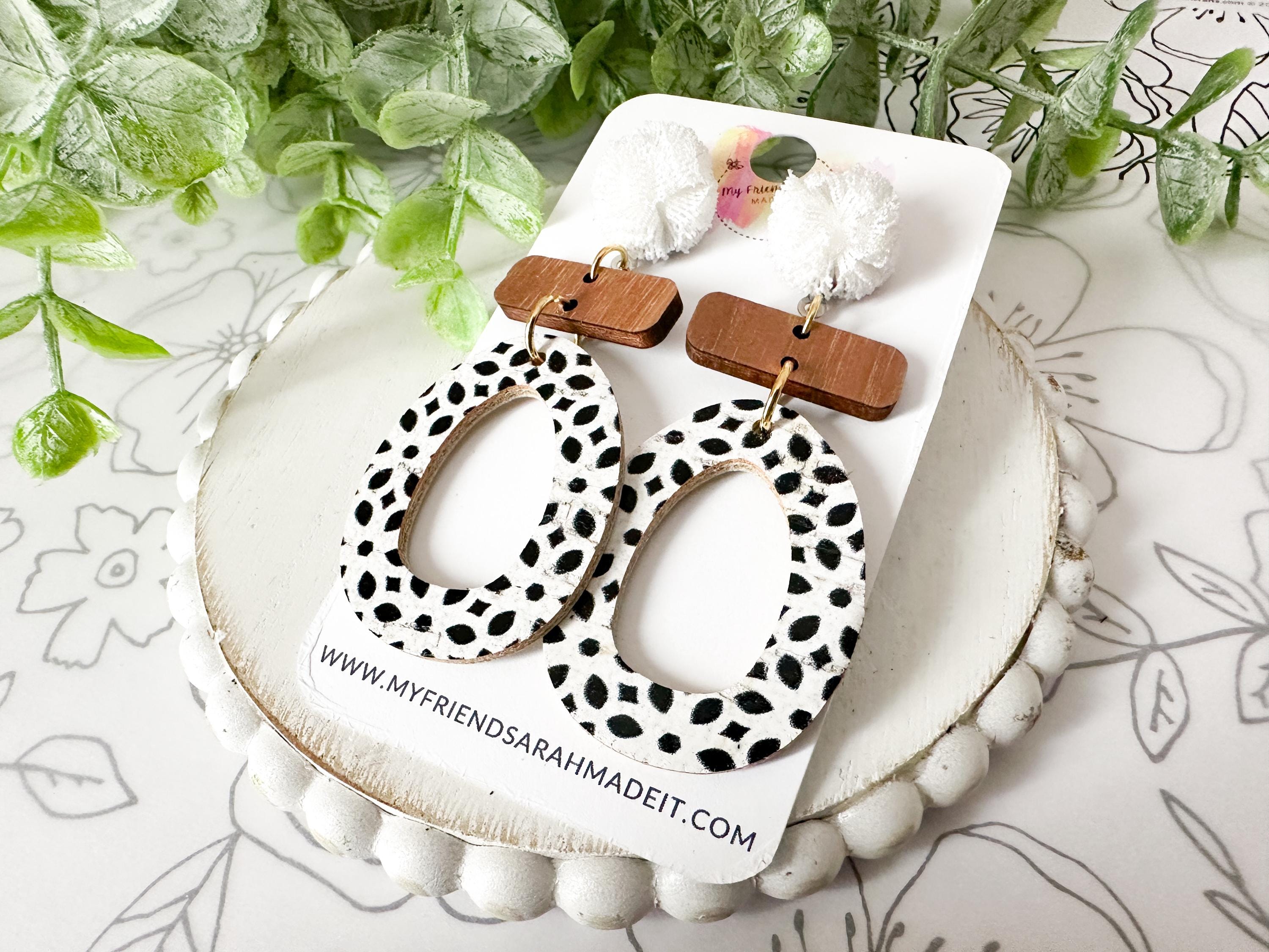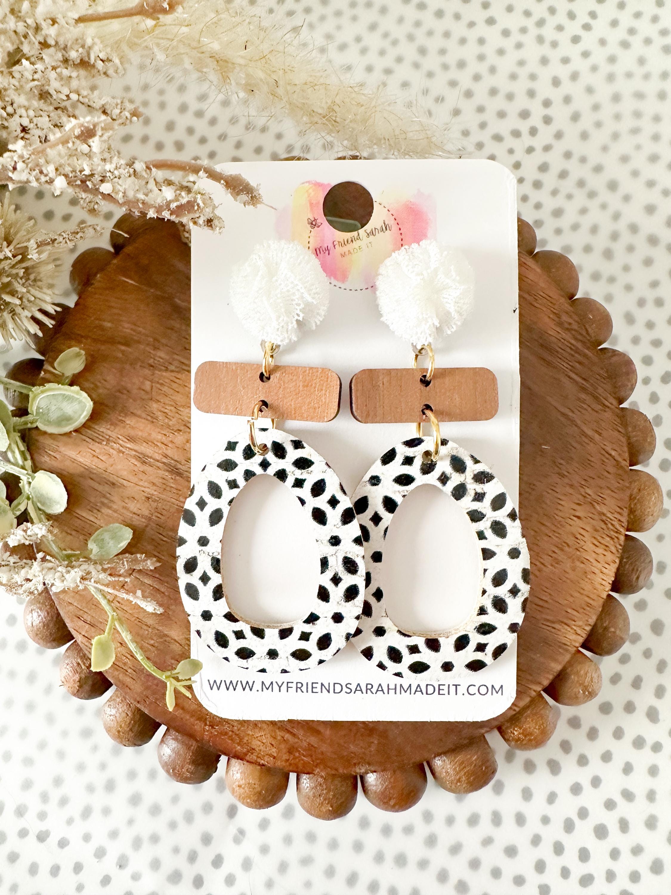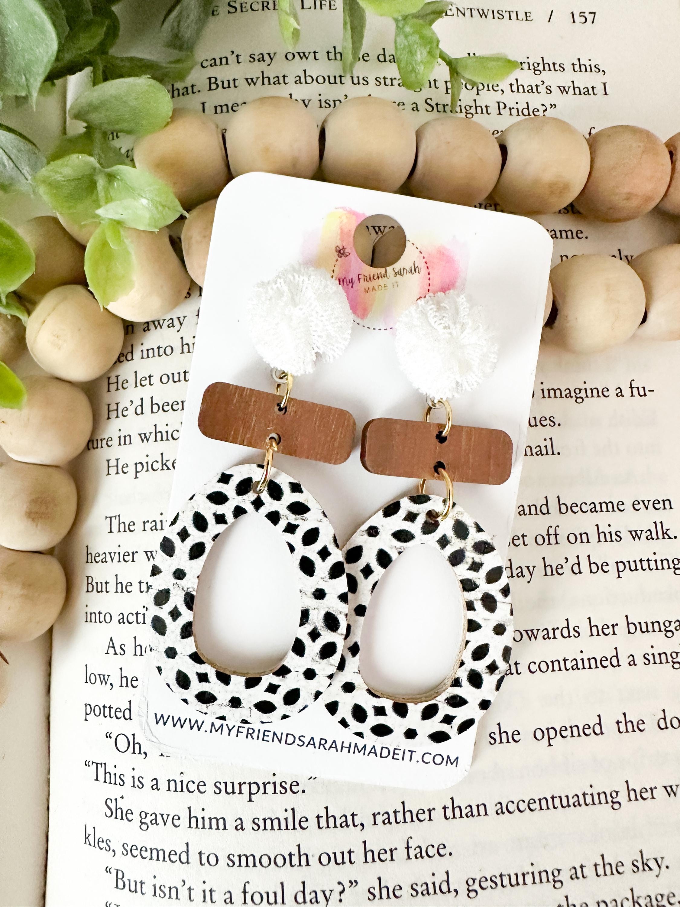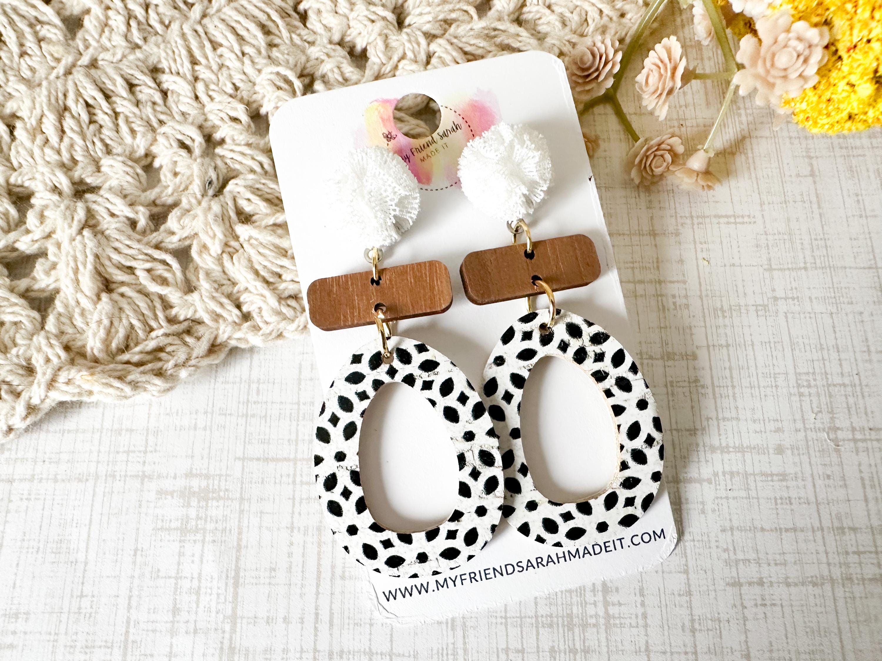 Bold yet feminine, these statement earrings combine soft lace texture with natural wood and playful cork. The black-and-white spotted ovals make them an instant favorite β lightweight, eye-catching, and full of personality.