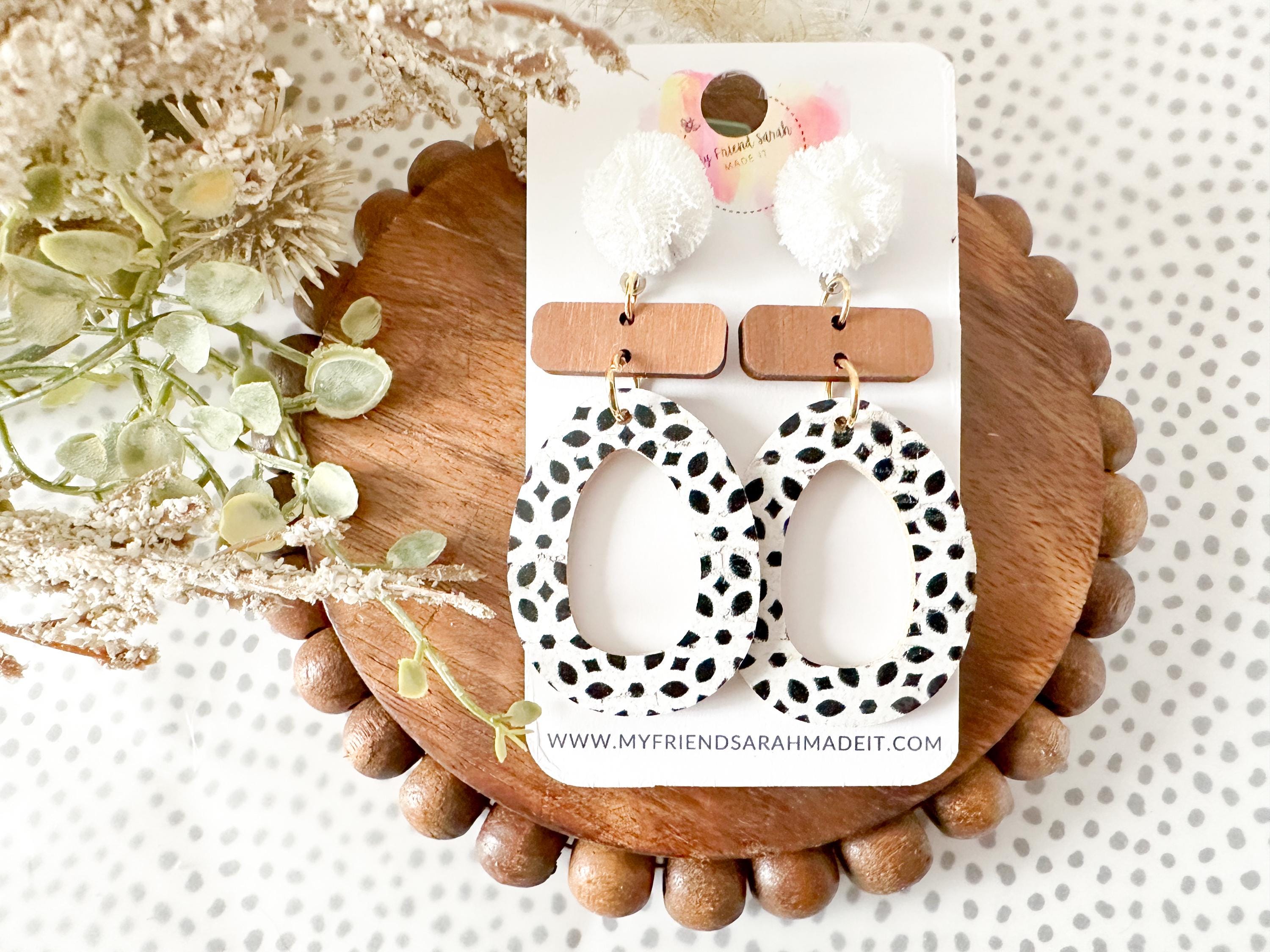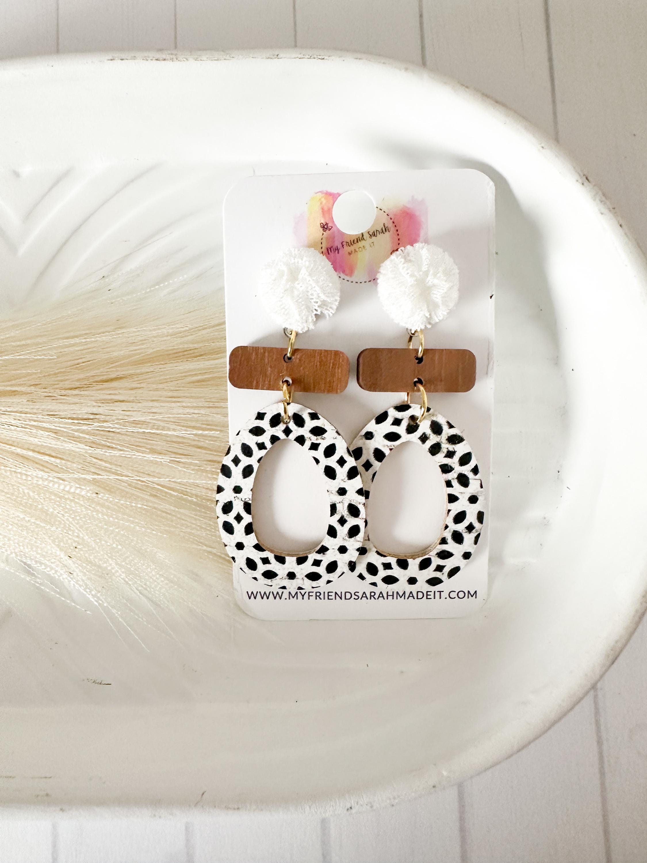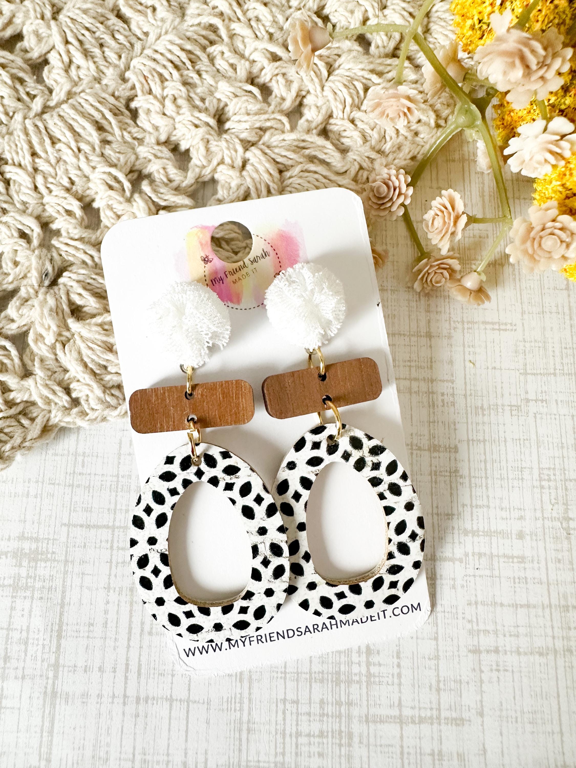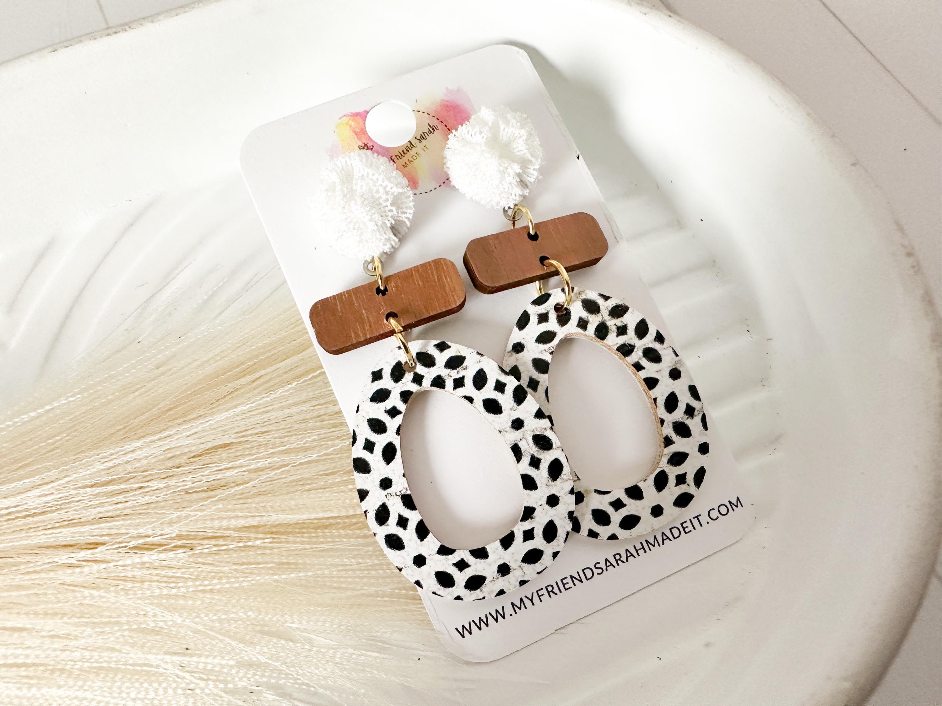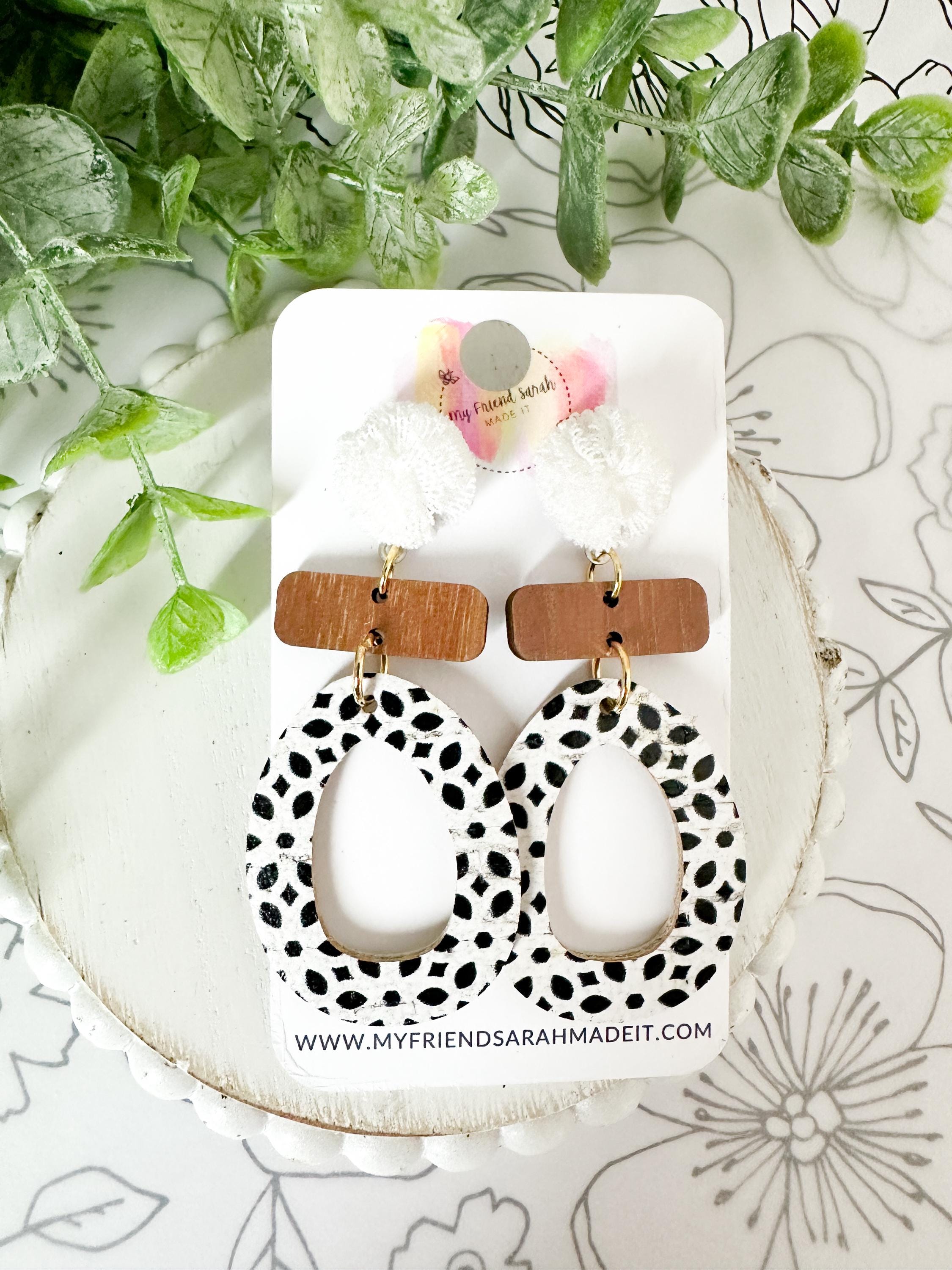 Bold yet feminine, these statement earrings combine soft lace texture with natural wood and playful cork. The black-and-white spotted ovals make them an instant favorite β lightweight, eye-catching, and full of personality.