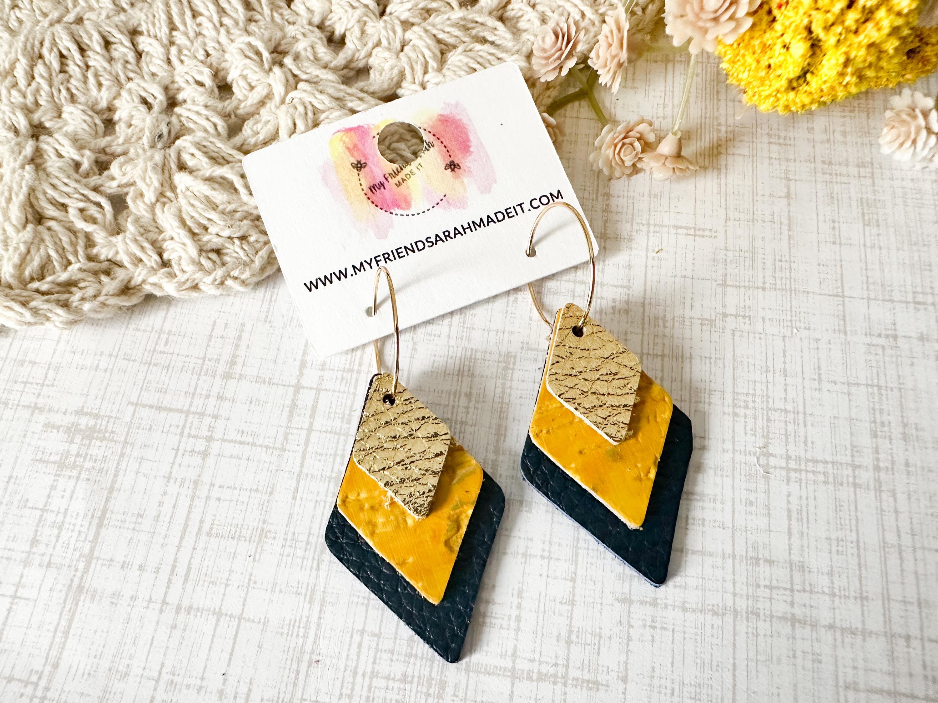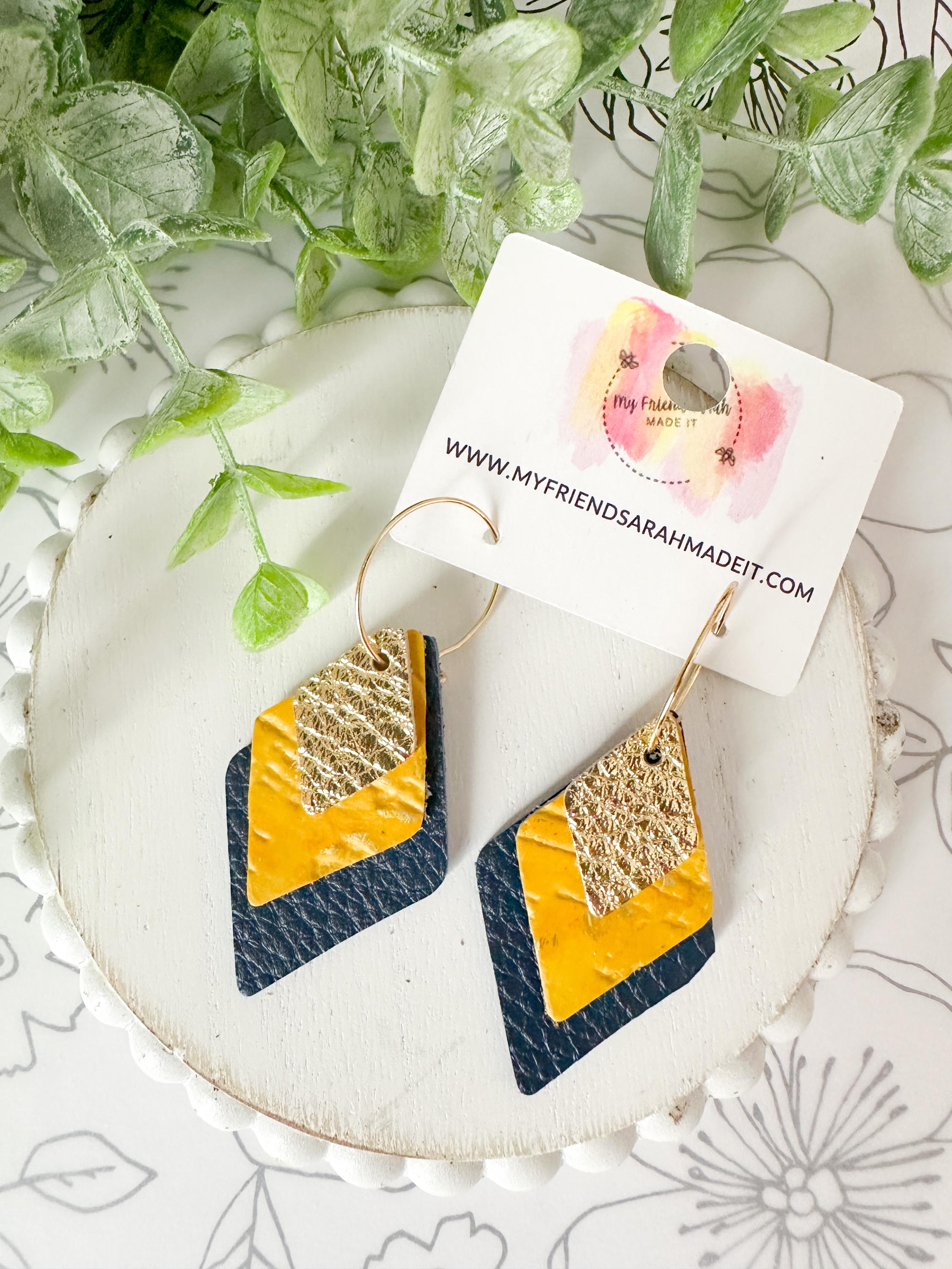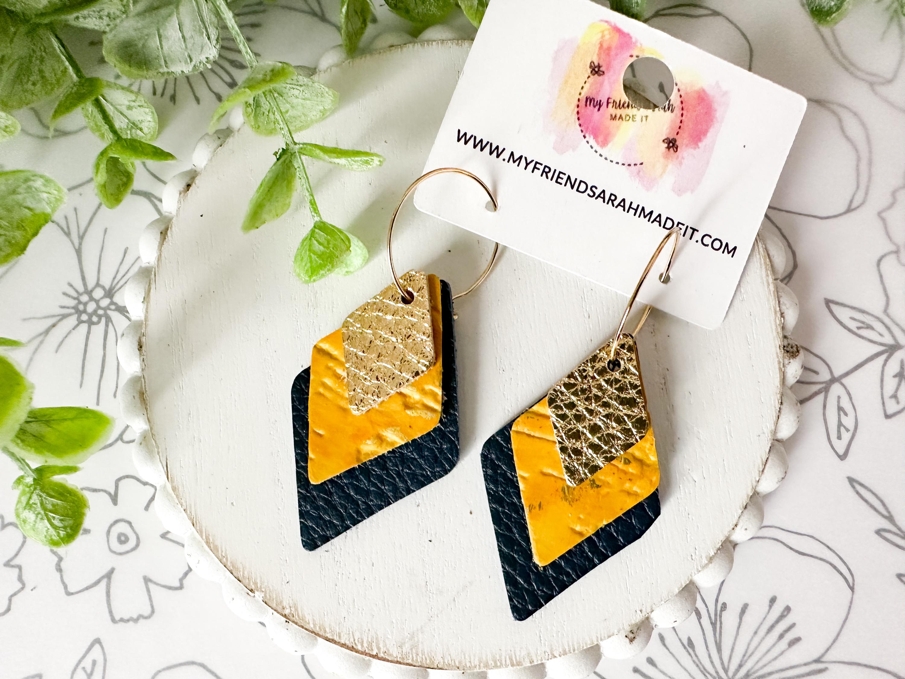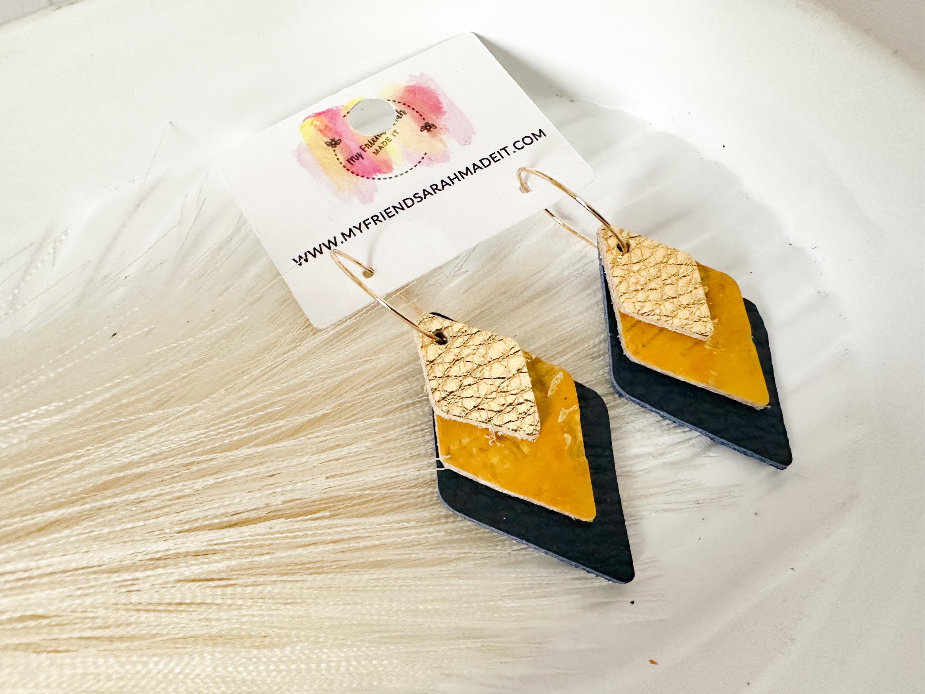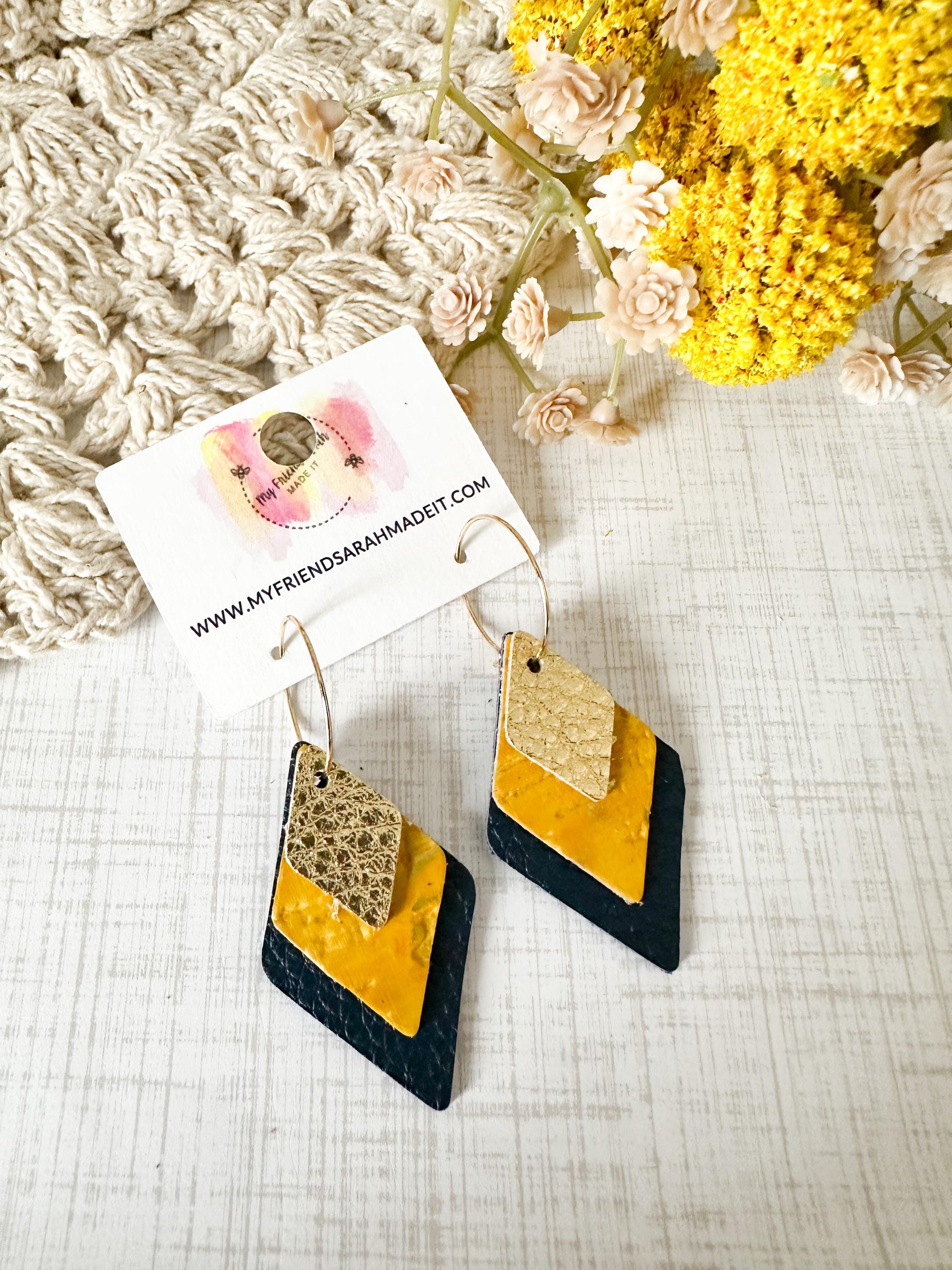 These layered leather diamond hoops mix metallic gold, mustard yellow, and deep navy for a look thatβs both earthy and elevated. Lightweight with an eye-catching shape that moves as you do - perfect for adding a little shine to any outfit.