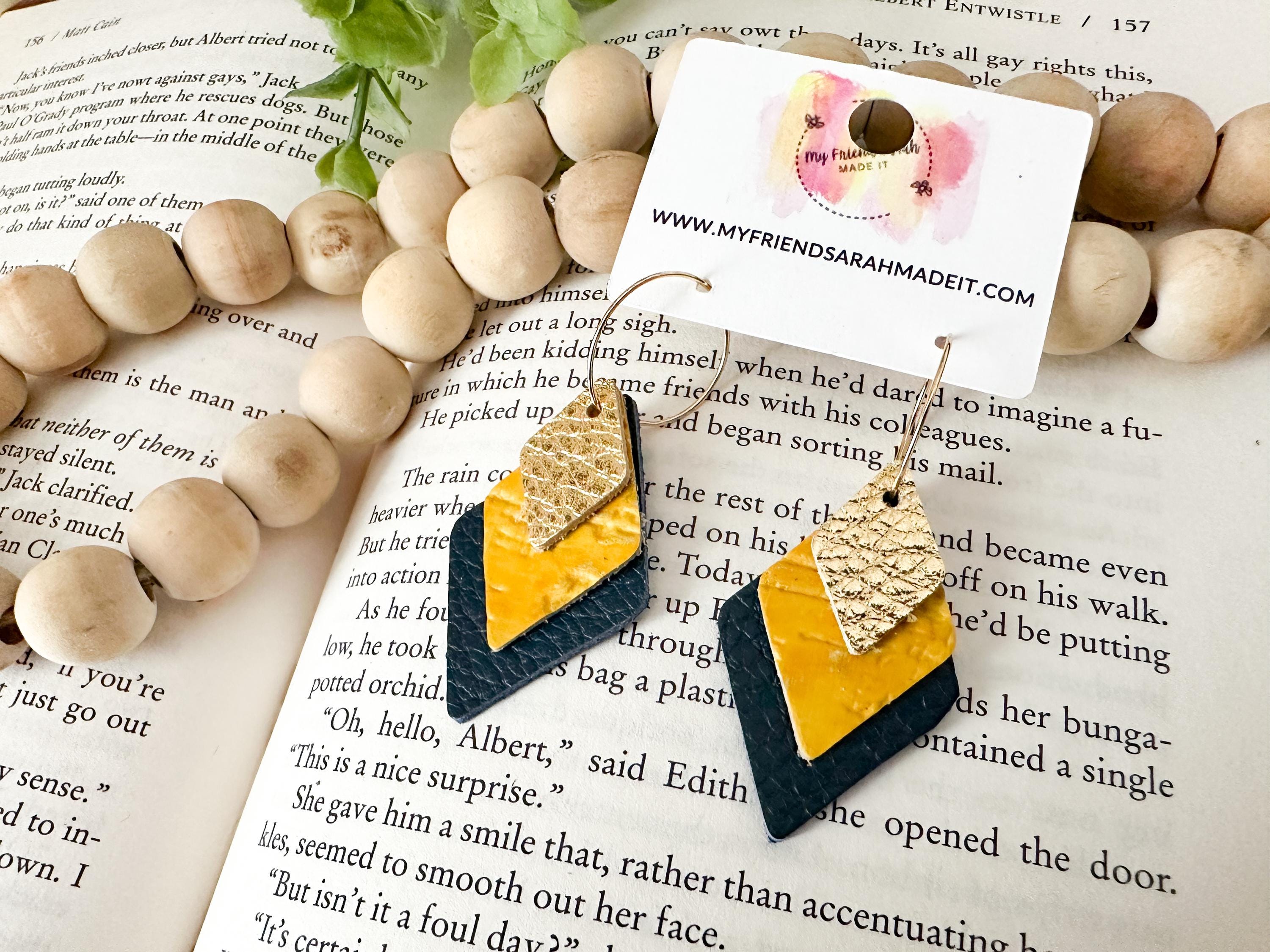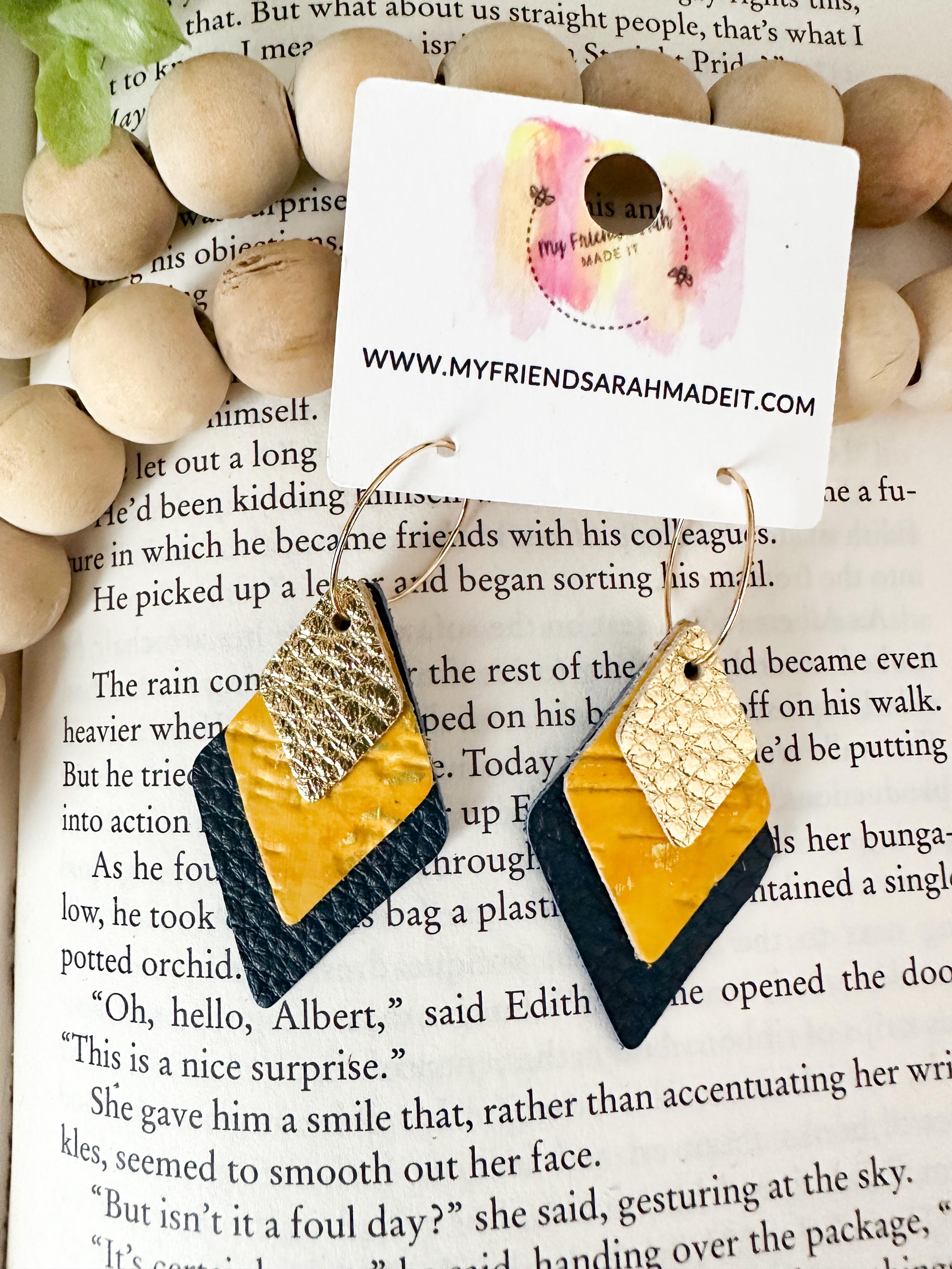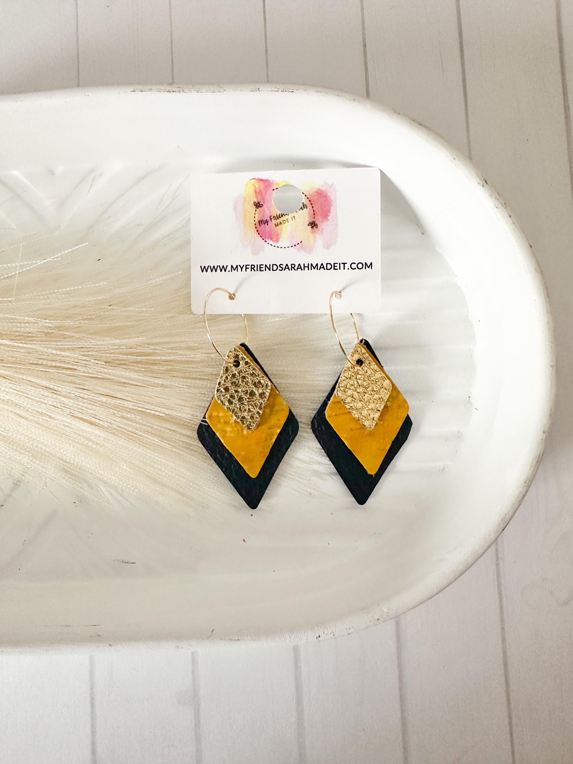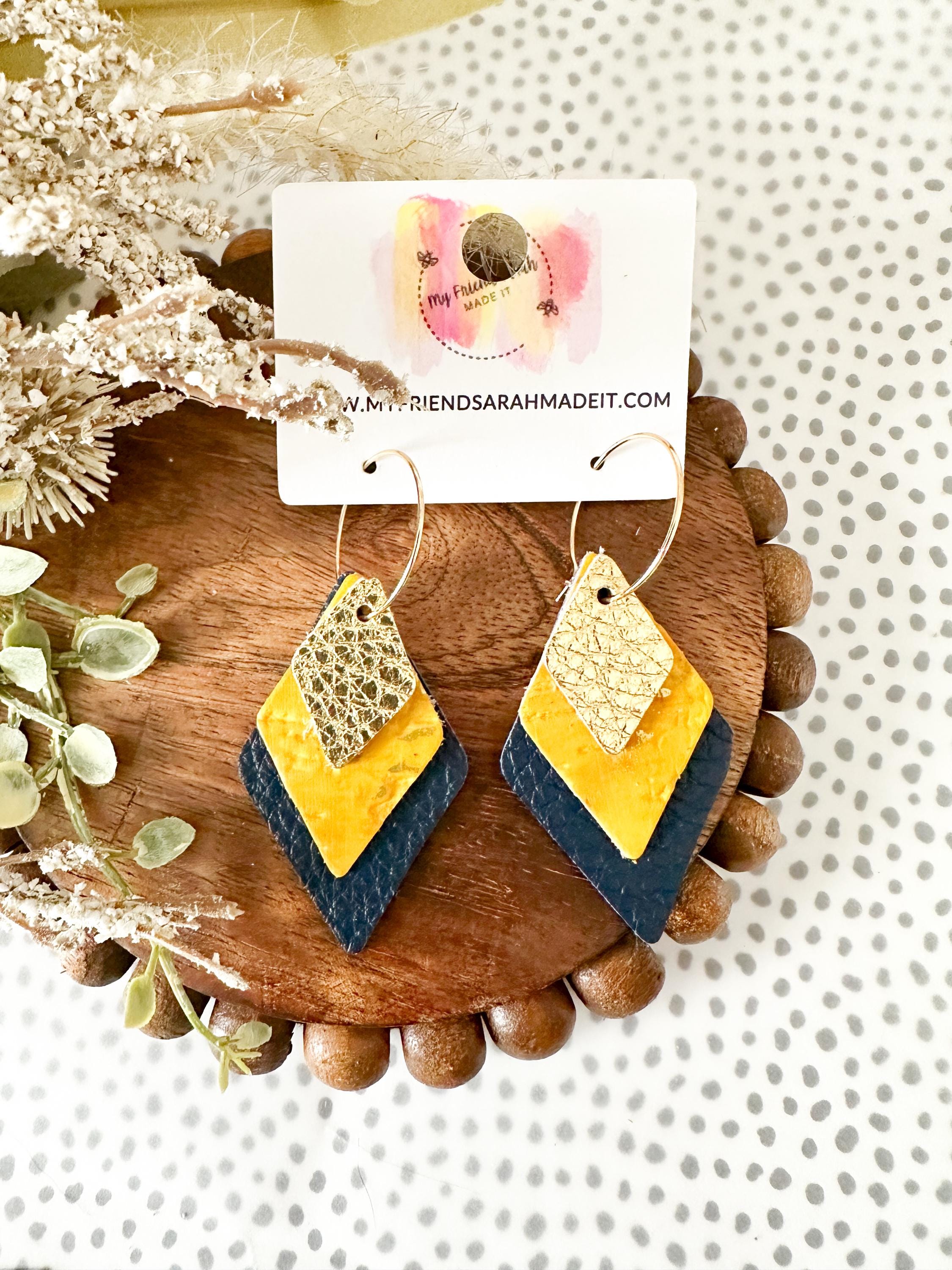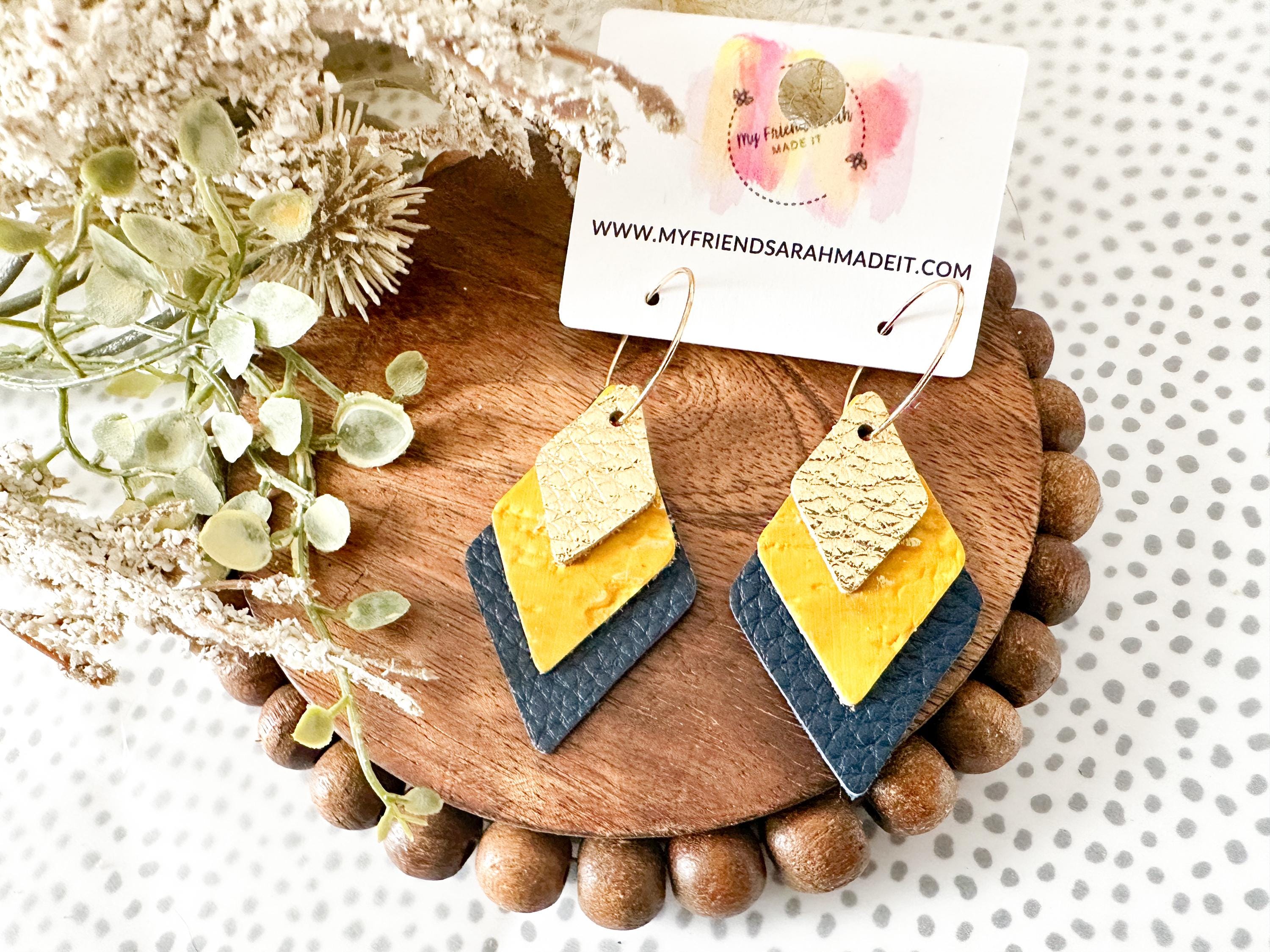 These layered leather diamond hoops mix metallic gold, mustard yellow, and deep navy for a look thatβs both earthy and elevated. Lightweight with an eye-catching shape that moves as you do - perfect for adding a little shine to any outfit.