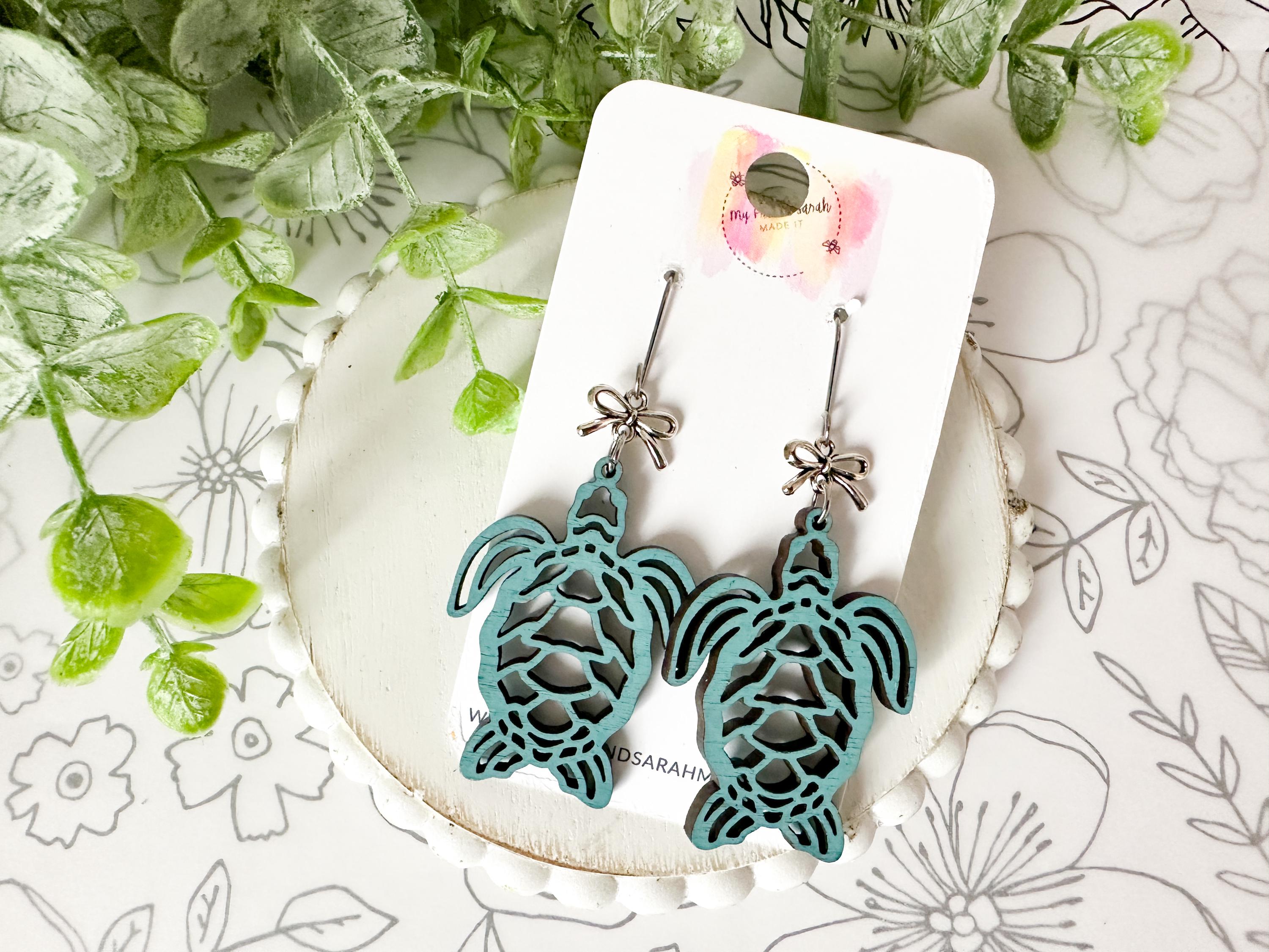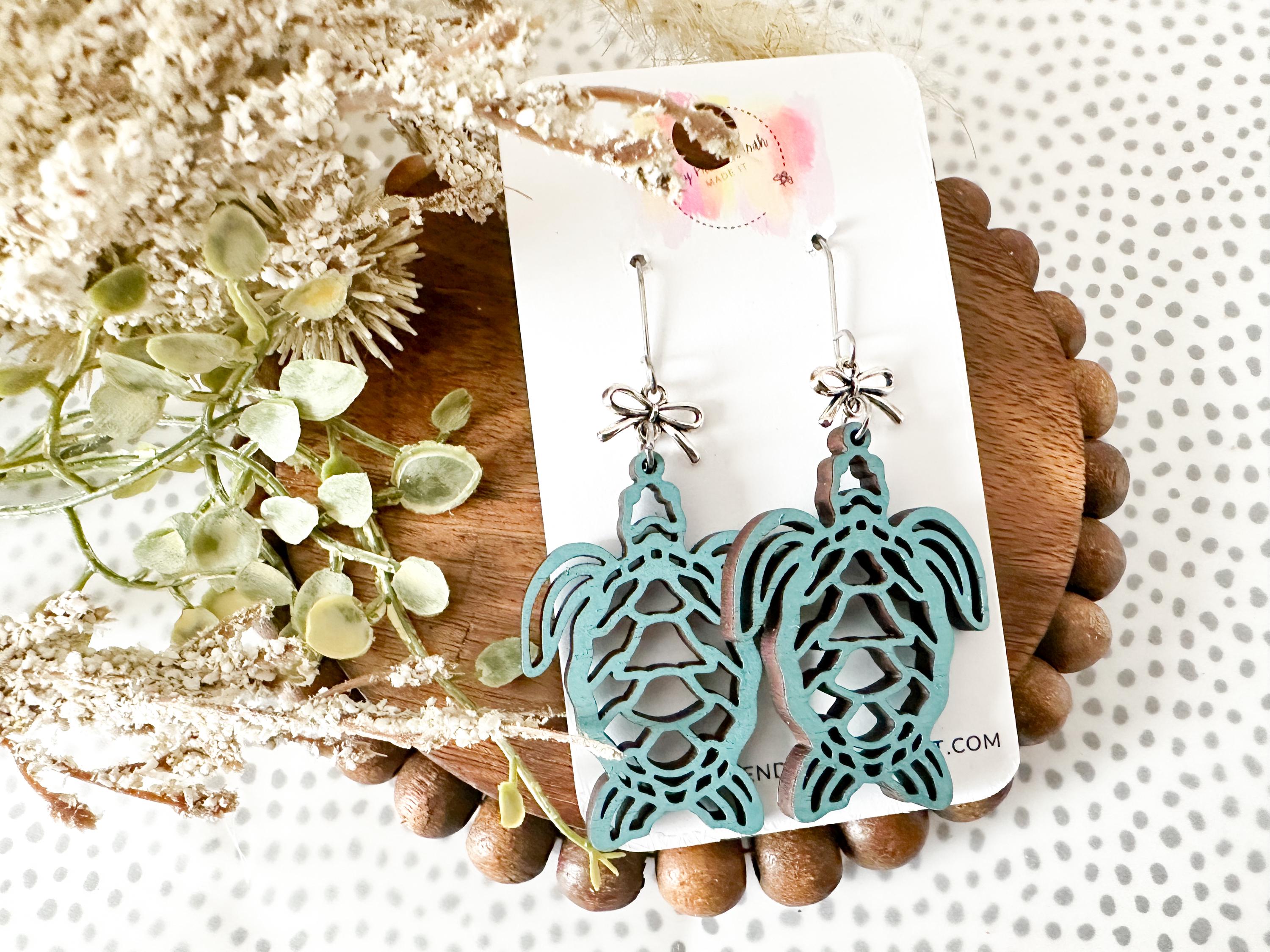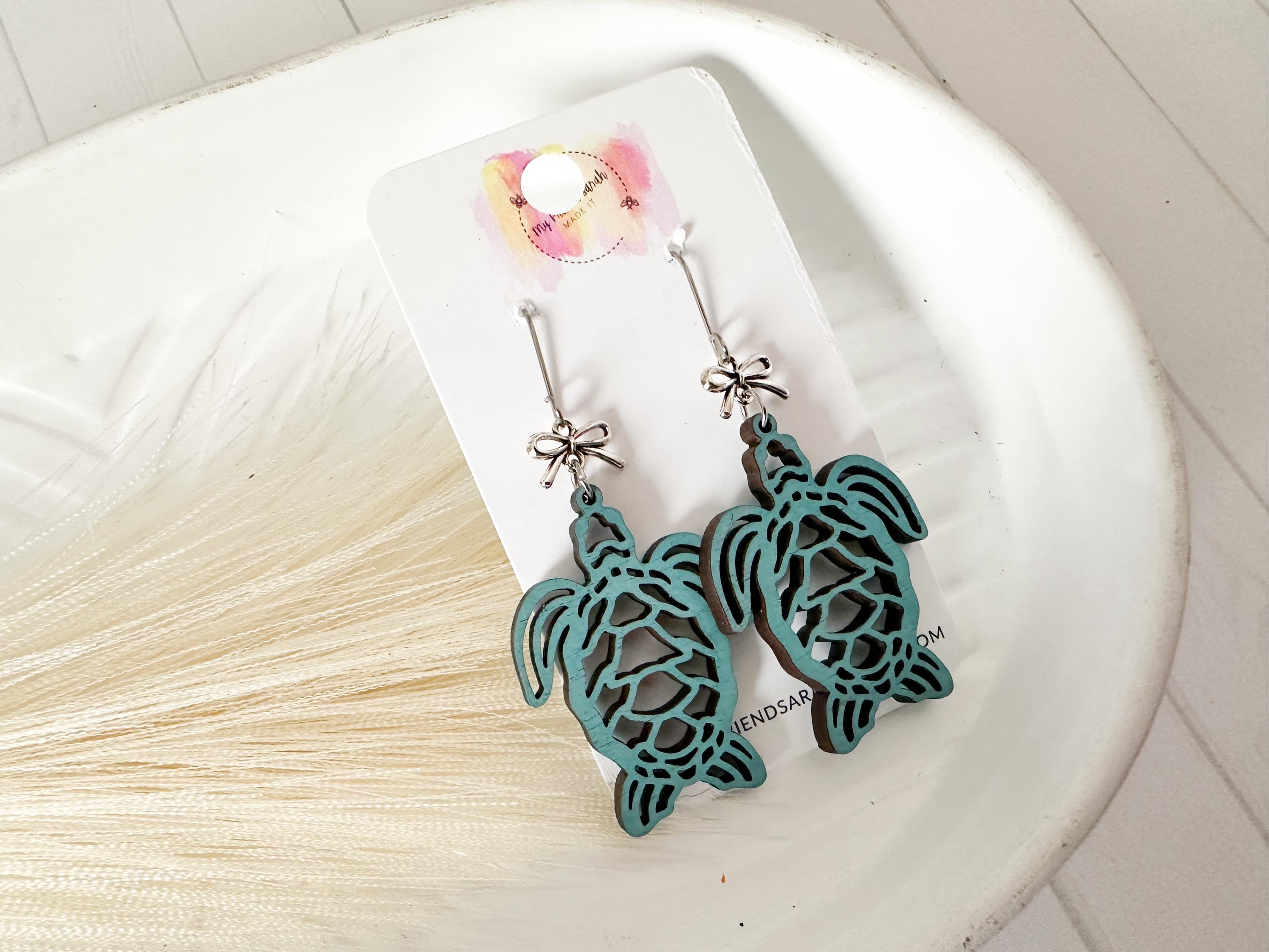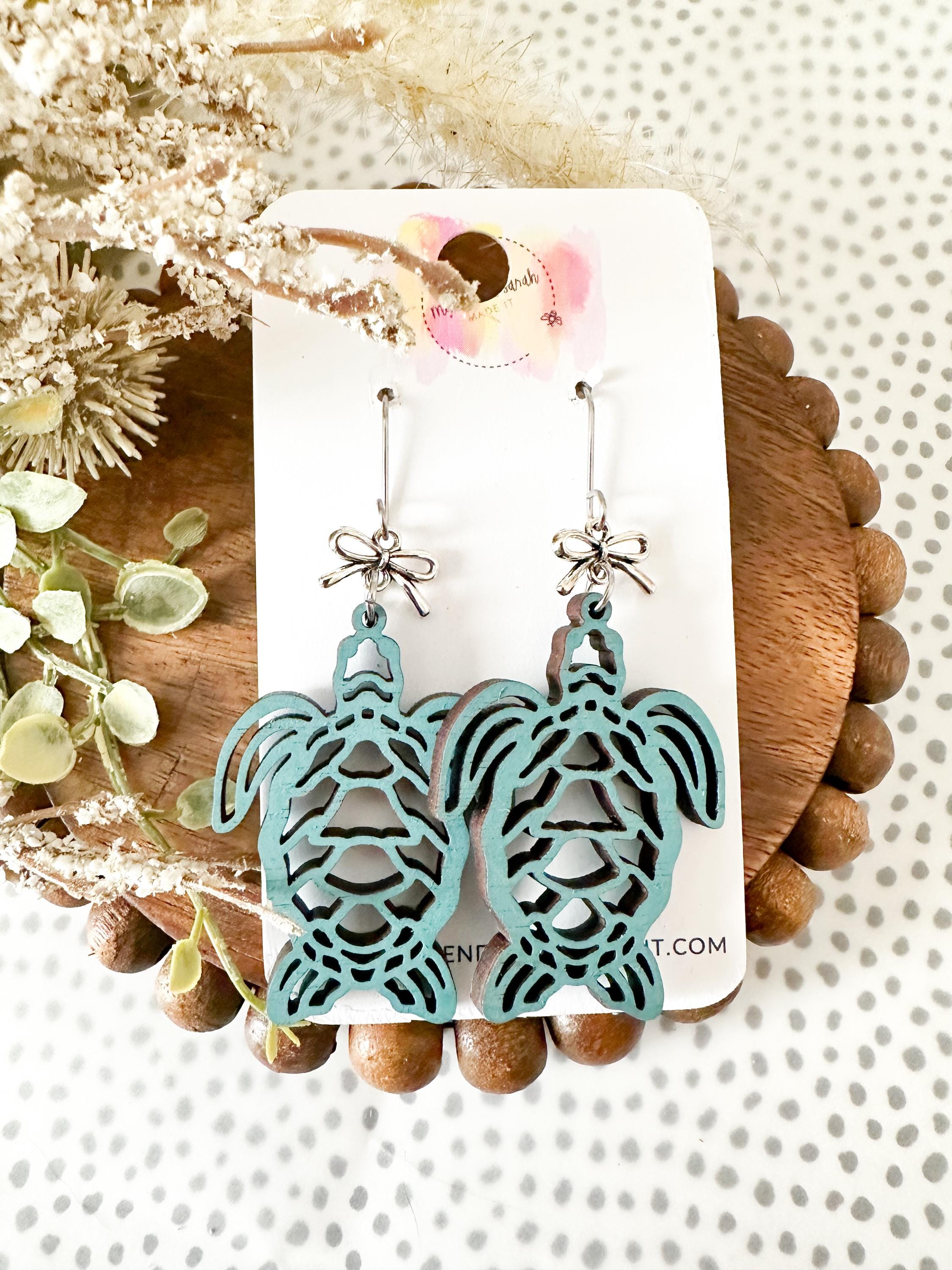 Bring a bit of coastal whimsy wherever you go with these hand-painted wooden sea turtle earrings. The teal finish and silver bow accents add the perfect mix of playful and polished - lightweight, beachy, and made for ocean lovers at heart.