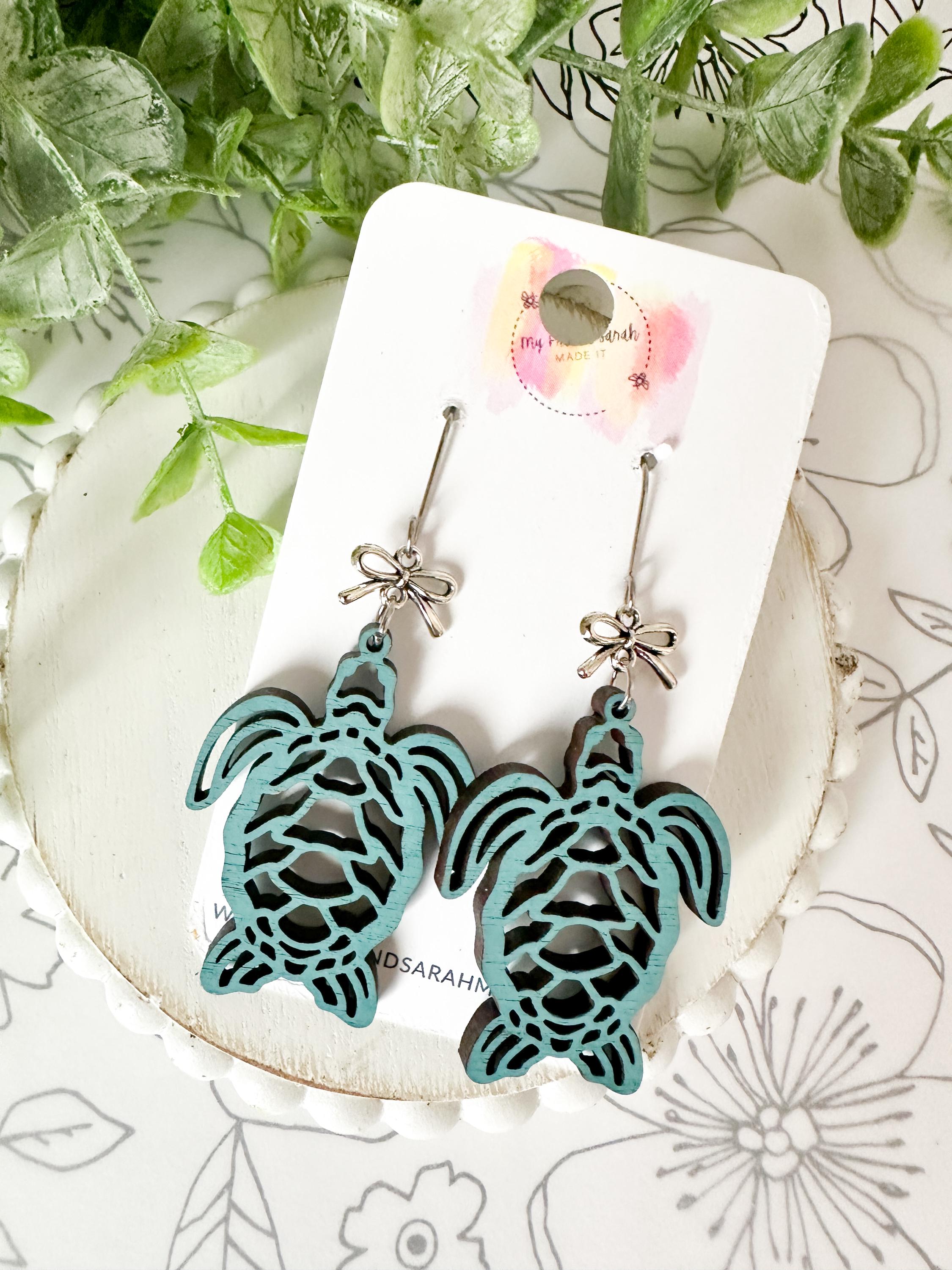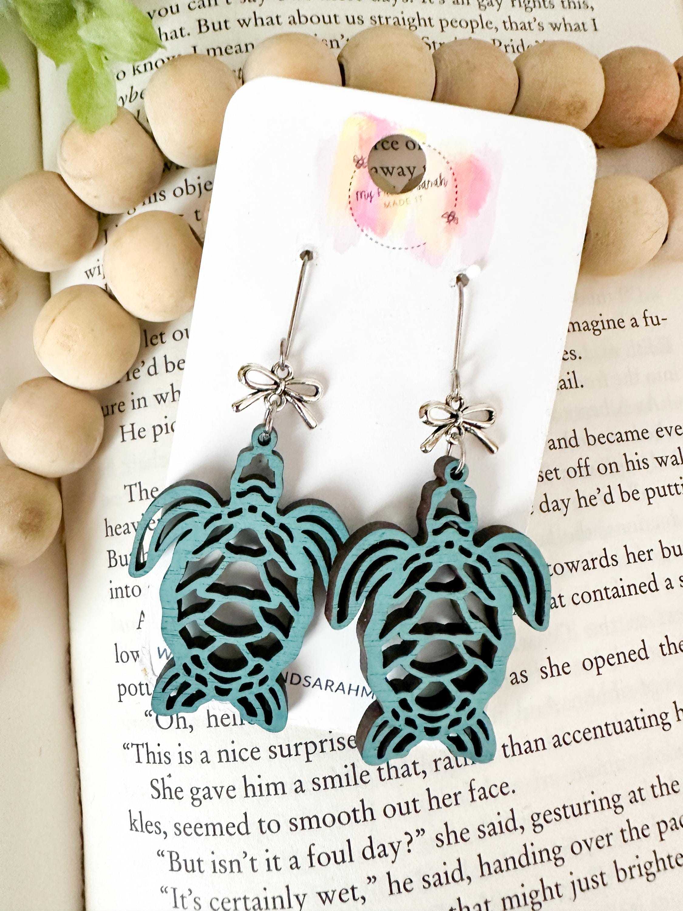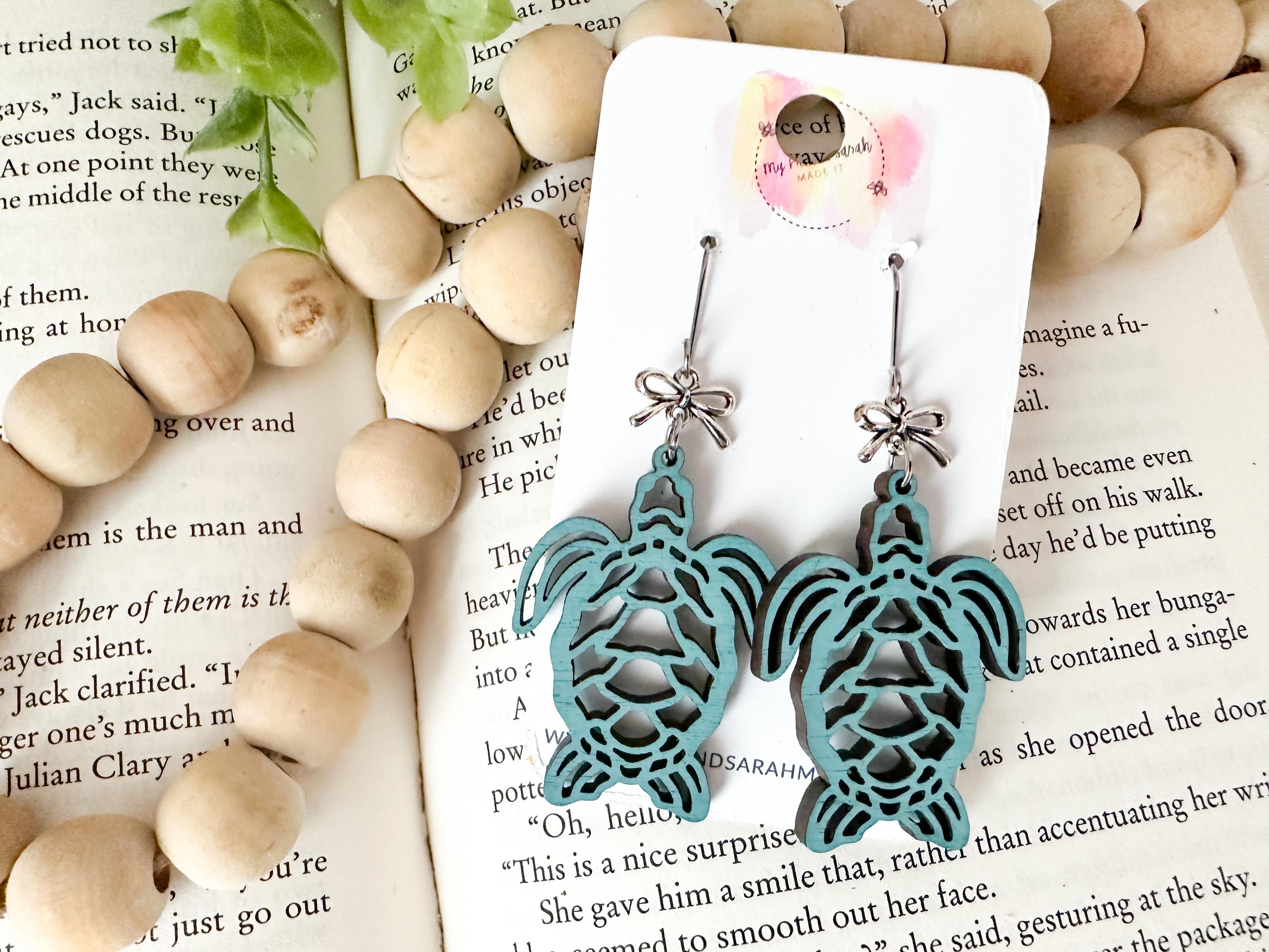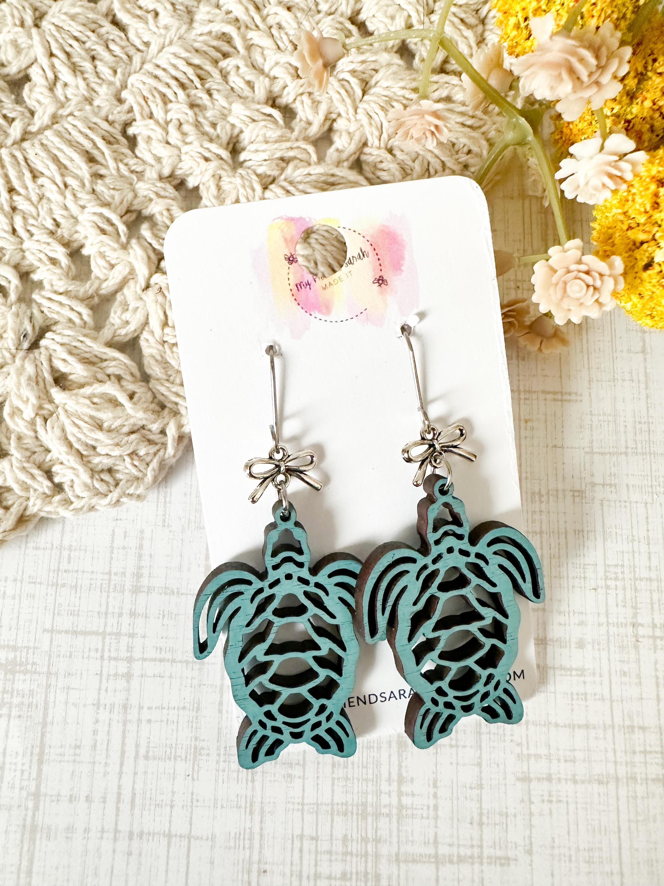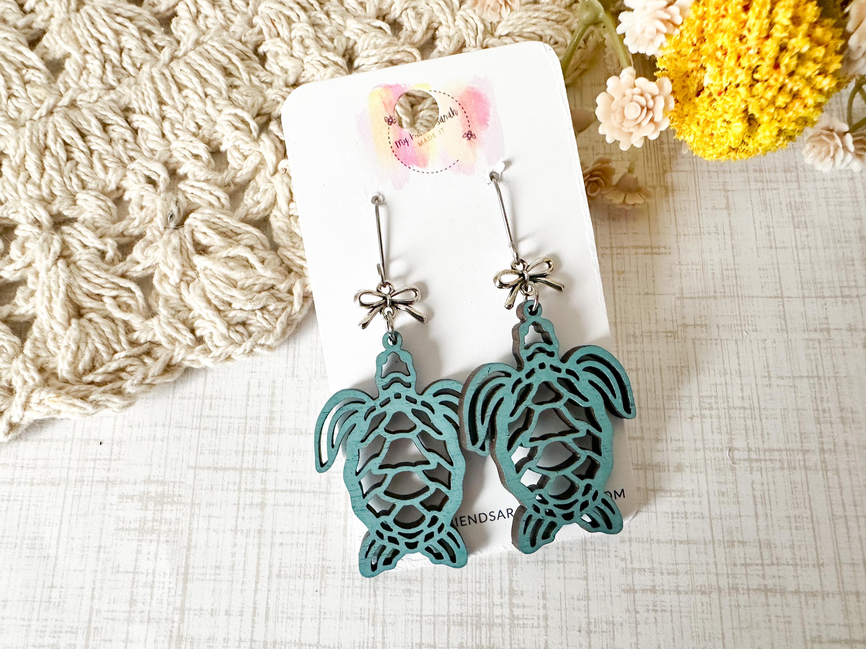 Bring a bit of coastal whimsy wherever you go with these hand-painted wooden sea turtle earrings. The teal finish and silver bow accents add the perfect mix of playful and polished - lightweight, beachy, and made for ocean lovers at heart.