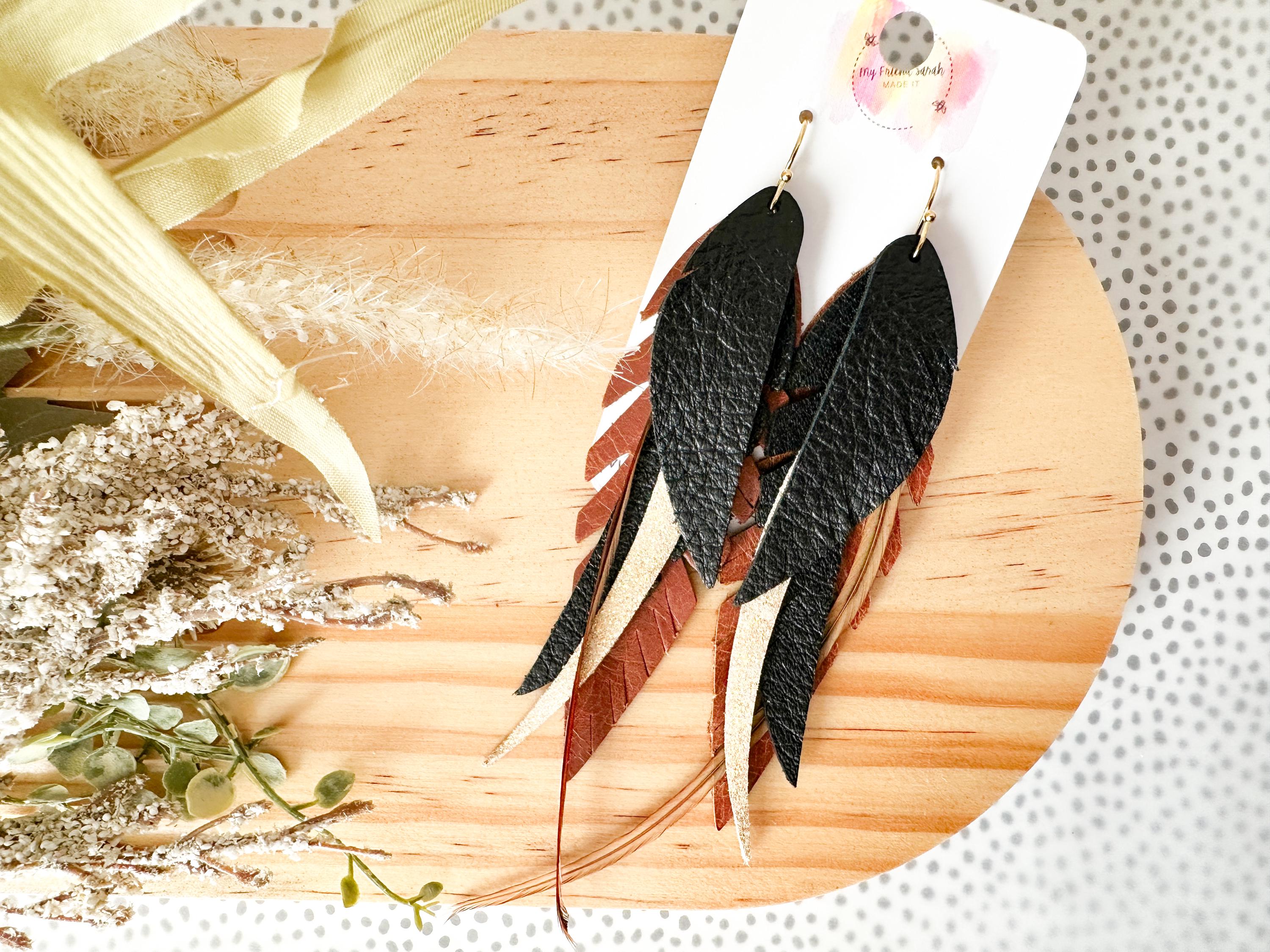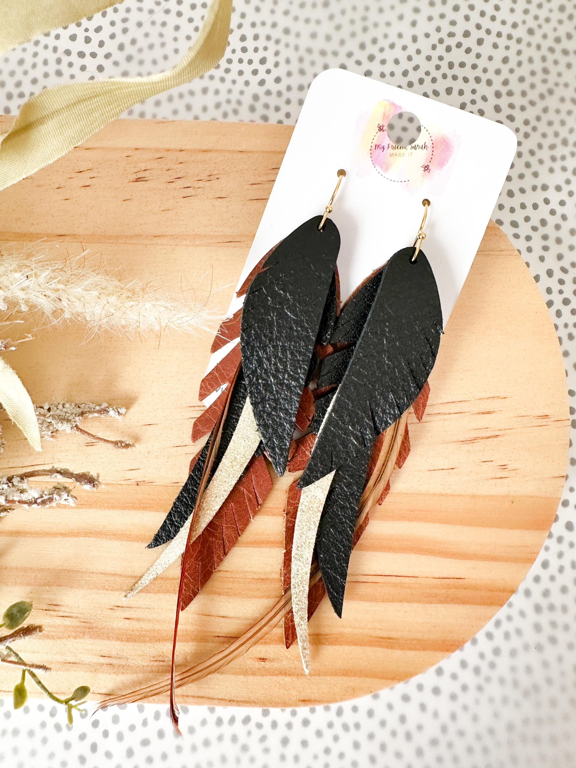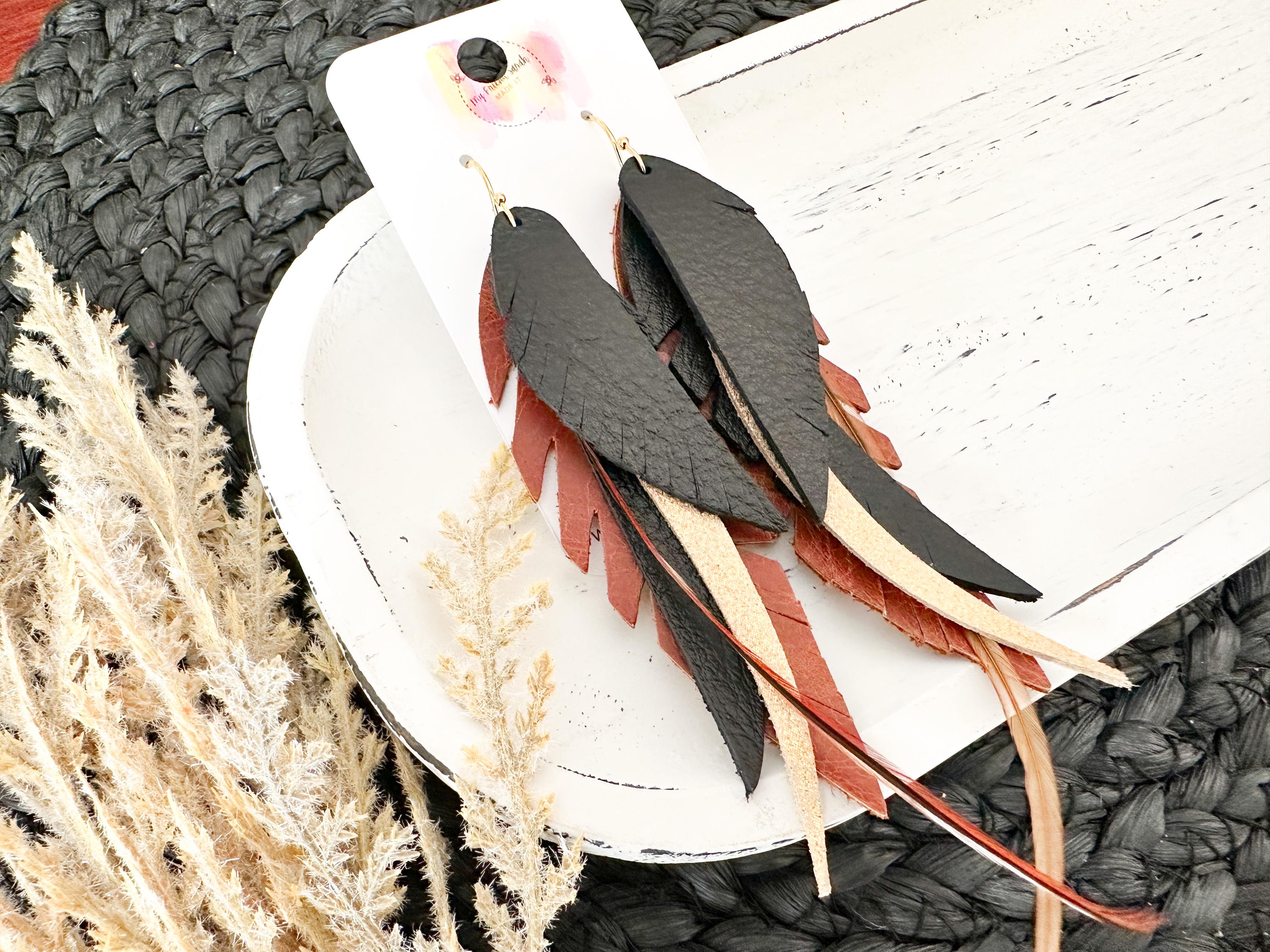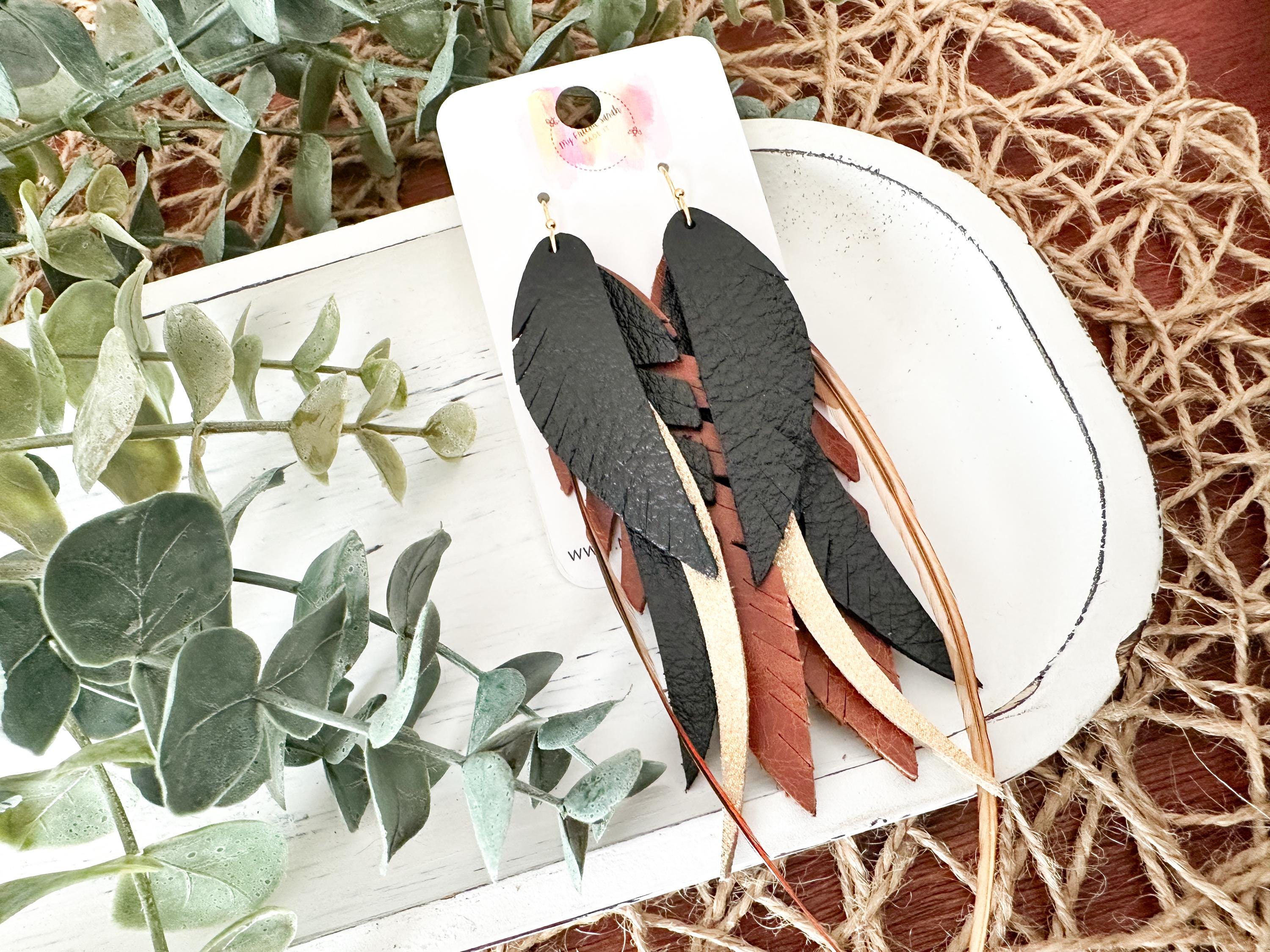 Bold, free, and full of movement - these layered leather feather earrings bring instant boho energy. Each pair blends black, copper, and gold tones in a lightweight design that sways beautifully with every step.