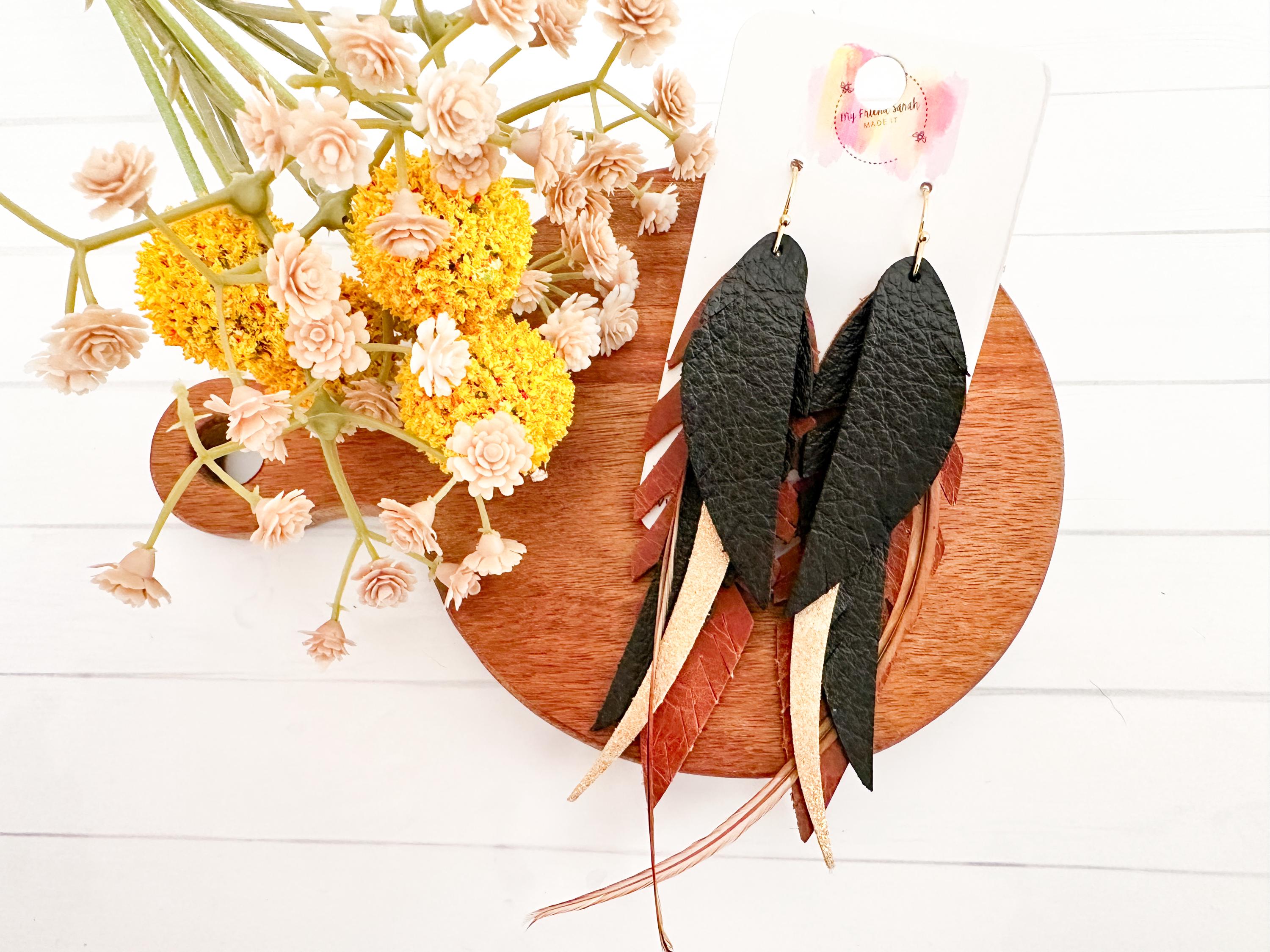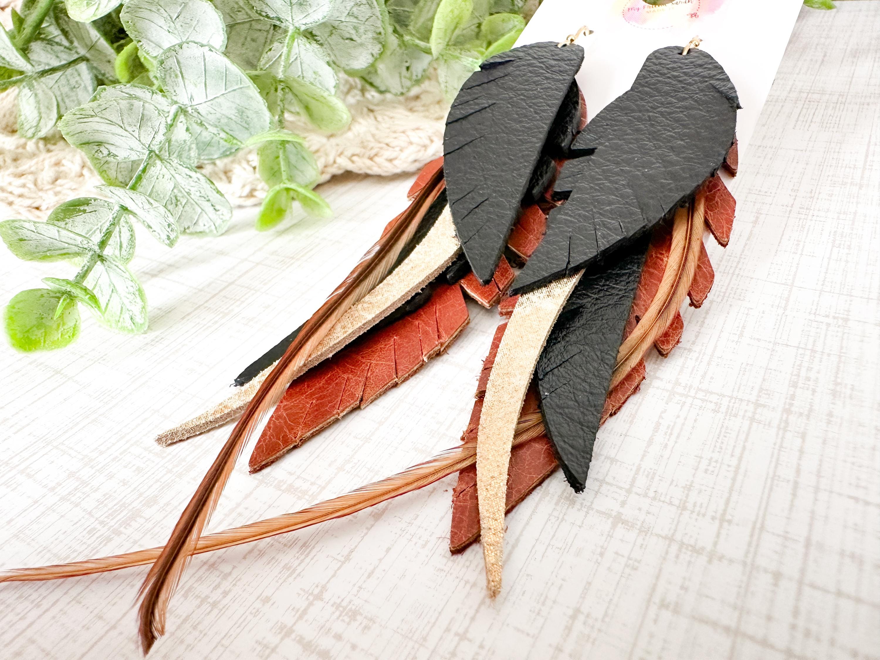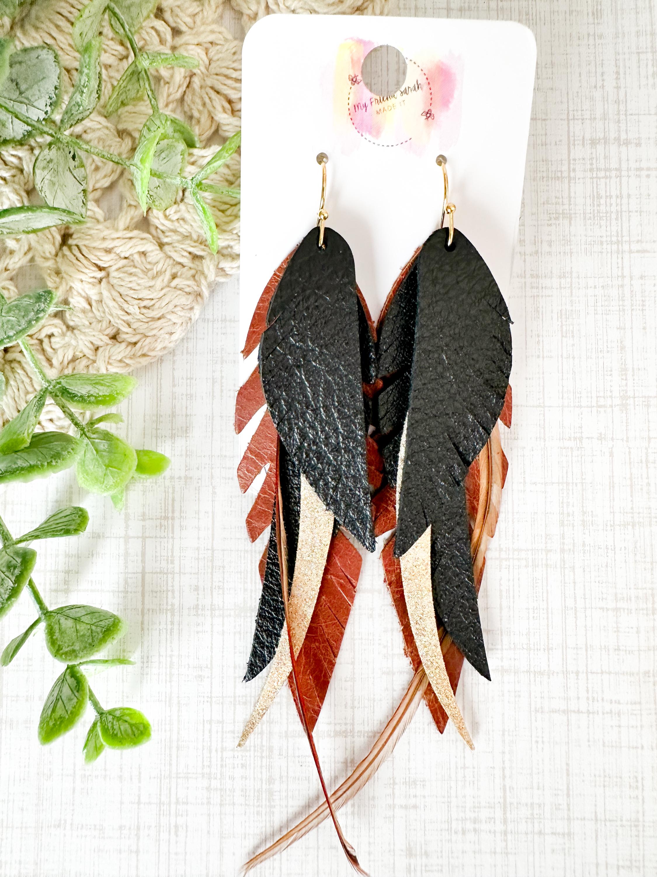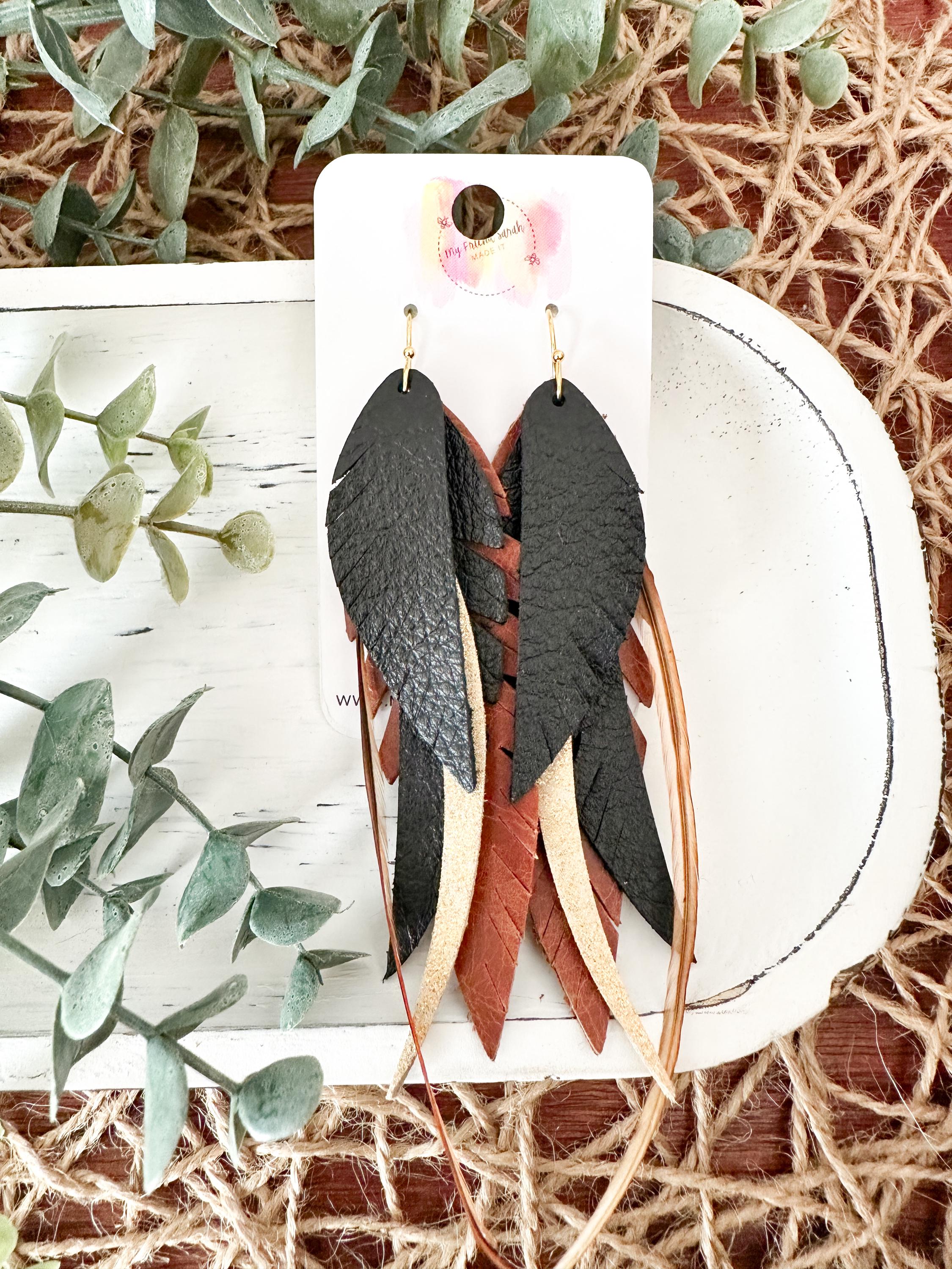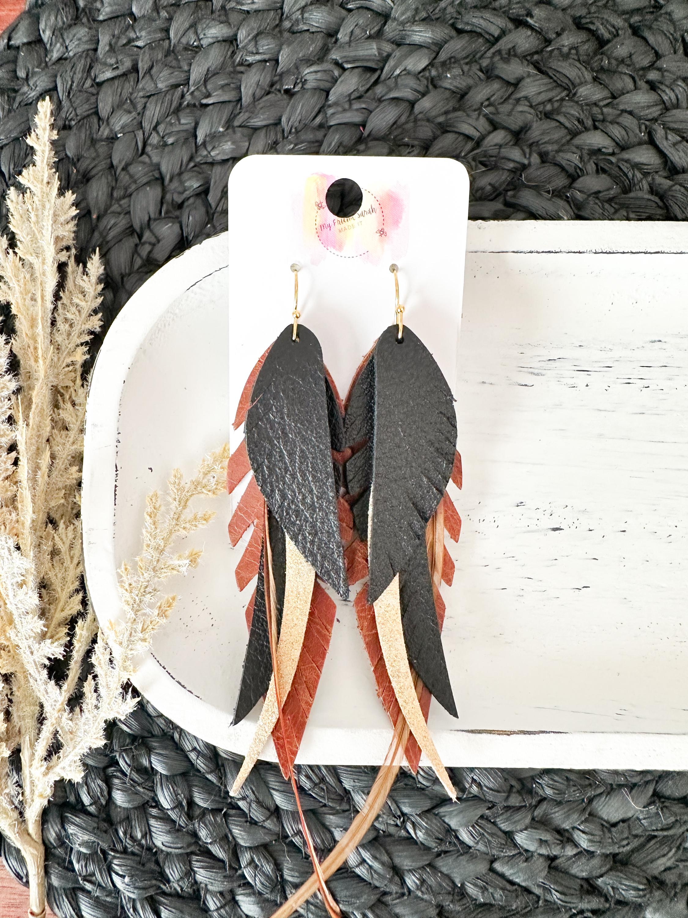Bold, free, and full of movement - these layered leather feather earrings bring instant boho energy. Each pair blends black, copper, and gold tones in a lightweight design that sways beautifully with every step.