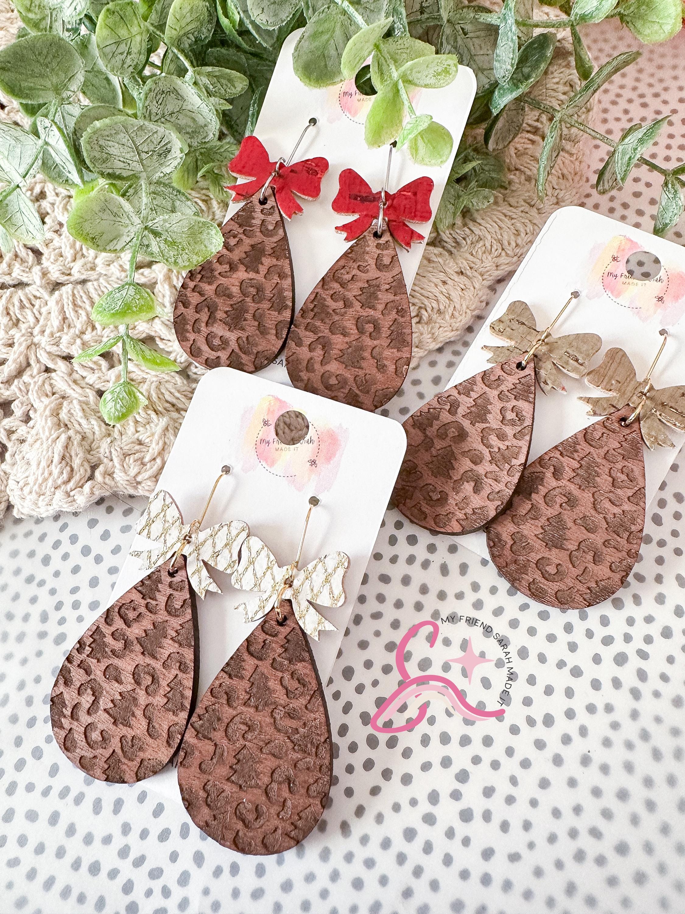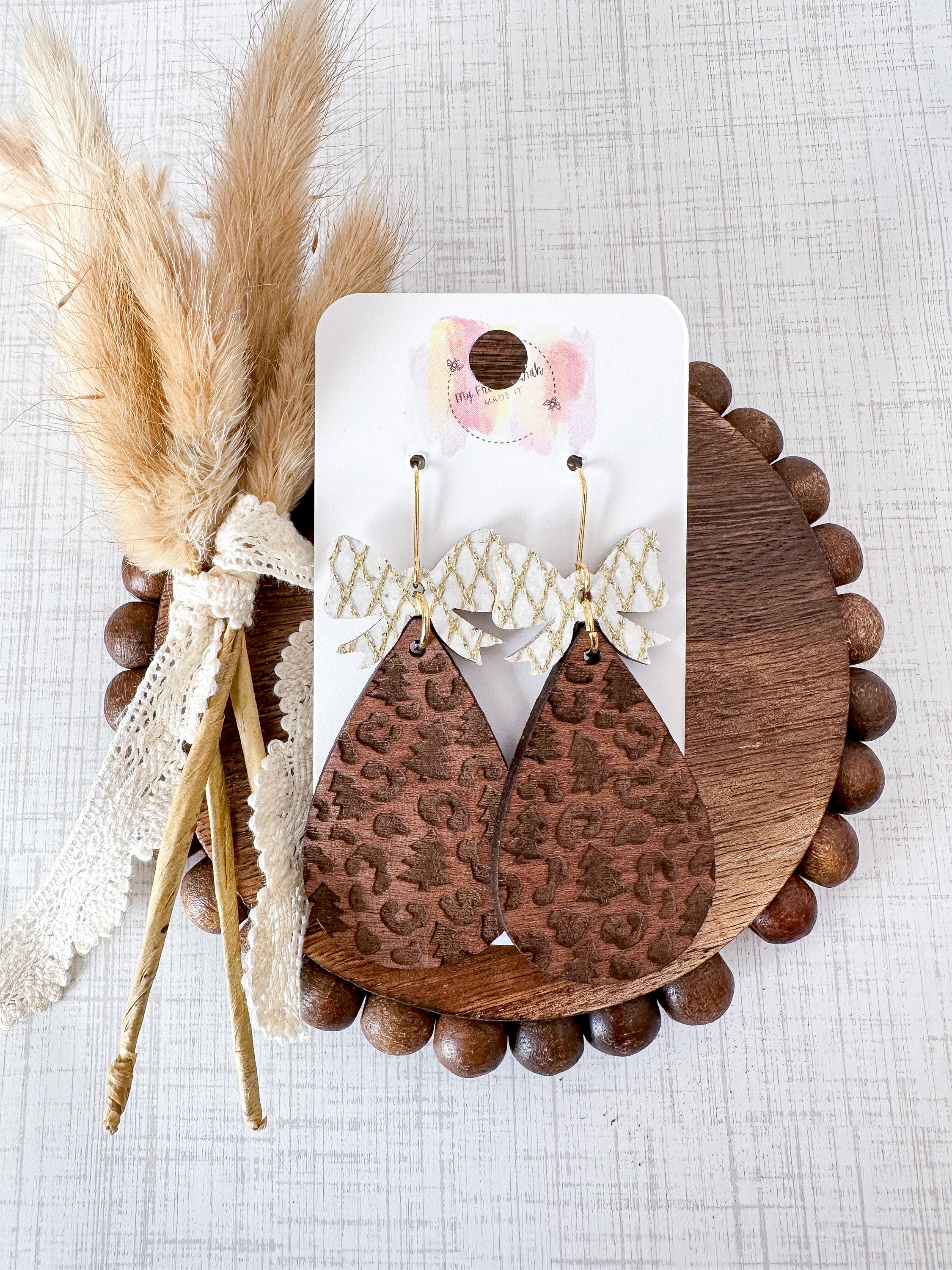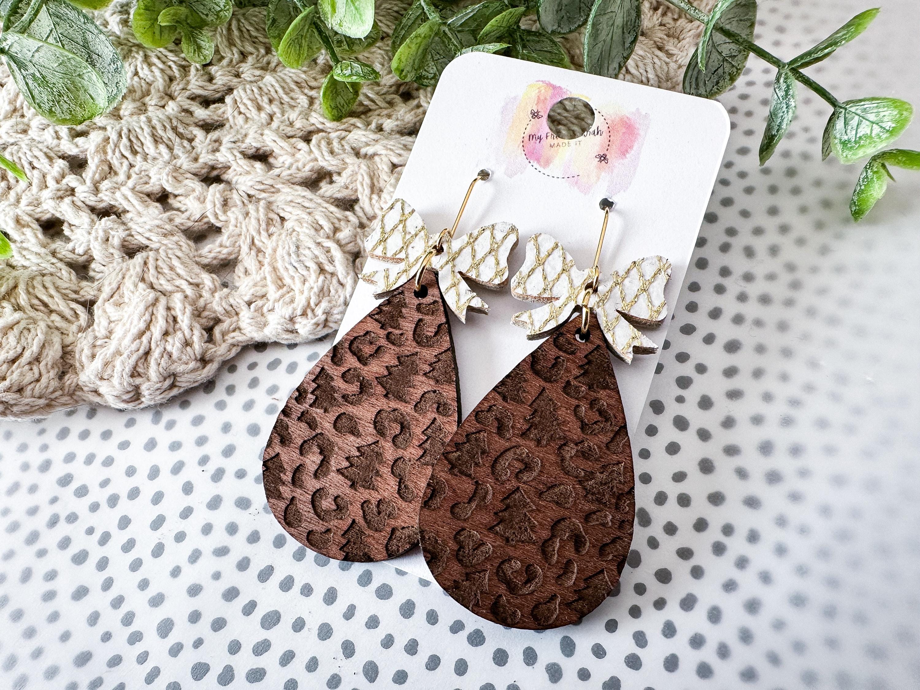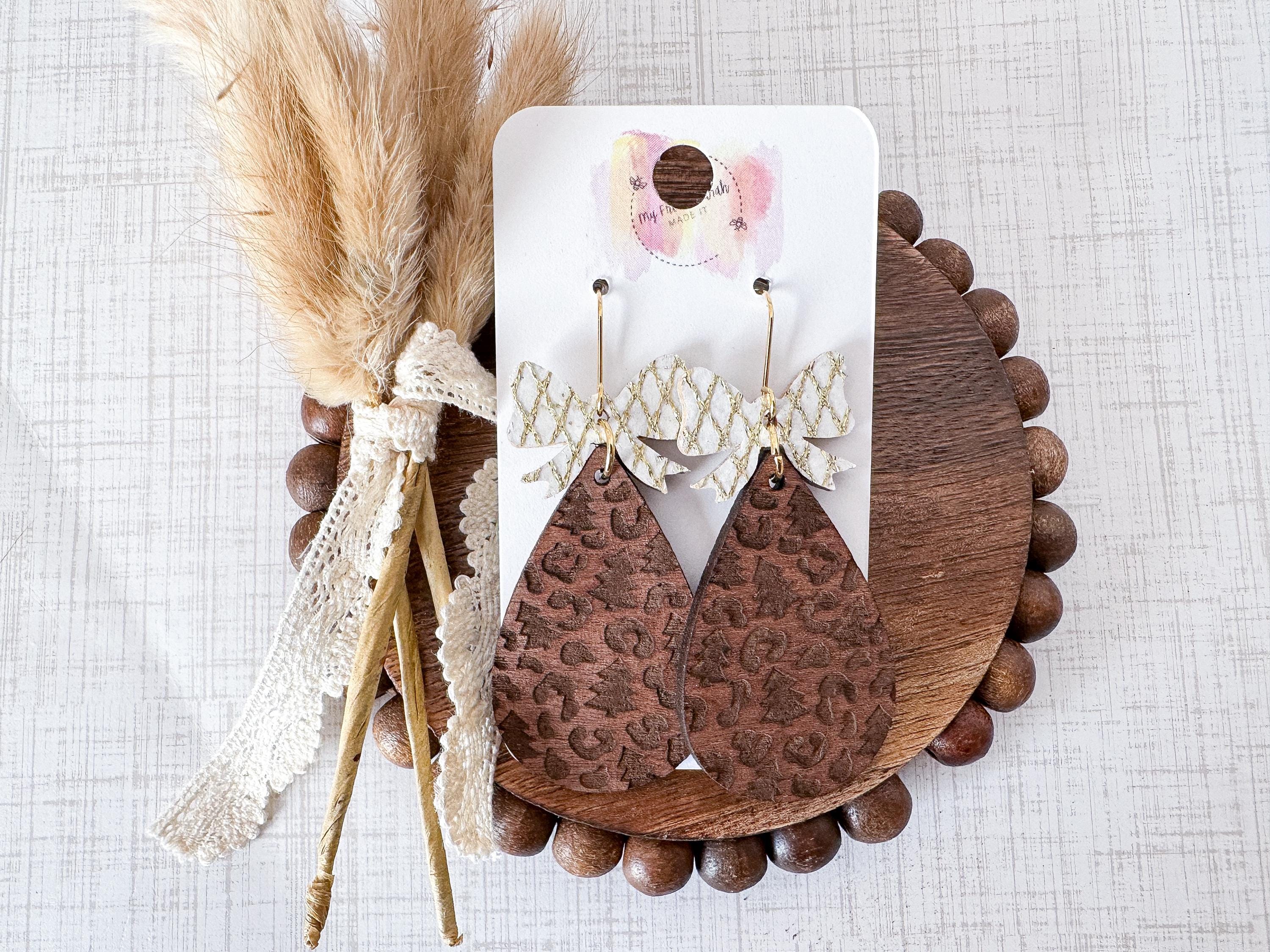 A touch of sparkle and a lot of charm! These wood and cork bow earrings bring a playful twist to your holiday look. The engraved wood design mixes wild and festive, while the gold-detailed bows keep things polished and pretty.