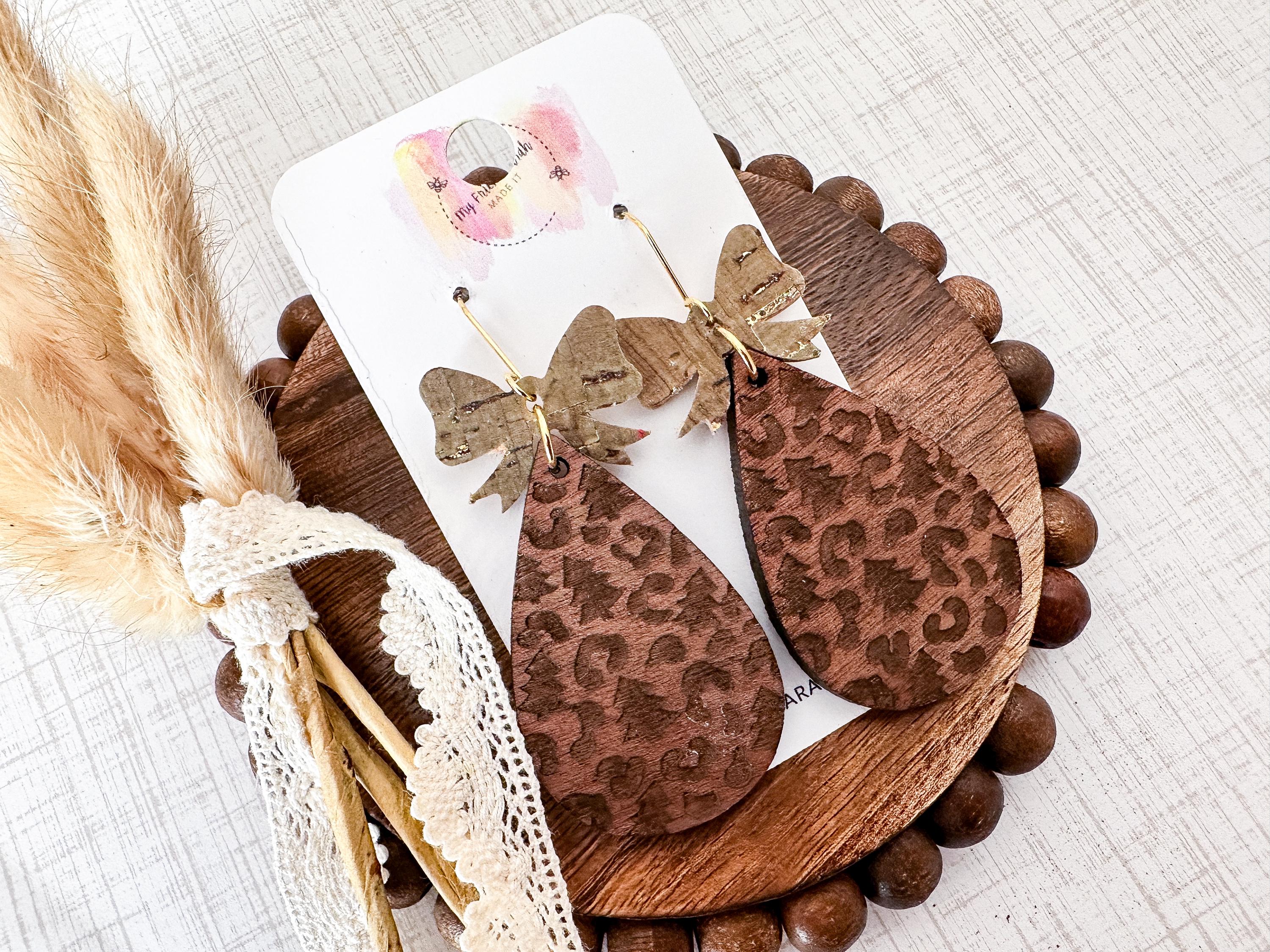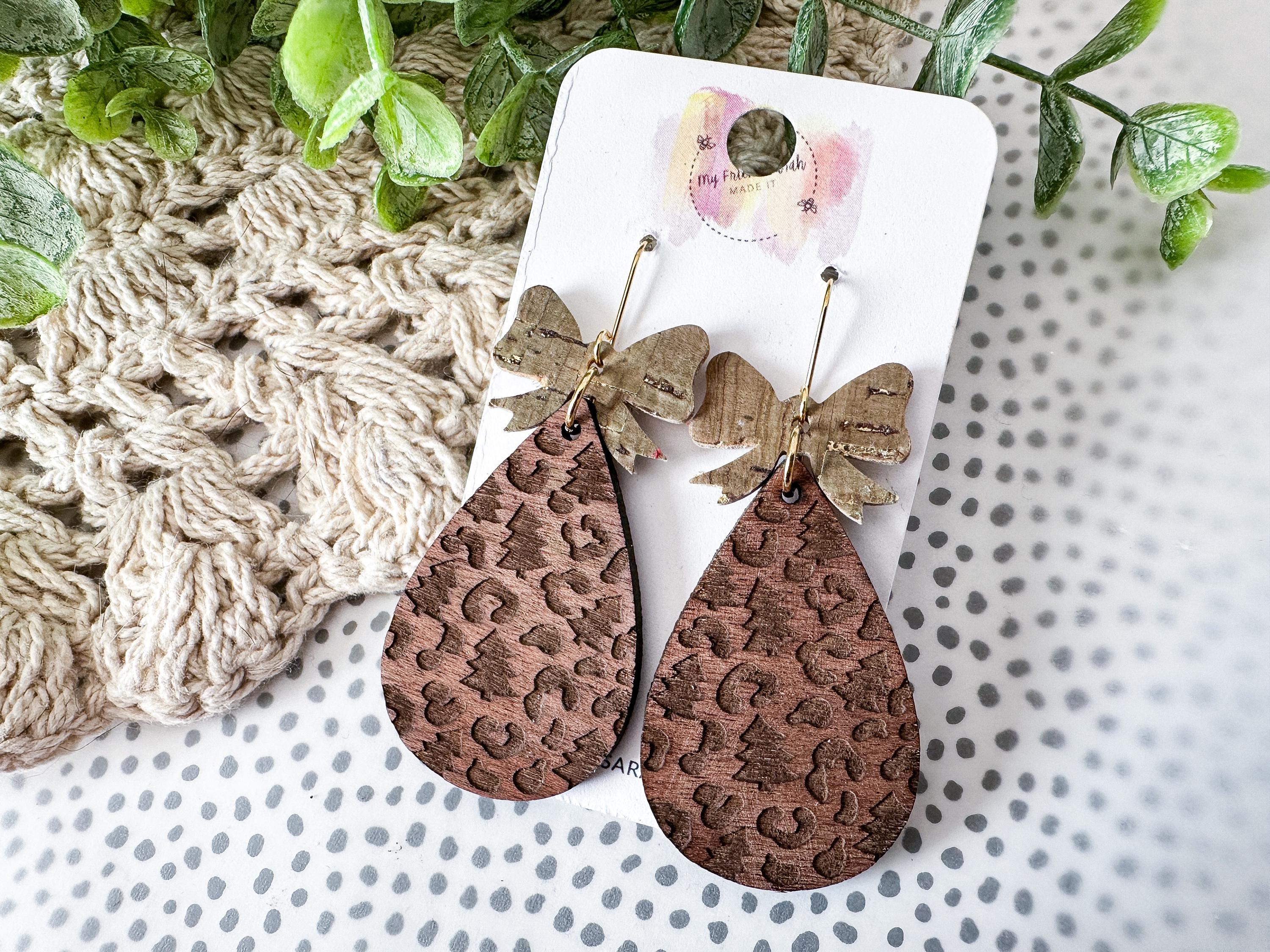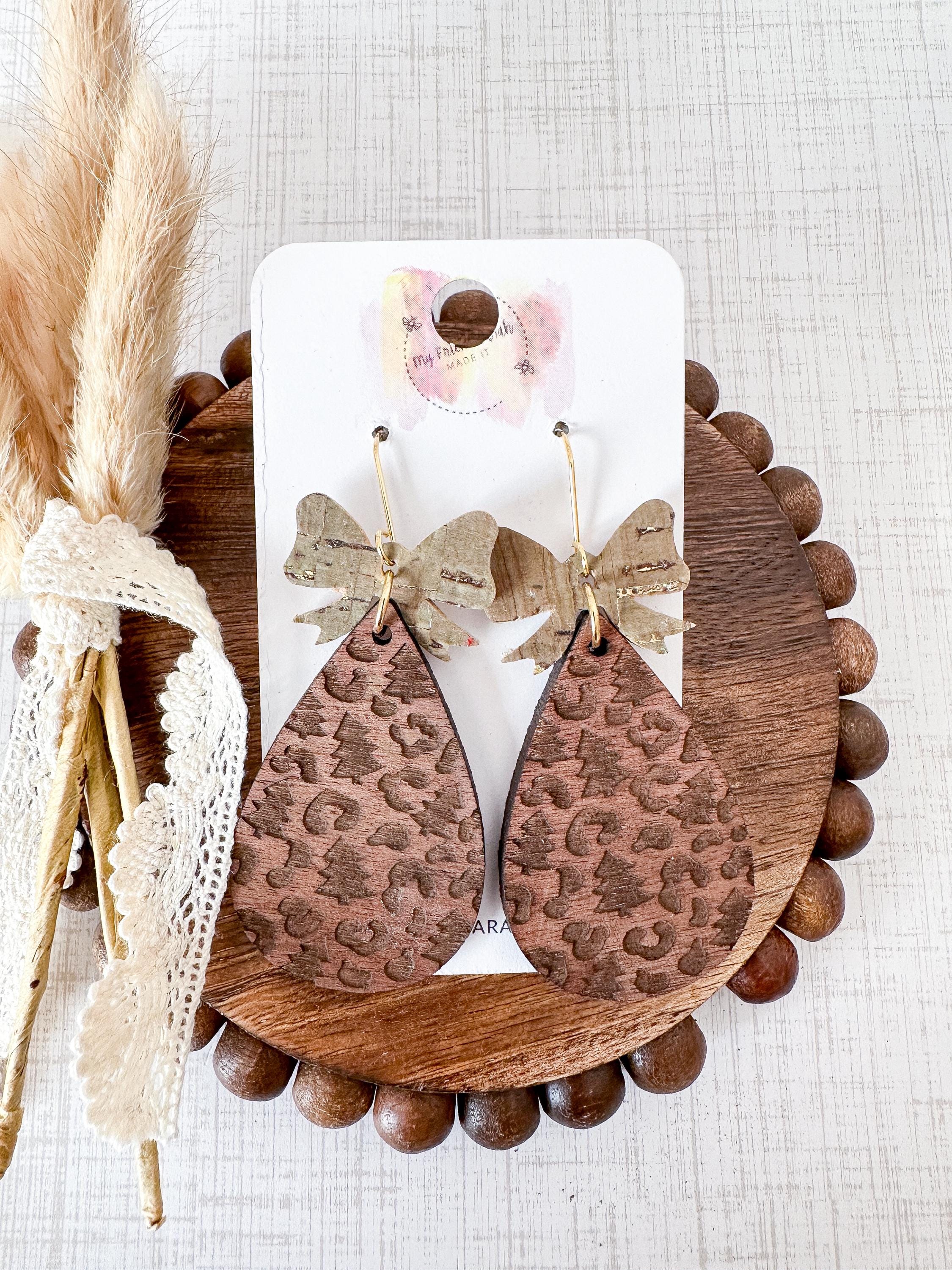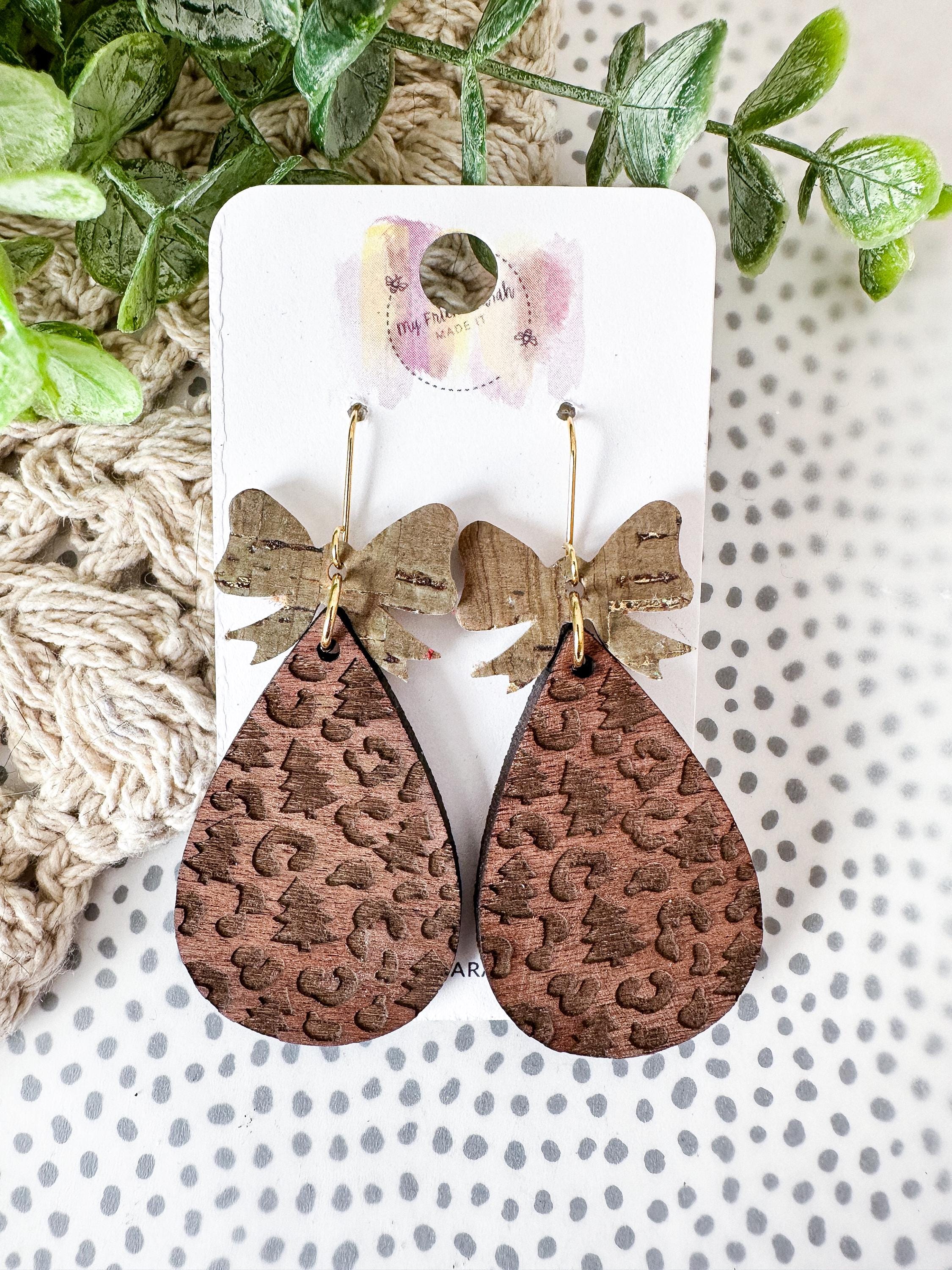 Rustic meets refined in these holiday-perfect earrings. The warm wood teardrops are engraved with a mix of Christmas trees and leopard spots, topped with bows in khaki green cork with metallic gold flecks for a festive shimmer that works all season long.