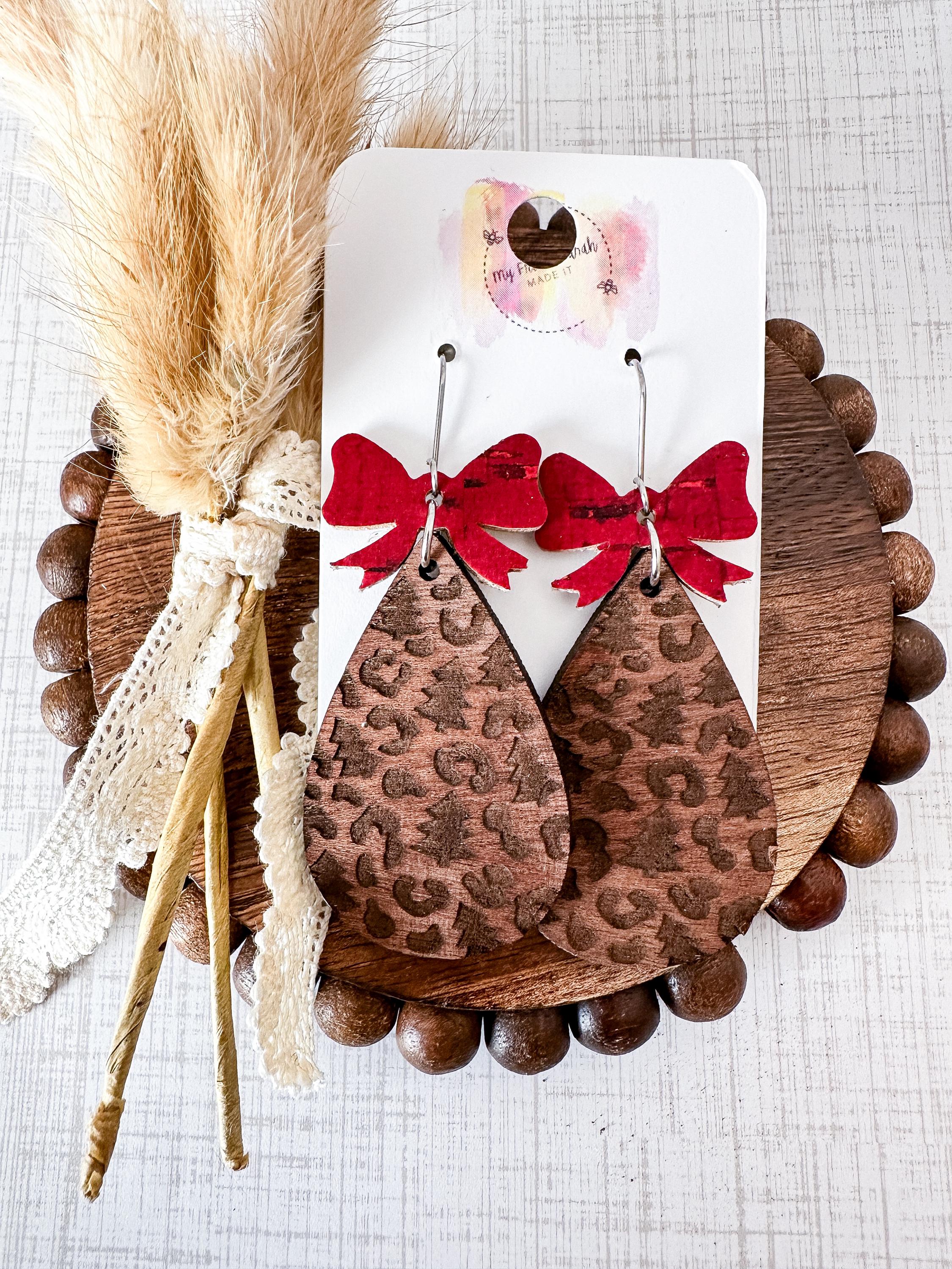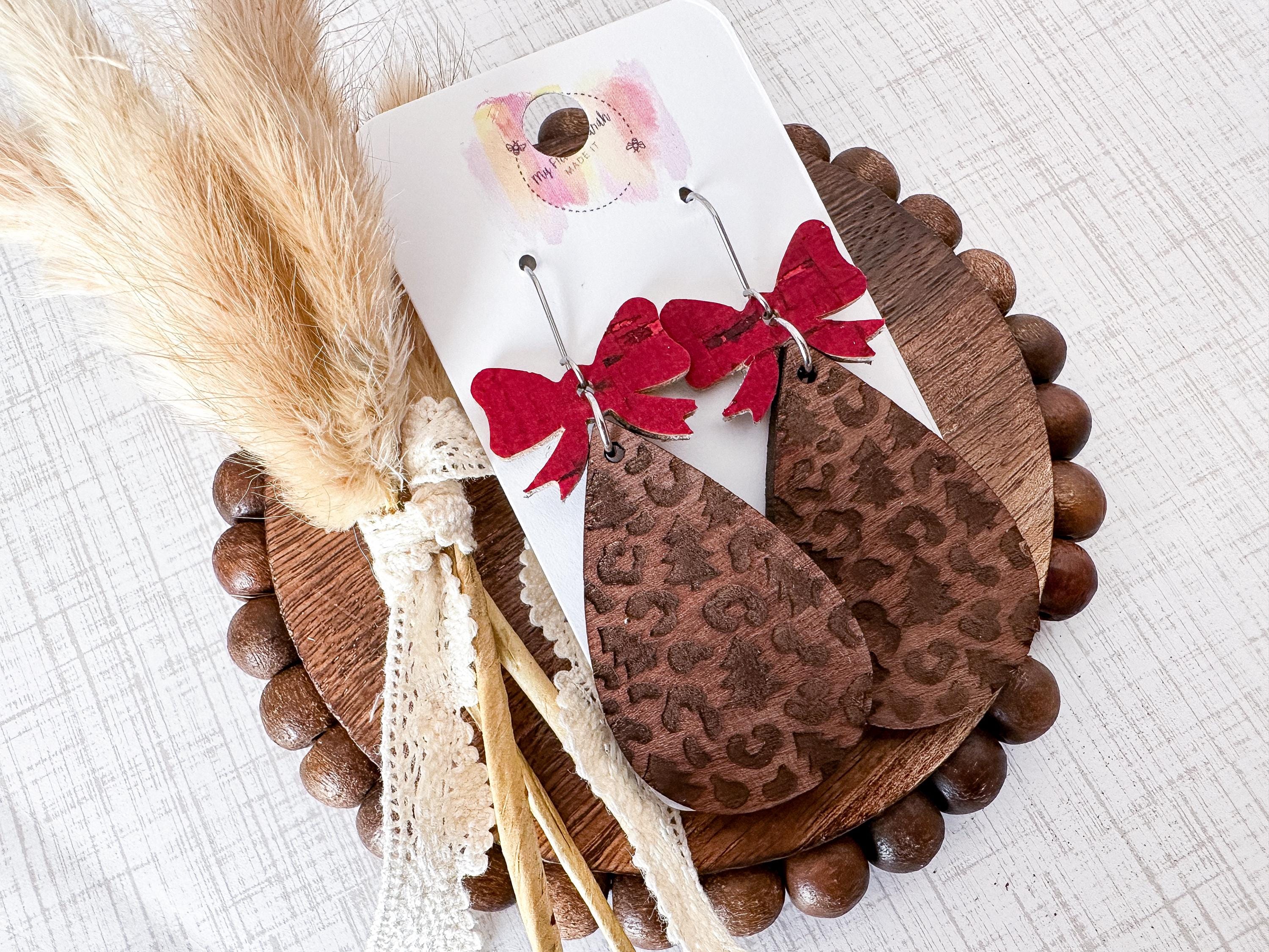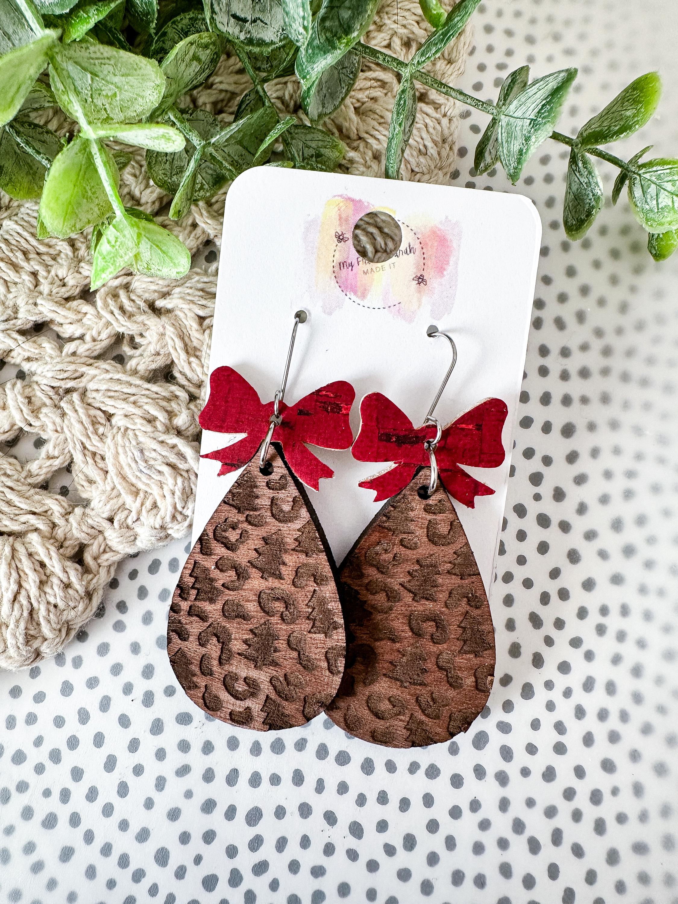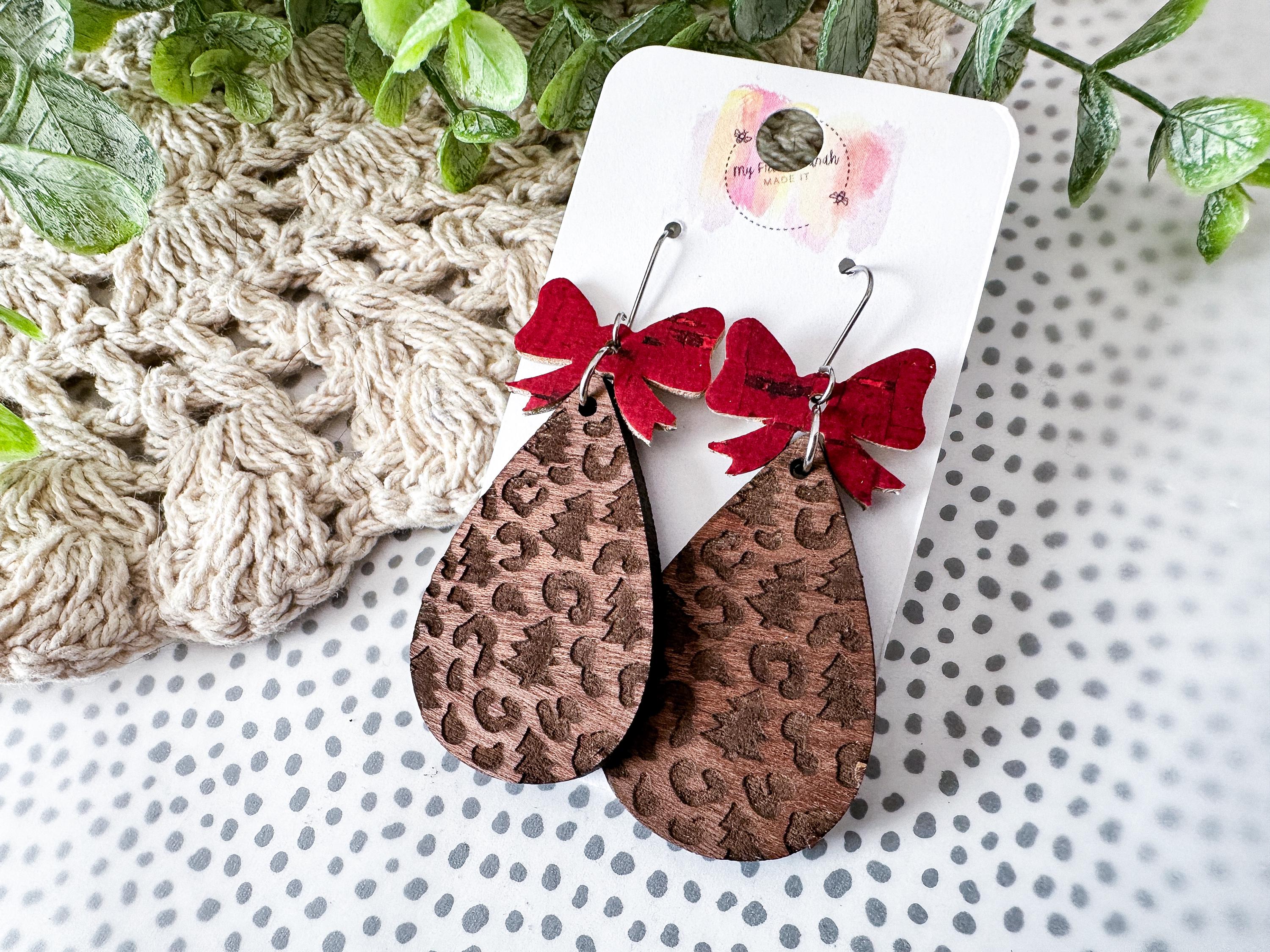 Classic Christmas red meets cozy wood texture in these handmade holiday earrings. The mix of leopard and tree etching adds a subtle twist to your seasonal style: bold, fun, and ready to shine.