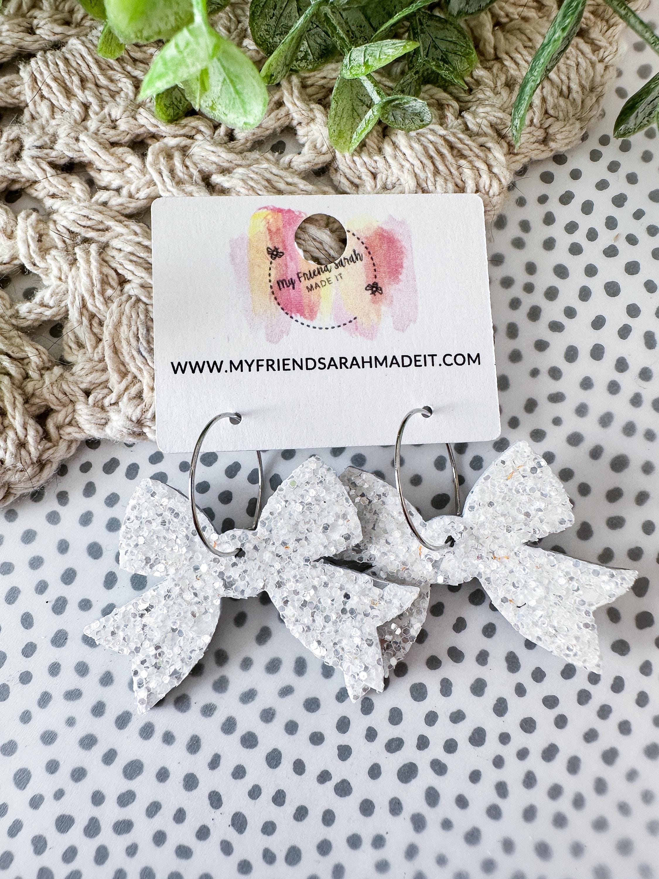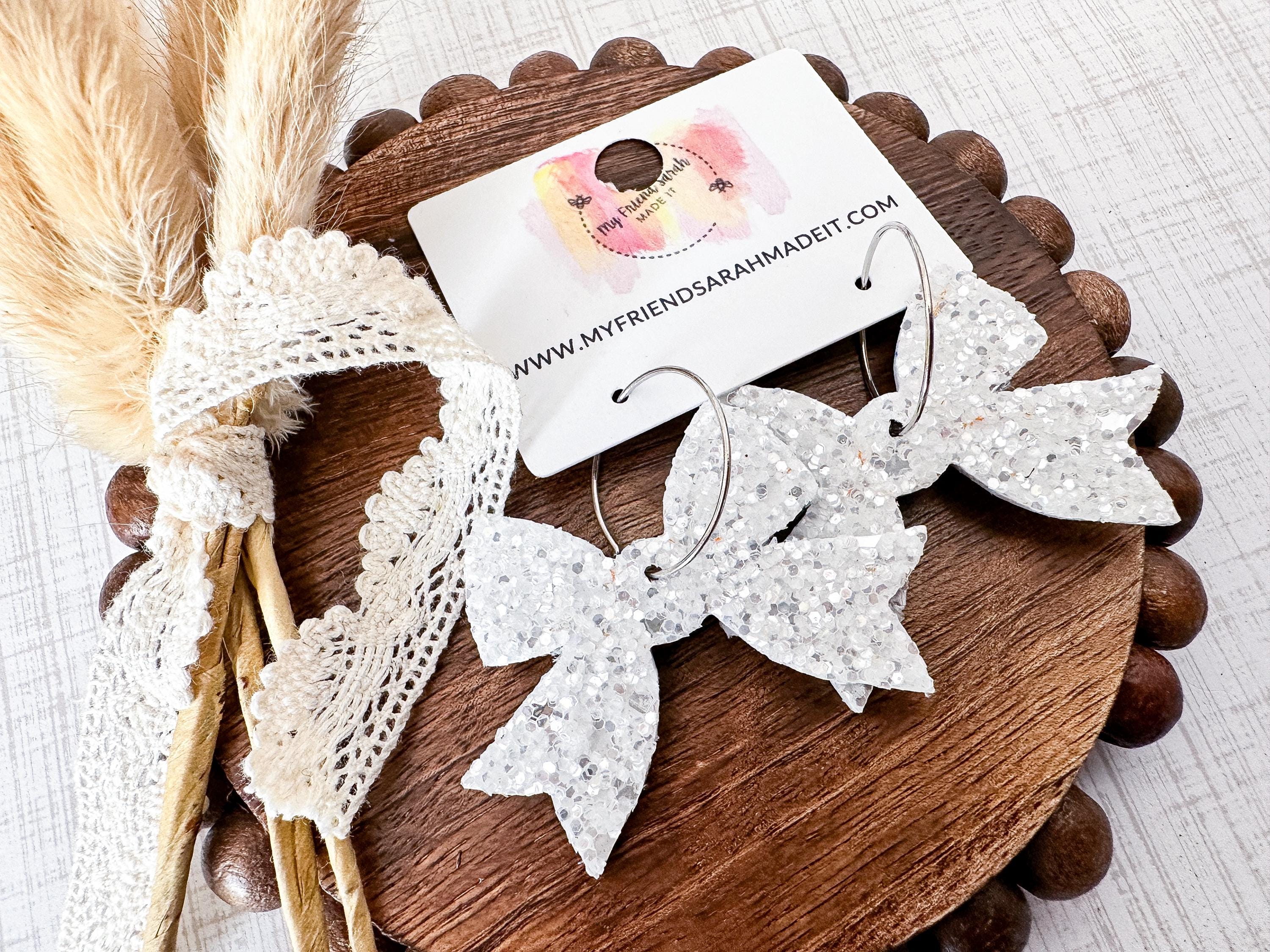A winter dream come true. These shimmering white bow earrings catch the light beautifully, adding a frosty sparkle that feels festive but still timeless.