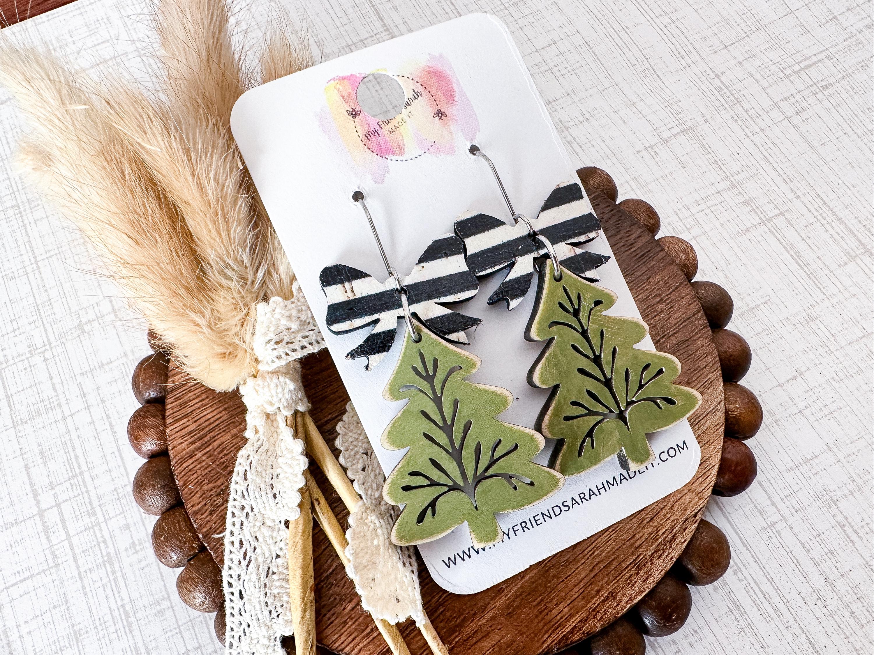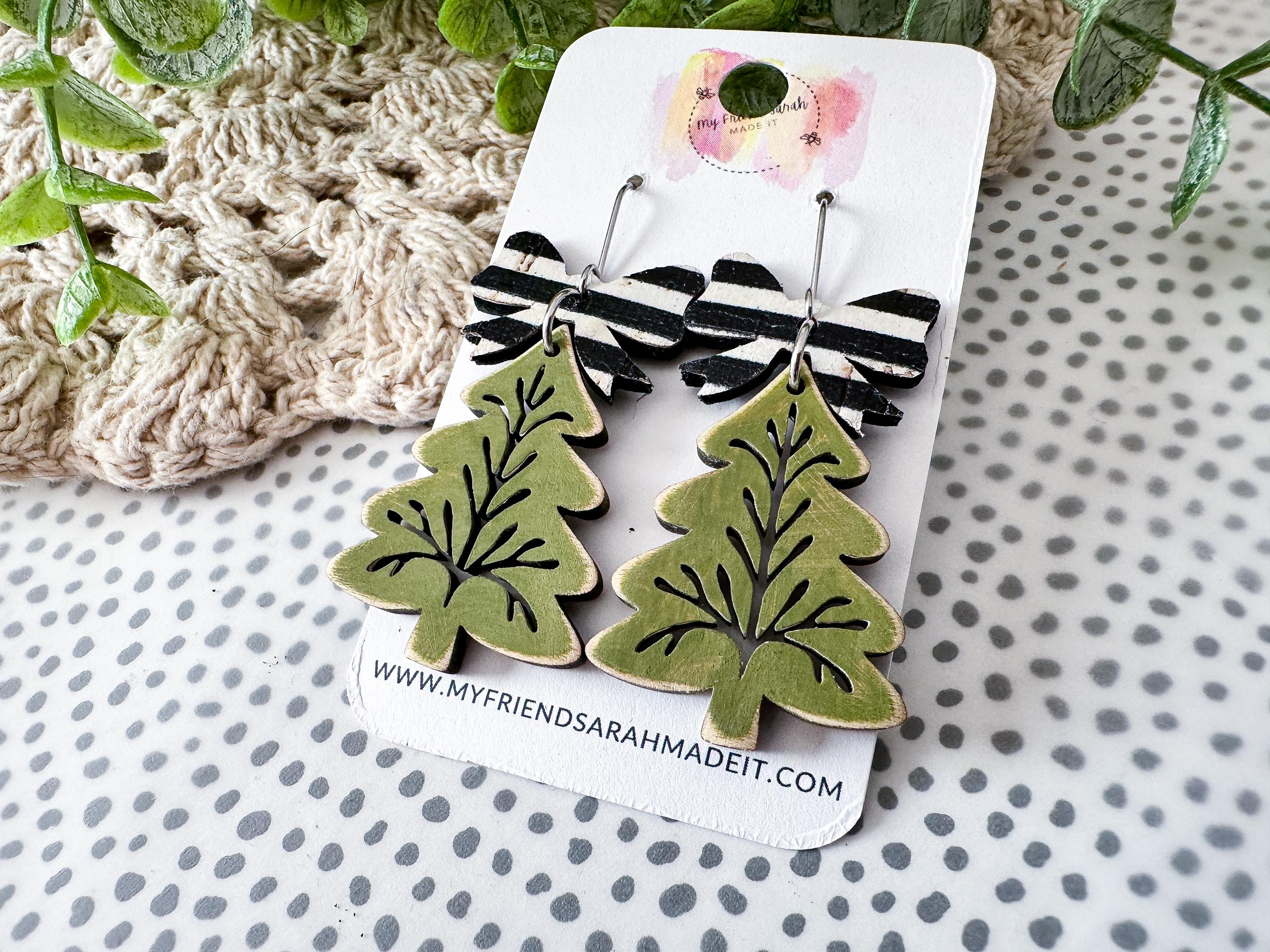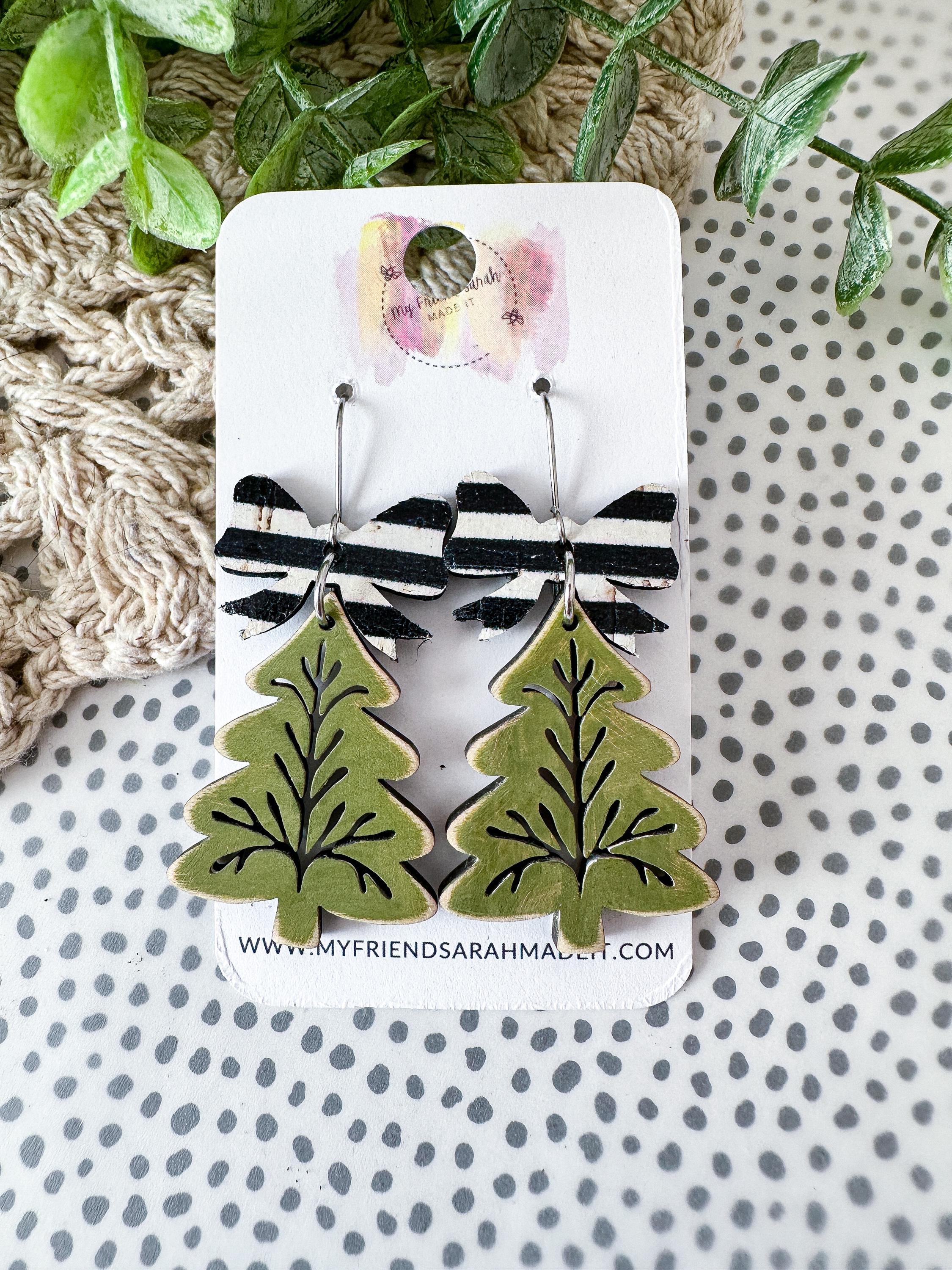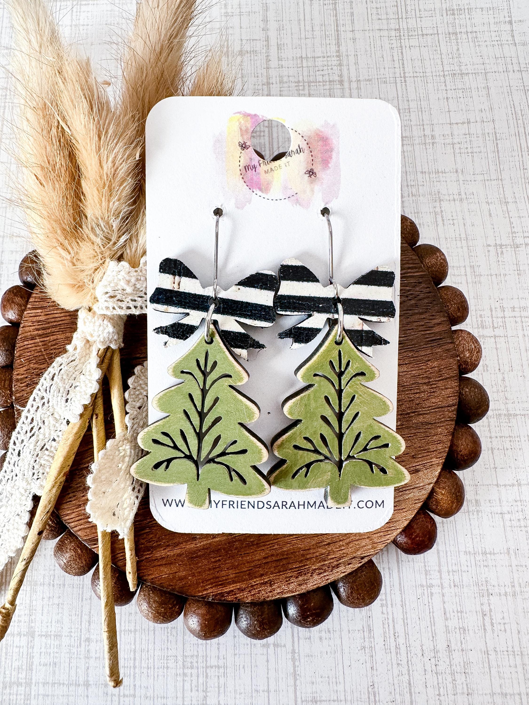 A festive twist on classic holiday style! These green wooden tree earrings feature delicate etched details and a bold striped cork bow thatβs merry, bright, and lightweight for all-day wear.