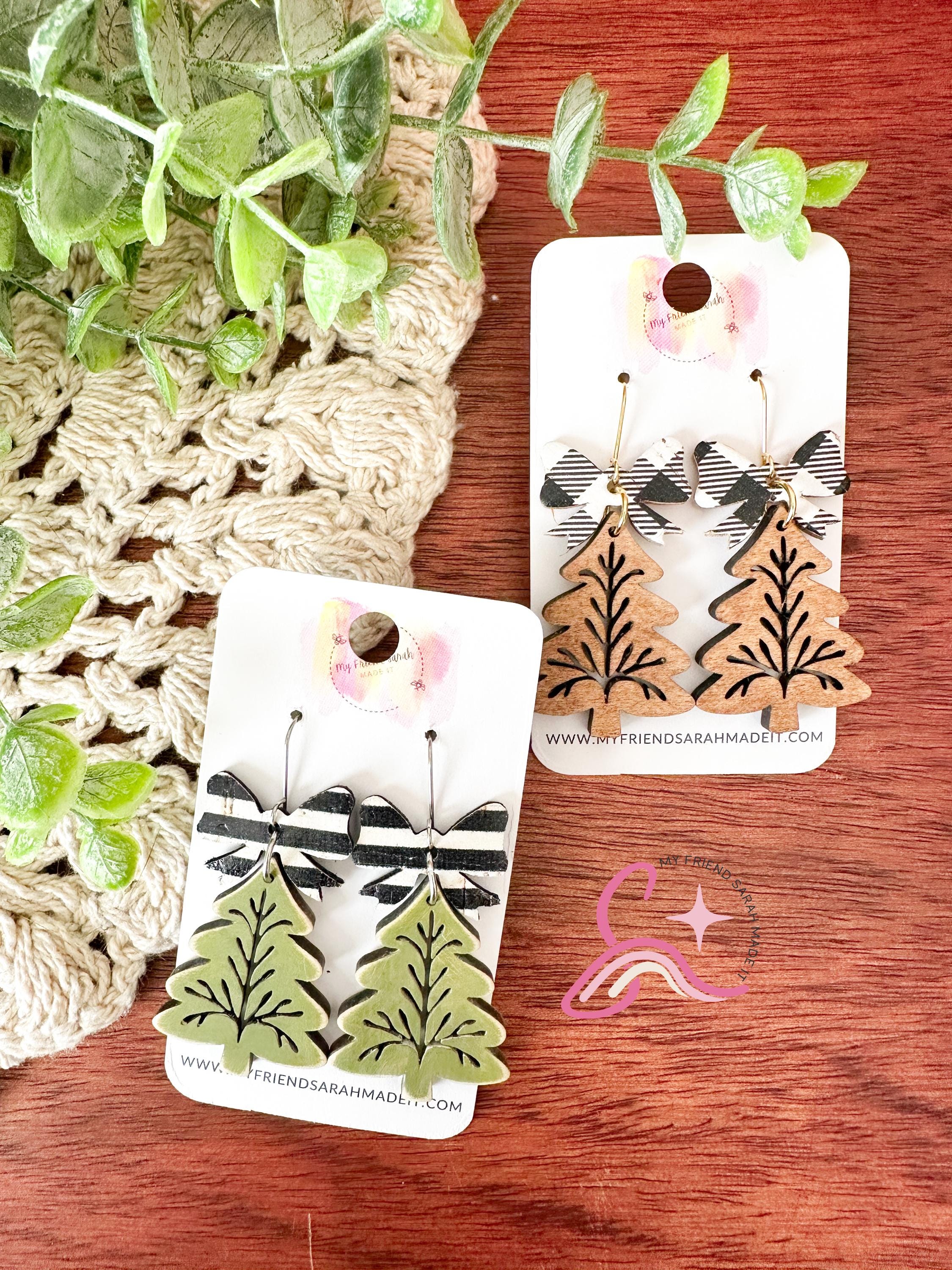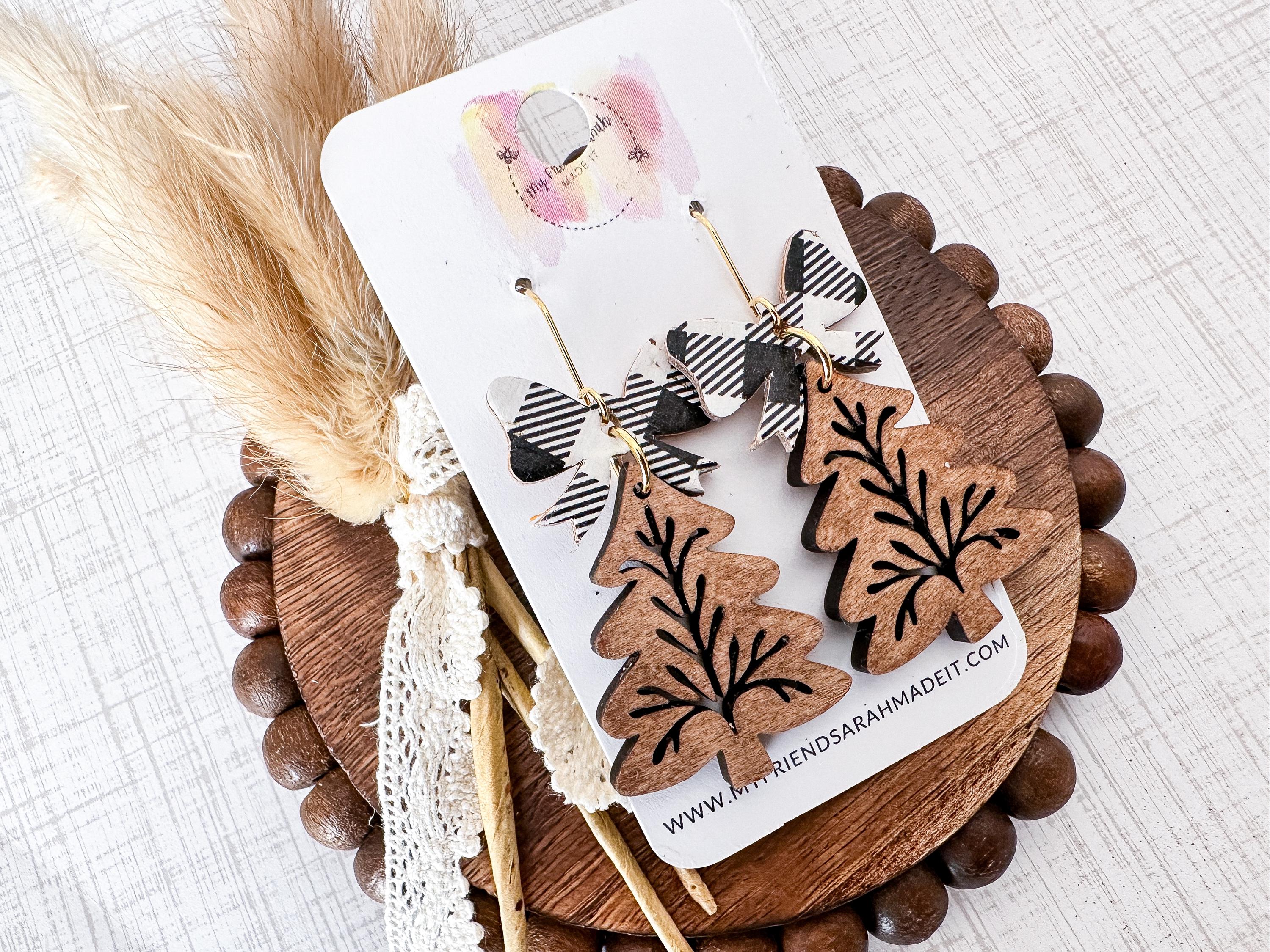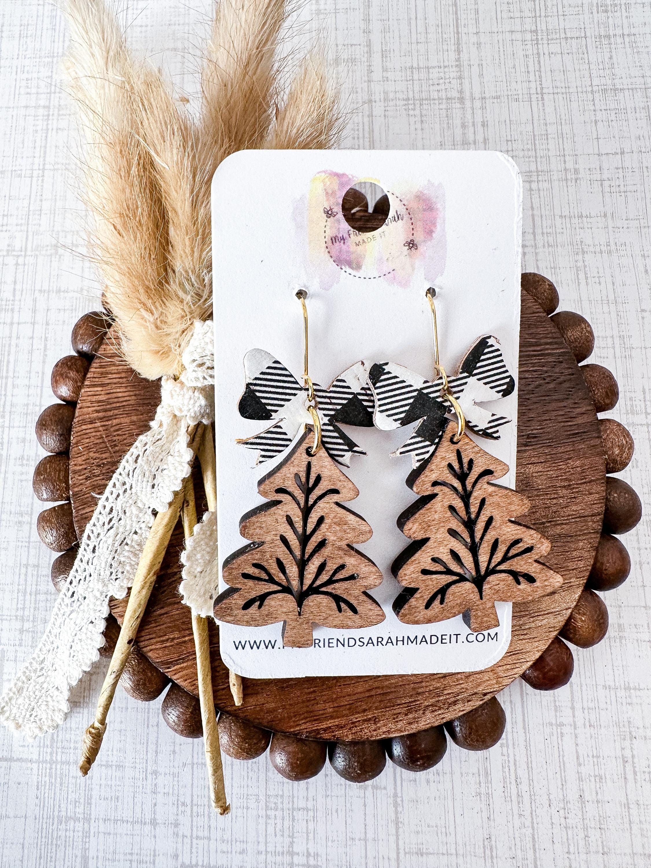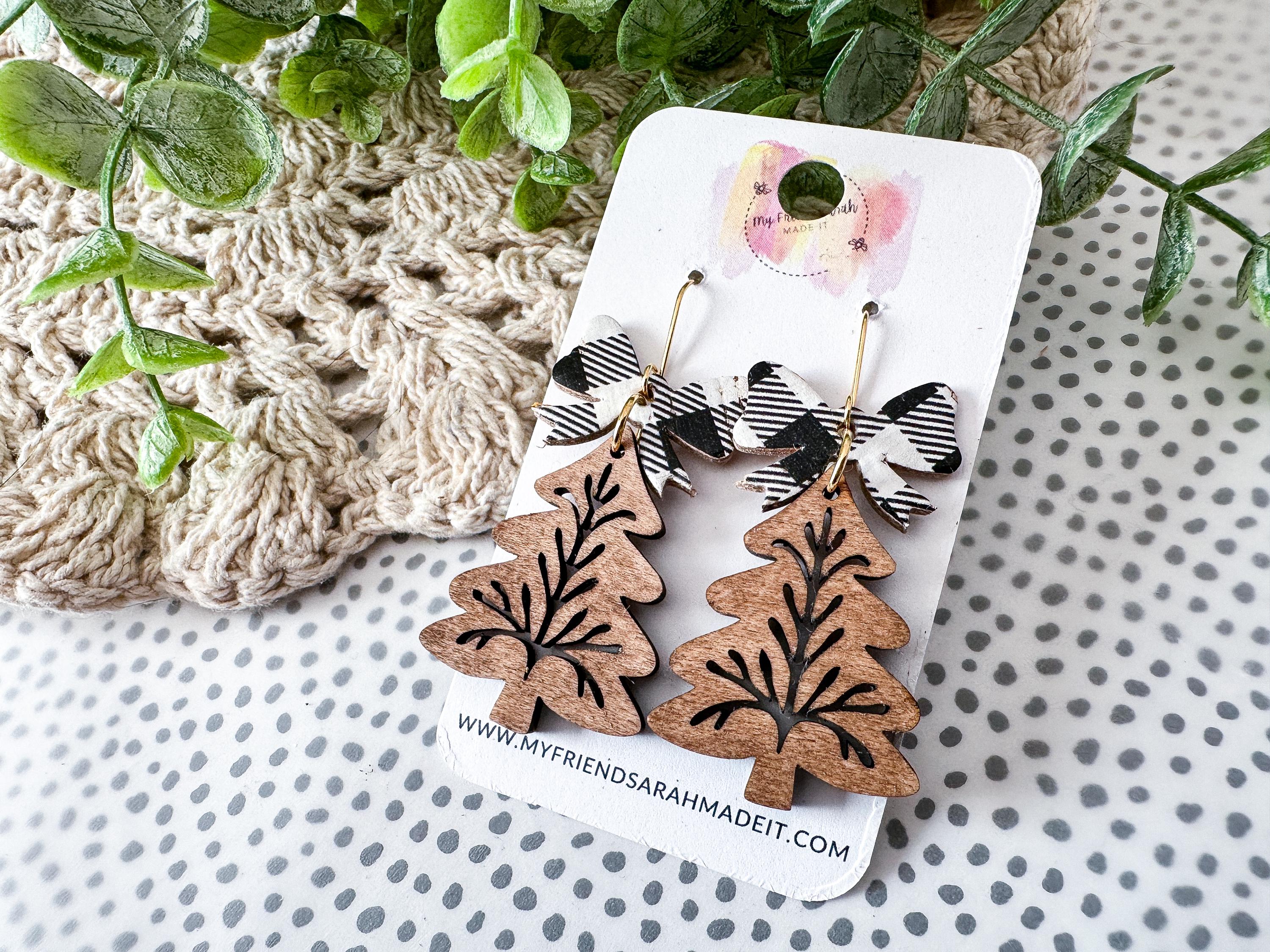 Rustic charm meets modern style in these handcrafted wooden tree earrings. Each pair is laser cut, hand-painted, and finished with a black-and-white gingham cork bow for a playful holiday touch.