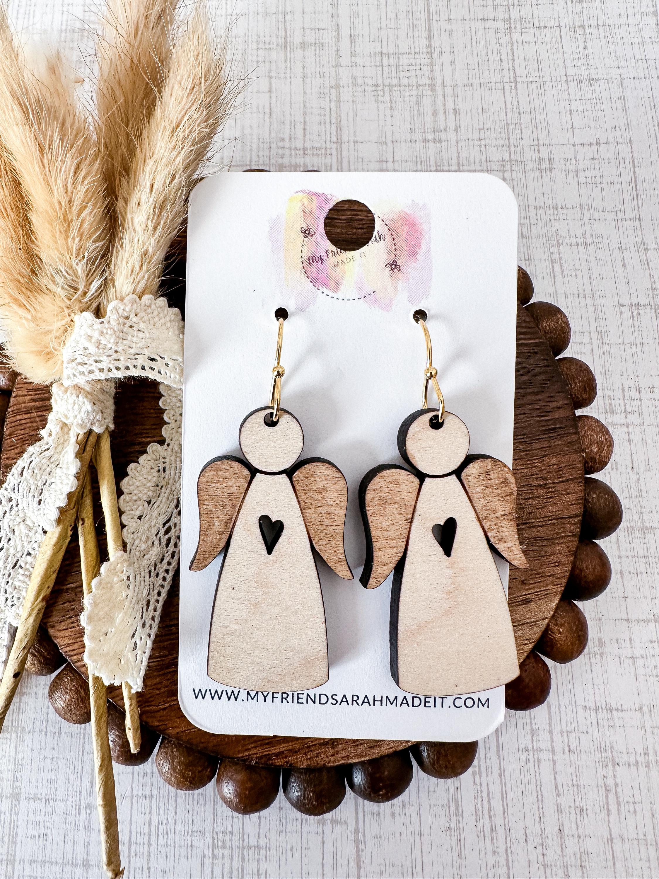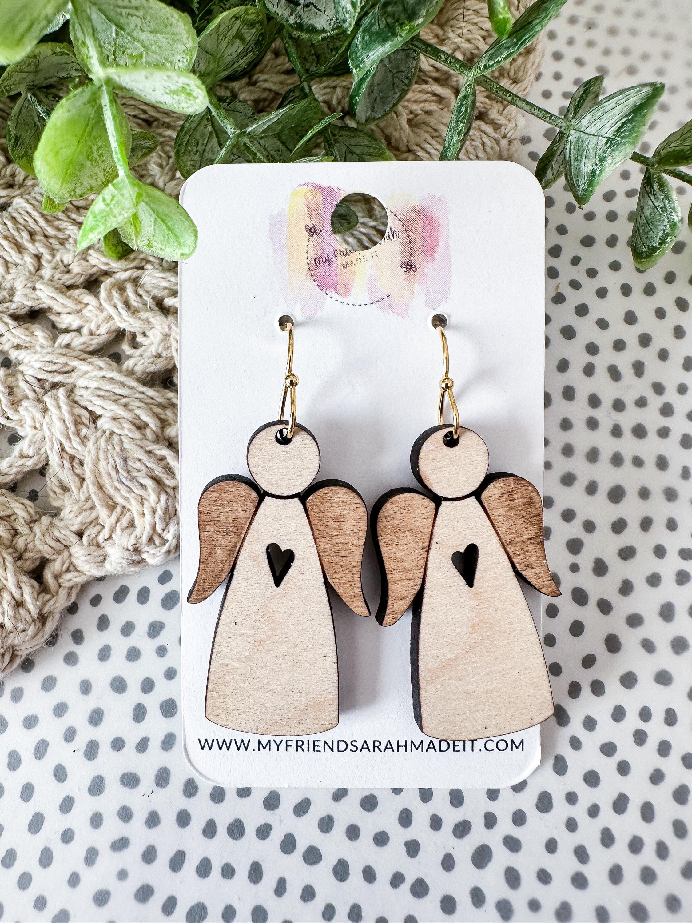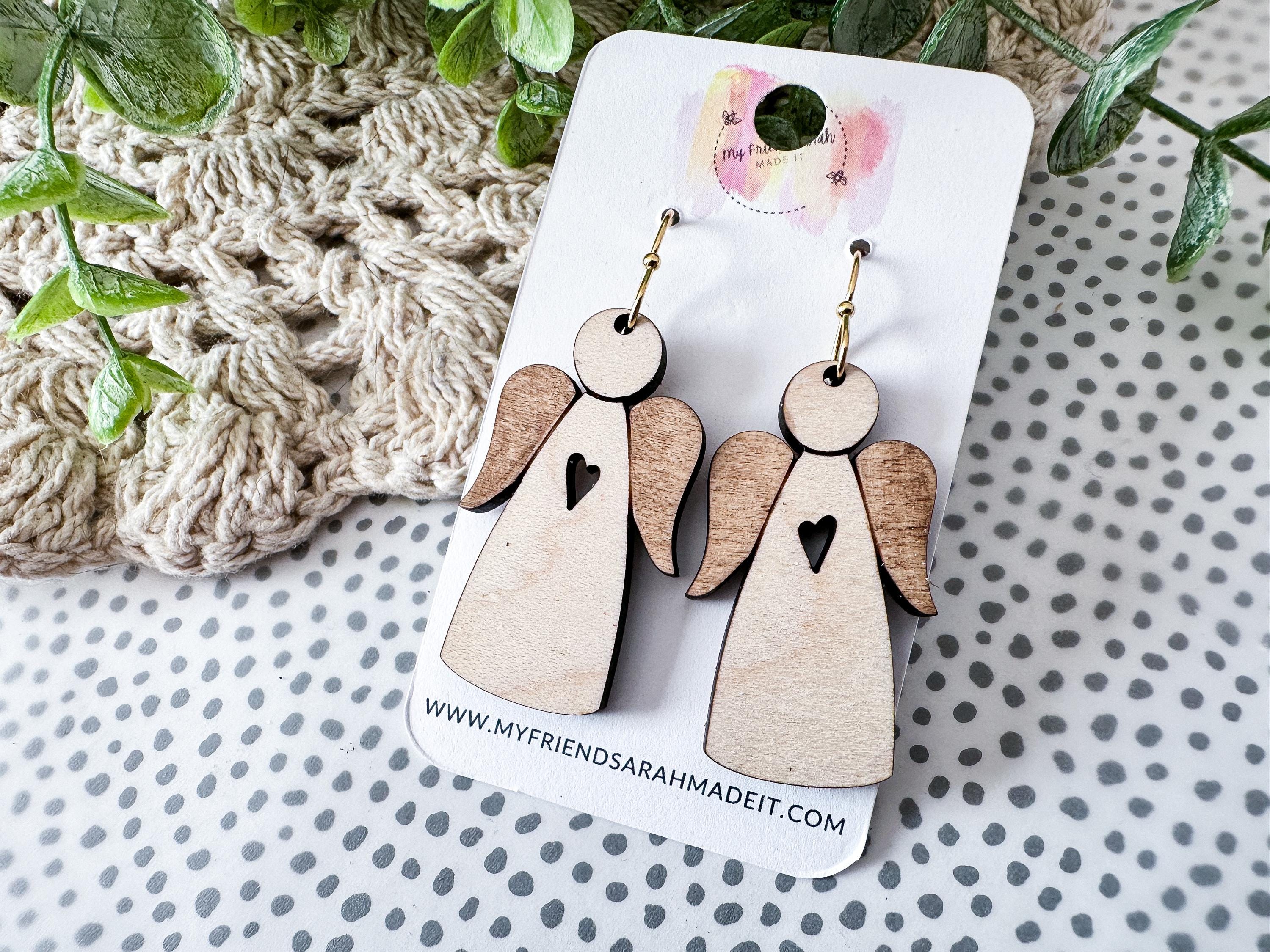 Minimal, meaningful, and beautifully crafted. These hand-stained wooden angel earrings feature a small heart cutout; a timeless symbol of love for the season and beyond.