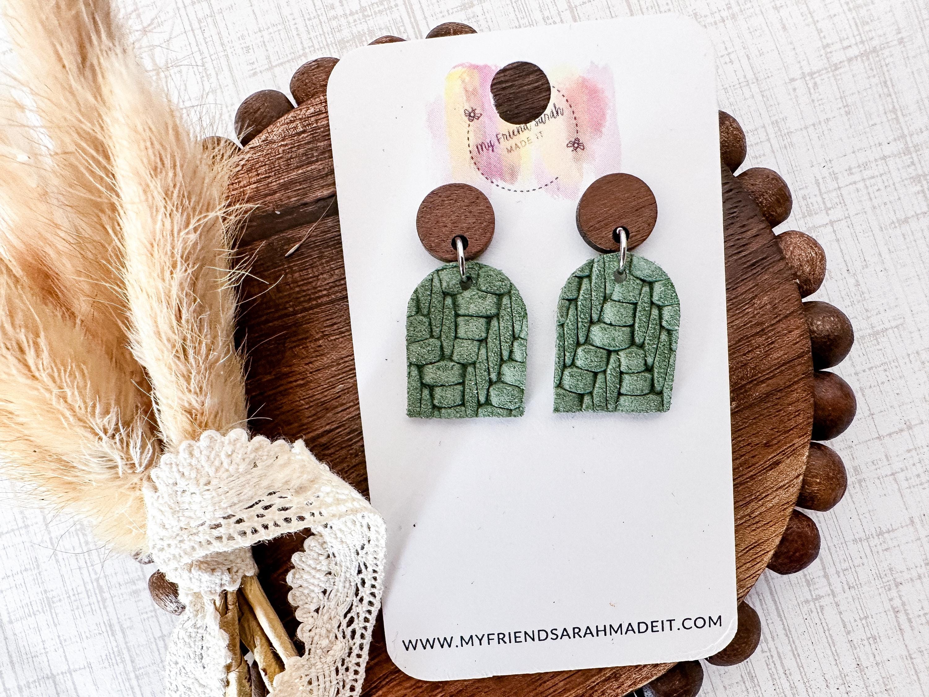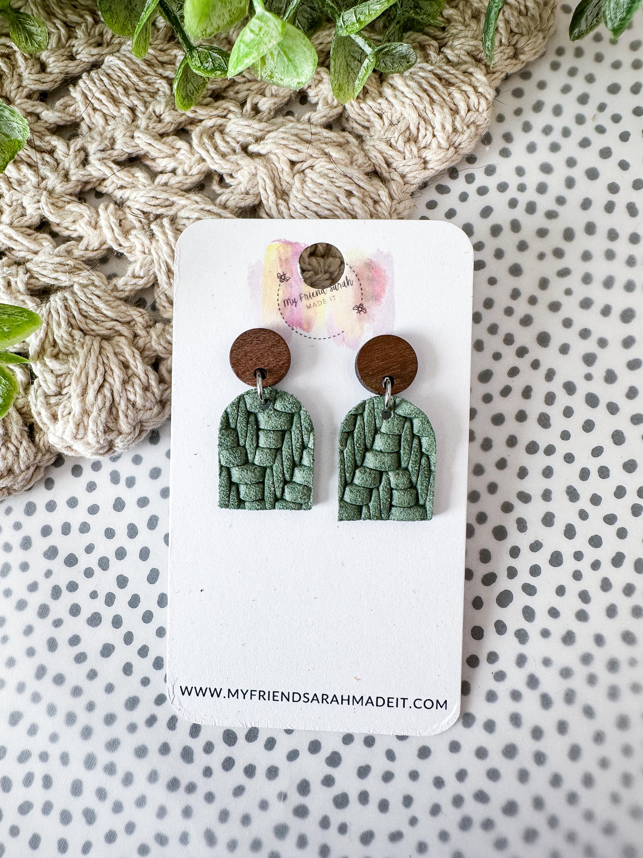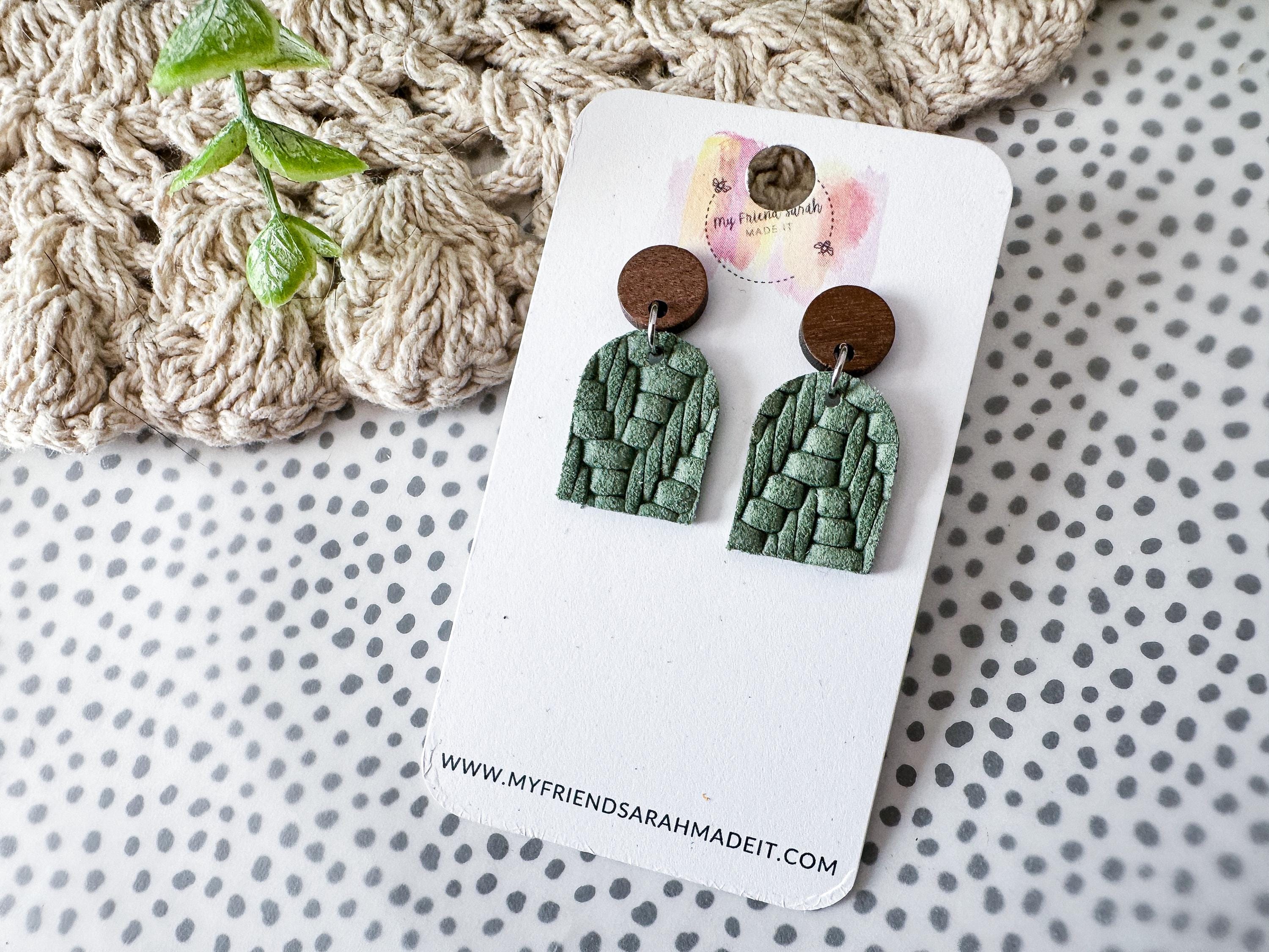 Soft green leather with a woven look brings subtle texture and calm color to your style. These small arch dangles are topped with wood studs for an earthy, balanced finish.