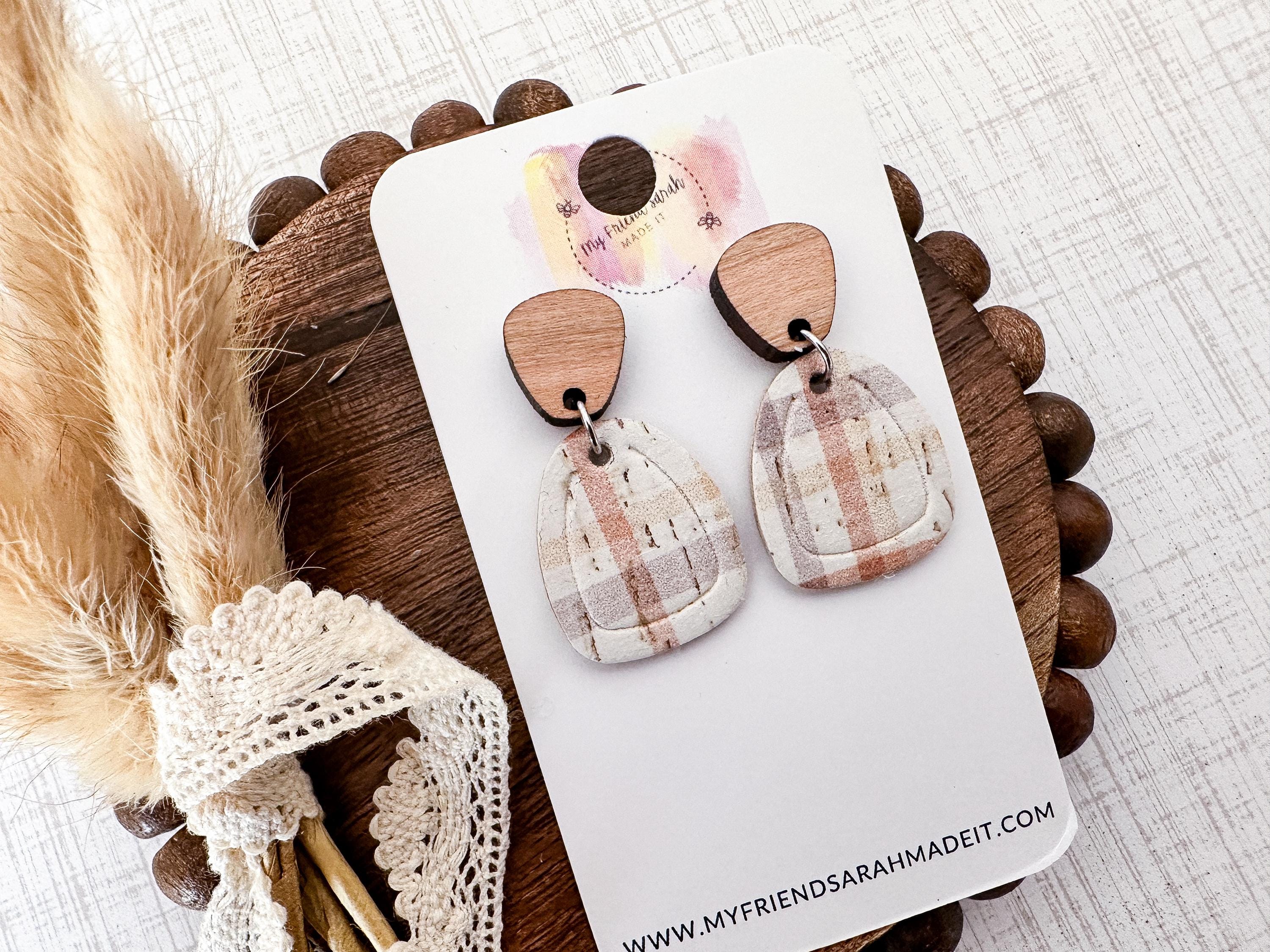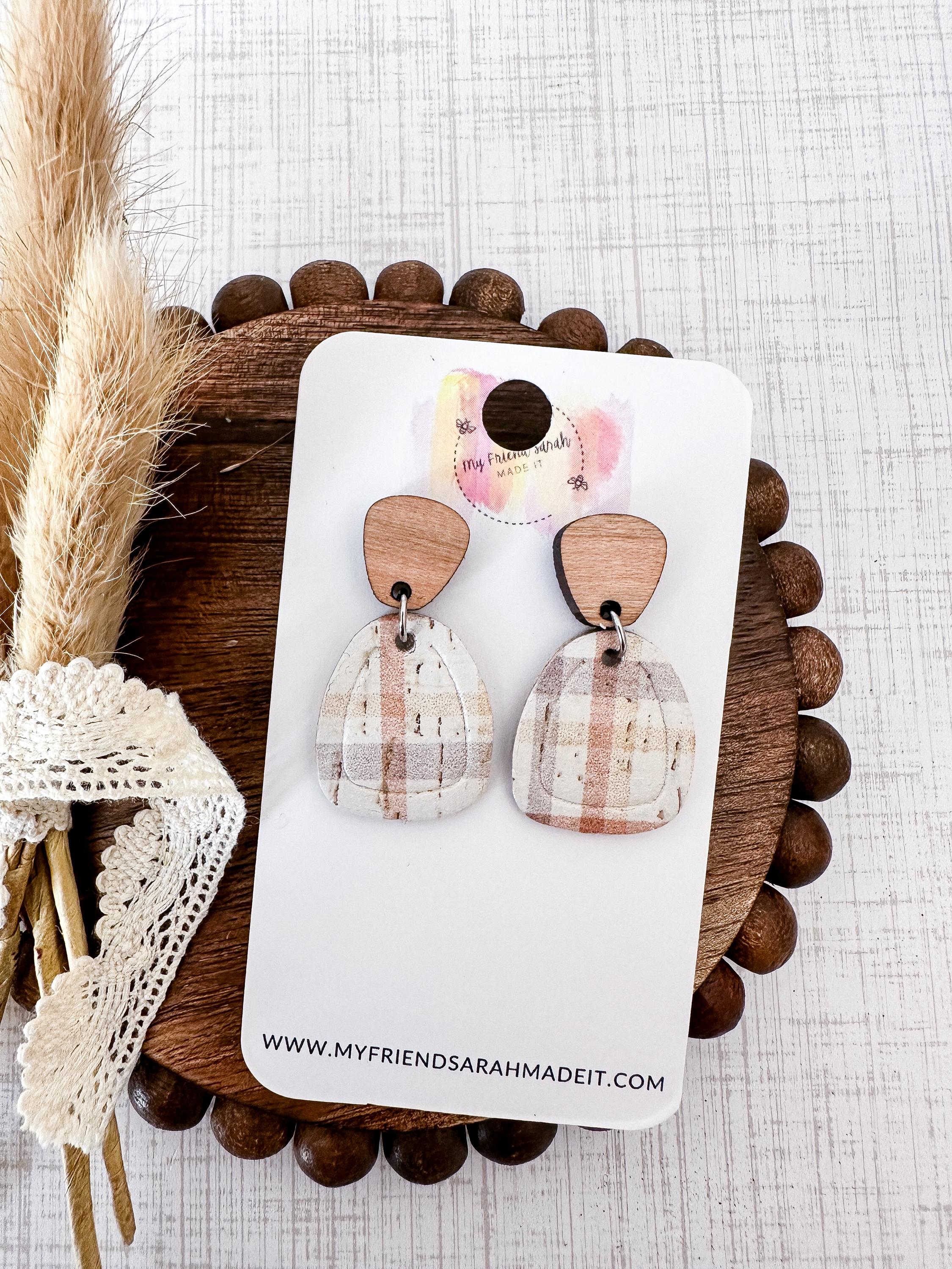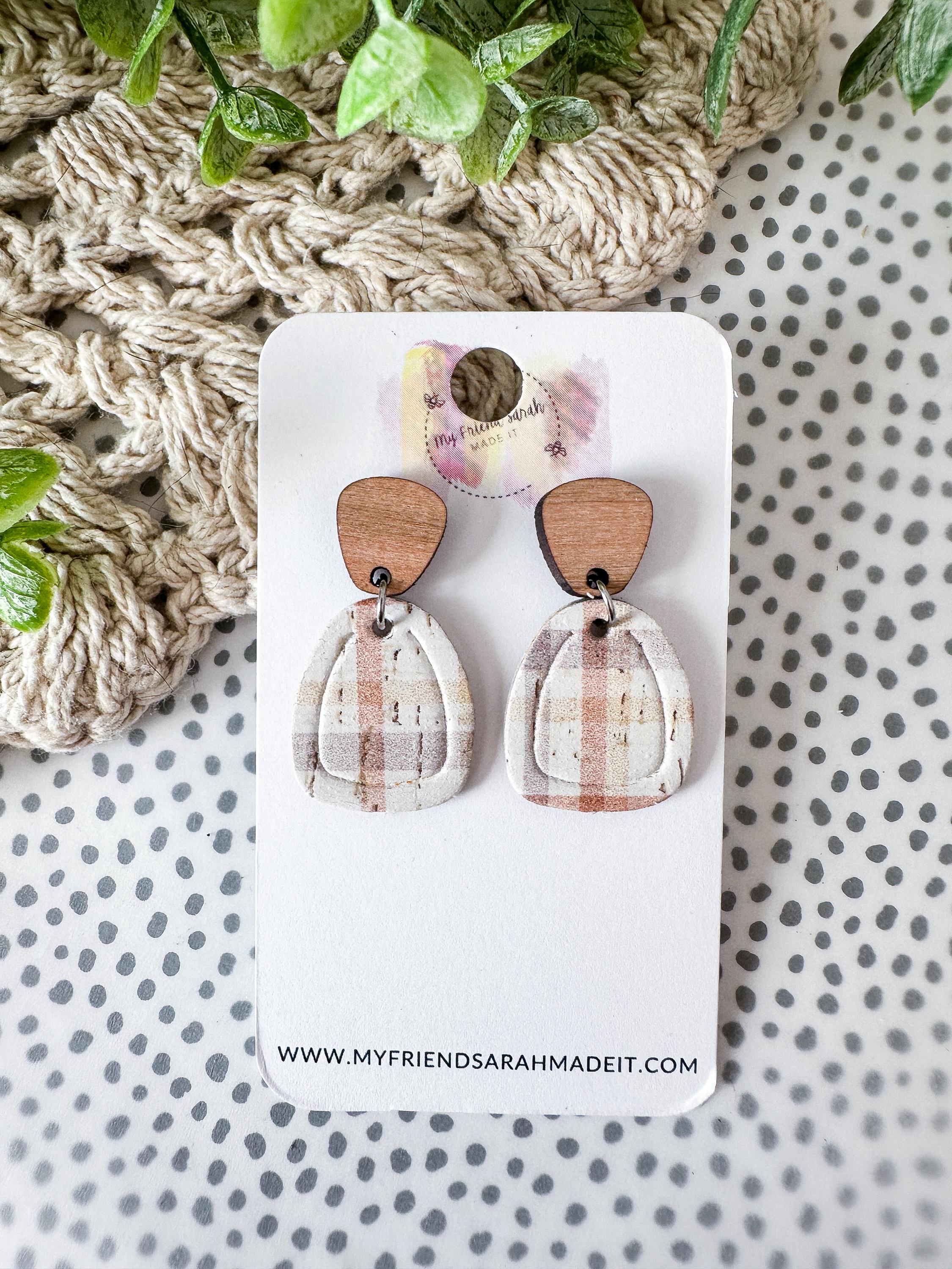 Soft, neutral tones meet classic pattern. These plaid cork earrings are backed with leather for structure and finished with wooden tops - cozy, modern, and effortless.