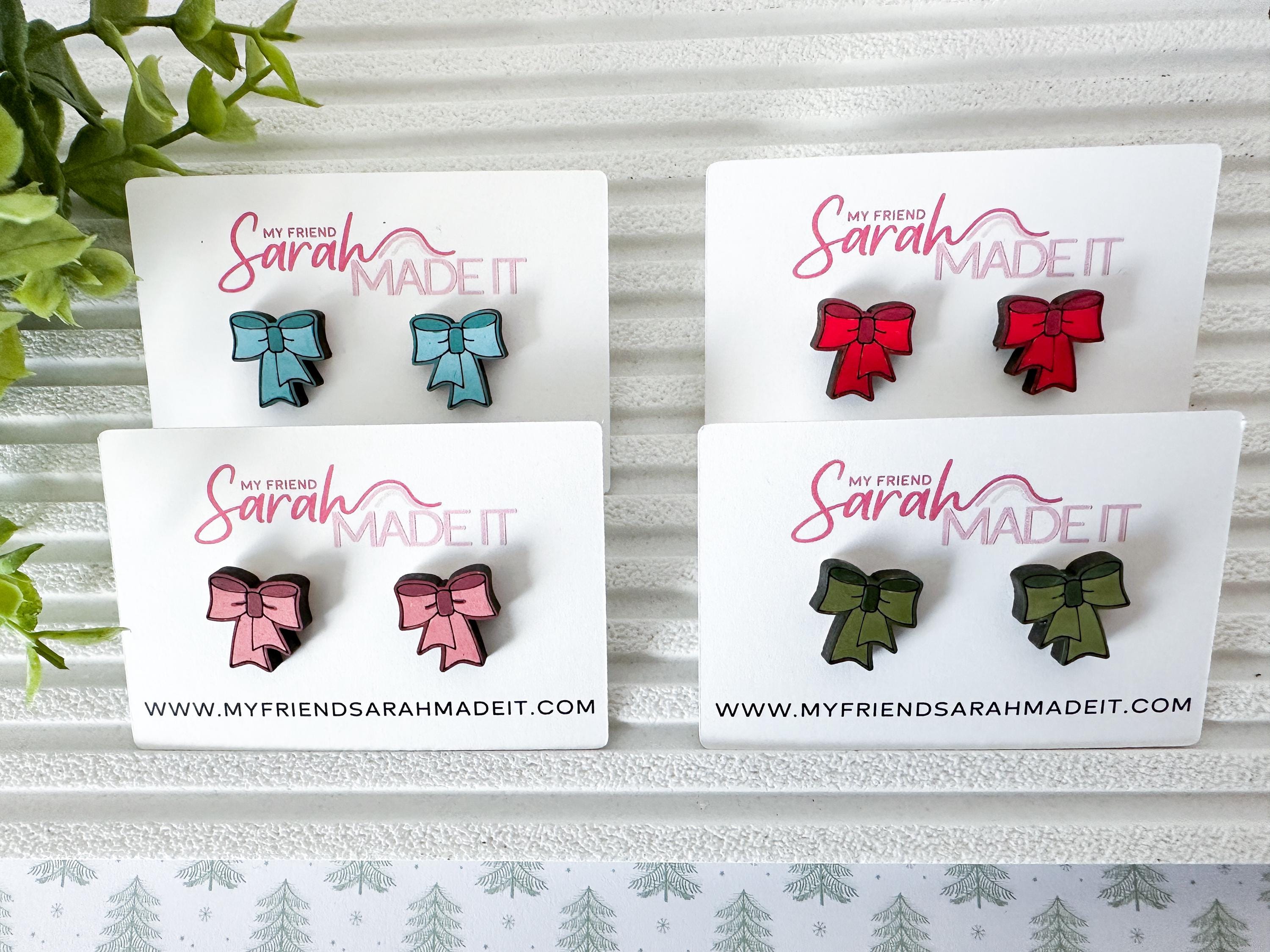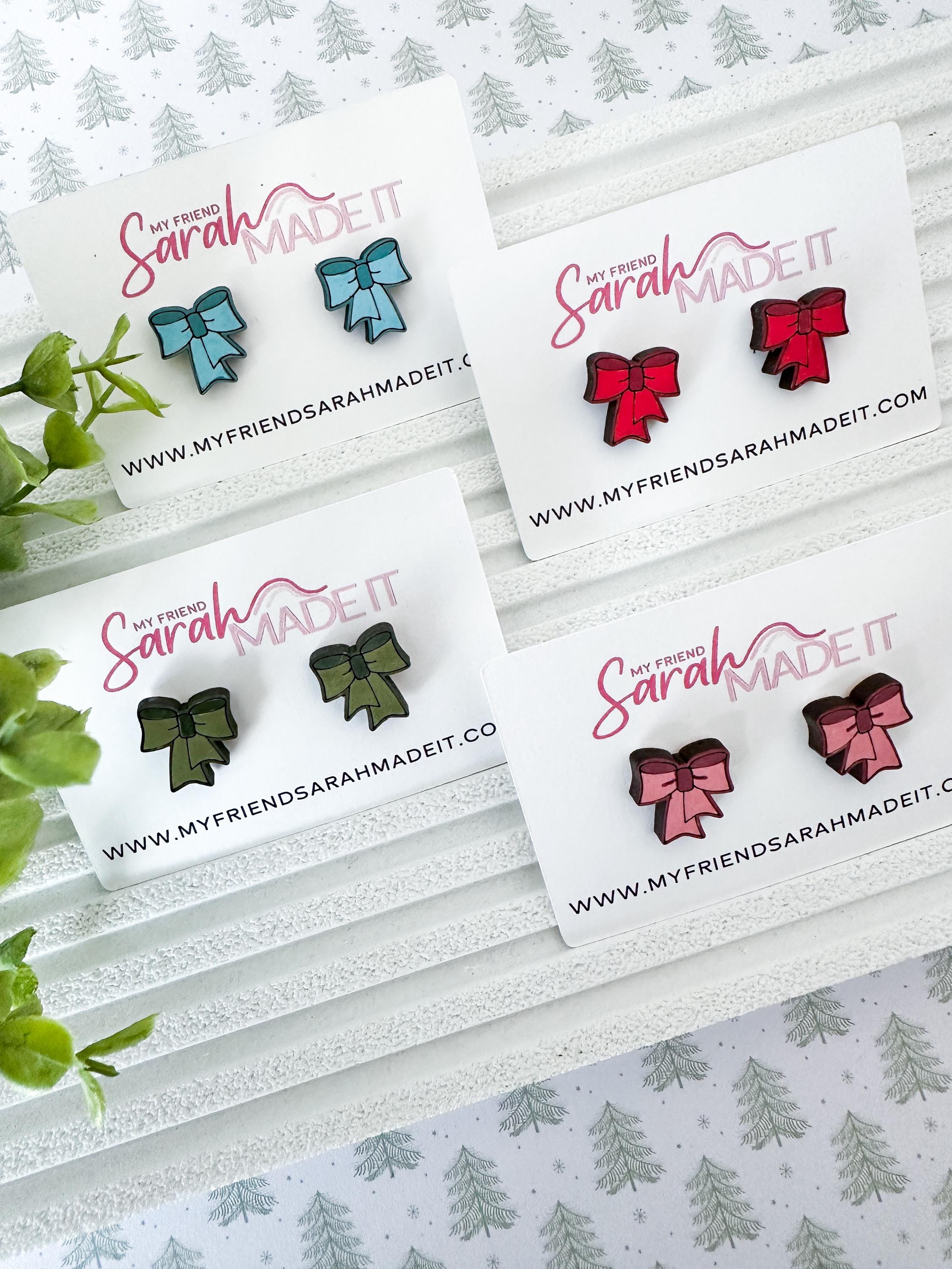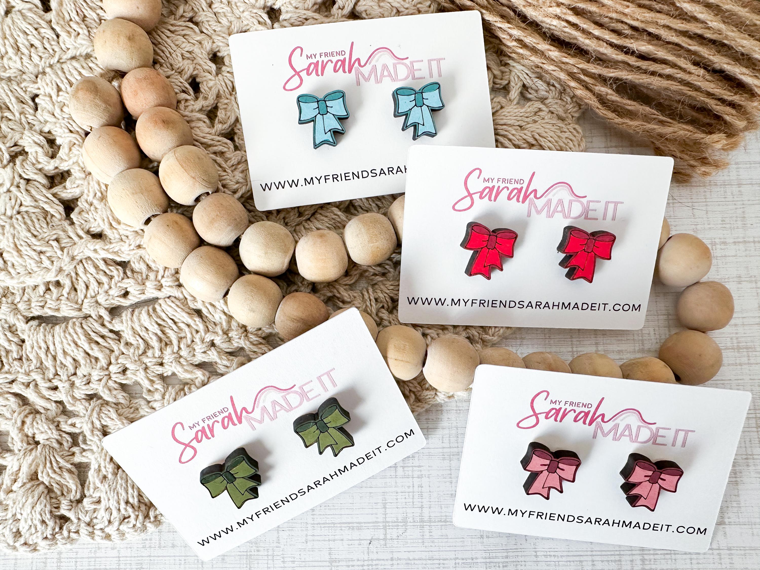 Each pair is laser-cut from lightweight wood, carefully hand-painted, and sealed for a smooth finish. Choose from four festive colors - perfect for the holidays or year-round wear! These tiny bows are full of personality β wear them to holiday parties, festive markets, or anytime you want a dash of cheer!