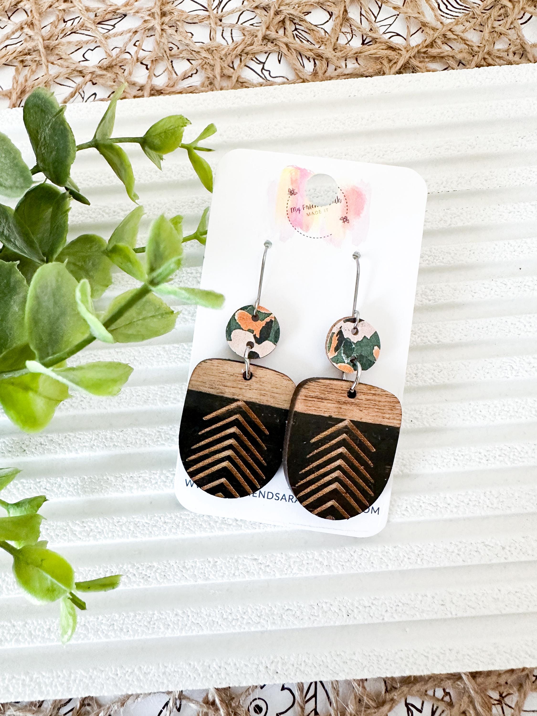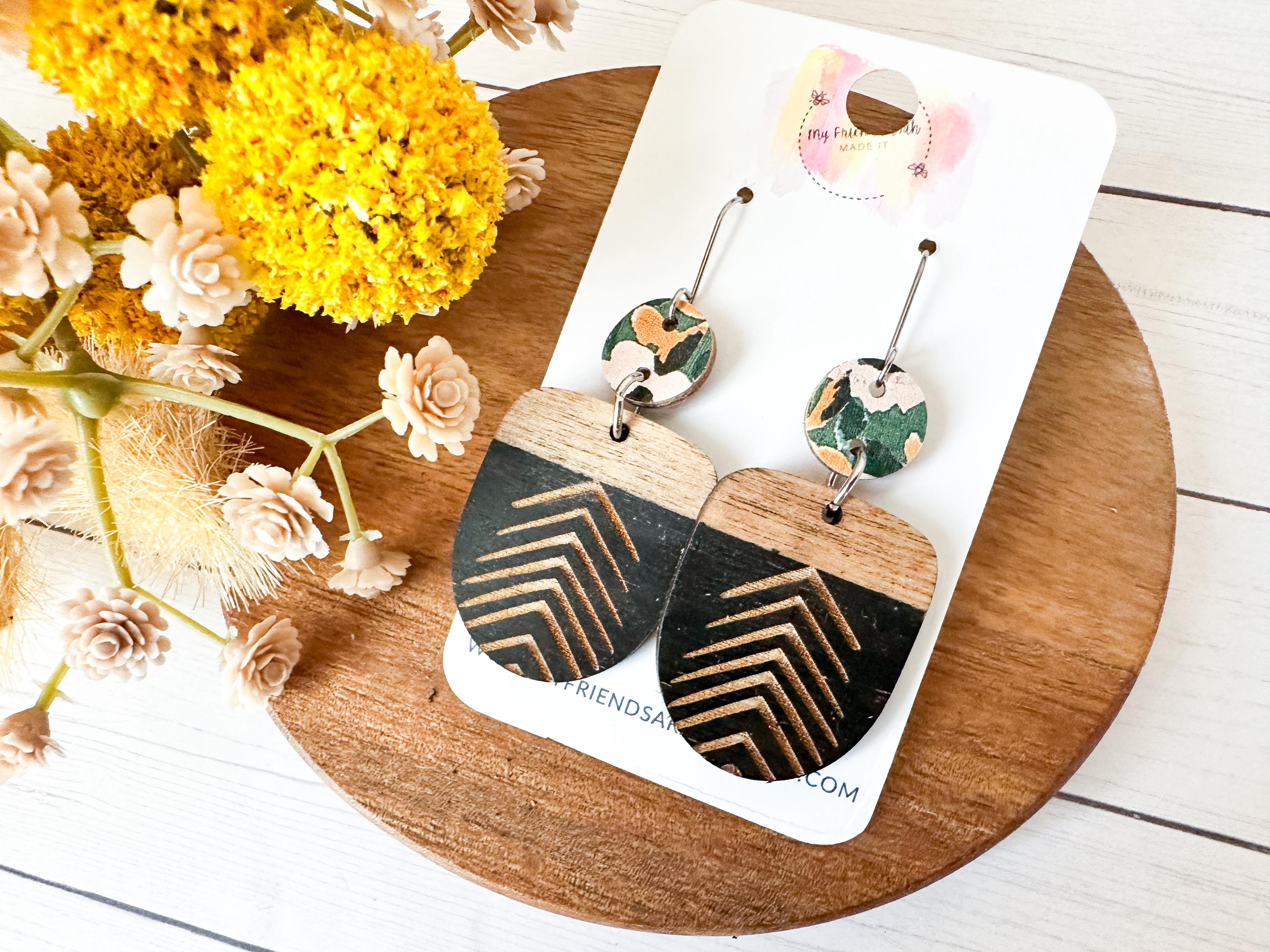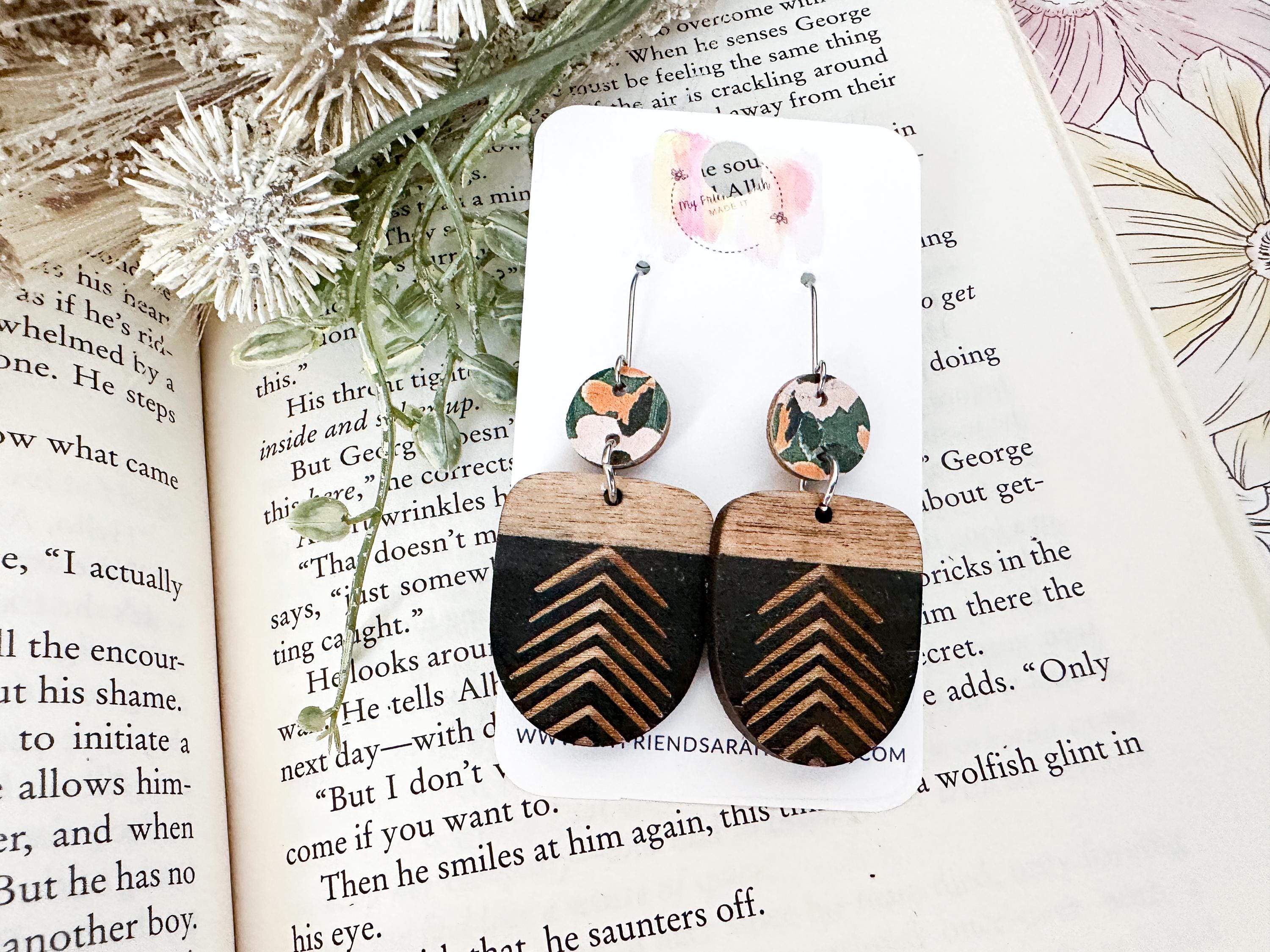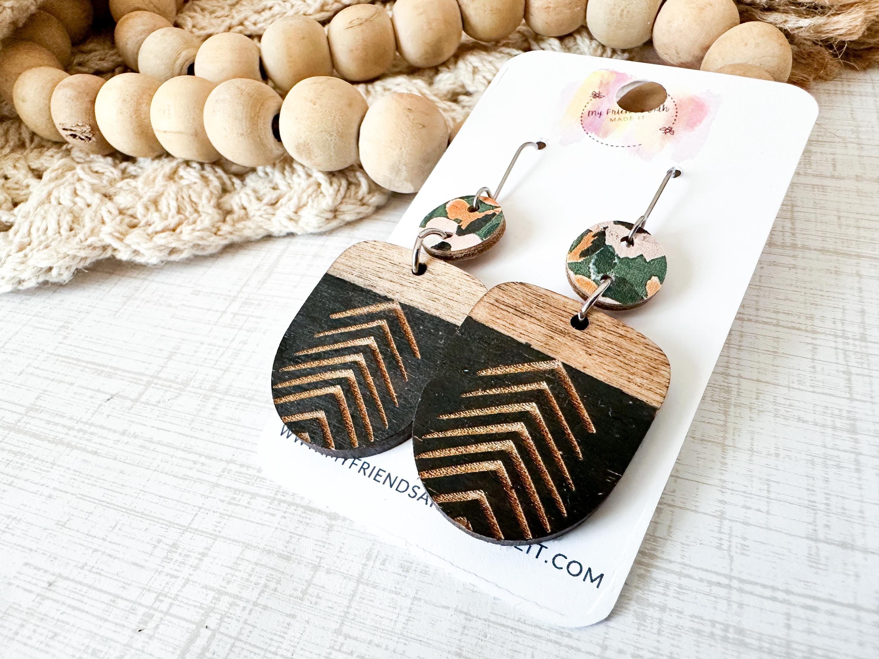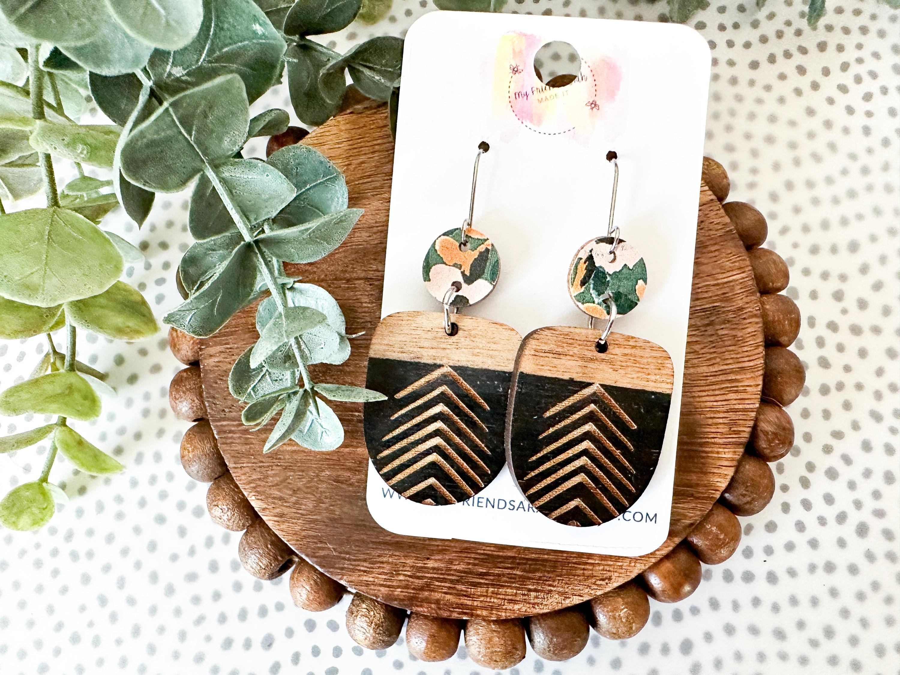 These beauties are giving modern-boho in the best possible way. The bottom piece is hand painted wood - half rich black, half warm natural wood - with that bold engraved chevron pattern that just pops. Up top, a soft floral cork circle adds a little sweetness to all that earthy drama. They’re lightweight, eye-catching, and totally wearable whether you’re running errands, heading to a market, or pretending your iced coffee is a personality trait. You’ll get compliments… just warning you now.