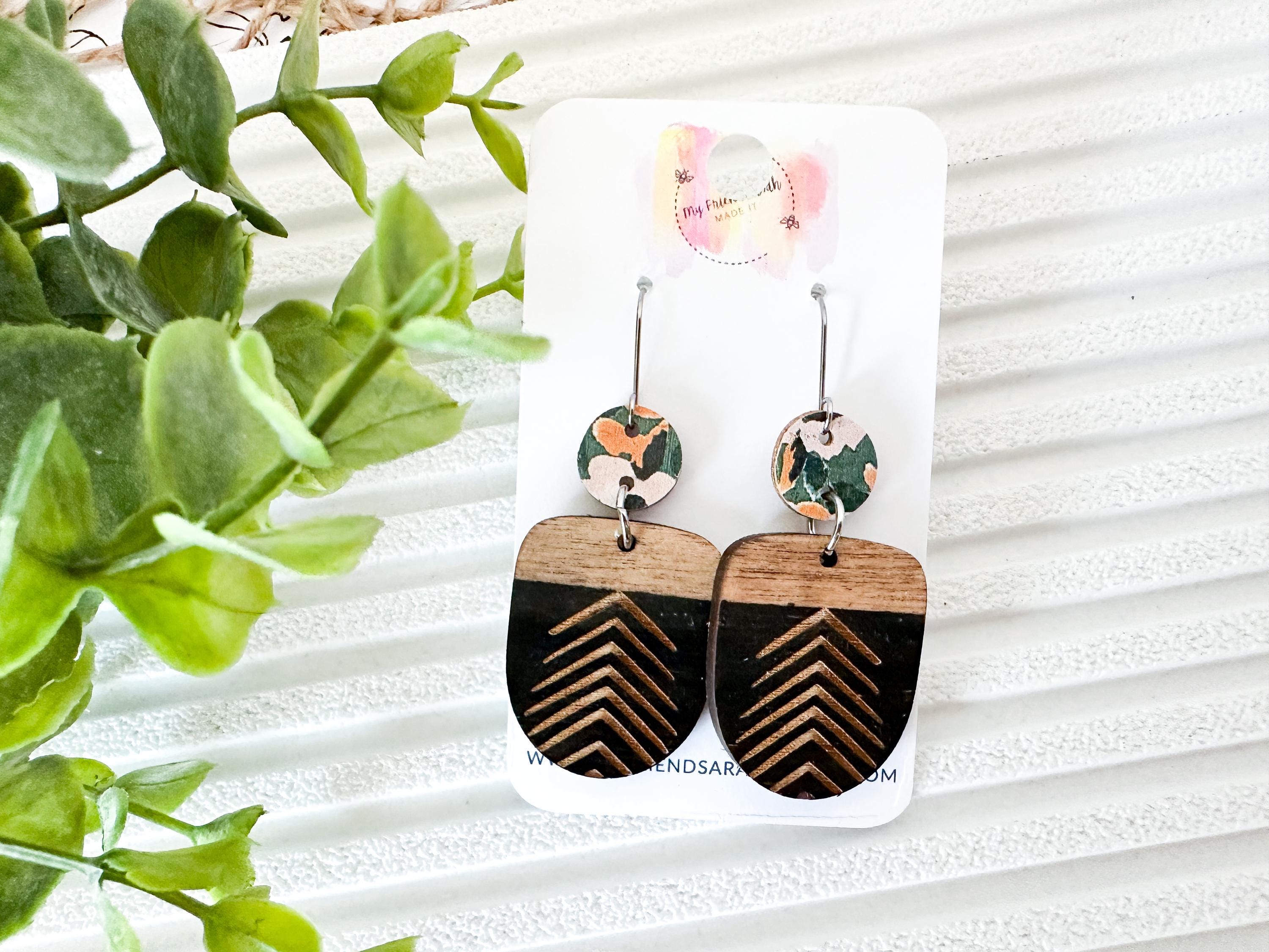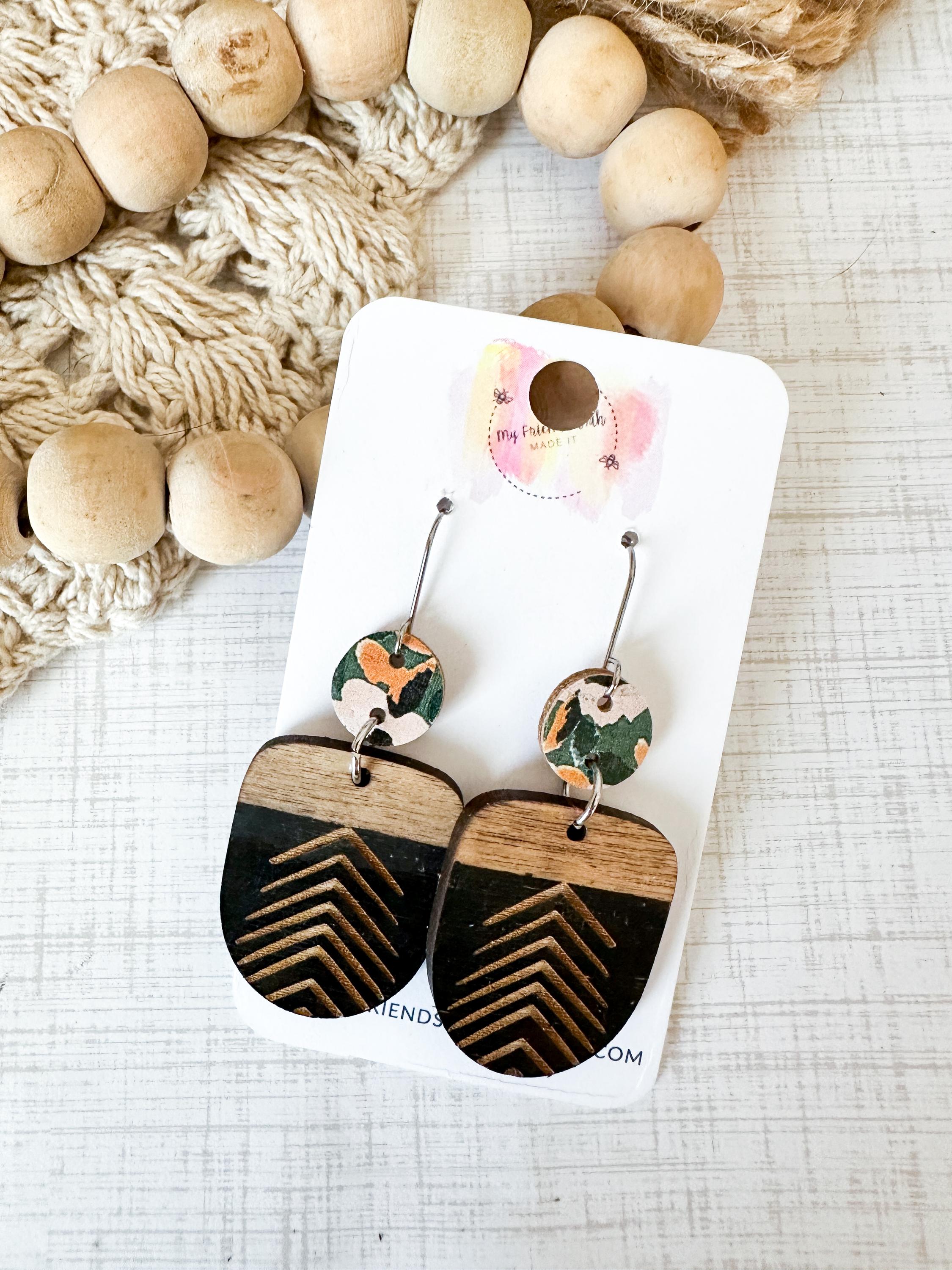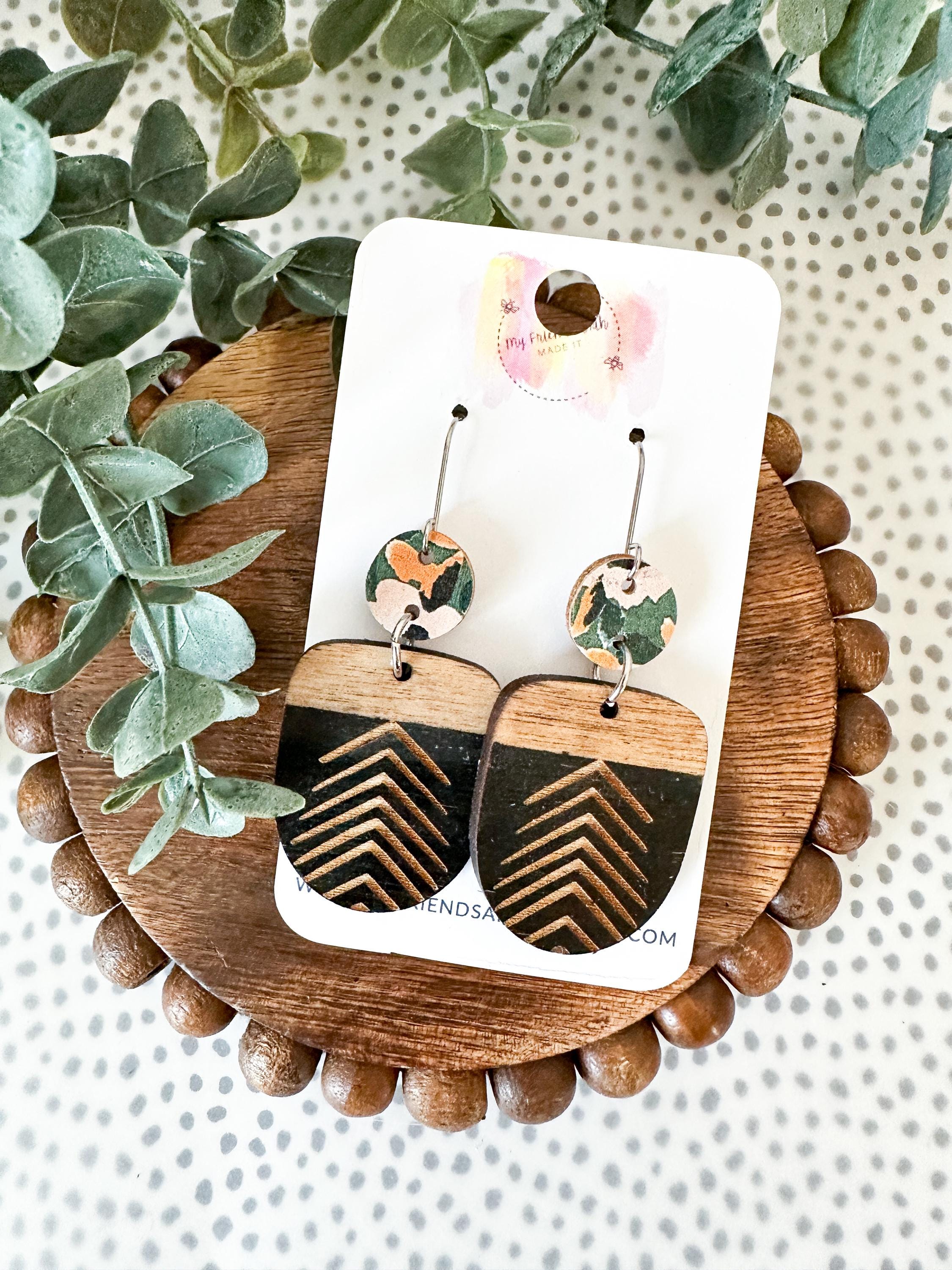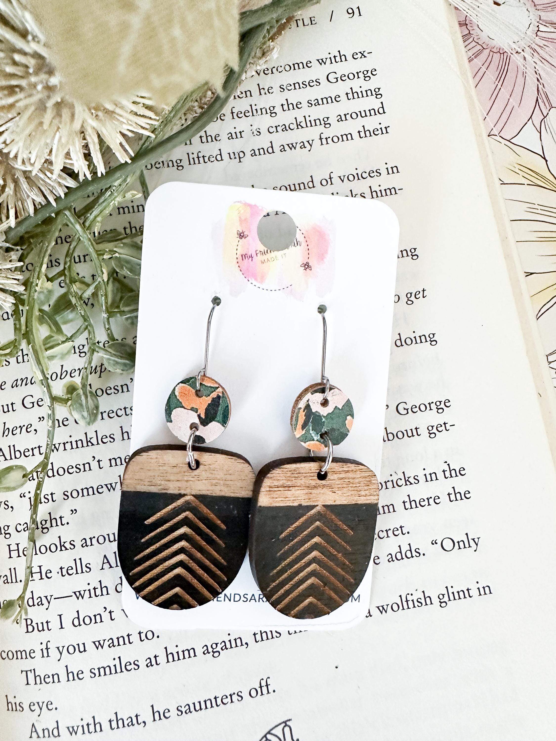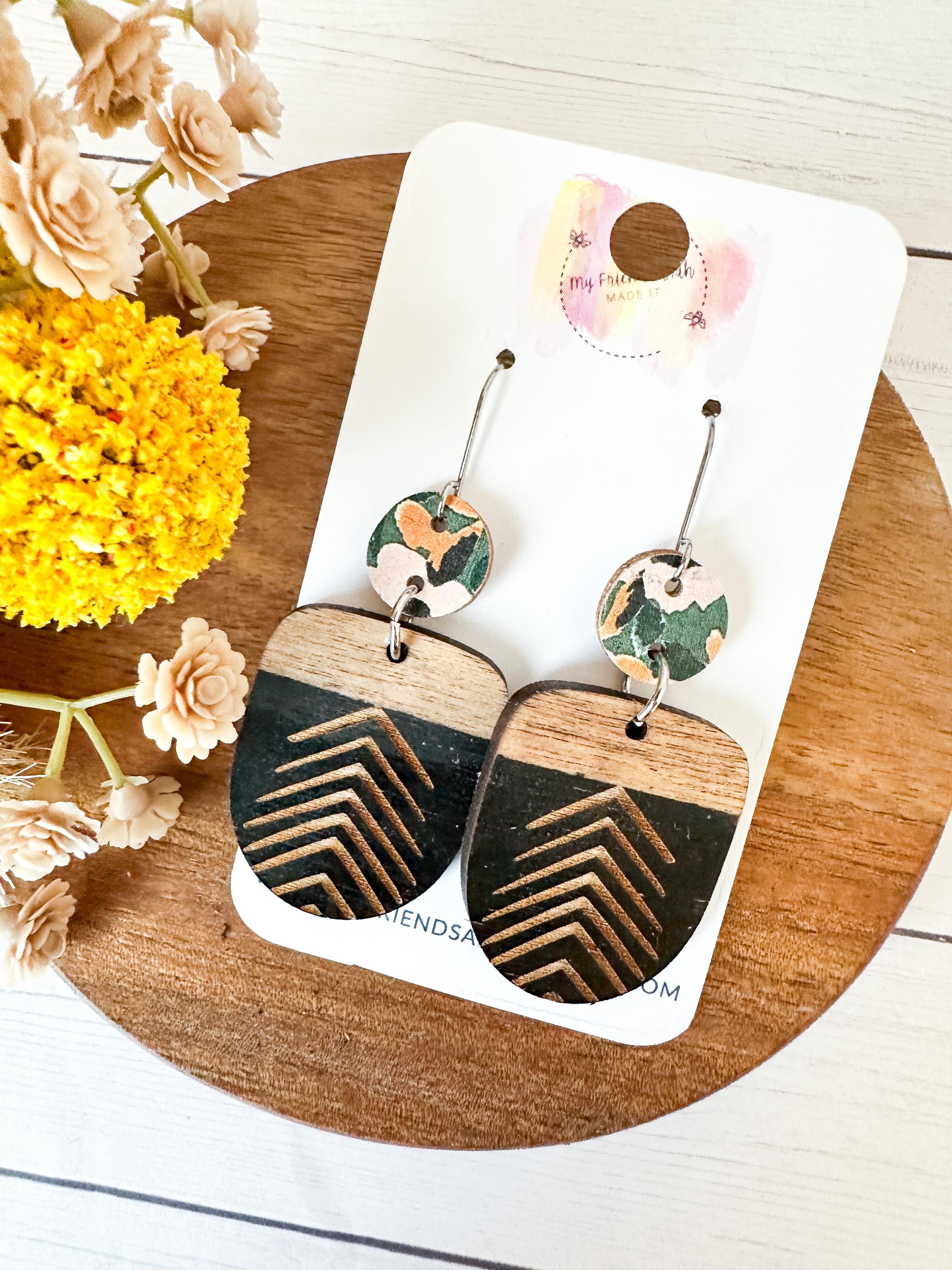 These beauties are giving modern-boho in the best possible way. The bottom piece is hand painted wood - half rich black, half warm natural wood - with that bold engraved chevron pattern that just pops. Up top, a soft floral cork circle adds a little sweetness to all that earthy drama. They’re lightweight, eye-catching, and totally wearable whether you’re running errands, heading to a market, or pretending your iced coffee is a personality trait. You’ll get compliments… just warning you now.