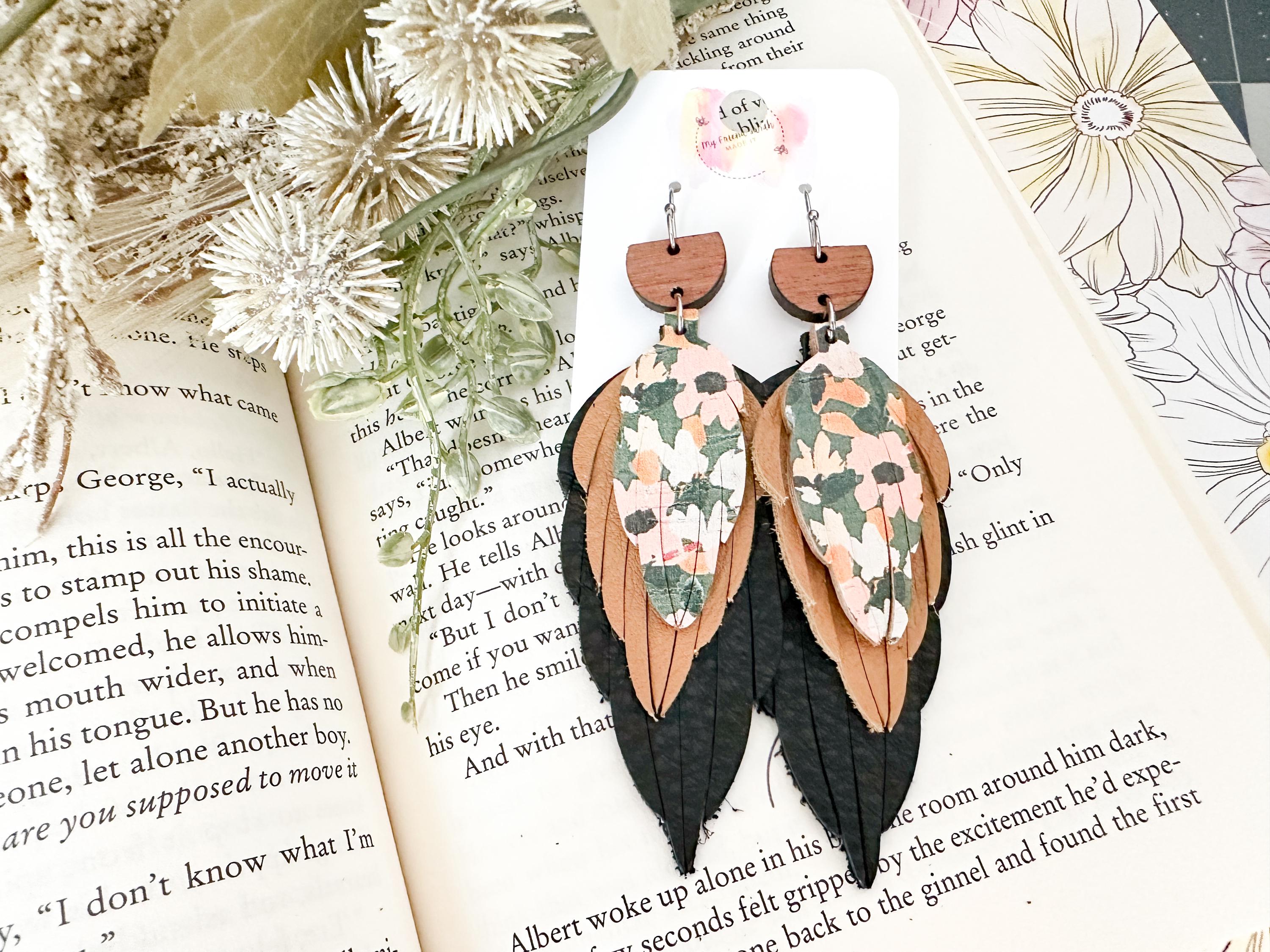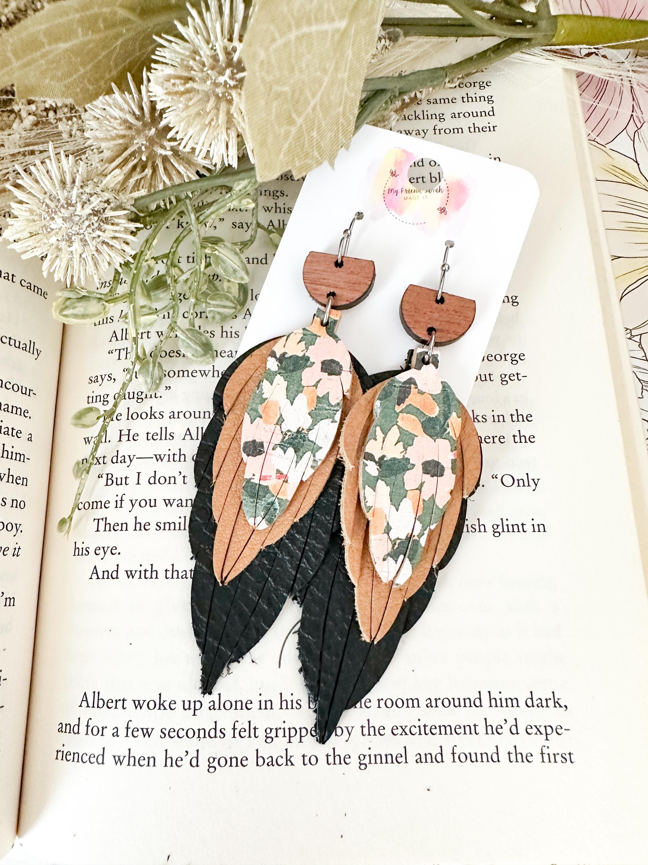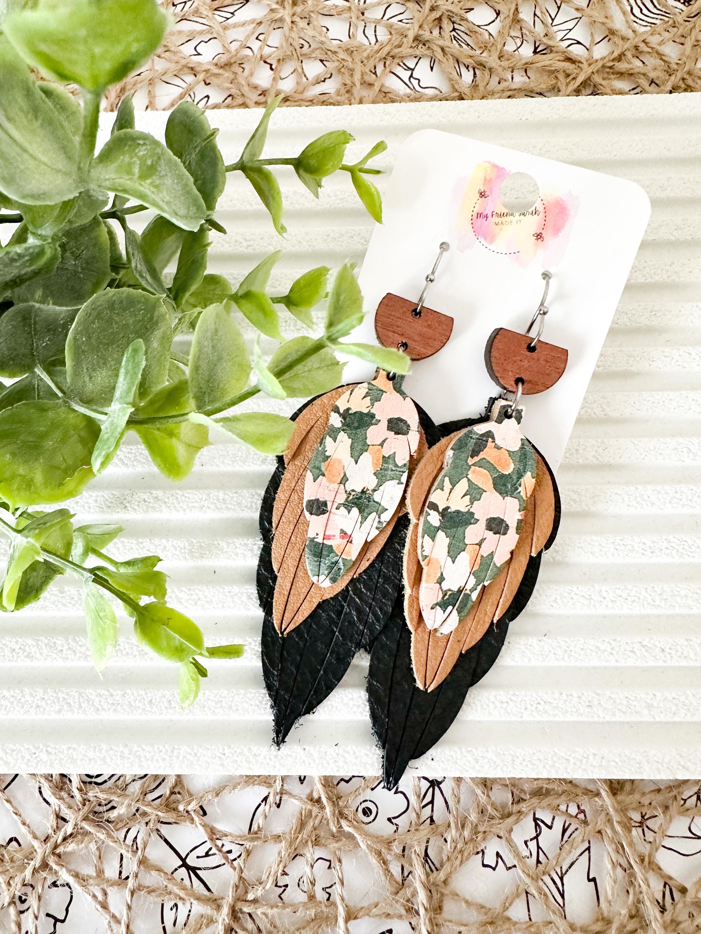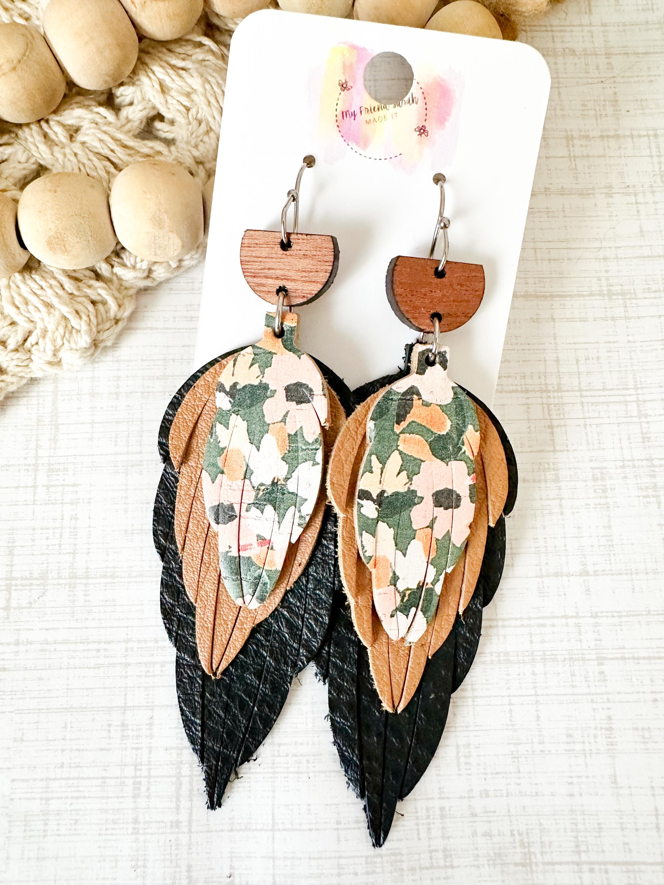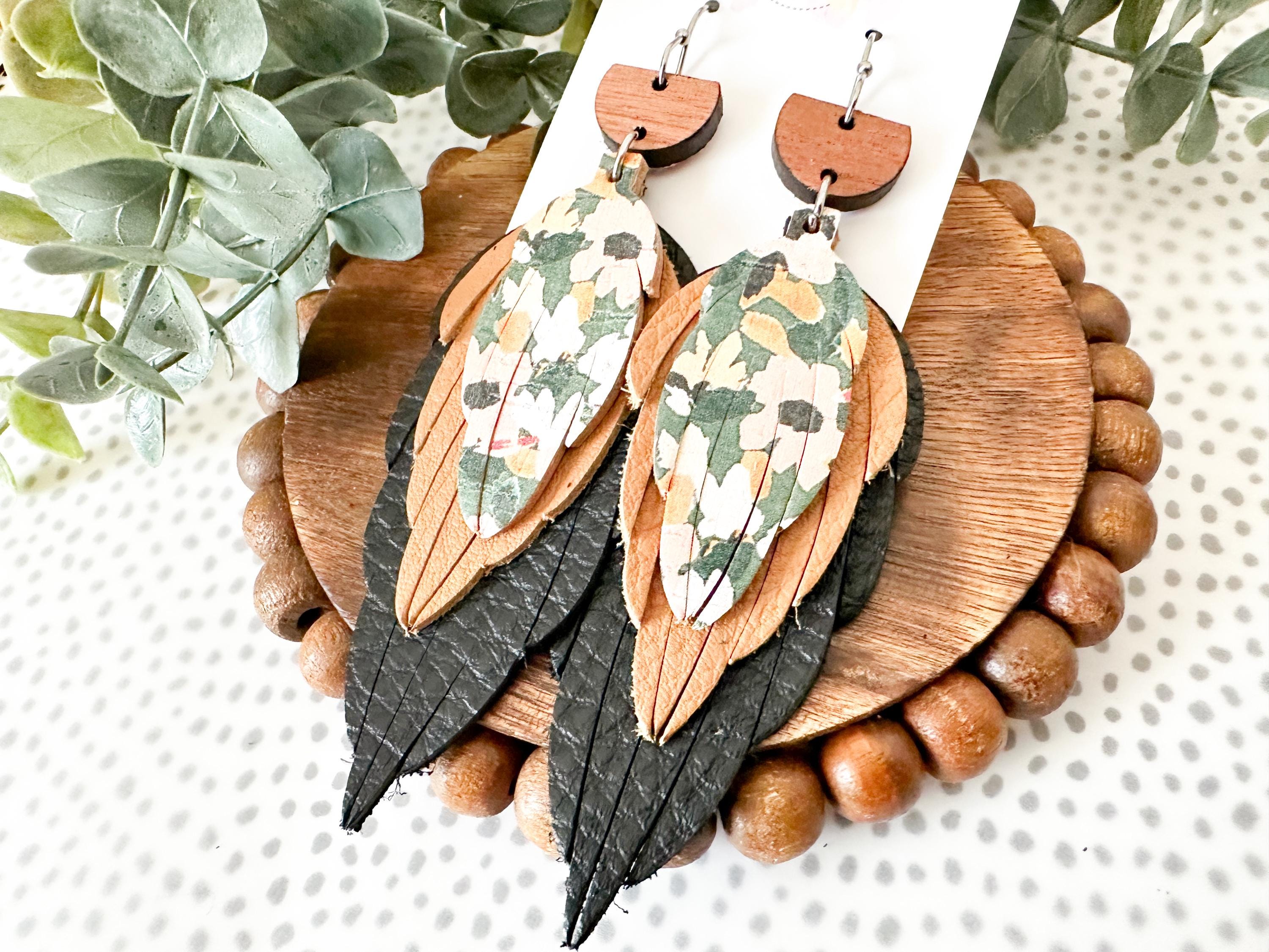 This pair is the definition of perfectly layered. A wooden top, soft black and warm brown leather feathers, and a pop of floral cork tie everything together for a bold but wearable statement. Theyβre artsy without being overwhelming and feel like the cutest little collage you get to wear.