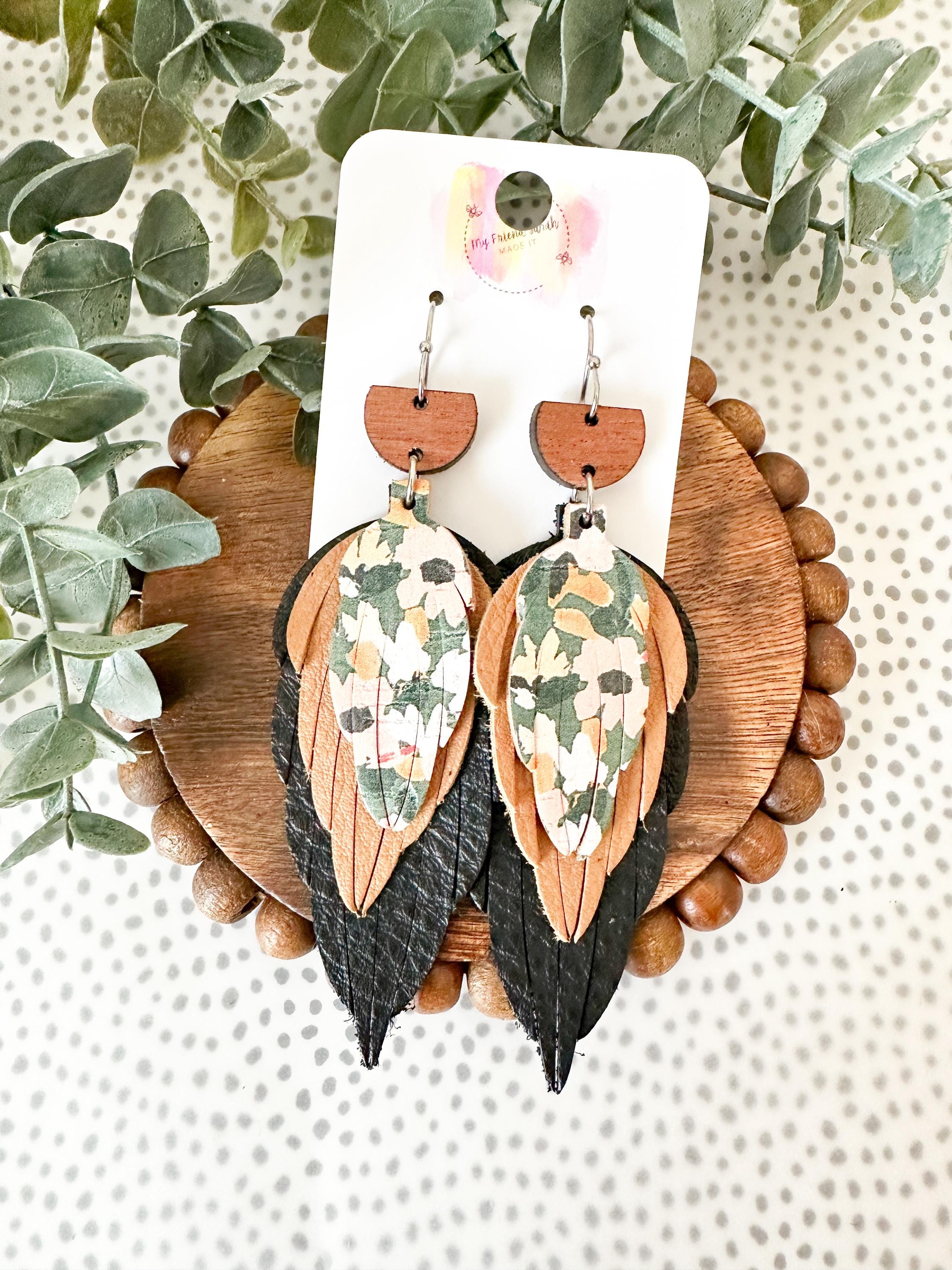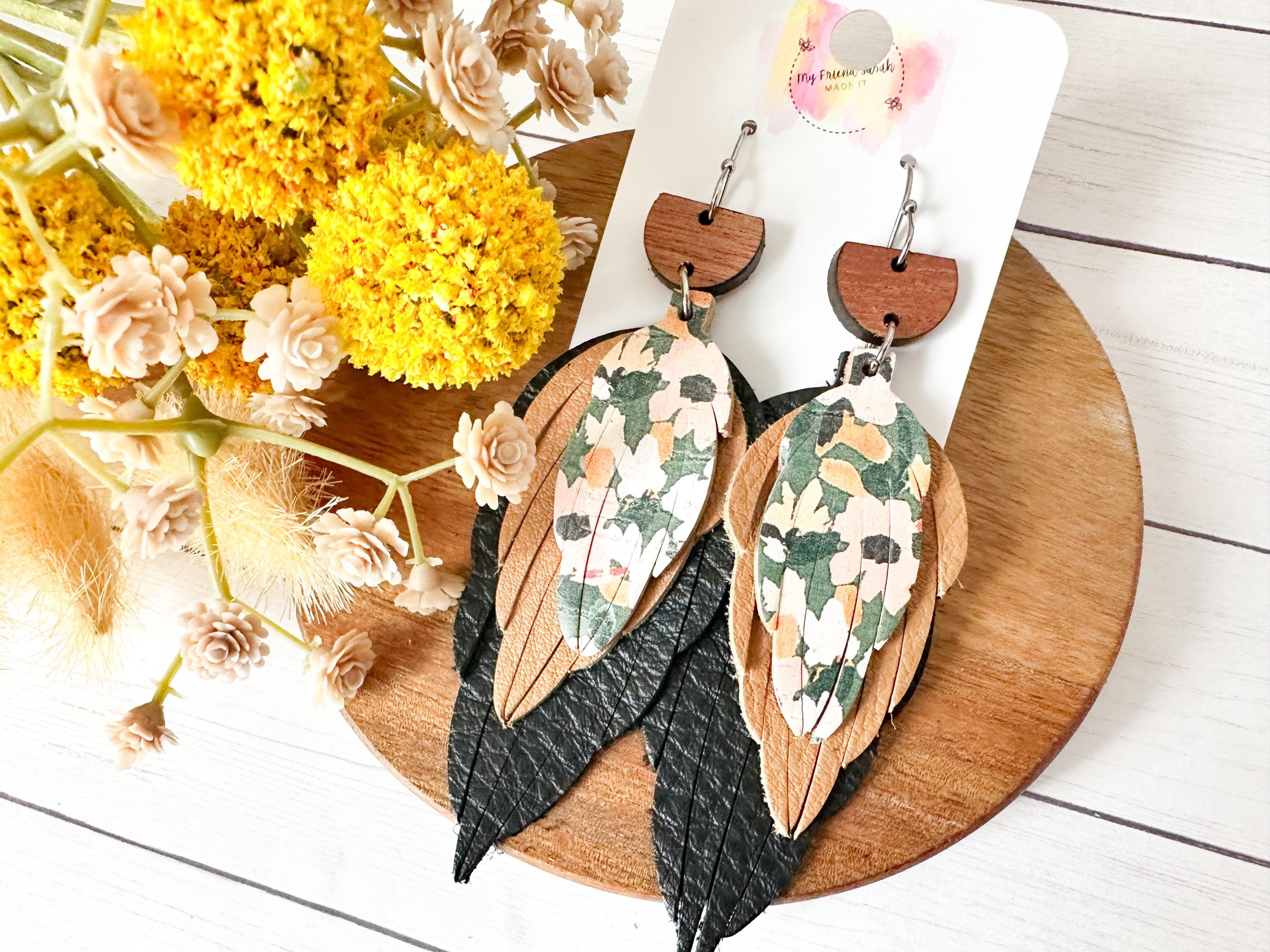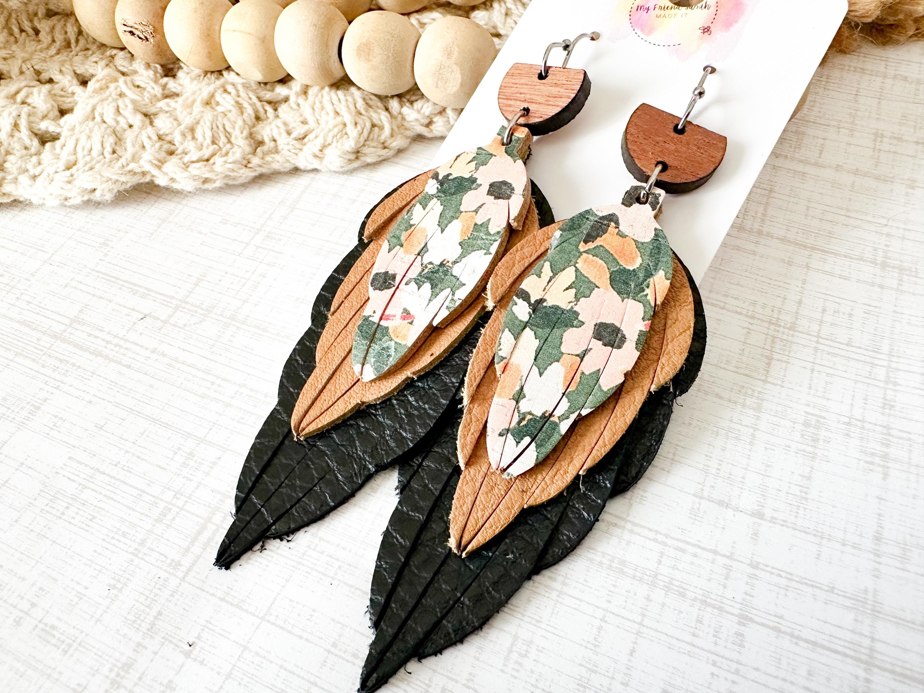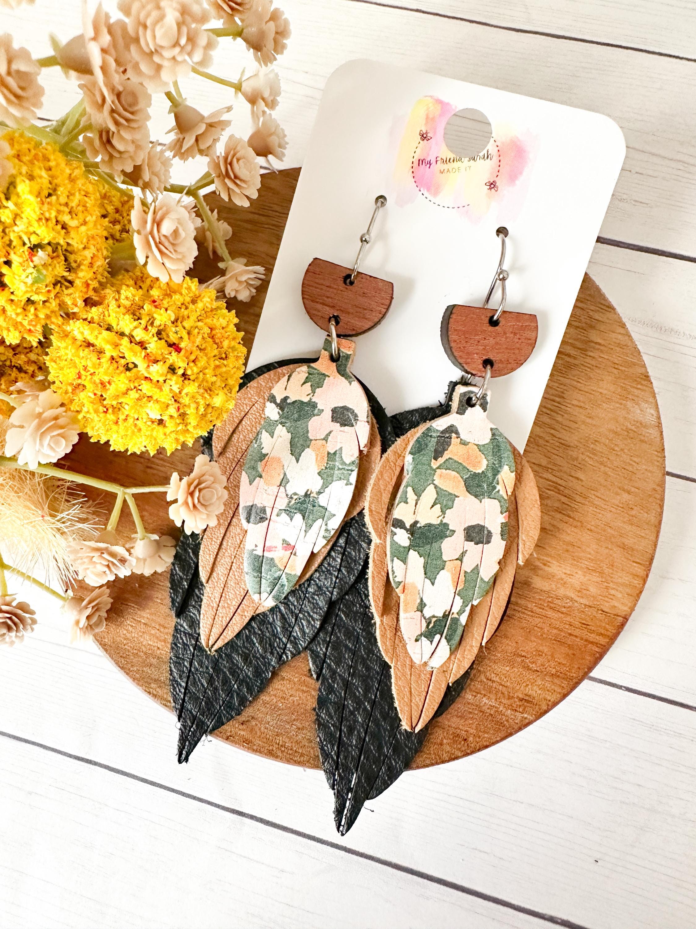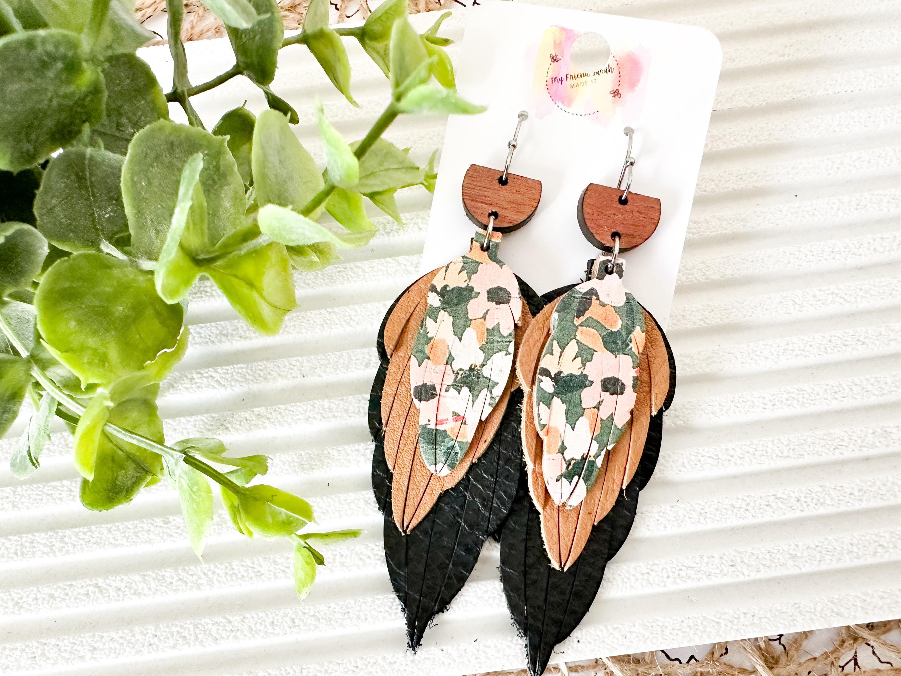 This pair is the definition of perfectly layered. A wooden top, soft black and warm brown leather feathers, and a pop of floral cork tie everything together for a bold but wearable statement. Theyβre artsy without being overwhelming and feel like the cutest little collage you get to wear.