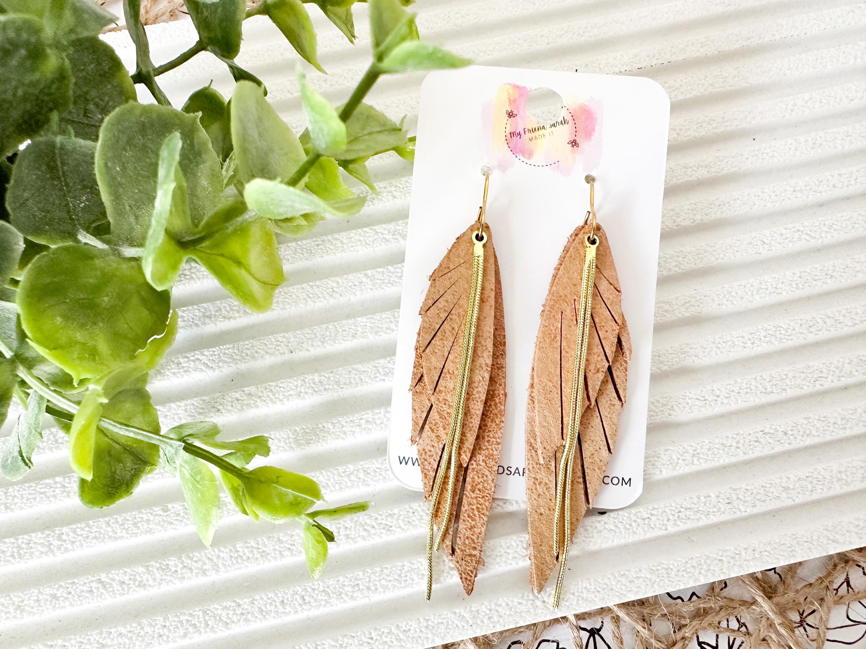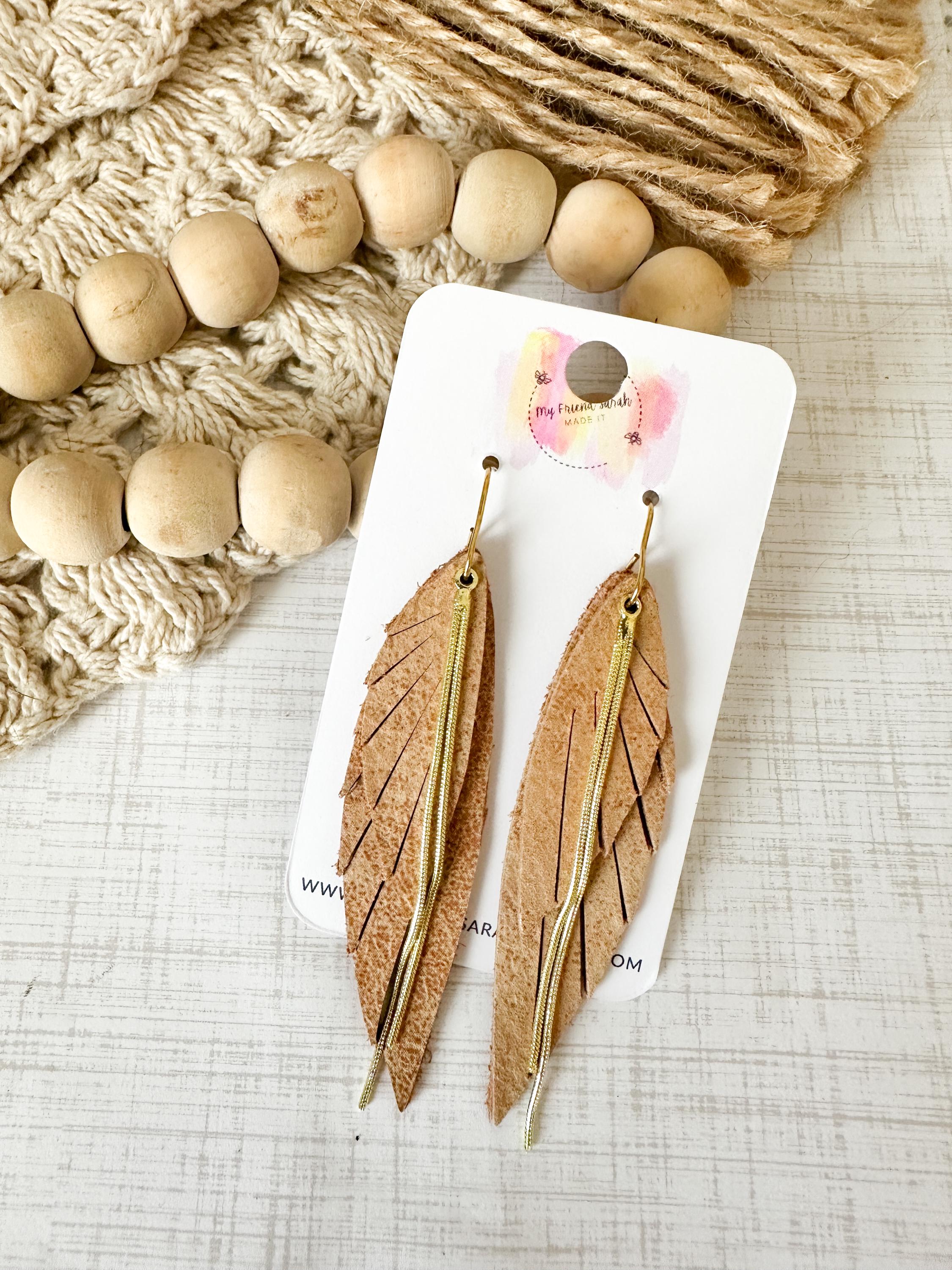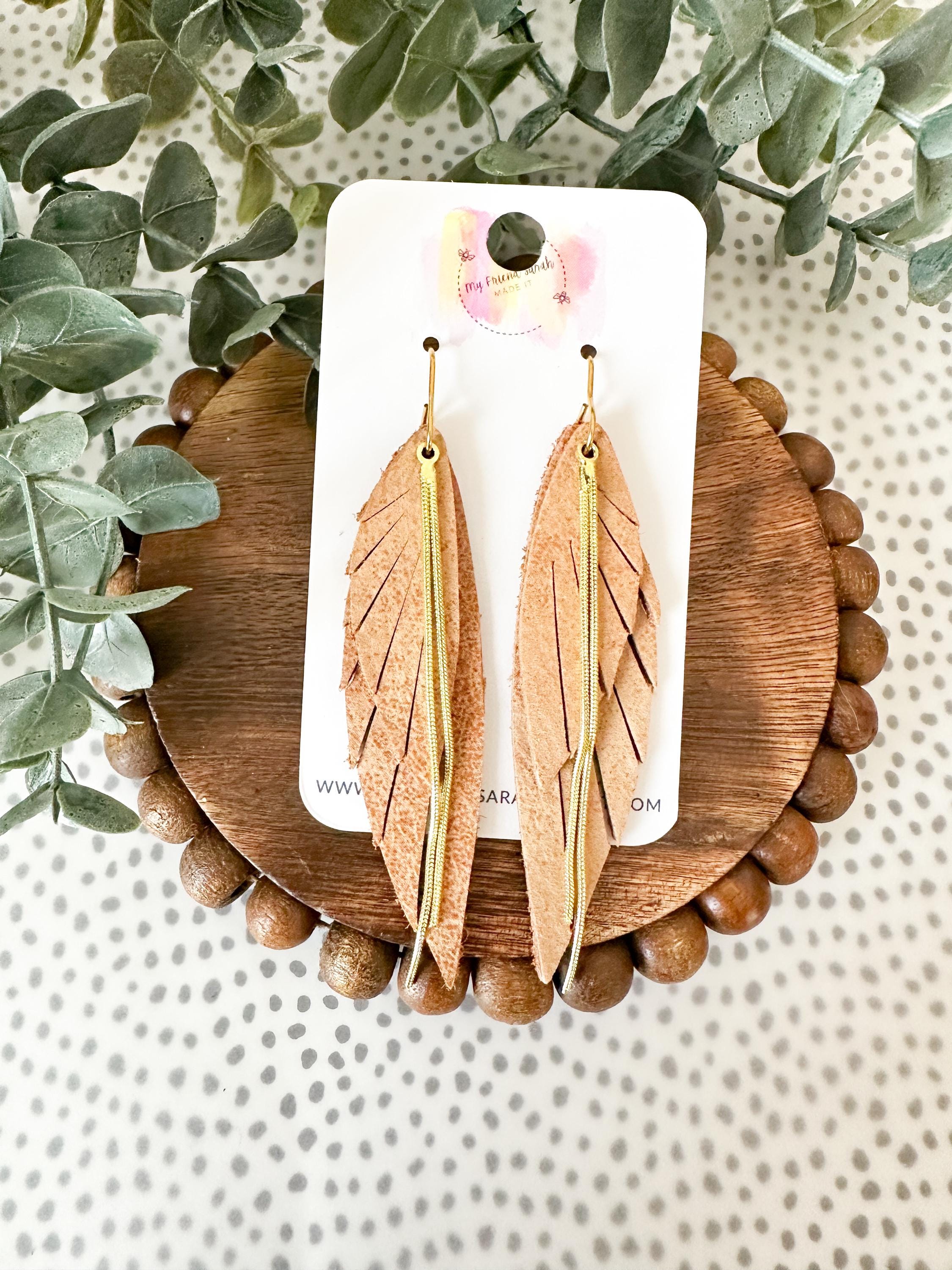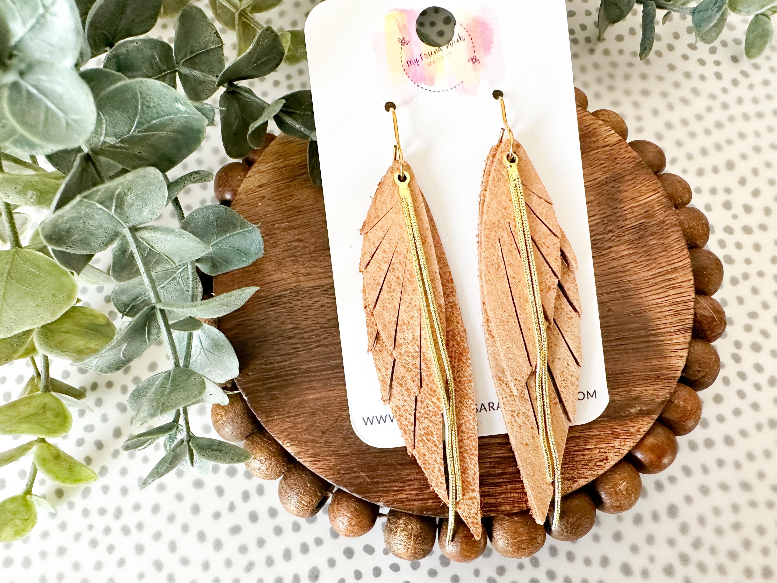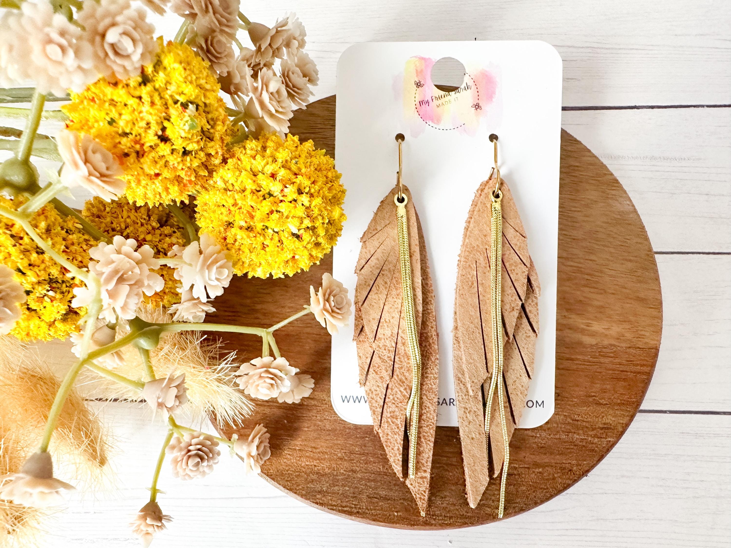 Soft camel leather + a sleek gold chains = effortlessly polished. These feather earrings bring warm neutral vibes with just a tiny touch of shine. Theyβre lightweight, easy to pair with anything in your closet, and a great option when you want something classy but still fun.