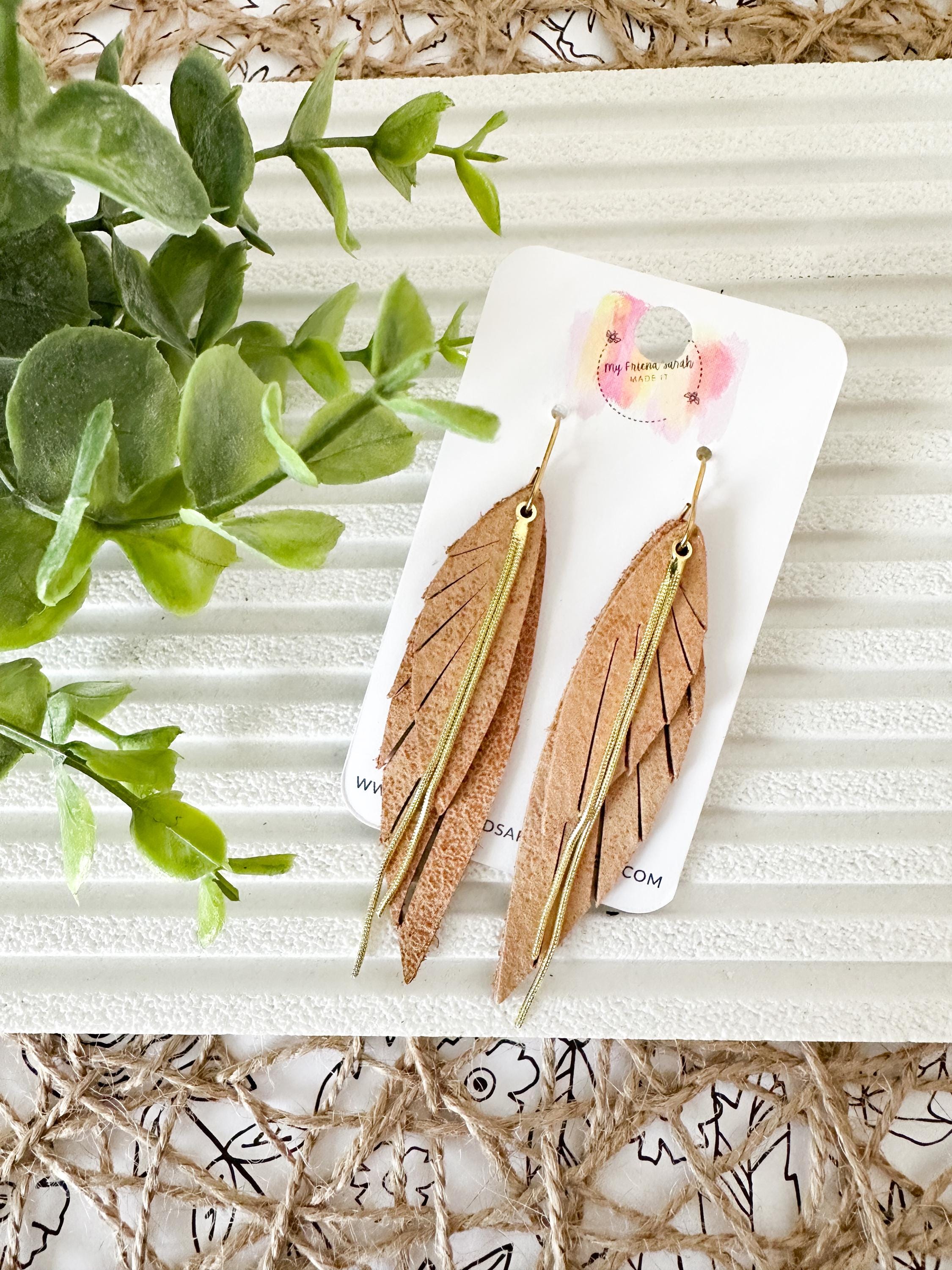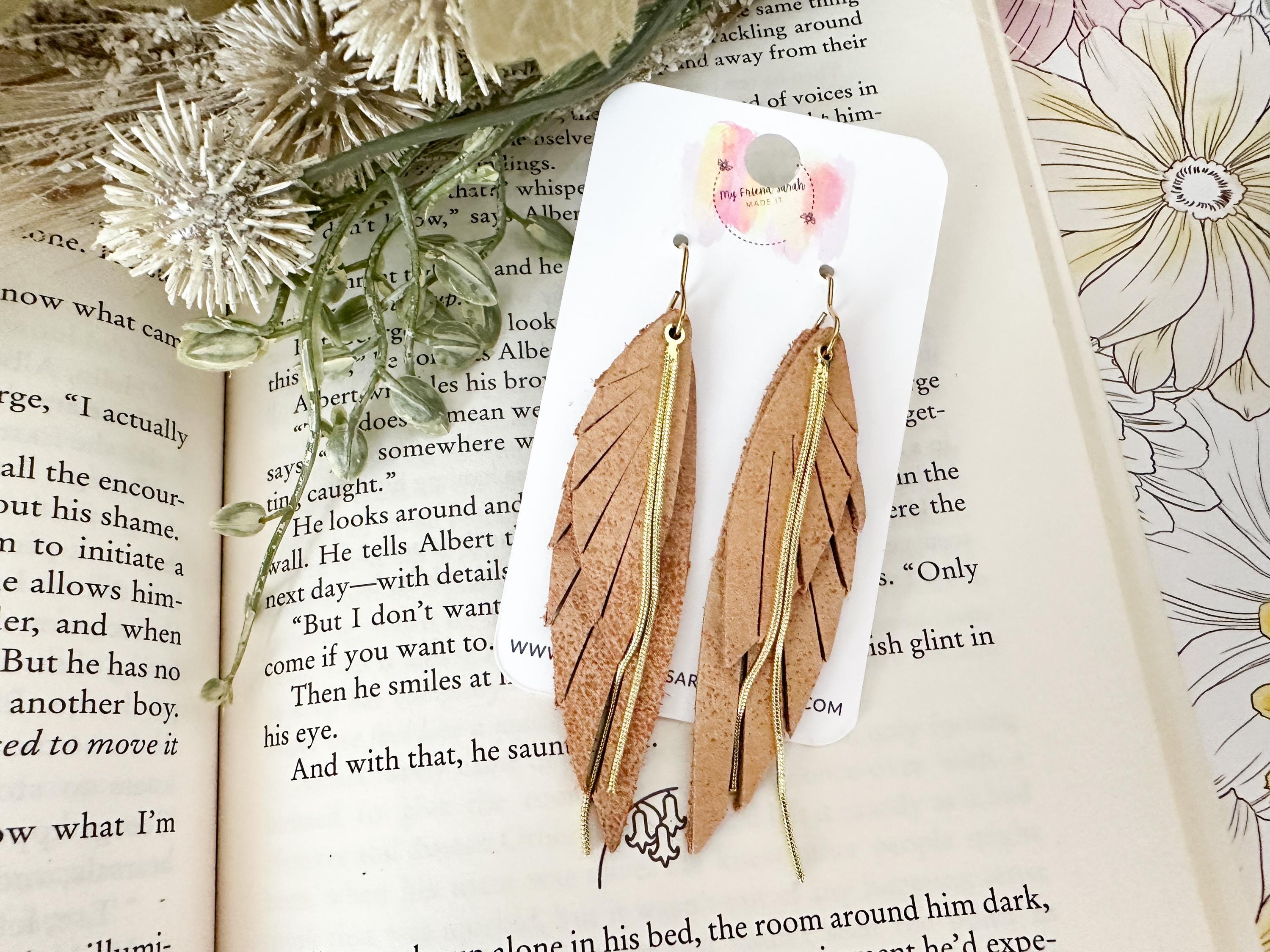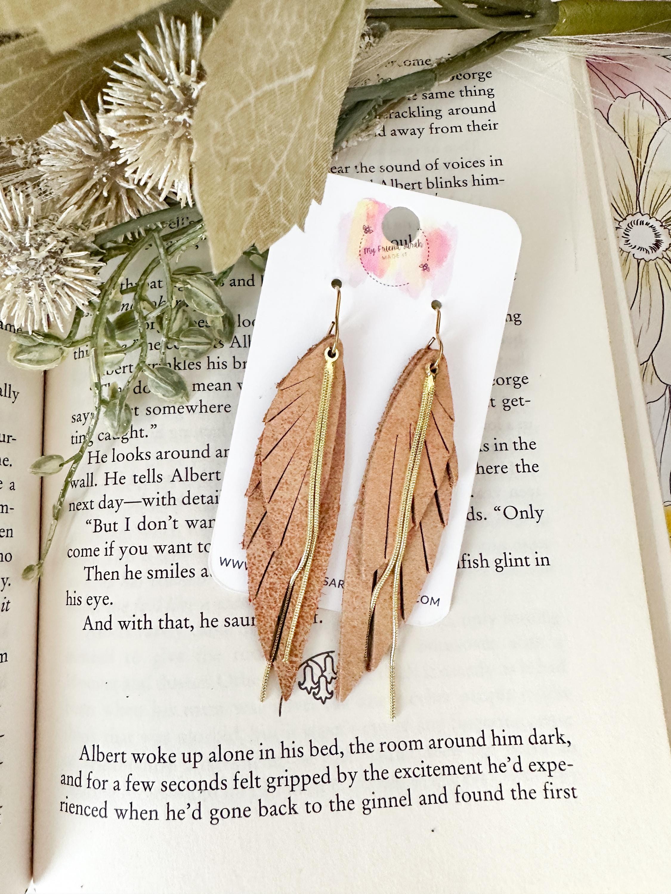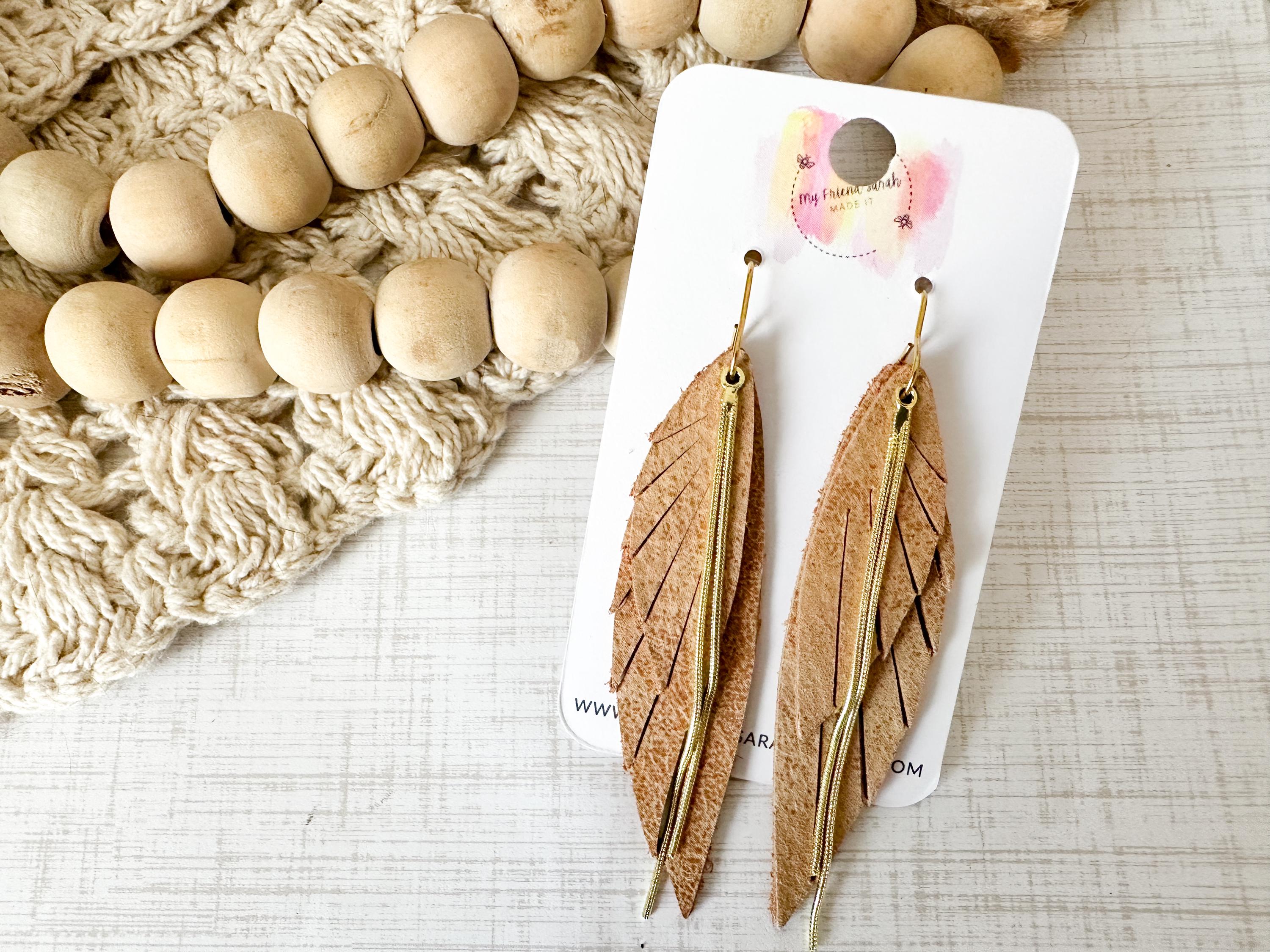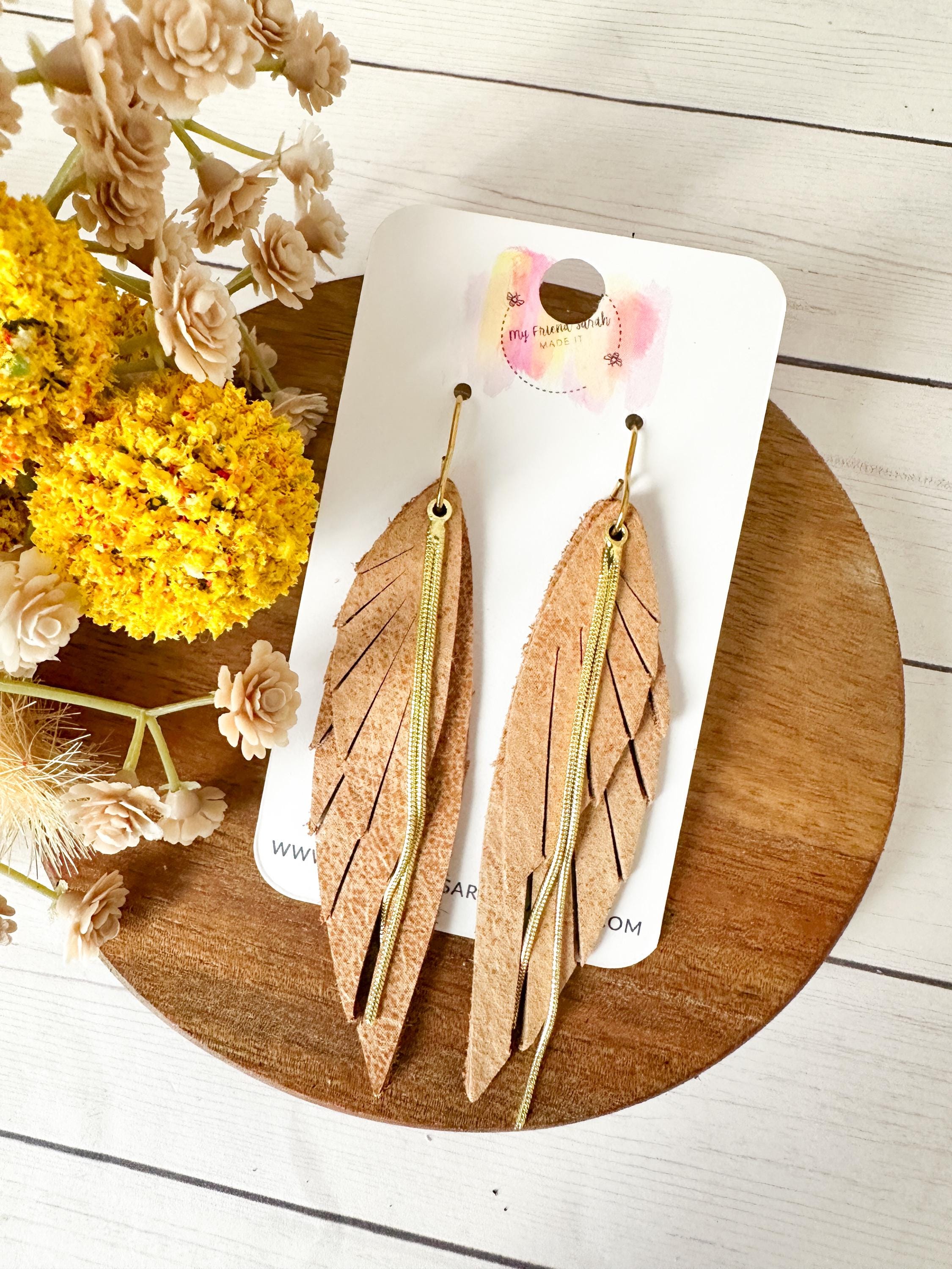 Soft camel leather + a sleek gold chains = effortlessly polished. These feather earrings bring warm neutral vibes with just a tiny touch of shine. Theyβre lightweight, easy to pair with anything in your closet, and a great option when you want something classy but still fun.