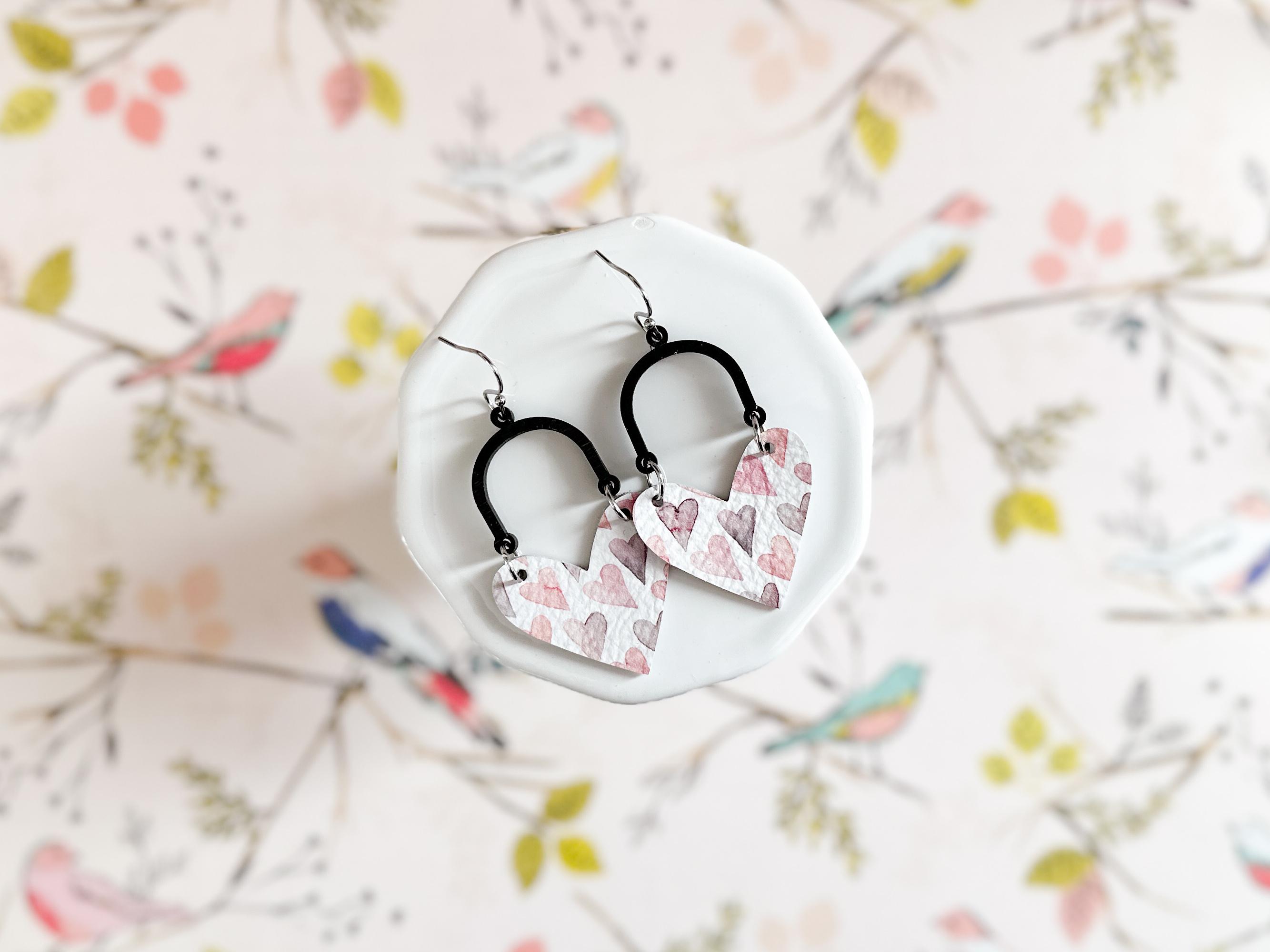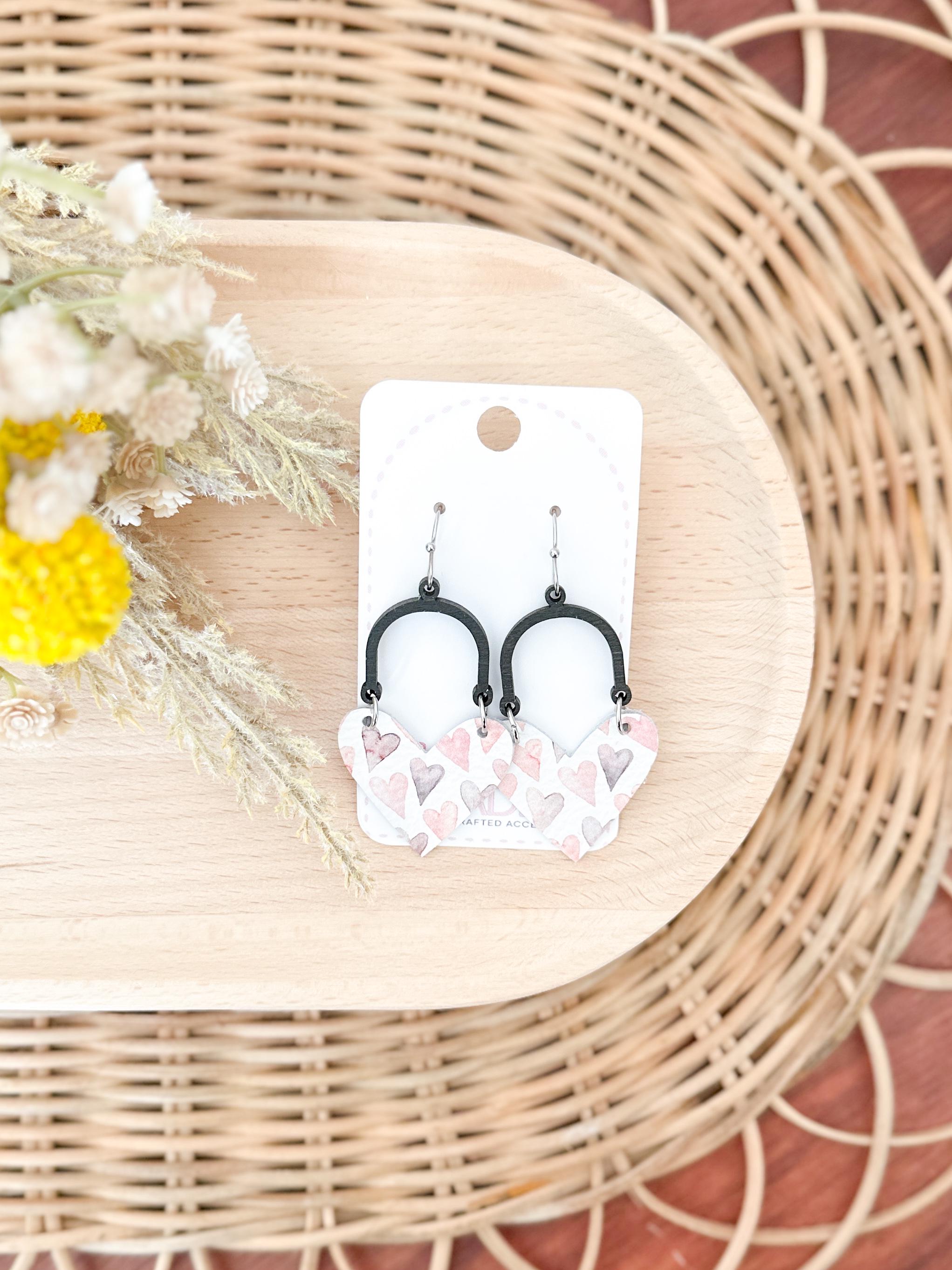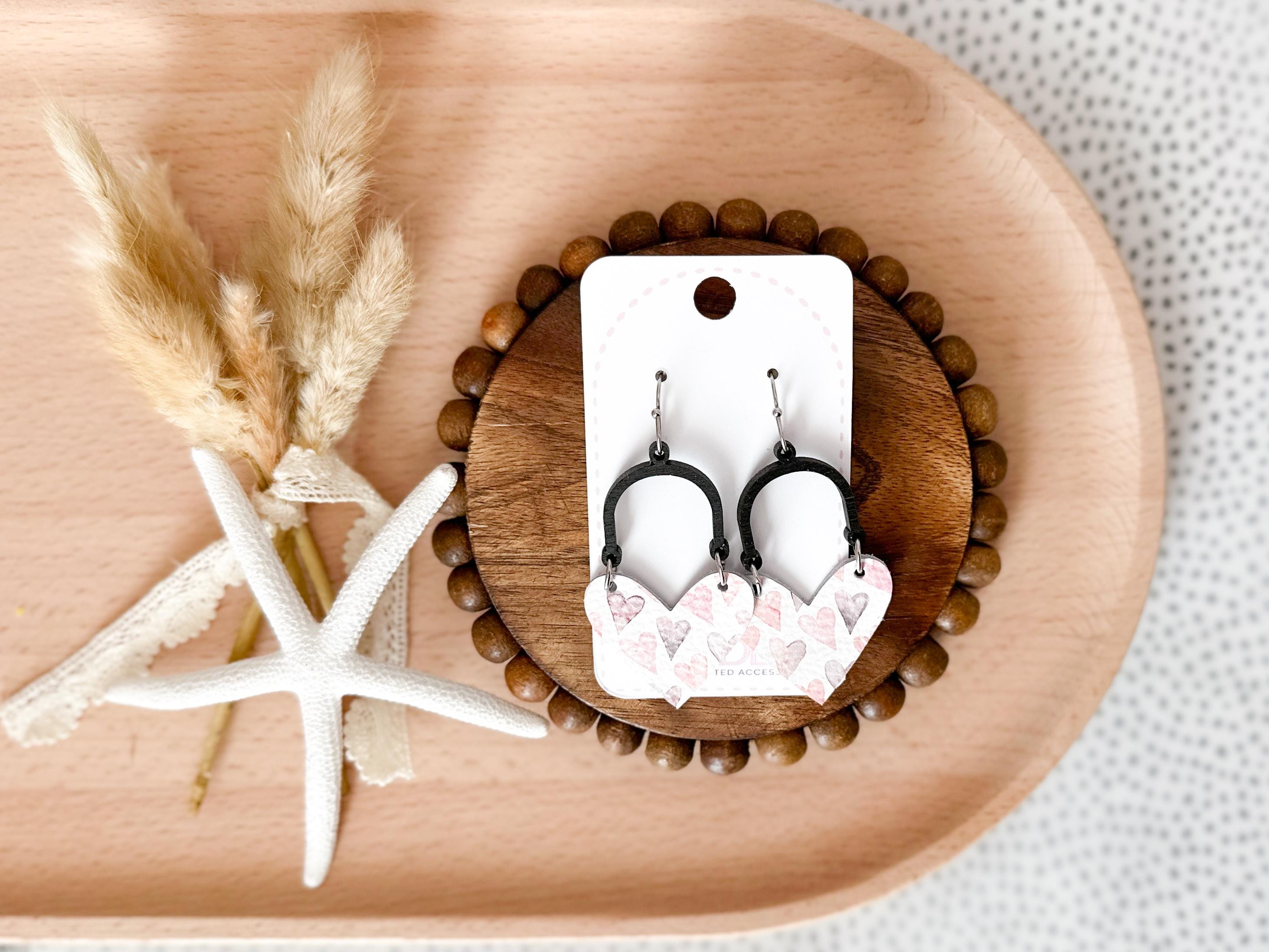 I just love this combination of leather heart + dark wood arch! Shown here in a white leather adorned with soft pink & lavender hearts print, these are lightweight and so sweet & easy to add to your outfit any time of year!