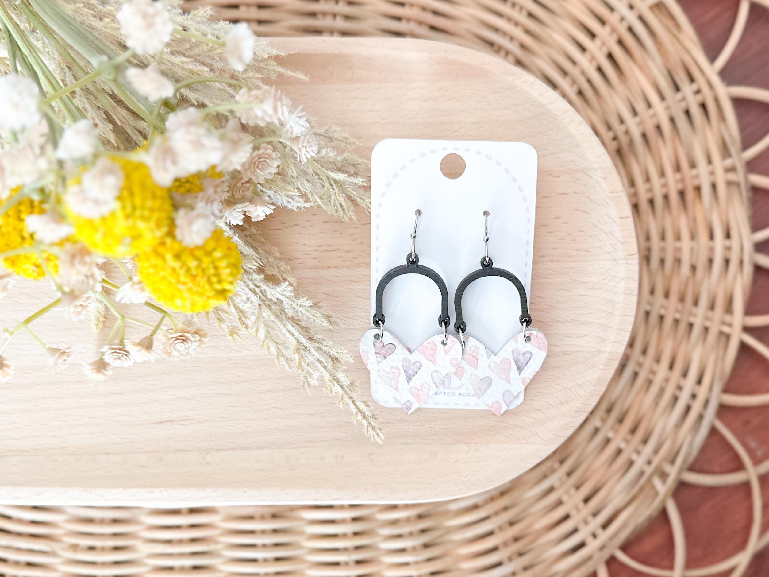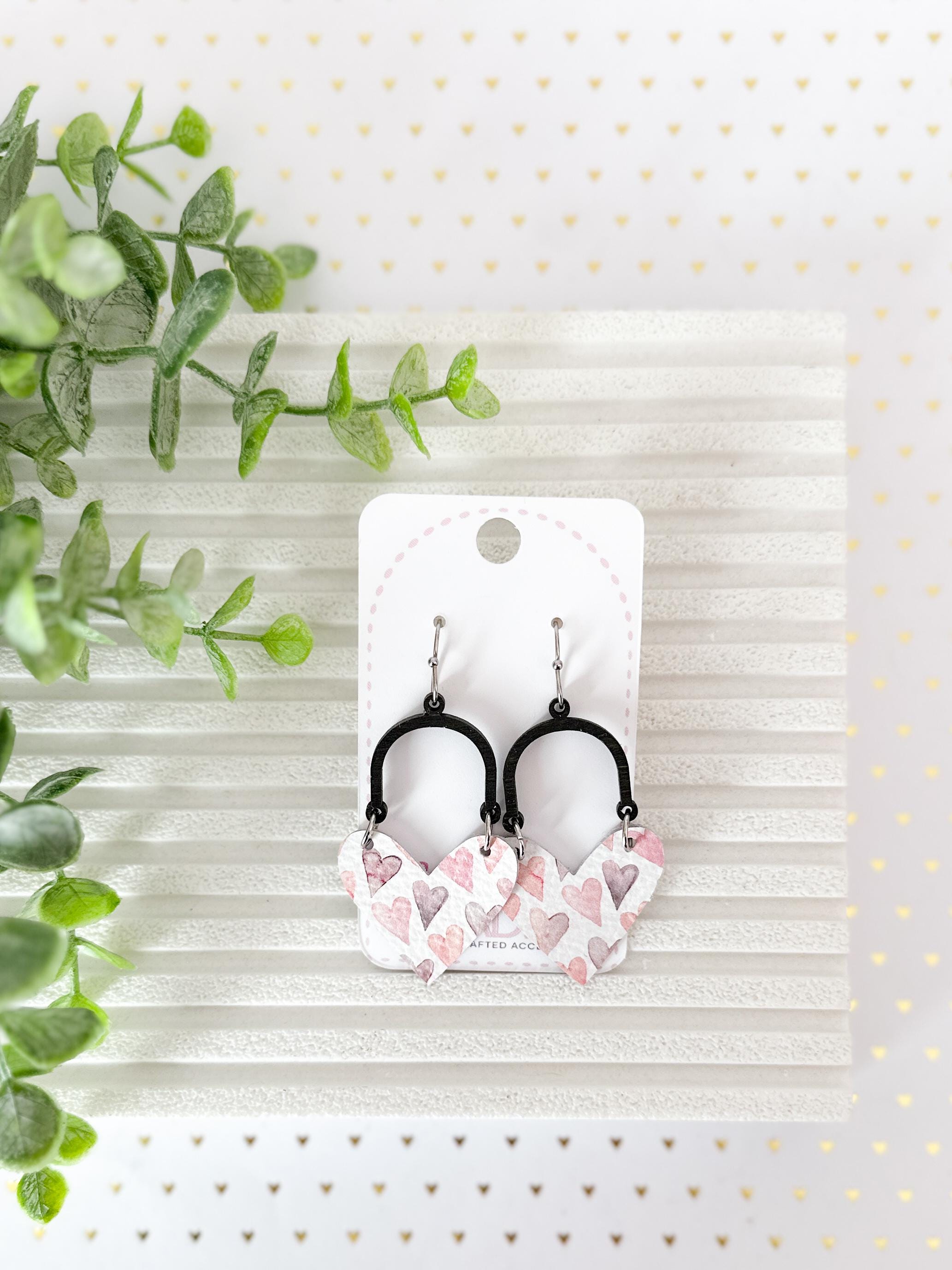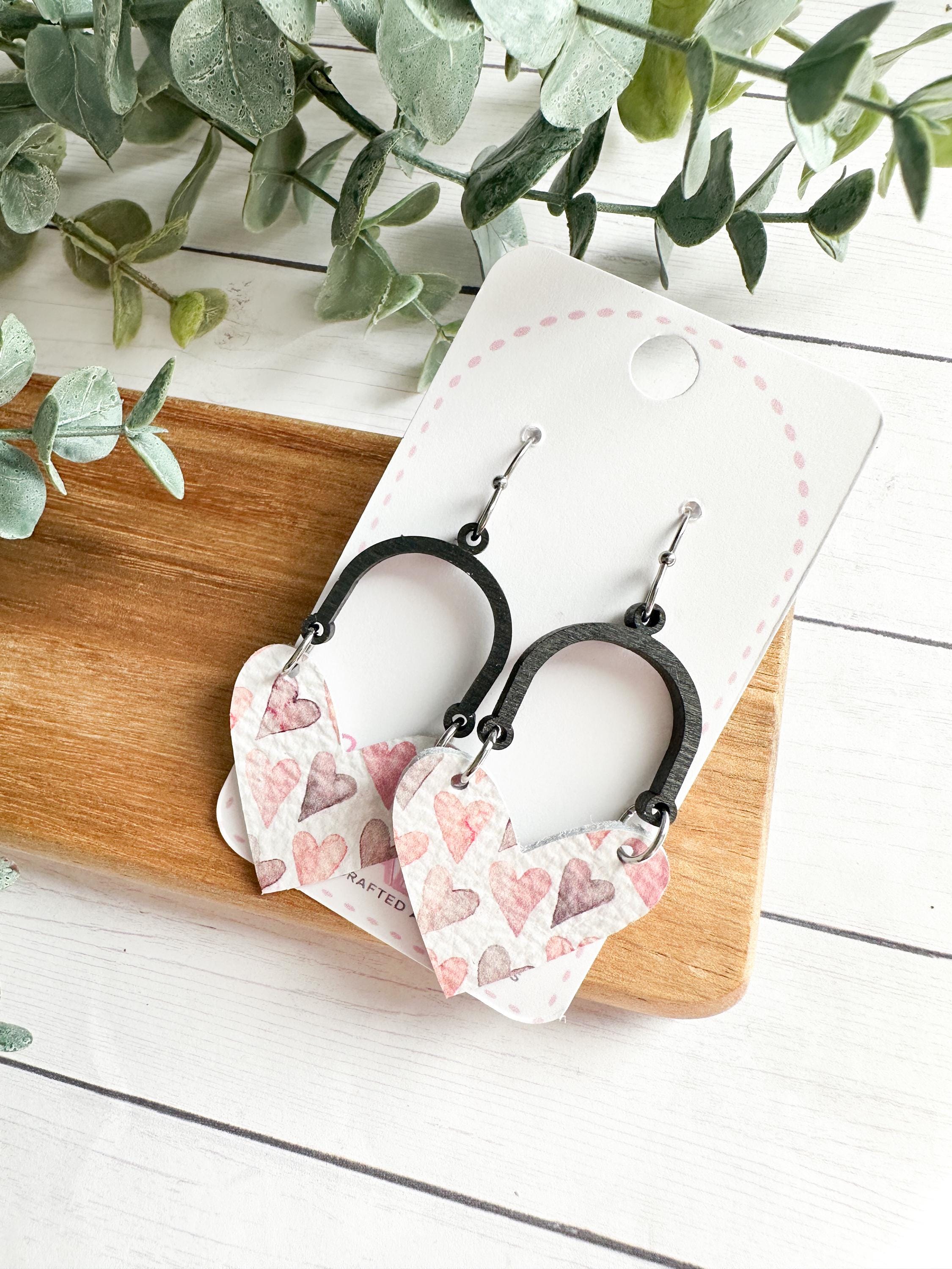 I just love this combination of leather heart + dark wood arch! Shown here in a white leather adorned with soft pink & lavender hearts print, these are lightweight and so sweet & easy to add to your outfit any time of year!