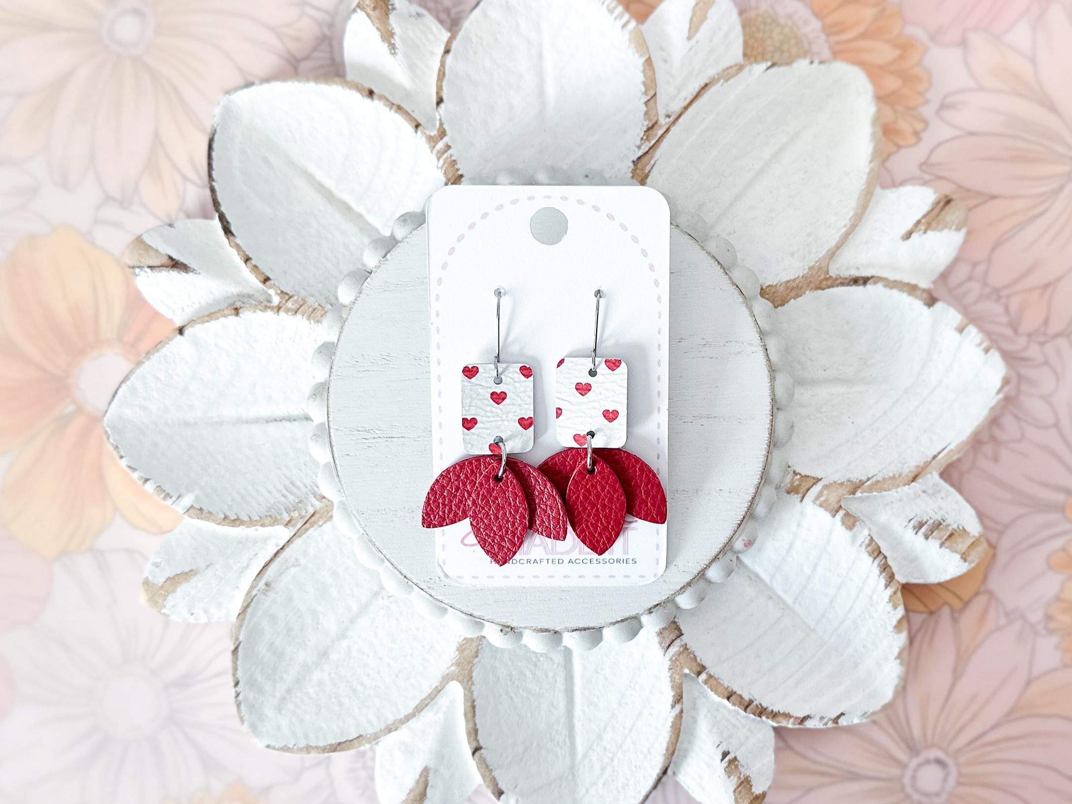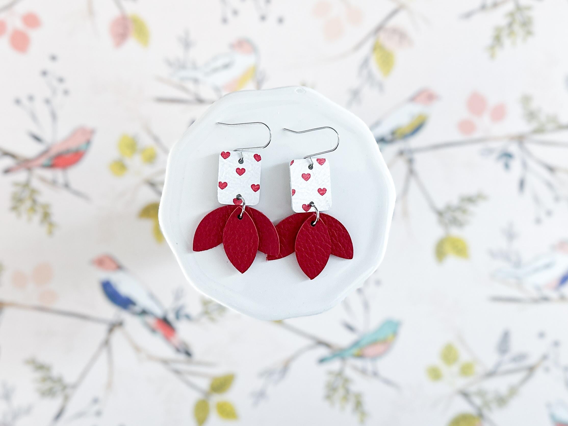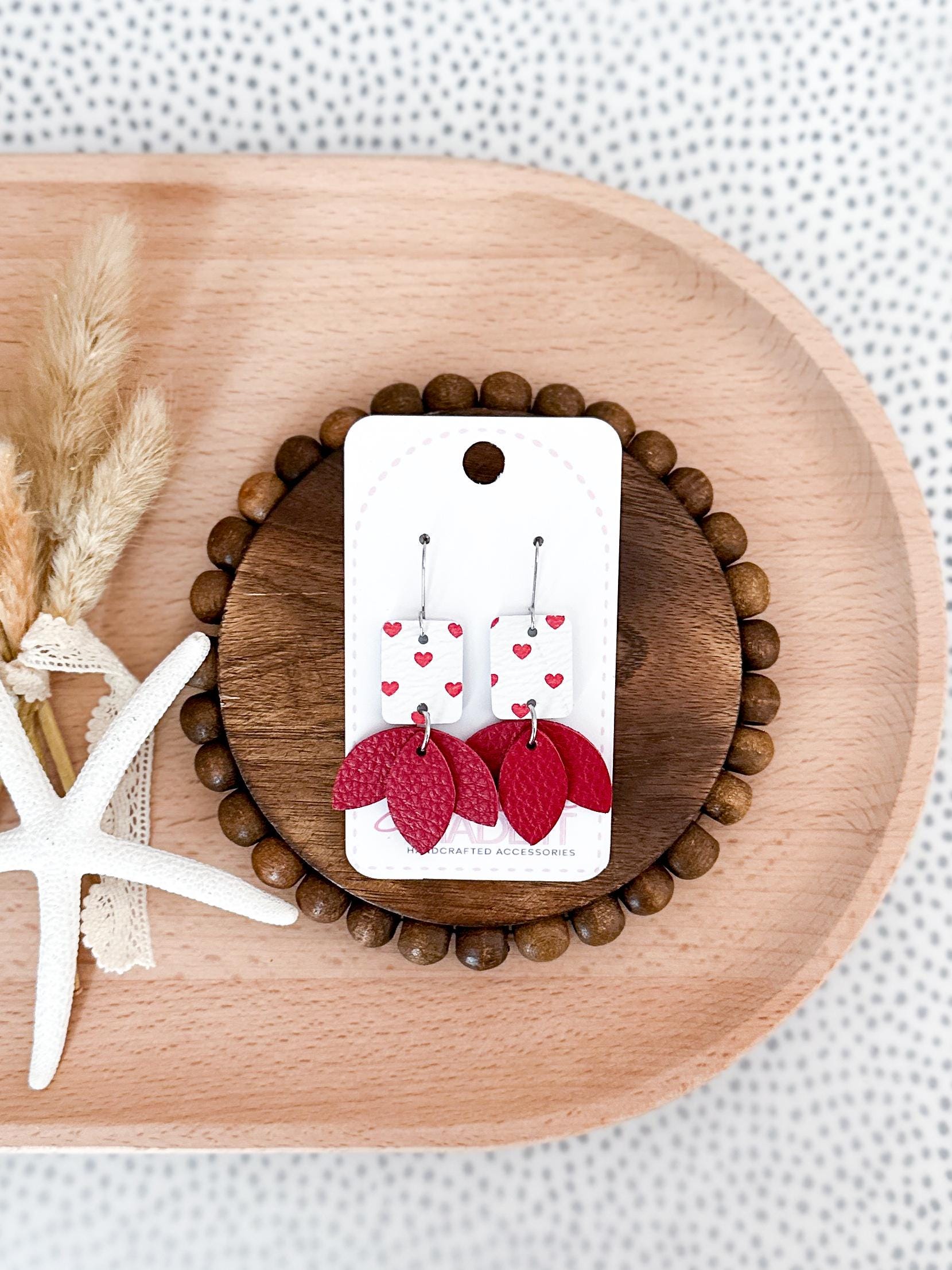 Fresh, fun, and full of color - these adorable mini hearts on white leather with red lotus petals beneath are a fun & flirty option for Valentine's Day or any time you want an extra dose of sweet. Lightweight and playful, they’re perfect for adding a pop of girlie energy to your day.